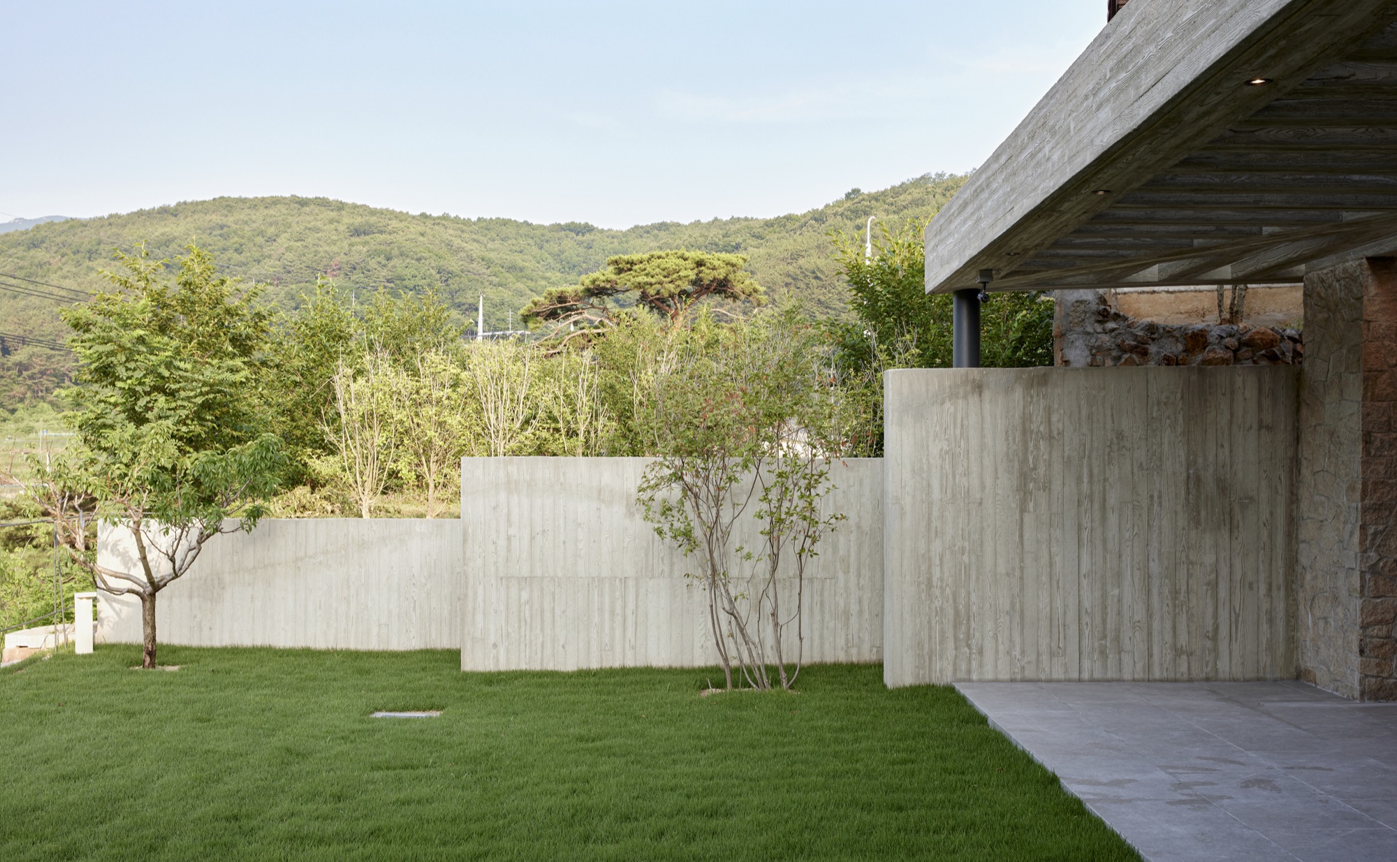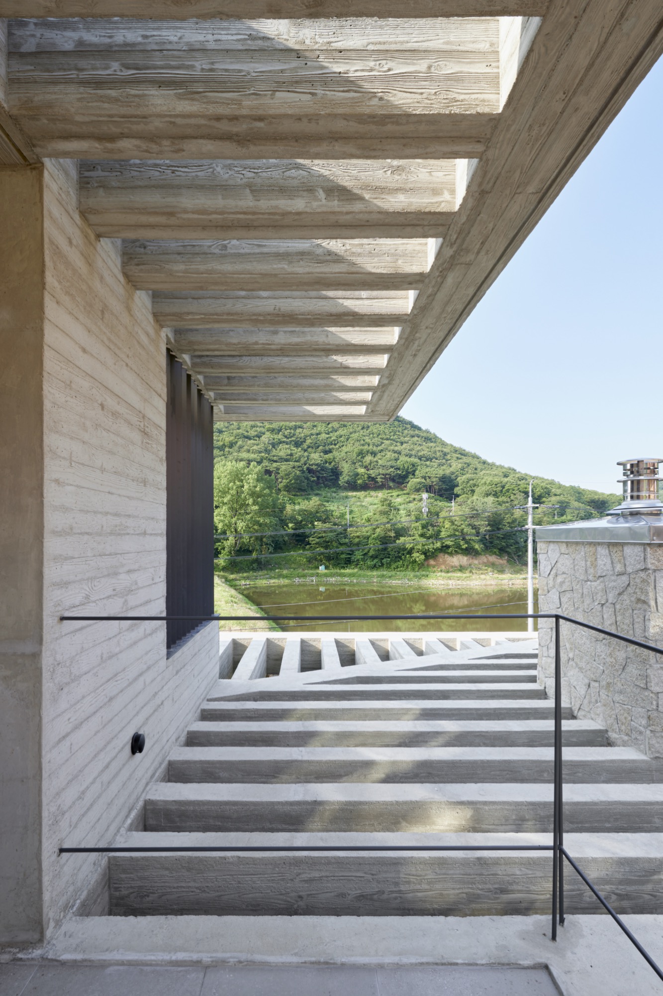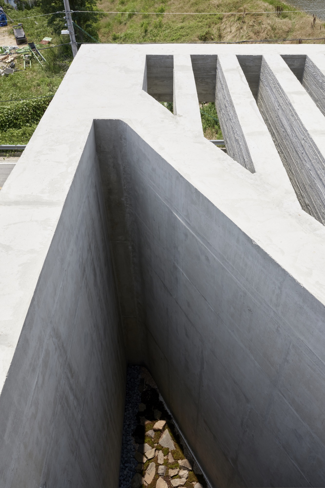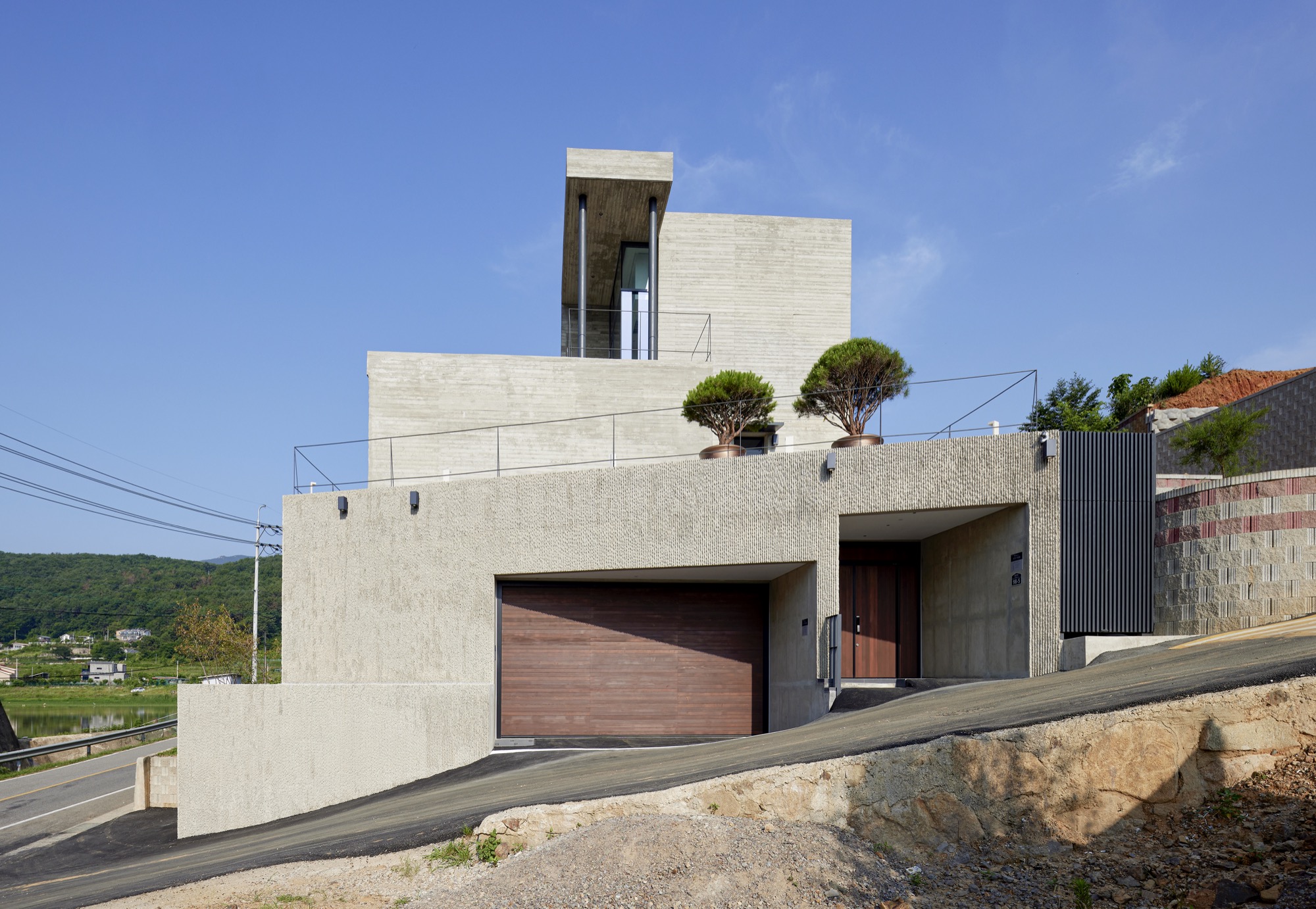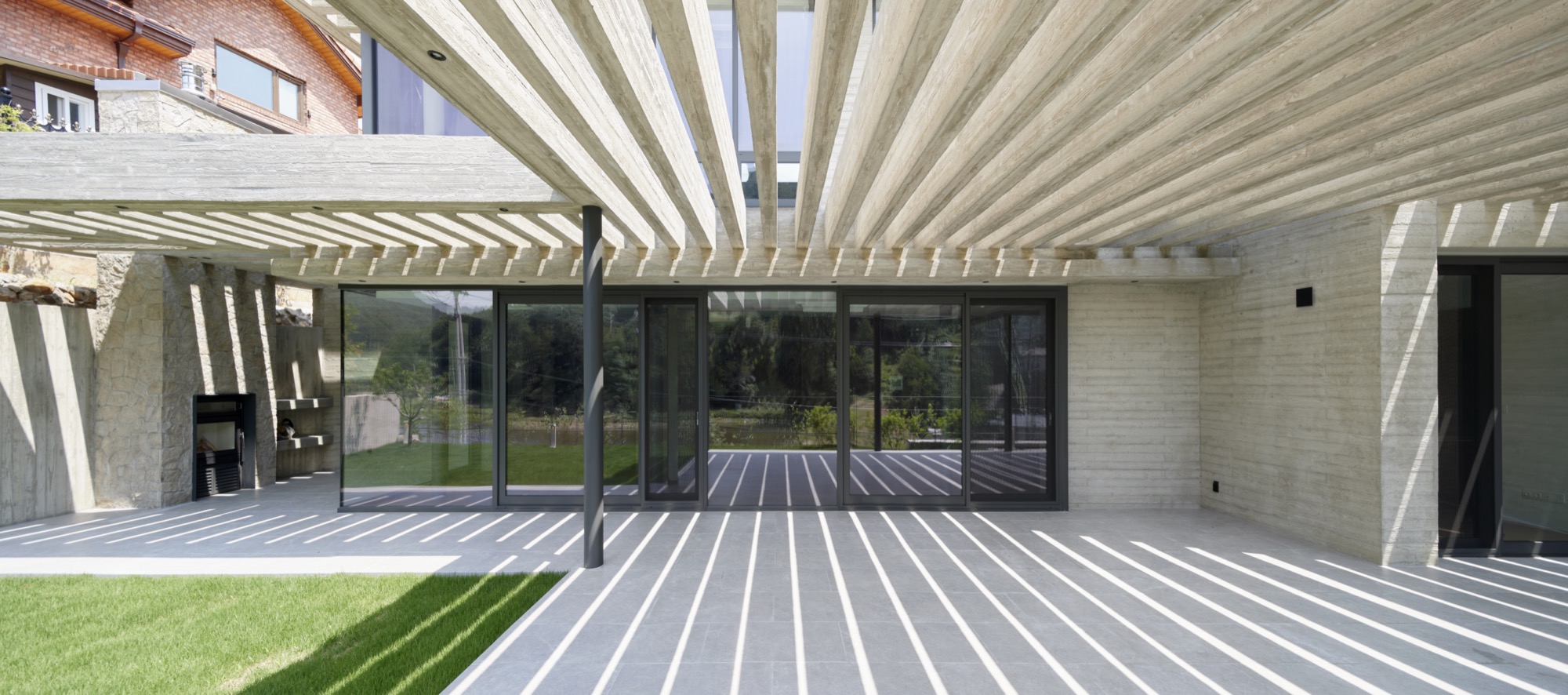 건물의 정면은 건축주의 요구에 따라 멋진 풍경을 담을 수 있도록 침실-거실-주방으로 이어지는 파노라마 뷰를 가진다. 하지만 정남향으로 배치된 공간은 강한 햇볕이 집안으로 들어와 눈부심이 발생할 수 있고, 정주환경에 좋지 않기 때문에 적절한 일사량 조절이 필요했다. 전창과 테라스 상부에 강한 일사를 막아줄 최대길이 7.5m의 거대한 콘크리트 루버를 만들었다. 루버는 집안으로 들어오는 빛을 조절하고, 집이 가지는 단단한 인상에도 큰 역할을 한다. 루버는 시시각각 변하는 그림자로 다채로운 공간감을 연출하고 경험하게 한다.
