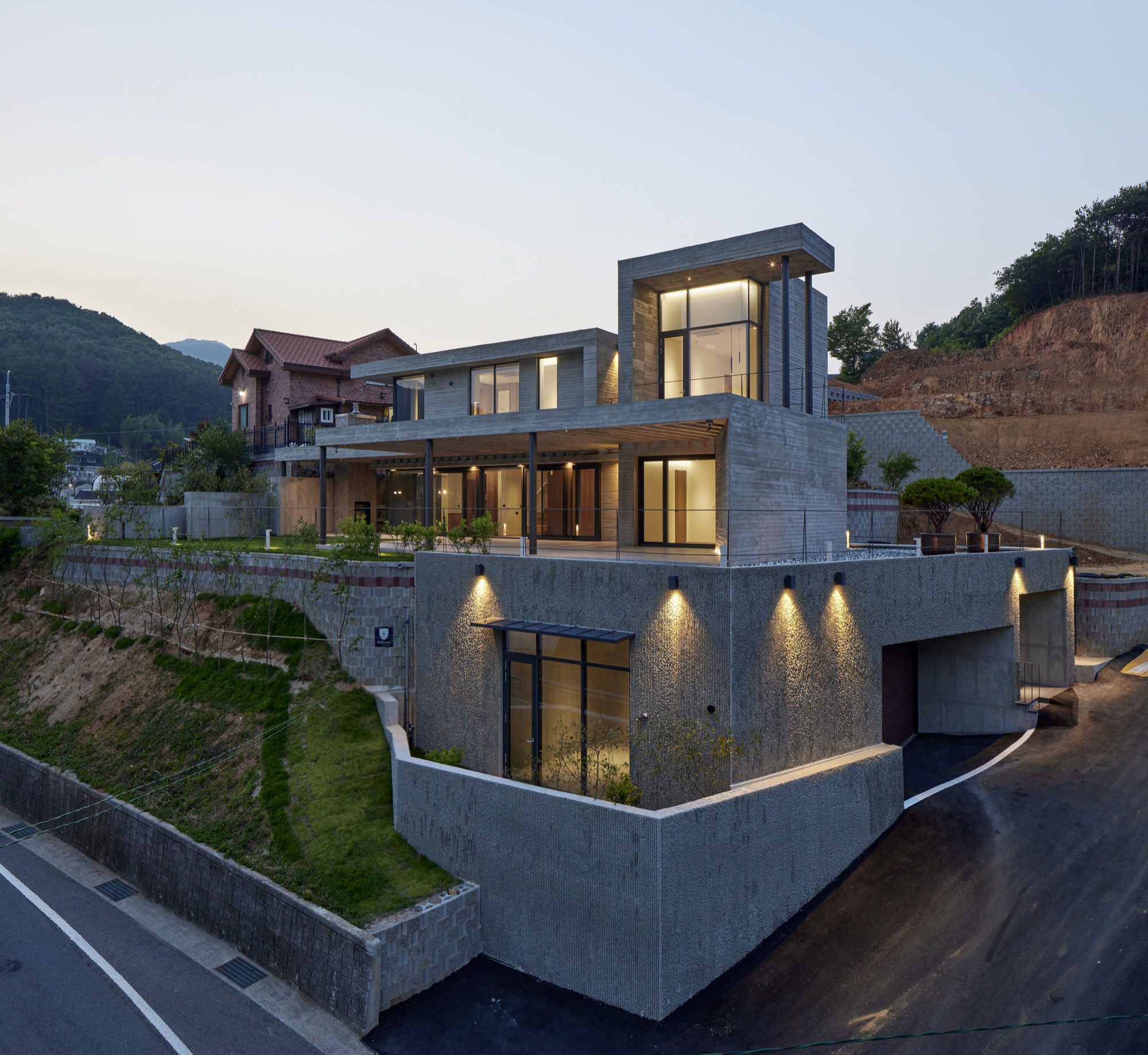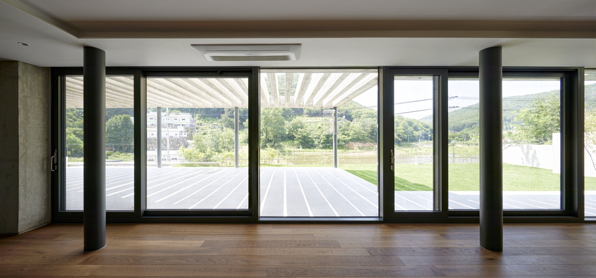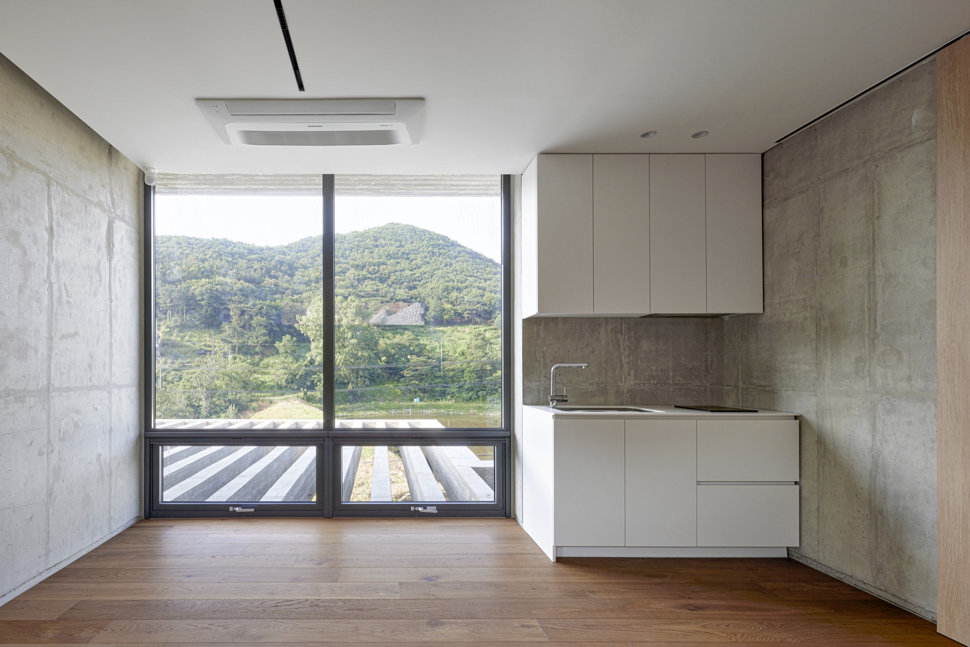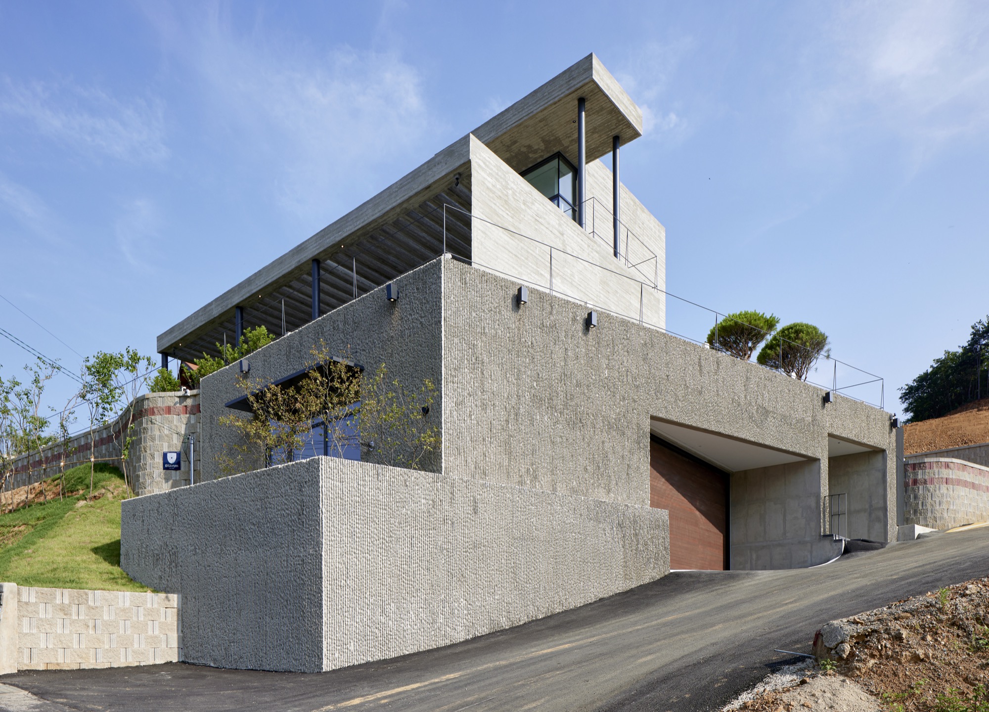 건물의 정면은 건축주의 요구에 따라 멋진 풍경을 담을 수 있도록 침실-거실-주방으로 이어지는 파노라마 뷰를 가진다. 하지만 정남향으로 배치된 공간은 강한 햇볕이 집안으로 들어와 눈부심이 발생할 수 있고, 정주환경에 좋지 않기 때문에 적절한 일사량 조절이 필요했다. 전창과 테라스 상부에 강한 일사를 막아줄 최대길이 7.5m의 거대한 콘크리트 루버를 만들었다. 루버는 집안으로 들어오는 빛을 조절하고, 집이 가지는 단단한 인상에도 큰 역할을 한다. 루버는 시시각각 변하는 그림자로 다채로운 공간감을 연출하고 경험하게 한다.