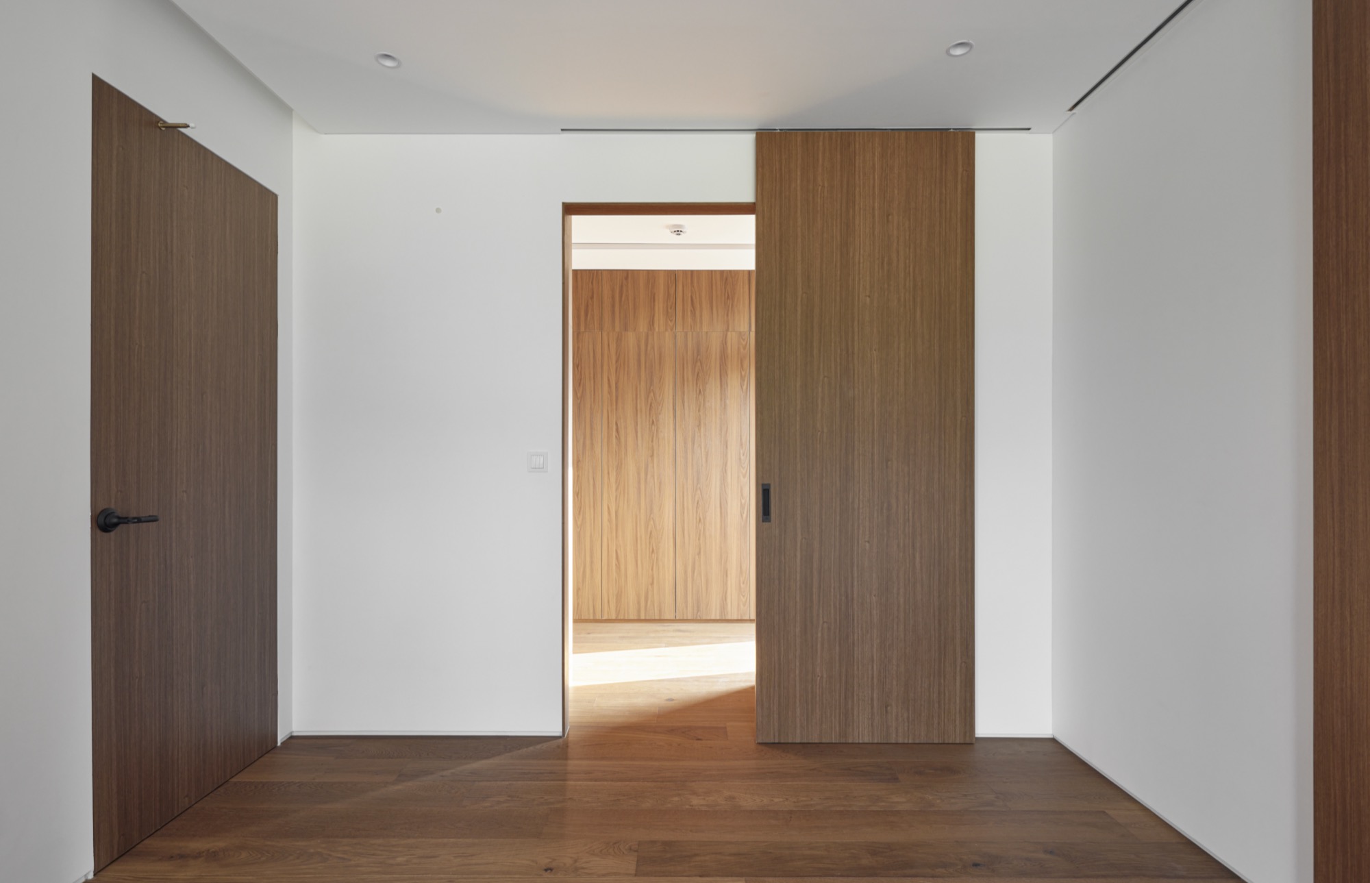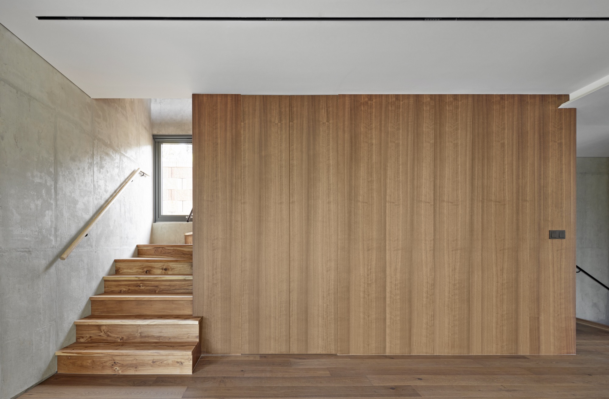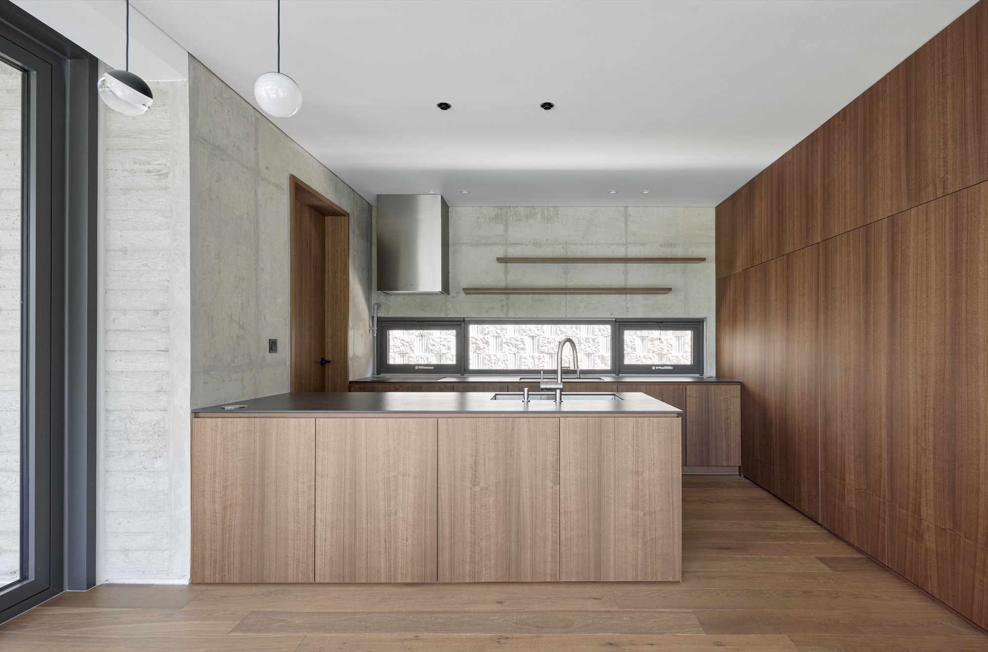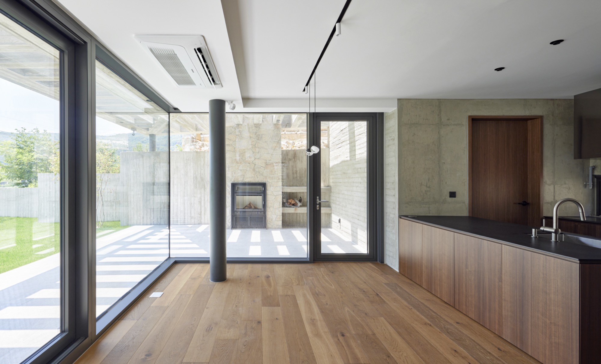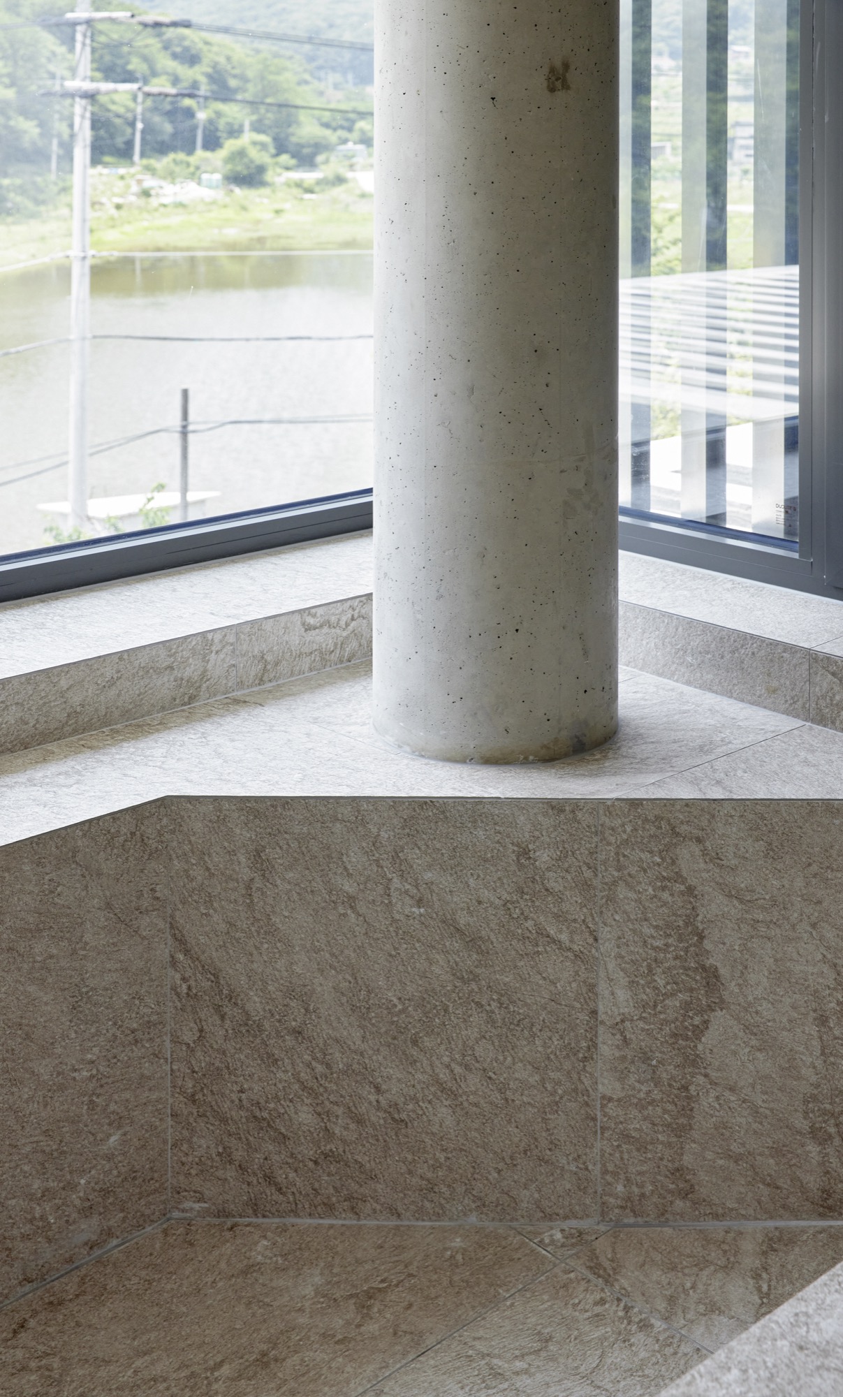건물의 정면은 건축주의 요구에 따라 멋진 풍경을 담을 수 있도록 침실-거실-주방으로 이어지는 파노라마 뷰를 가진다. 하지만 정남향으로 배치된 공간은 강한 햇볕이 집안으로 들어와 눈부심이 발생할 수 있고, 정주환경에 좋지 않기 때문에 적절한 일사량 조절이 필요했다. 전창과 테라스 상부에 강한 일사를 막아줄 최대길이 7.5m의 거대한 콘크리트 루버를 만들었다. 루버는 집안으로 들어오는 빛을 조절하고, 집이 가지는 단단한 인상에도 큰 역할을 한다. 루버는 시시각각 변하는 그림자로 다채로운 공간감을 연출하고 경험하게 한다.