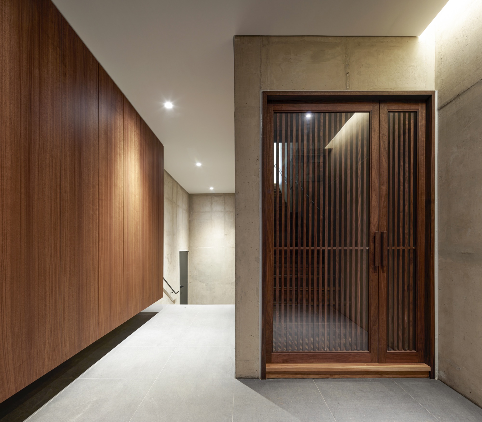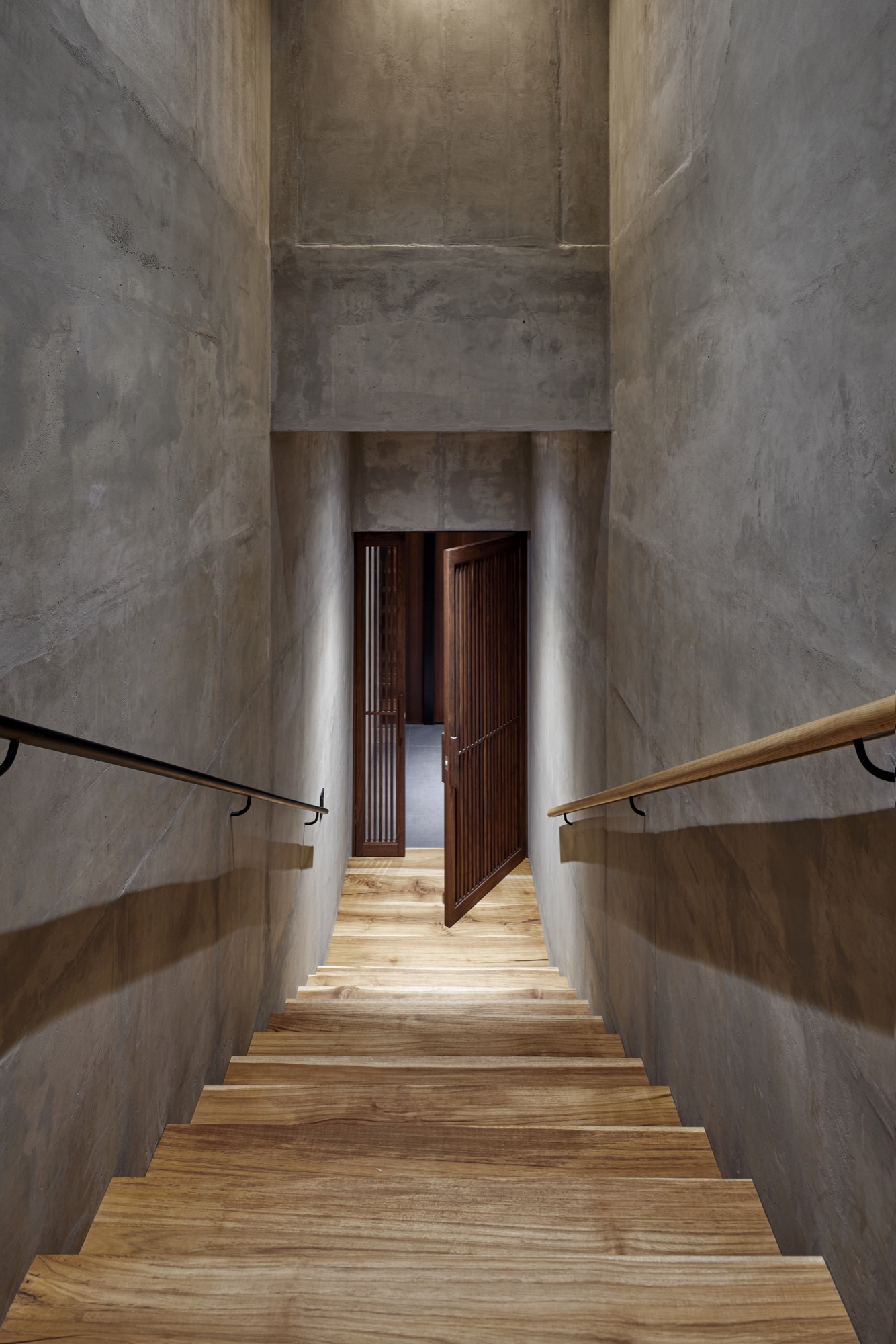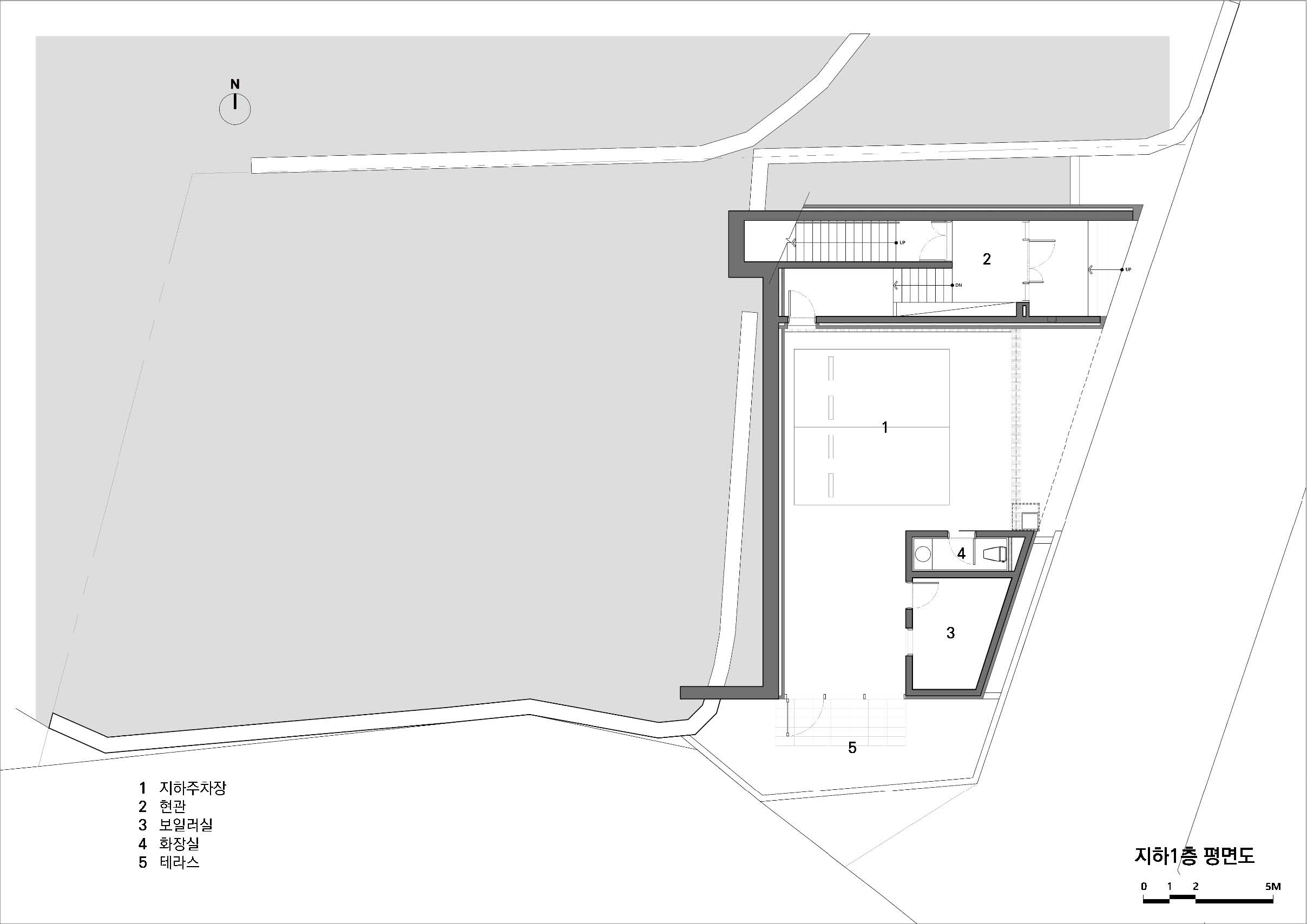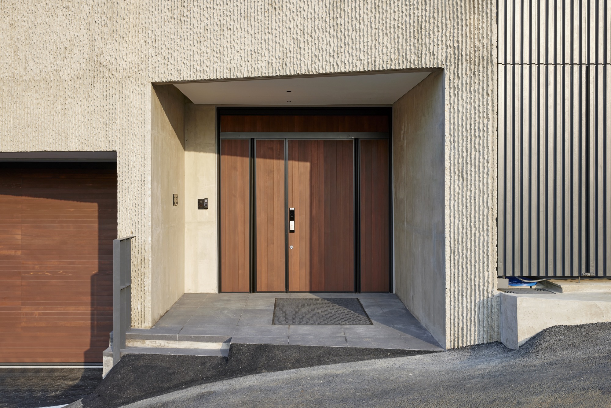 콘크리트의 단단한 물성을 선호하는 건축주를 위해 집의 내부와 외부 모두 중단열 노출콘크리트 공법을 사용했다. 노출콘크리트도 공간의 성격마다 다르게 느낄 수 있도록 각기 다른 질감을 가지도록 했다. 먼저 도로와 맞닿아 있는 지하층은 건물 전체를 떠받치고 있는 기단의 모습을 한다. 기단 같은 지하층은 땅에서 바로 융기된 바위처럼 보이도록 거친 표면을 가진 치핑콘크리트 질감을 사용해 단단한 인상을 만들었다. 거푸집 속에 EPS문양거푸집을 설치하고, 콘크리트를 양생한 뒤 망치로 하나하나 깨는 수작업을 통해 거친 표면을 완성했다. 지상층의 전체 외관은 송판노출콘크리트로 만들어 집으로서 지나치게 이질감이 들지 않도록 했다. 내부에도 견출콘크리트를 사용하여 콘크리트 재료 본연의 질감은 유지하면서도 매끈한 면 처리를 하여 불편함을 최소화하고자 했다. 콘크리트의 물성은 유지하되, 위치마다 구축 방법을 달리하여 획일적이지 않게 만들어냈다.
