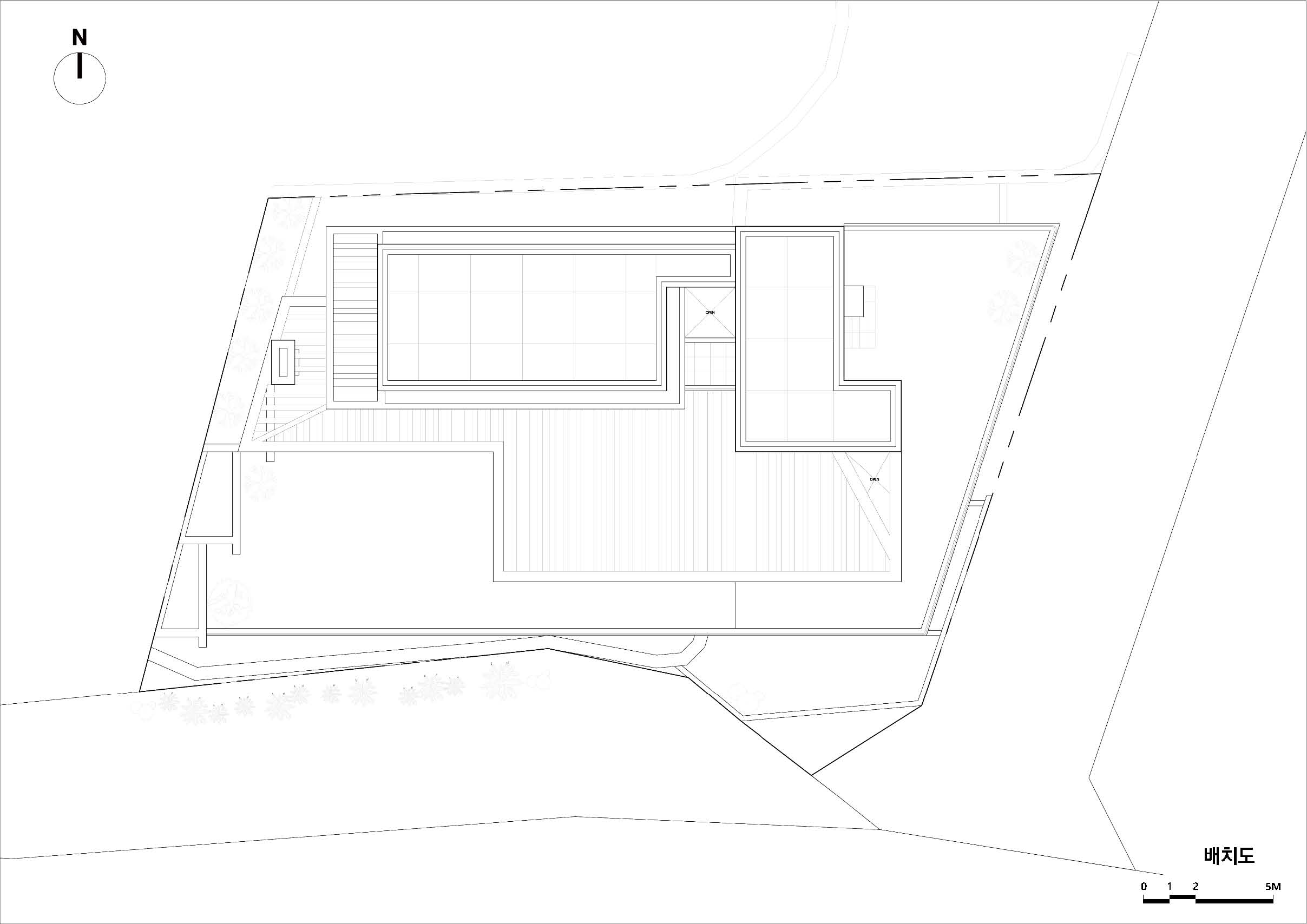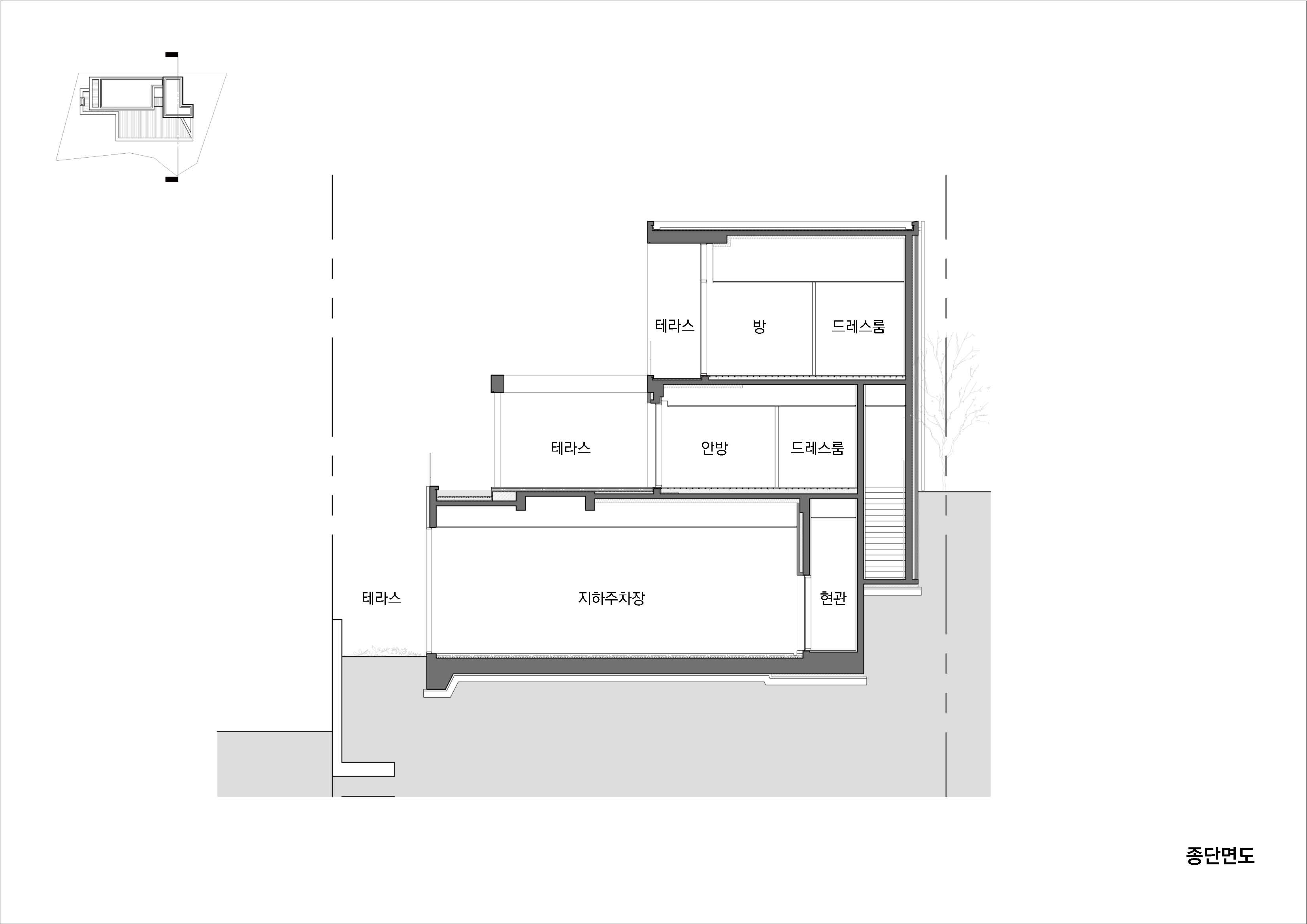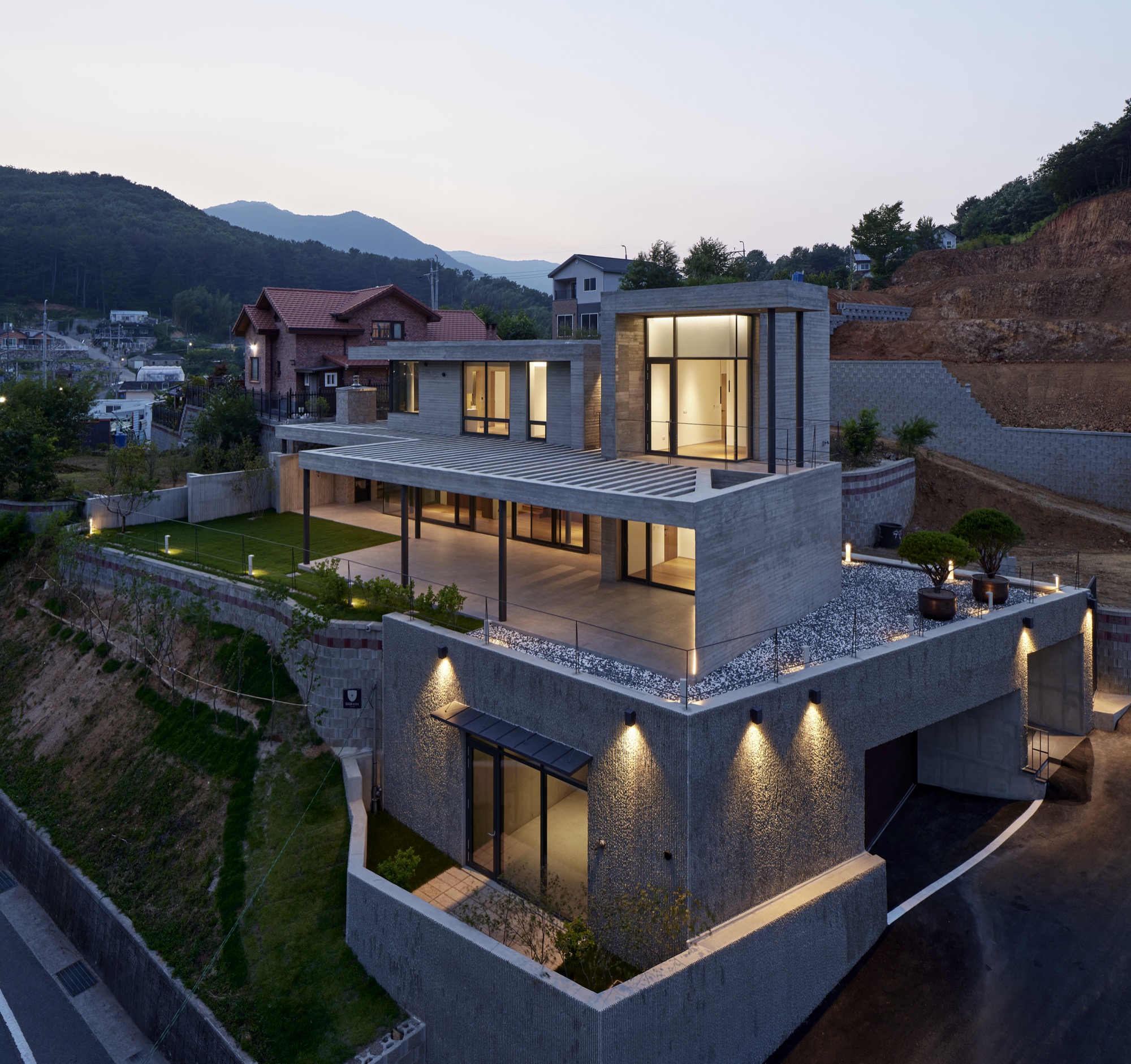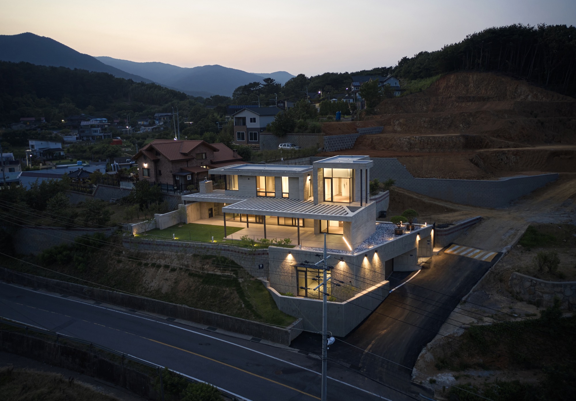 ‘양산 파노라마 하우스’는 임야를 깎아 터를 만든 전원주택 단지의 첫 번째 필지에 지어졌다. 4m 가량 단차가 있는 필지는 남쪽으로 당촌 저수지와 그 너머 산이 펼쳐진 수려한 풍경이 있었다. 모든 공간에서 저수지와 산을 바라보고, 도로의 시선은 차단되며, 내부와 외부의 마감은 견고하고 단단한 물성을 가진 재료로 구축되길 바라는 건축주의 요구 조건이 더해져 설계가 시작되었다.