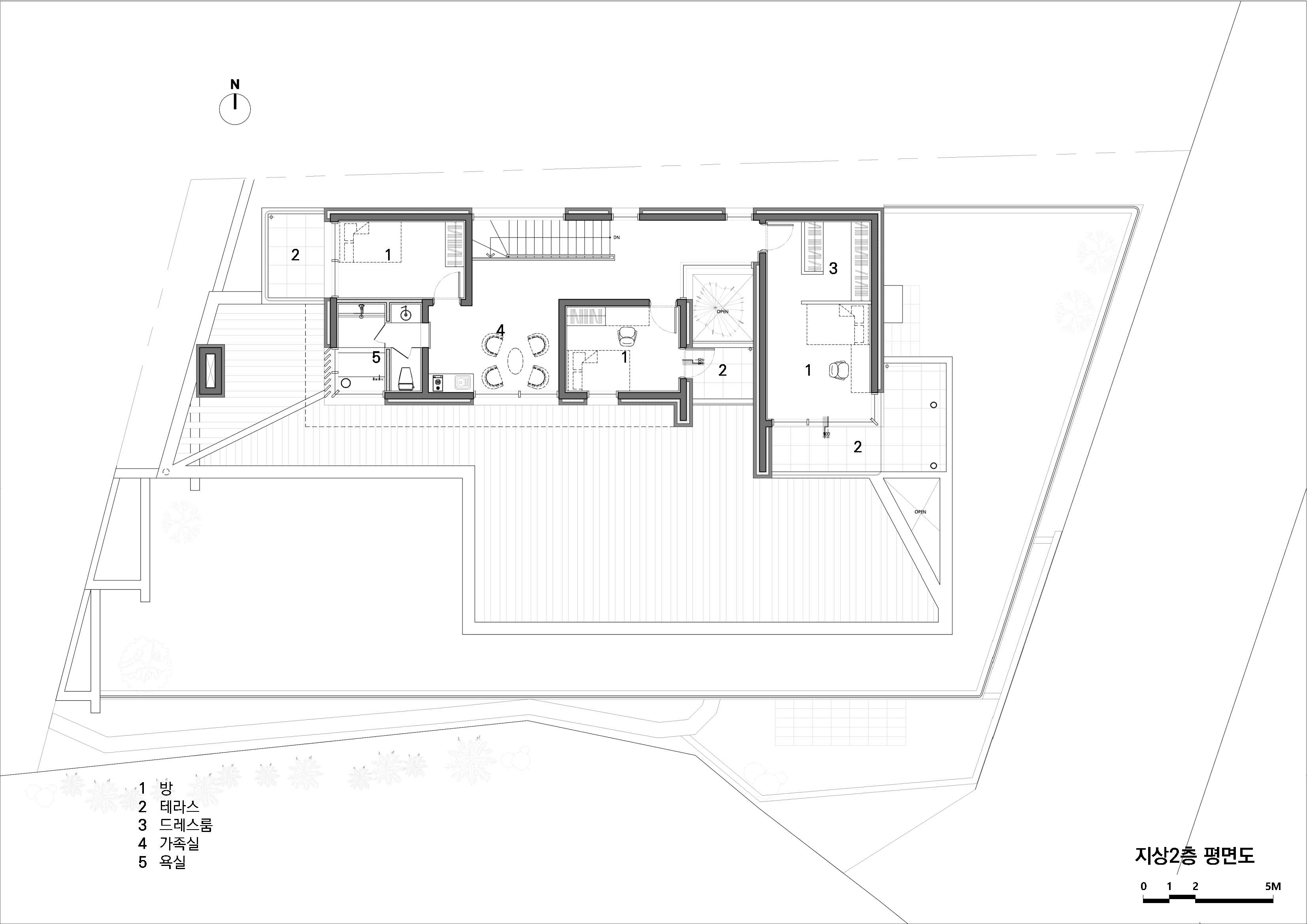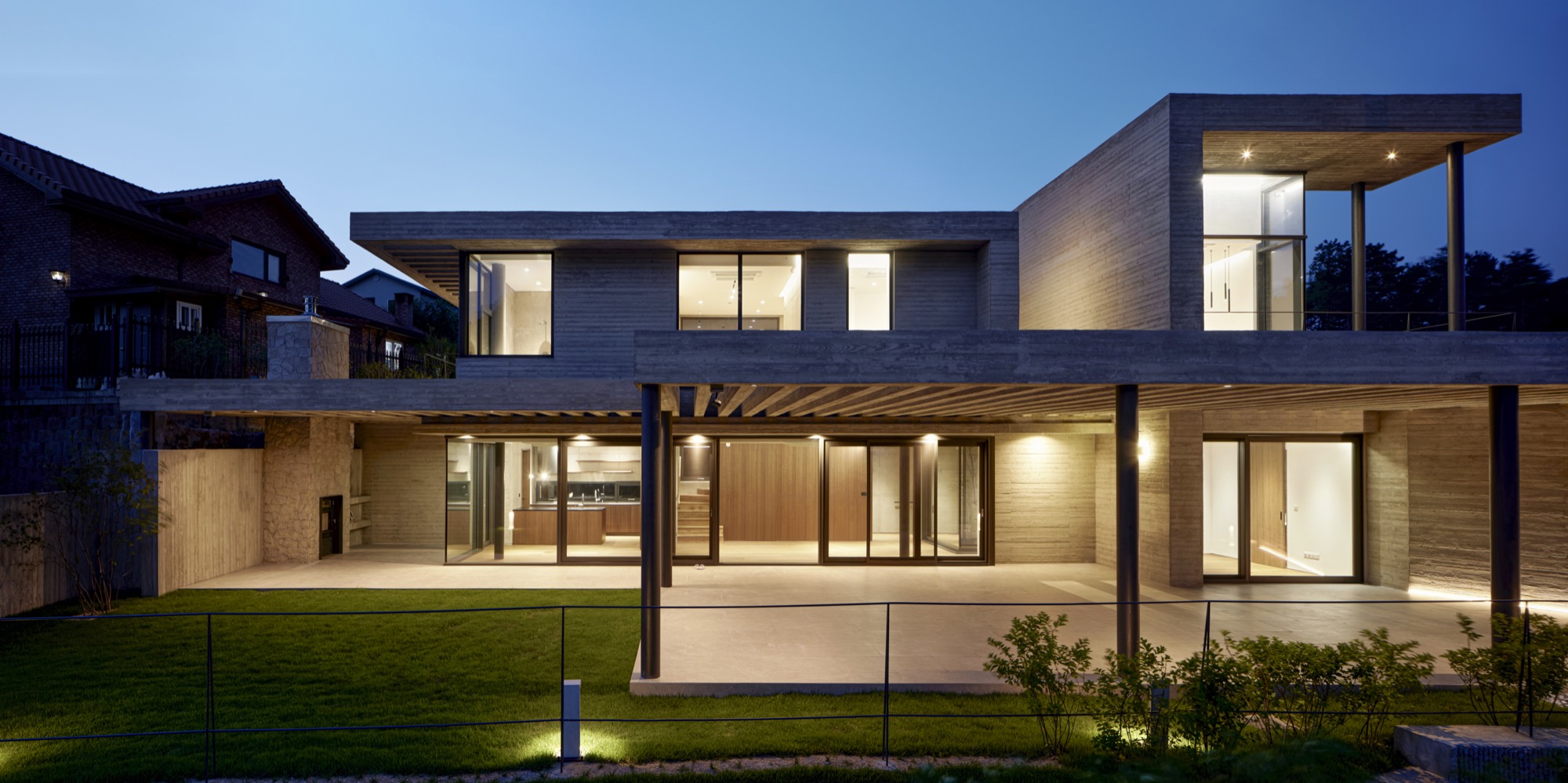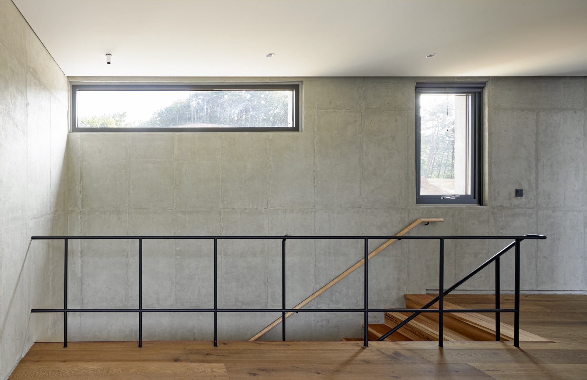 양산 파노라마 하우스는 외부에서 보면 거대한 건축물처럼 보이지만, 실제로는 지하층을 제외한 연면적이 65평이 채 되지 않는 규모다. 도로와 맞닿은 지하 1층에 있는 현관을 지나 계단을 오르면 당촌 저수지와 그 너머 풍경이 침실과 거실, 주방을 따라 하나의 파노라마처럼 이어지며 펼쳐진다. 풍경을 담아내는 전면 창 위쪽에는 커다란 콘크리트 루버 구조물이 공간의 성격마다 각기 다른 길이로 뻗어 나와 있으며, 전면 테라스와 1층으로 들어오는 강한 햇살을 가려주는 역할을 한다. 2층에 자리한 세 개의 침실은 온전히 개인을 위한 휴식 공간이 되도록 방마다 테라스를 가지며, 각 테라스는 기둥과 기둥, 벽과 벽, 벽과 지붕 사이 풍경을 감상할 수 있도록 했다.