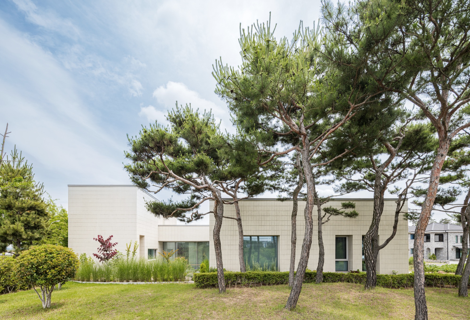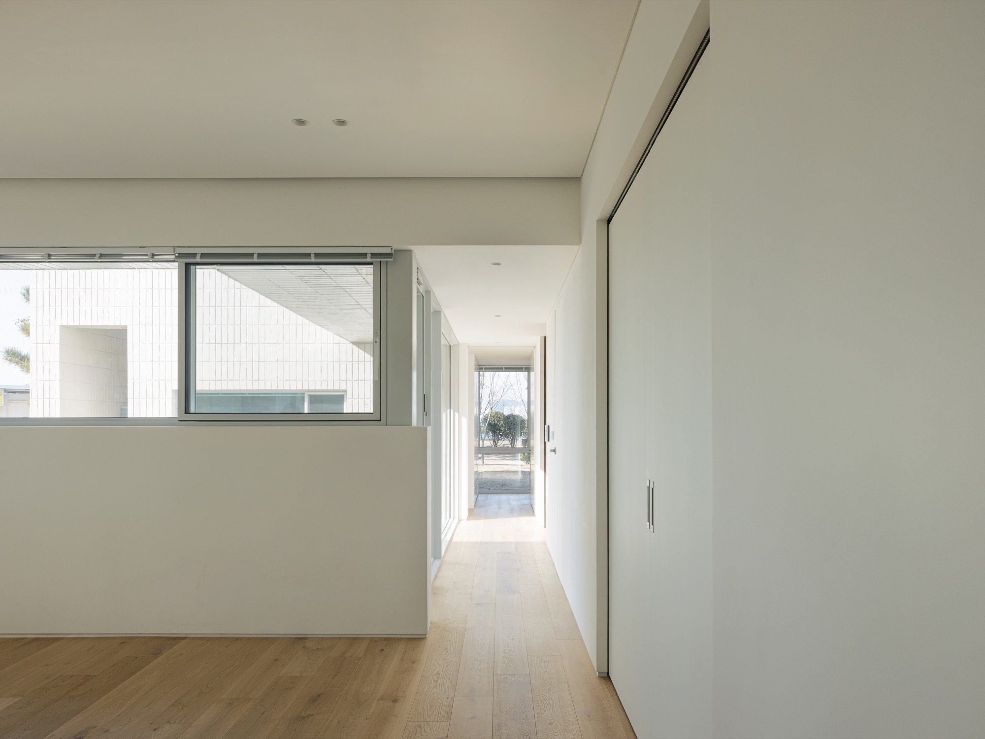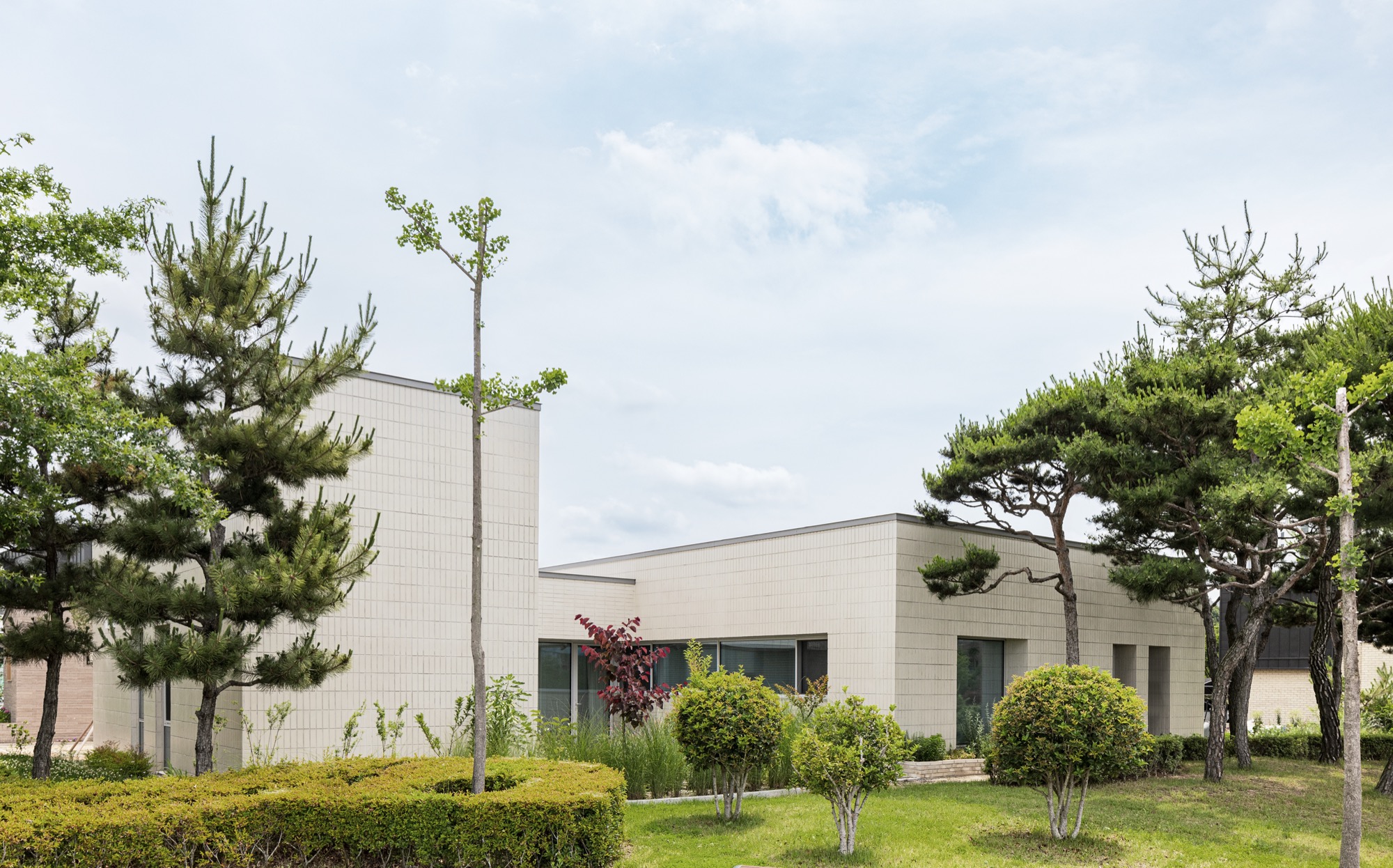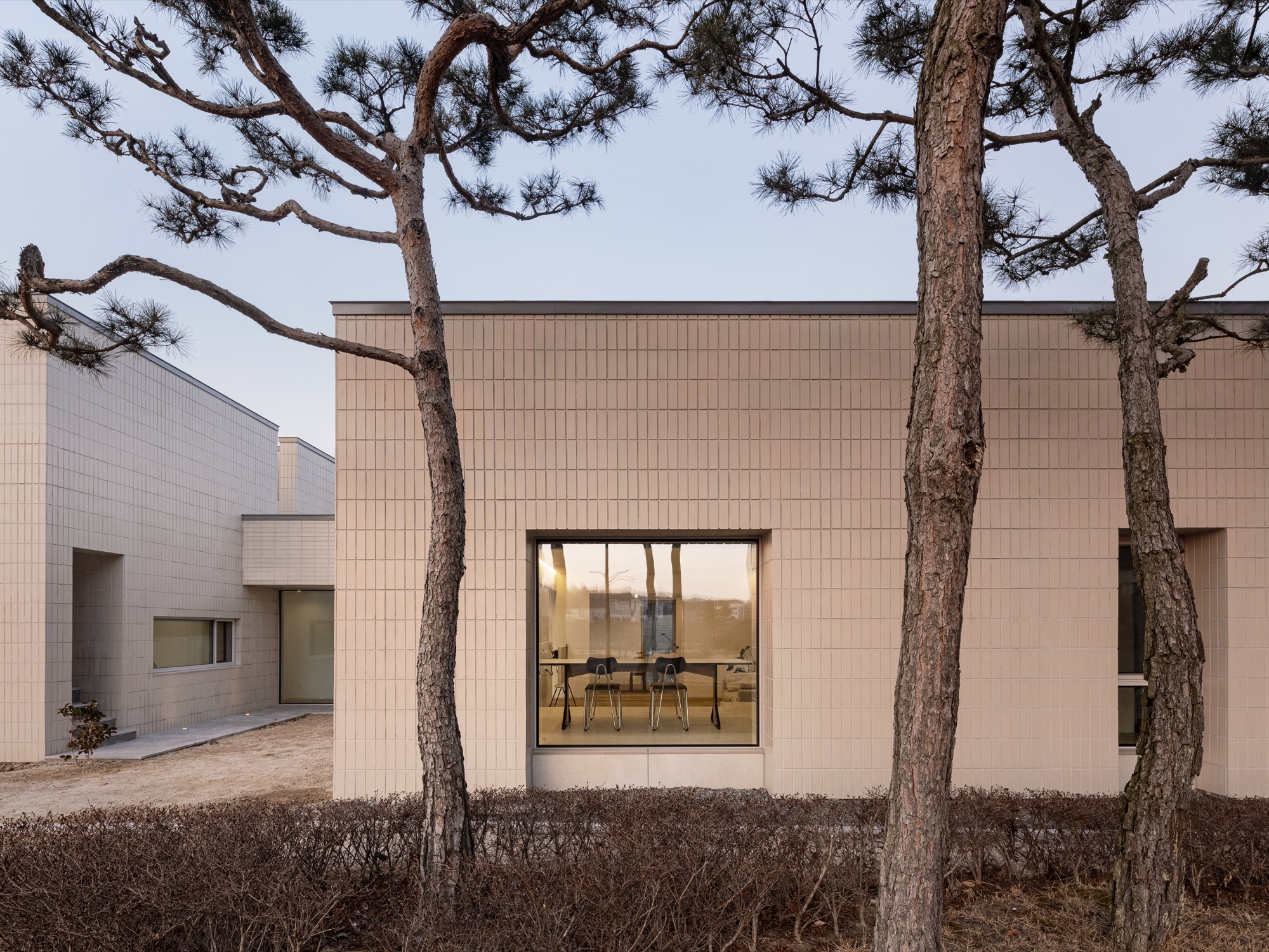 통창 너머로 소나무 군락을 바라보고, 소나무 사이로 큰 스케일의 풍경(저수지 공원과 남강)을 온종일 내려다볼 수 있도록 했다. 아기자기한 꽃나무로 조성된 북동쪽 녹지에는 주인 침실 영역을 배치하여 아늑한 풍경을 누릴 수 있도록 했다. 저수지 공원으로부터 밀려온 녹지는 대지 깊숙이 들어와 ㄷ자 집의 내밀한 중정이 된다. 각각의 공간은 각각의 풍경을 향유하는 동시에 중정 풍경을 공유한다.