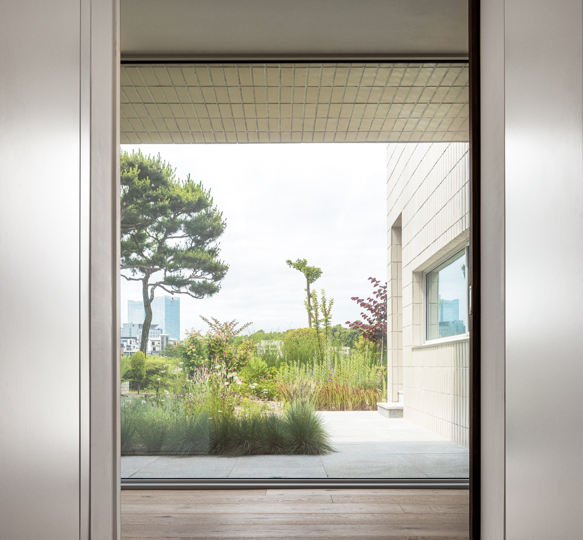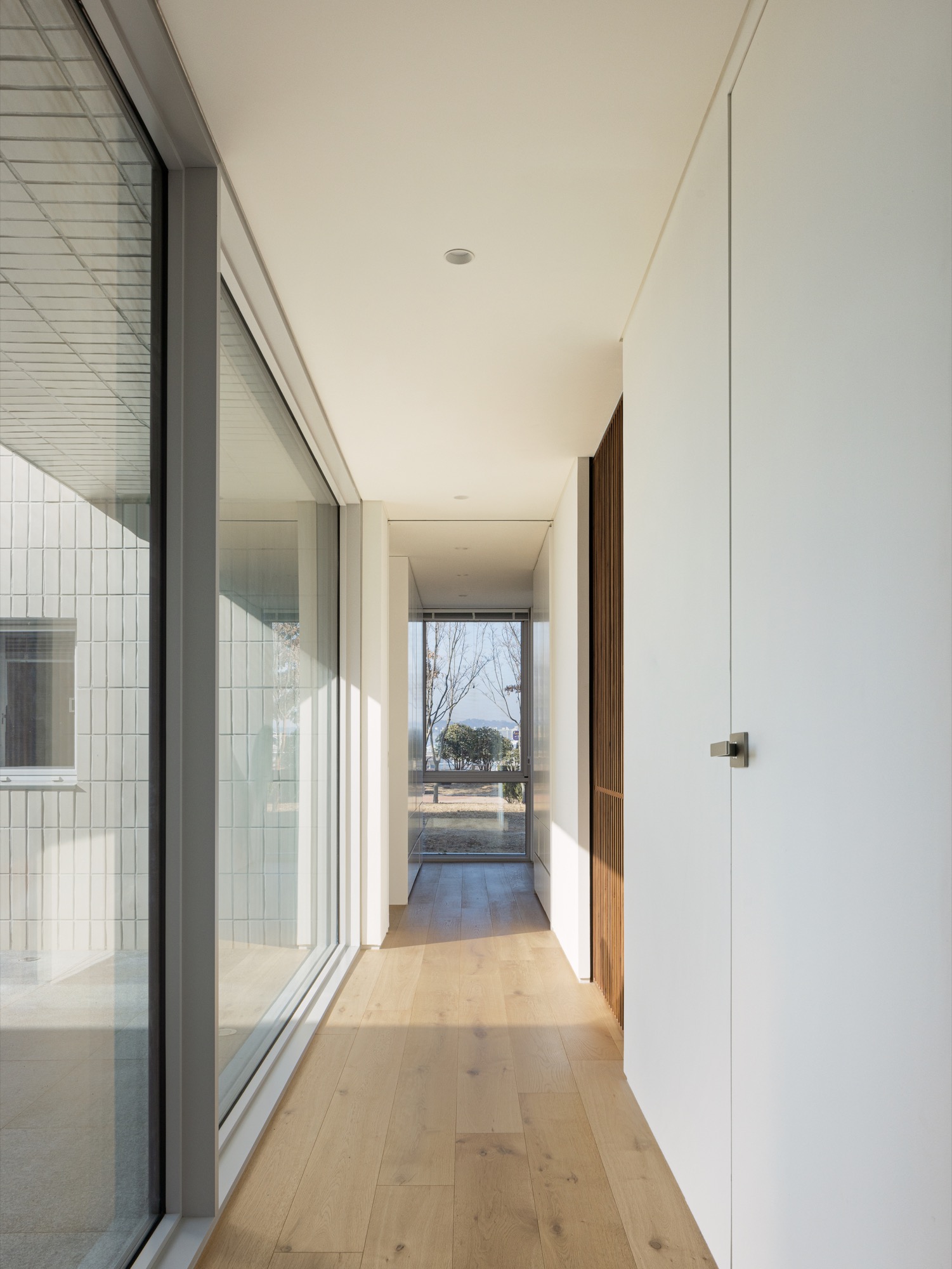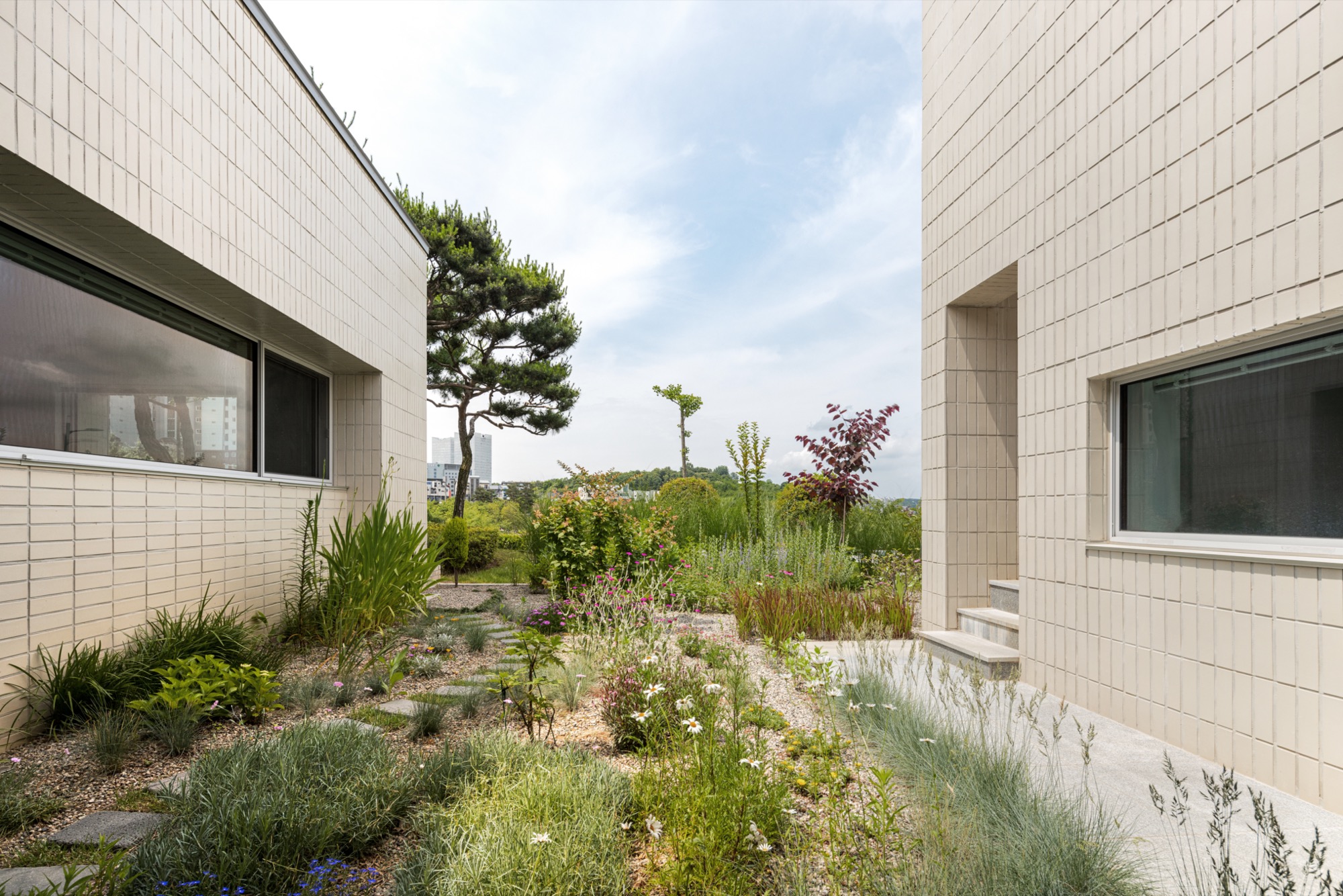 통창 너머로 소나무 군락을 바라보고, 소나무 사이로 큰 스케일의 풍경(저수지 공원과 남강)을 온종일 내려다볼 수 있도록 했다. 아기자기한 꽃나무로 조성된 북동쪽 녹지에는 주인 침실 영역을 배치하여 아늑한 풍경을 누릴 수 있도록 했다. 저수지 공원으로부터 밀려온 녹지는 대지 깊숙이 들어와 ㄷ자 집의 내밀한 중정이 된다. 각각의 공간은 각각의 풍경을 향유하는 동시에 중정 풍경을 공유한다.