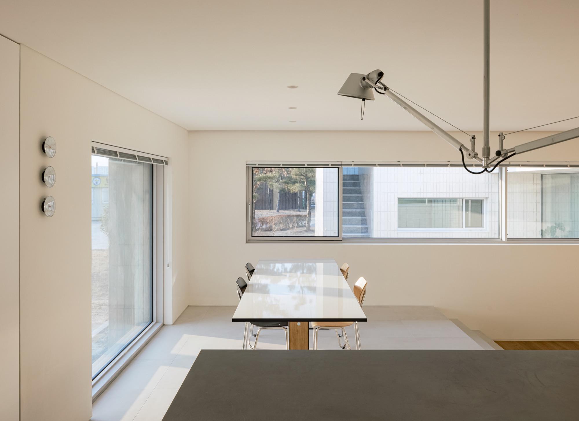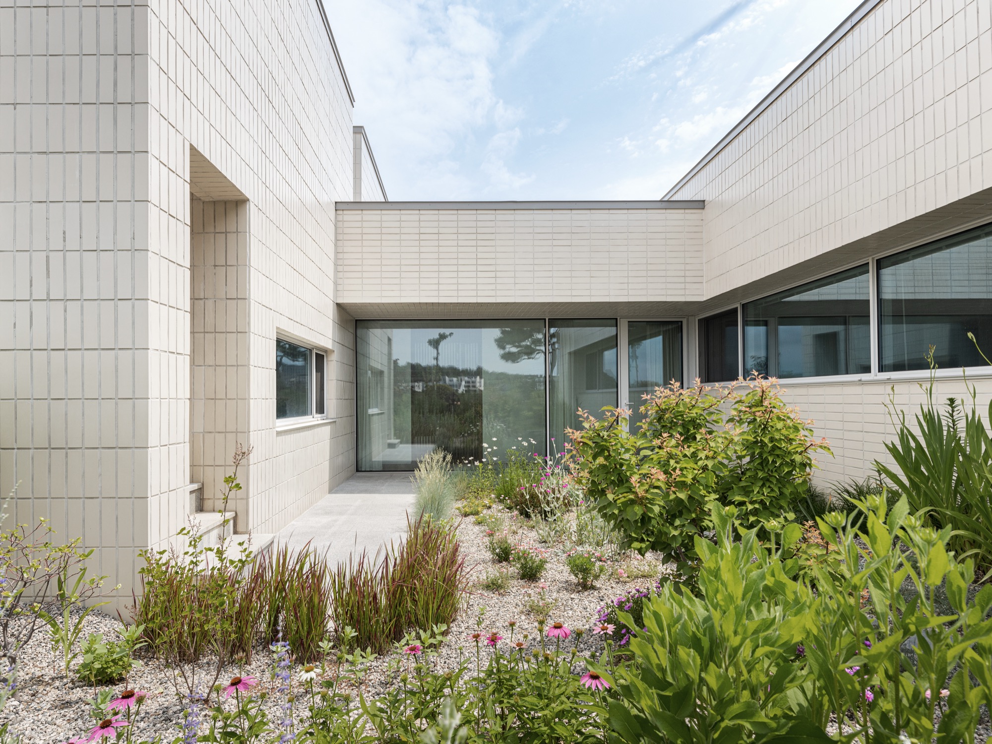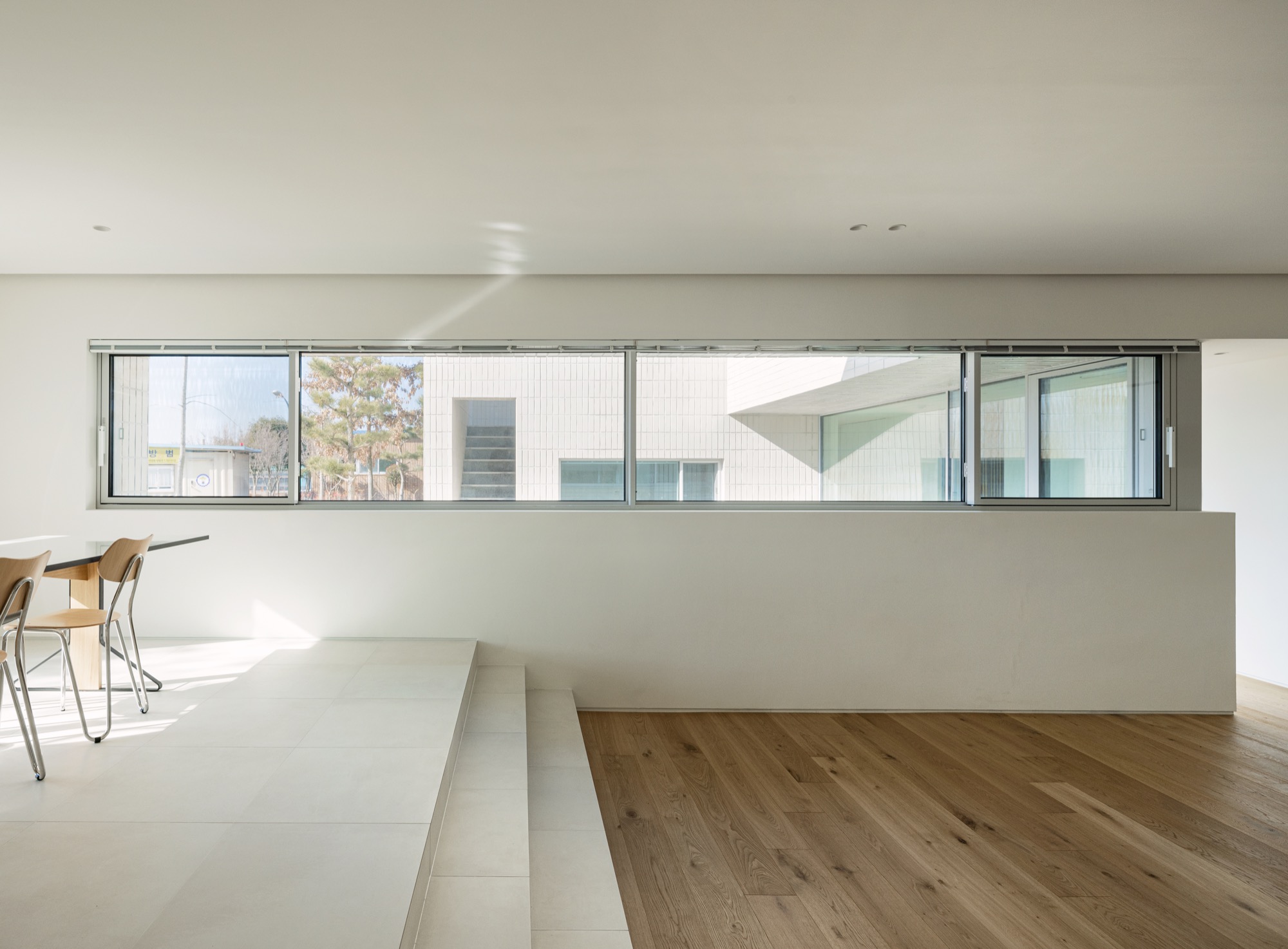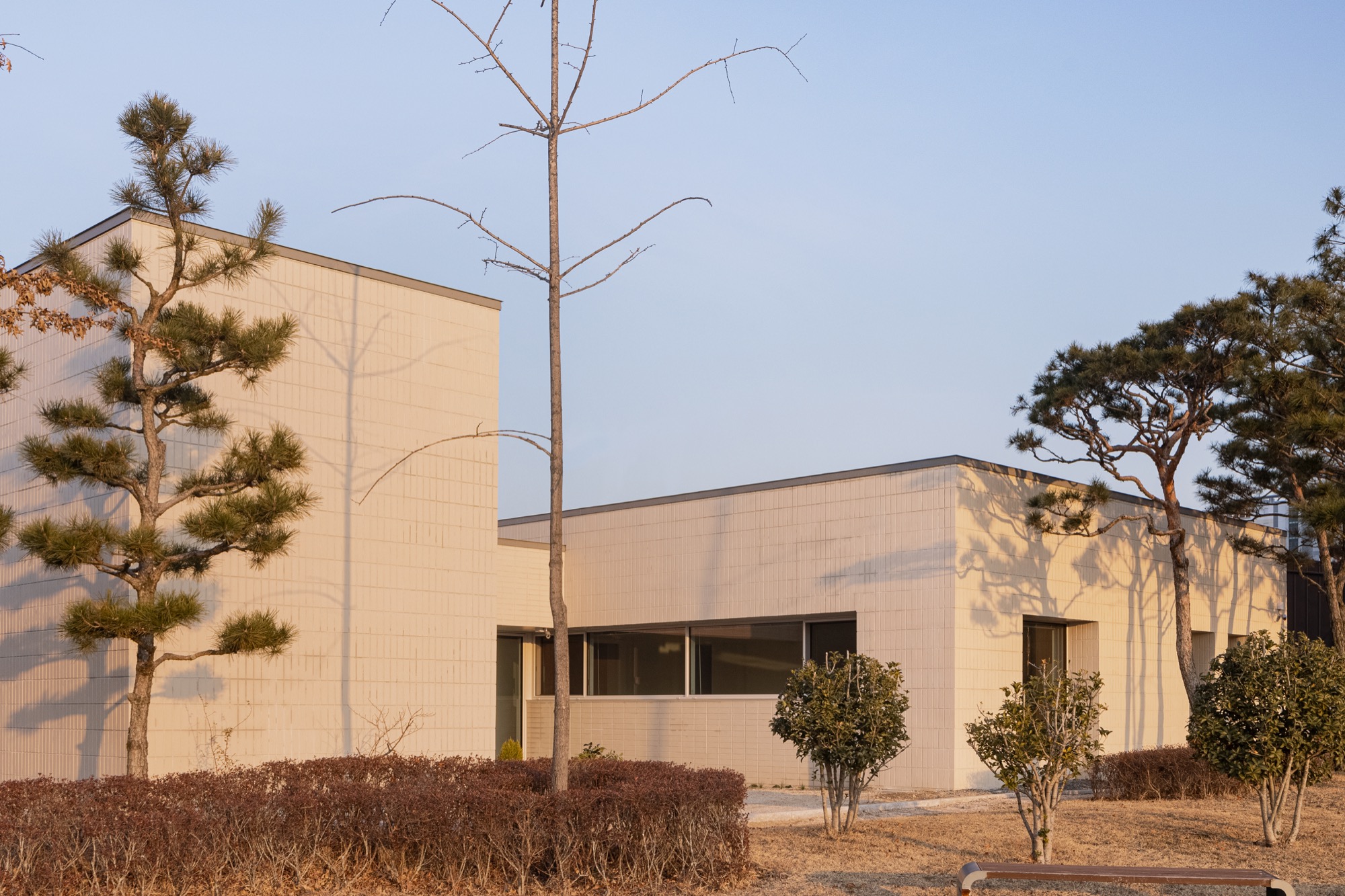 통창 너머로 소나무 군락을 바라보고, 소나무 사이로 큰 스케일의 풍경(저수지 공원과 남강)을 온종일 내려다볼 수 있도록 했다. 아기자기한 꽃나무로 조성된 북동쪽 녹지에는 주인 침실 영역을 배치하여 아늑한 풍경을 누릴 수 있도록 했다. 저수지 공원으로부터 밀려온 녹지는 대지 깊숙이 들어와 ㄷ자 집의 내밀한 중정이 된다. 각각의 공간은 각각의 풍경을 향유하는 동시에 중정 풍경을 공유한다.