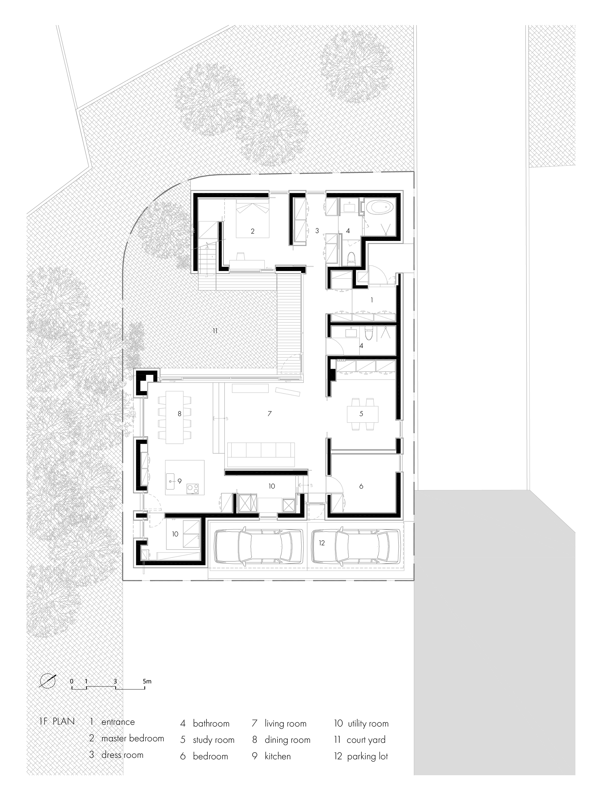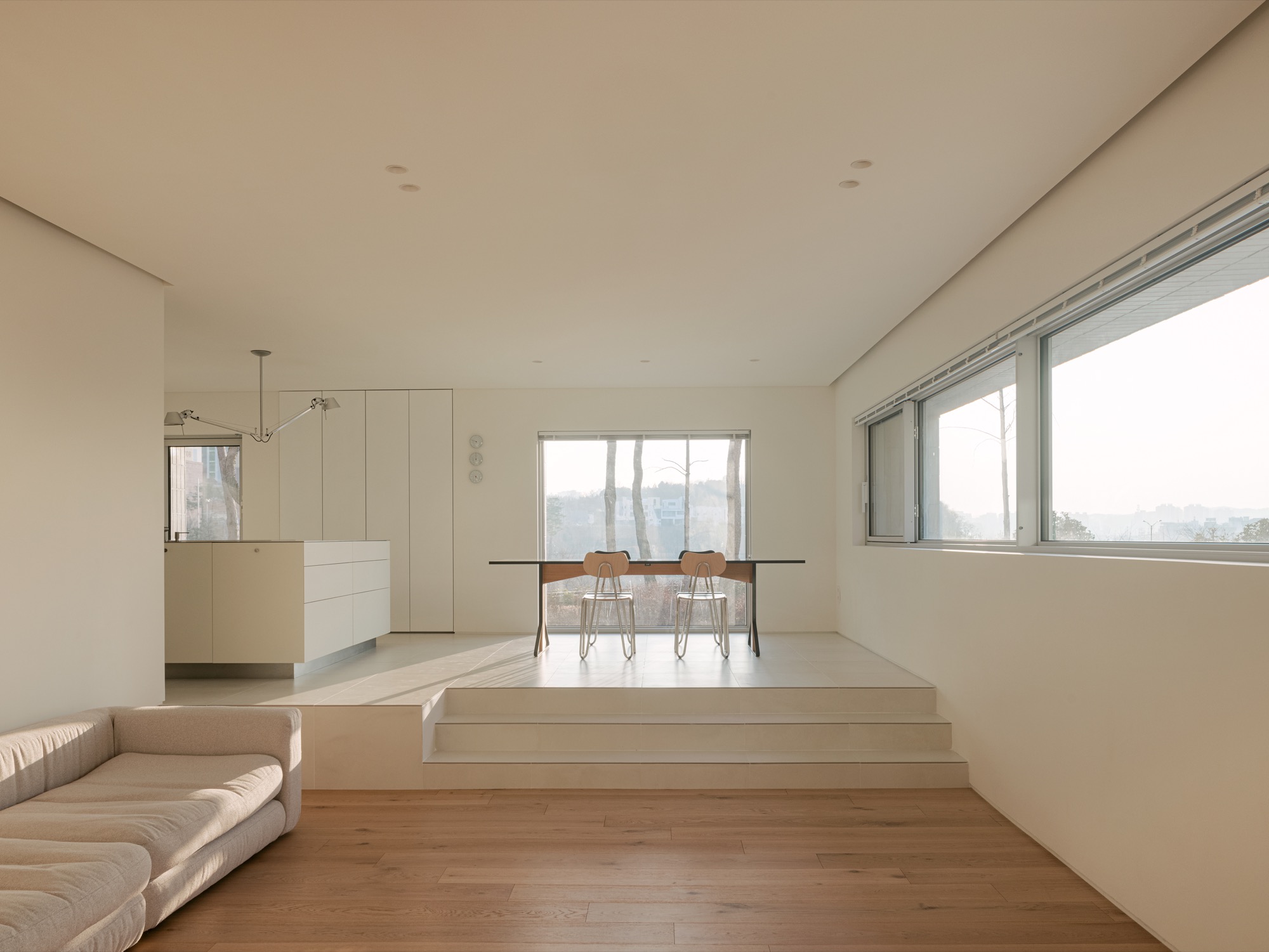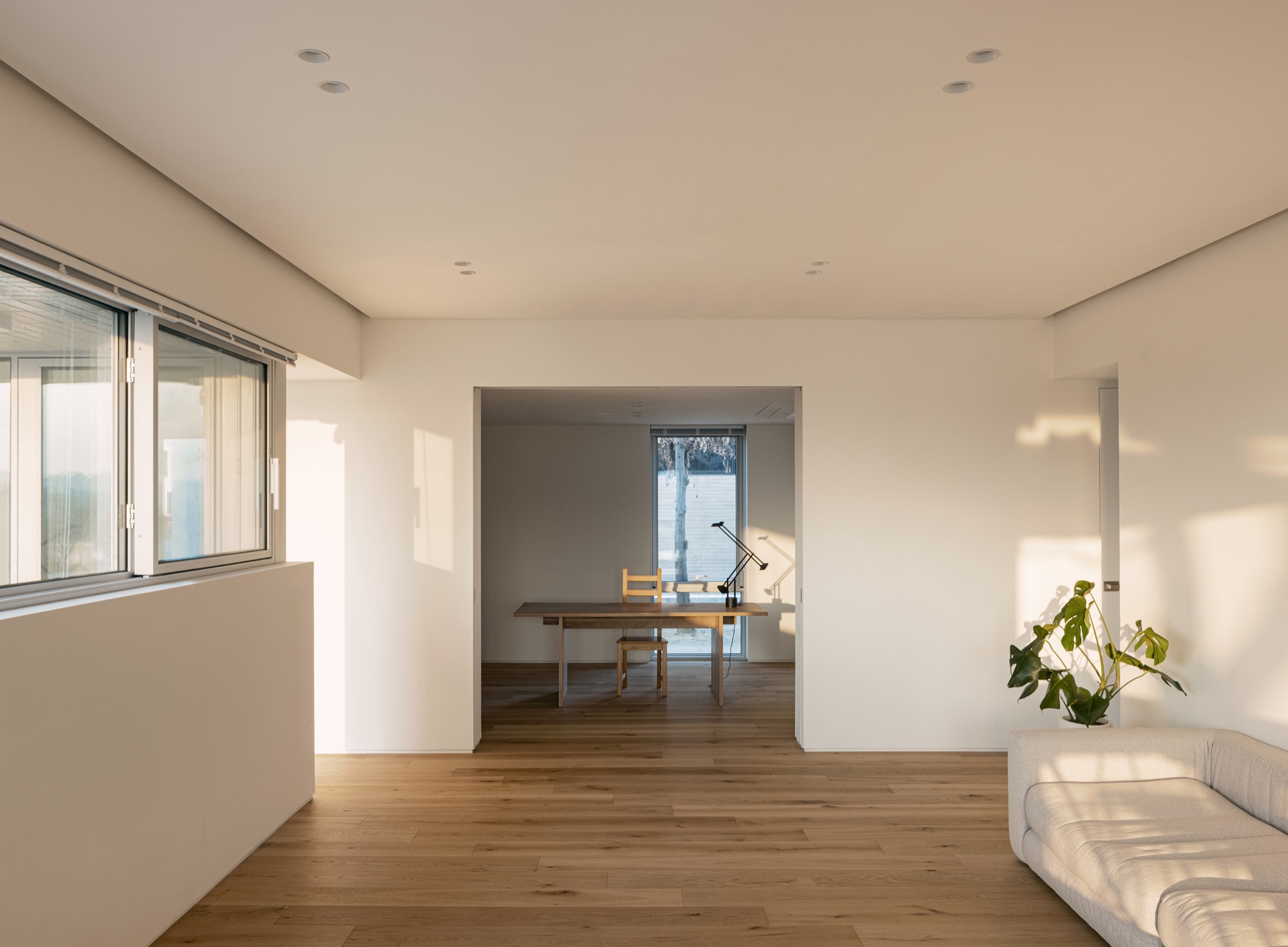 평면은 사적공간(마스터룸,드레스룸,화장실), 복도(현관,화장실), 공용공간(거실,다이닝룸)이 ㄷ자로 중정을 감싸도록 계획되었다. 여러해살이 화초류로 가득 찬 중정은 이 집의 중심 공간으로 다양한 형태의 창을 통해 내부와 소통한다. 북동쪽 산책로에 면한 진입부는 프라이빗한 모습이지만, 현관문을 열고 들어오면 중정과 공원이 가득 담긴 통창을 마주한다. 거실과 다이닝룸을 잇는 긴 창은 같은 방향으로 중정을 바라보고 있지만, 바닥 레벨 차이를 두어 서로 다른 높이의 시선으로 중정을 즐길 수 있다. 서재는 북쪽 산책로 쪽으로 창이 나 있지만, 포켓도어를 열면 거실과 하나로 연결되어, 취미실-거실-다이닝룸-공원까지 이어지는 깊은 공간감을 느낄 수 있다.