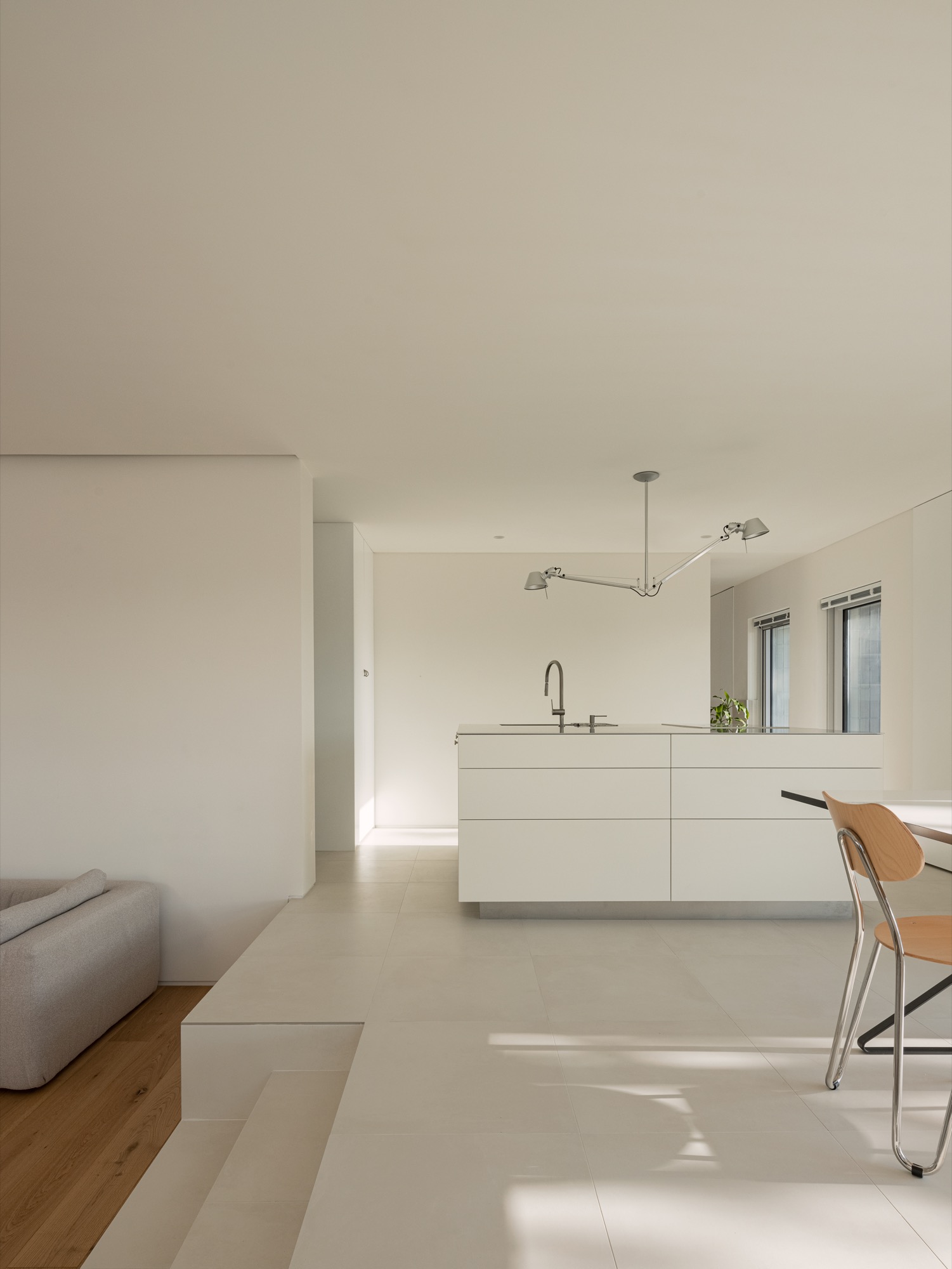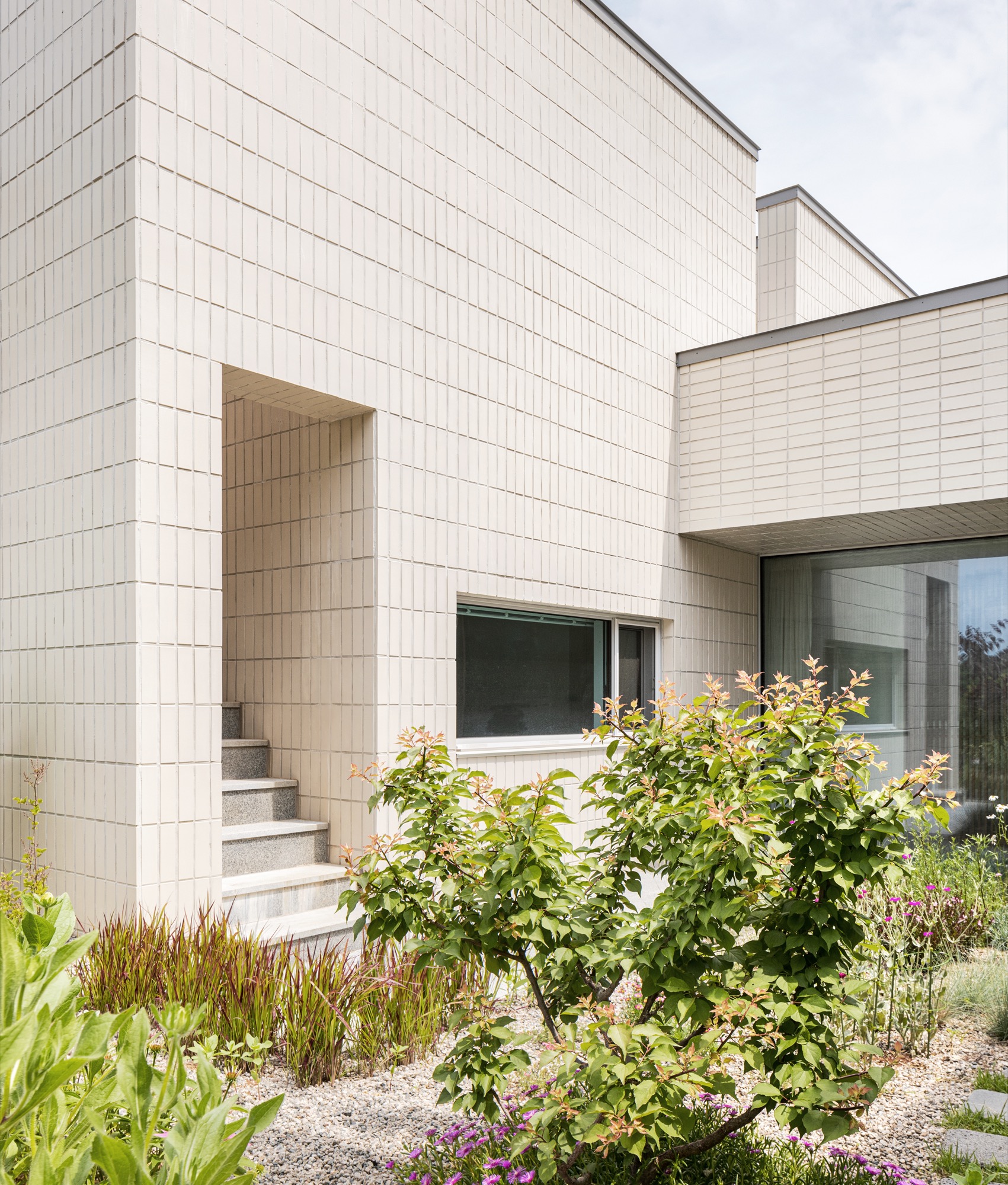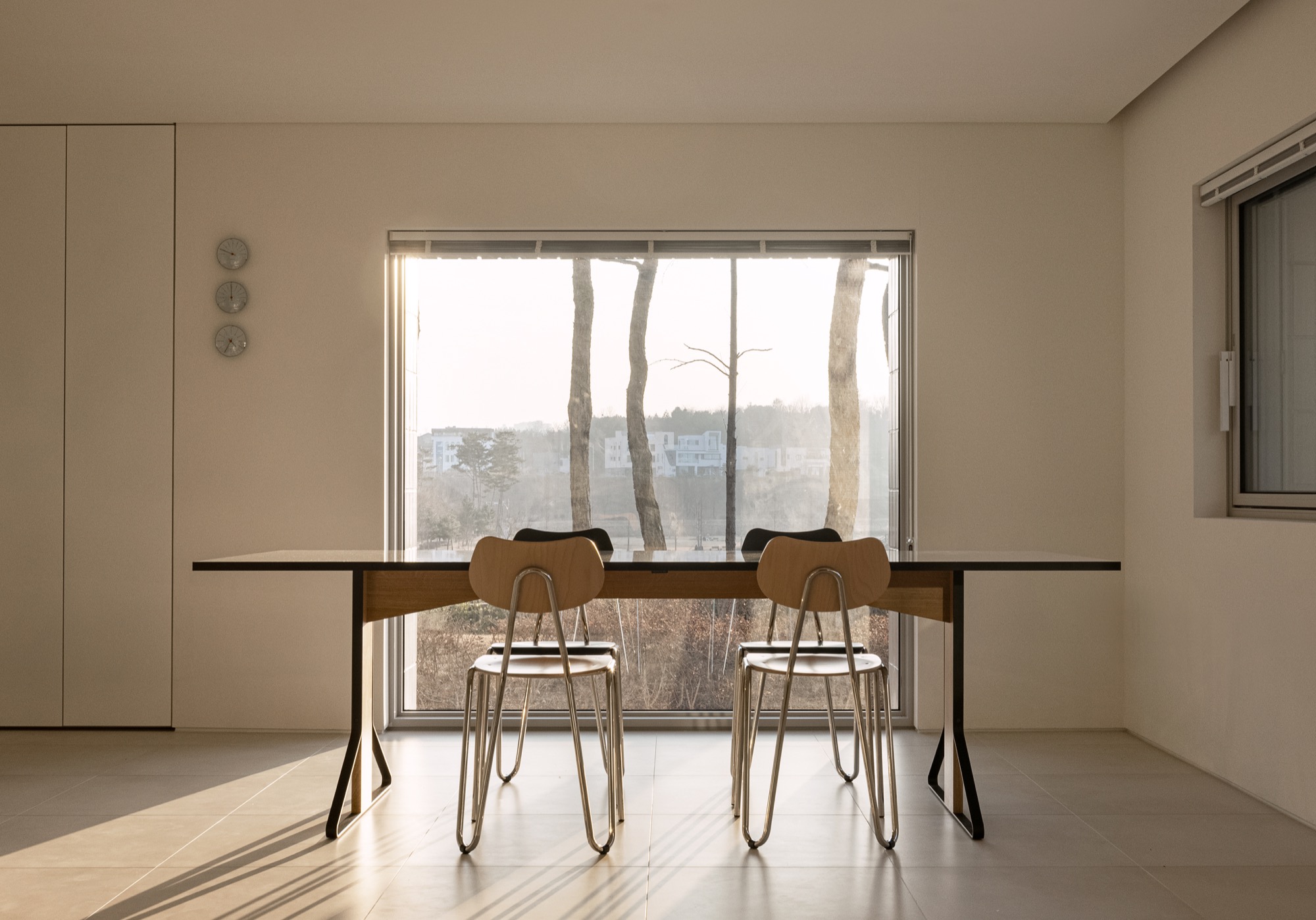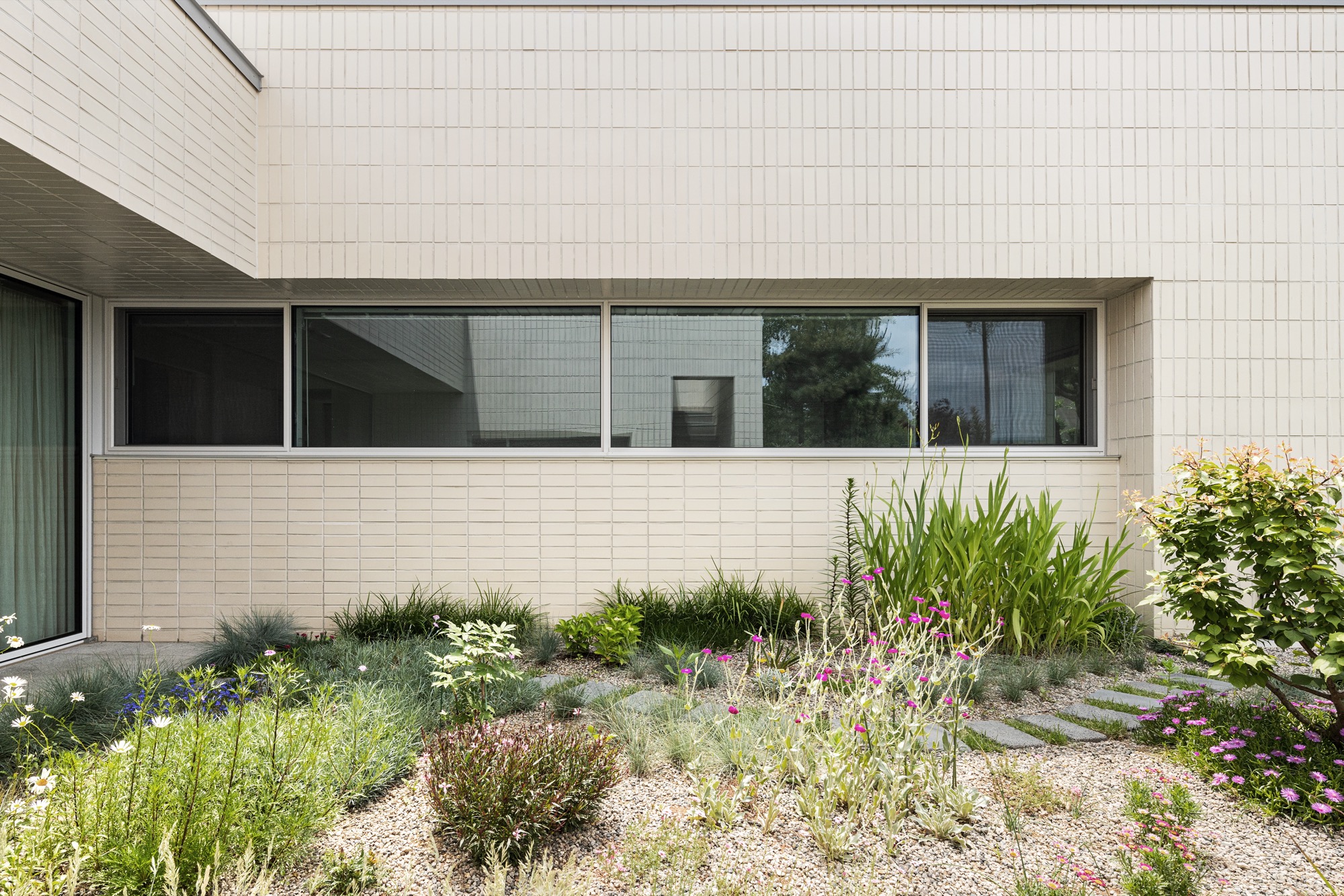 평면은 사적공간(마스터룸,드레스룸,화장실), 복도(현관,화장실), 공용공간(거실,다이닝룸)이 ㄷ자로 중정을 감싸도록 계획되었다. 여러해살이 화초류로 가득 찬 중정은 이 집의 중심 공간으로 다양한 형태의 창을 통해 내부와 소통한다. 북동쪽 산책로에 면한 진입부는 프라이빗한 모습이지만, 현관문을 열고 들어오면 중정과 공원이 가득 담긴 통창을 마주한다. 거실과 다이닝룸을 잇는 긴 창은 같은 방향으로 중정을 바라보고 있지만, 바닥 레벨 차이를 두어 서로 다른 높이의 시선으로 중정을 즐길 수 있다. 서재는 북쪽 산책로 쪽으로 창이 나 있지만, 포켓도어를 열면 거실과 하나로 연결되어, 취미실-거실-다이닝룸-공원까지 이어지는 깊은 공간감을 느낄 수 있다.