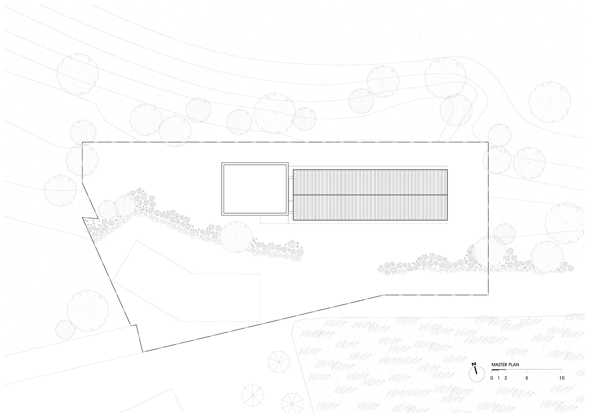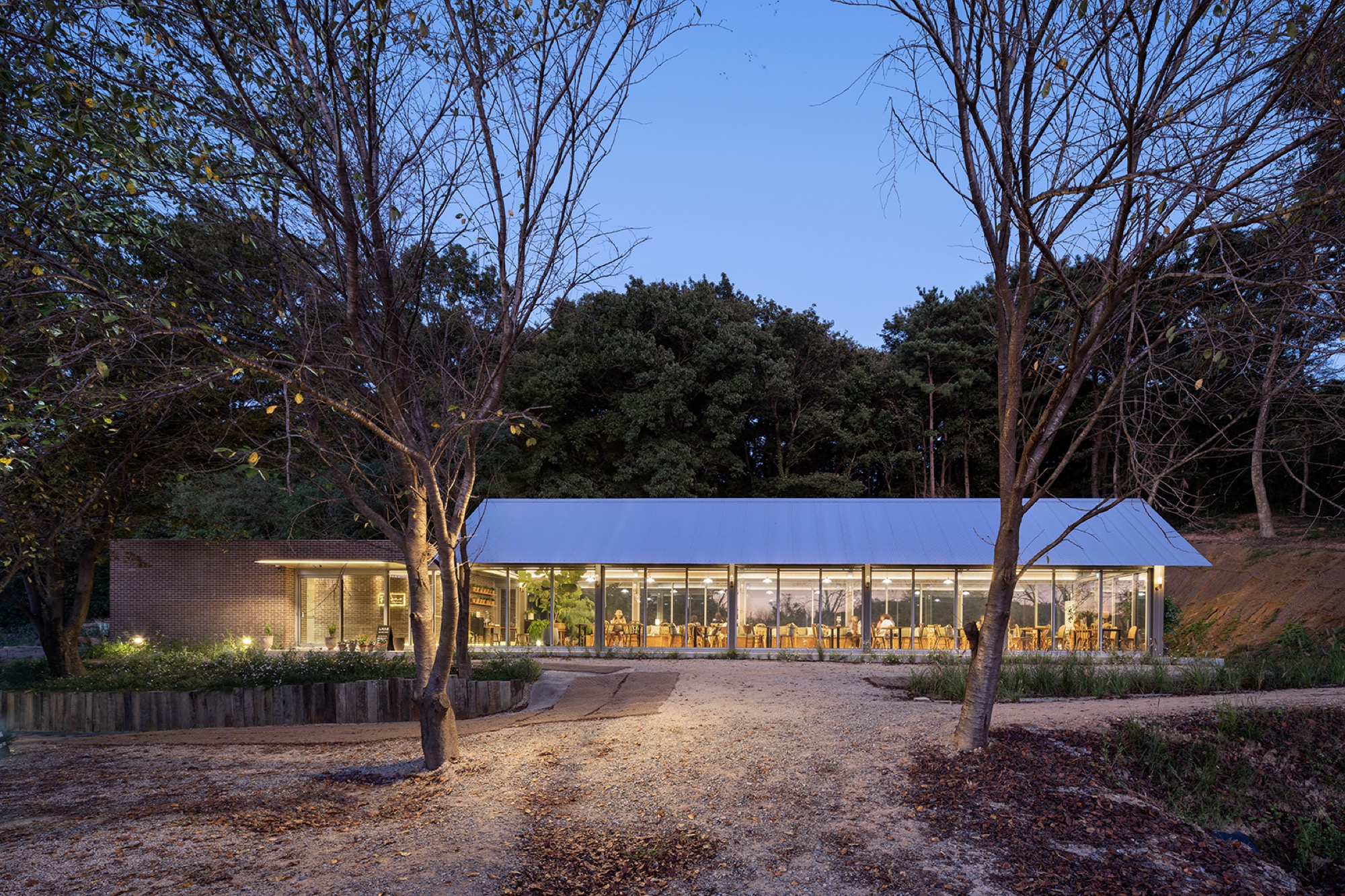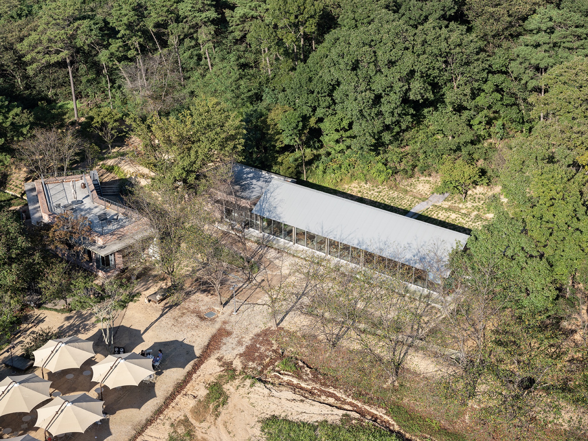 청보리밭은 이 대지의 고유한 상징으로 불가침의 영역이라 갑자기 대두한 카페동의 위치를 잡기가 어려웠다. 도로 진입부나 주차장의 확보, 대지에 전반적으로 걸쳐있는 경사와 언덕, 쉬이 베어버릴 수 없는 오랜 고목들. 게다가 기존의 건물들과 긴밀해야 하는 동선 등 모두 배려하려니 그 넓은 대지에 오십여 평 되는 건물을 앉힐 자리가 사실상 없는 것과 마찬가지였다. 특히 기존 건축물의 각자 특성이 강해다. 전체적인 통일감을 유지하기 위해서는 새로 지을 건축물이 도드라지면 안 된다. 눈에 띄지 않으면서도 여전히 청보리밭의 조망을 취하고, 베이커리(2차 증축동)와 동선이 원활하게 연결되기 위해 서쪽 숲으로 이어지는 좁고 긴 언덕에 자리를 잡았다.