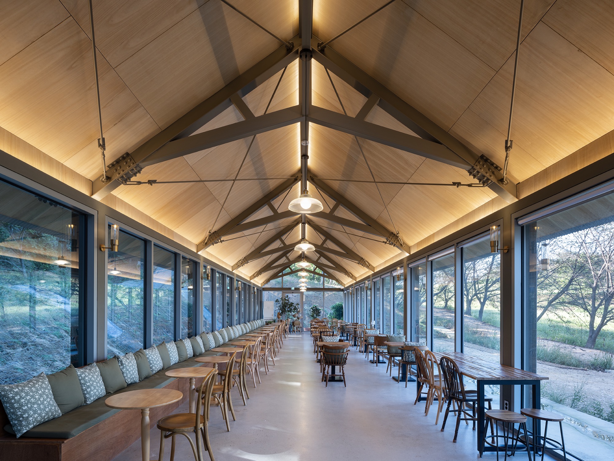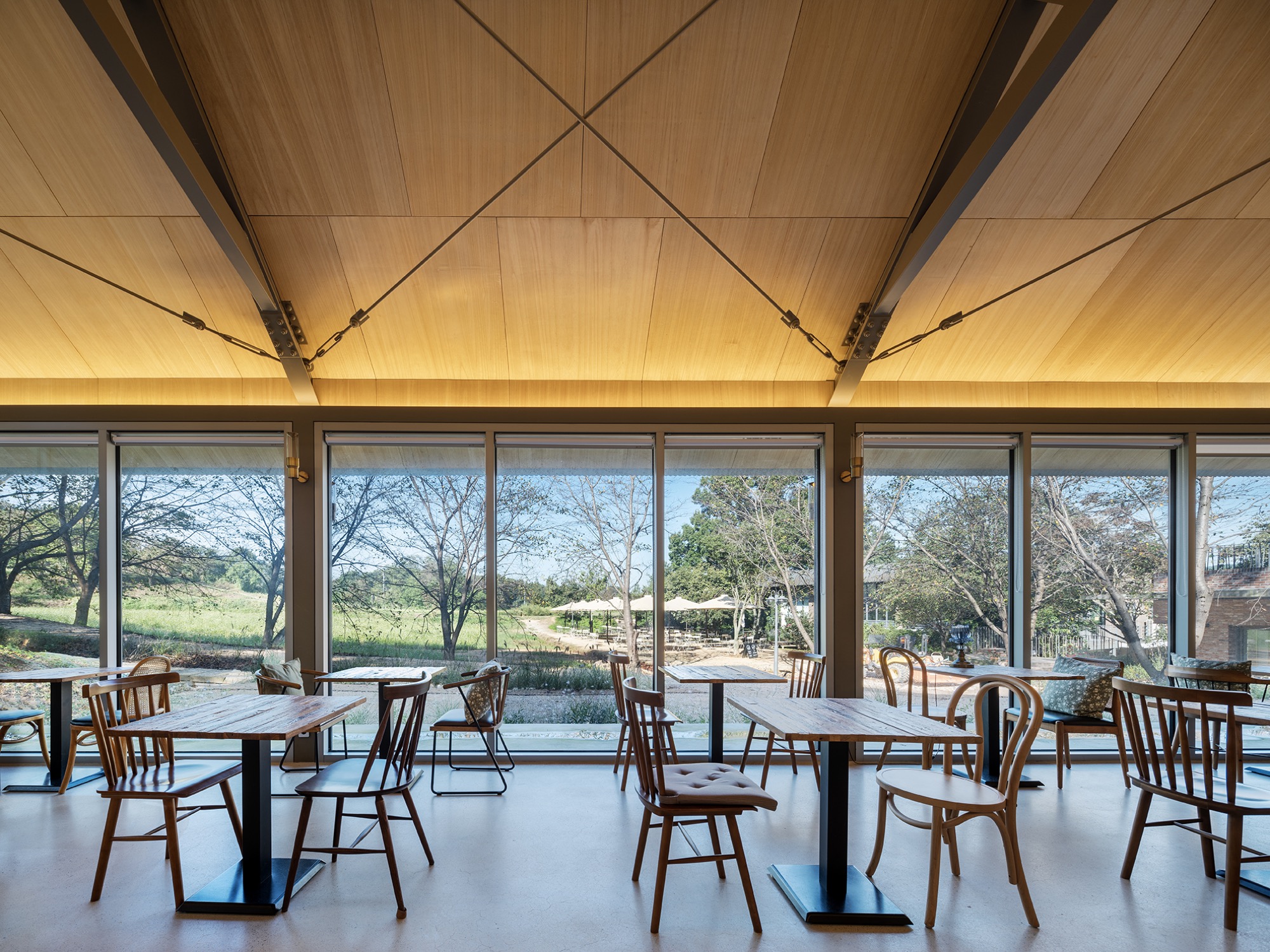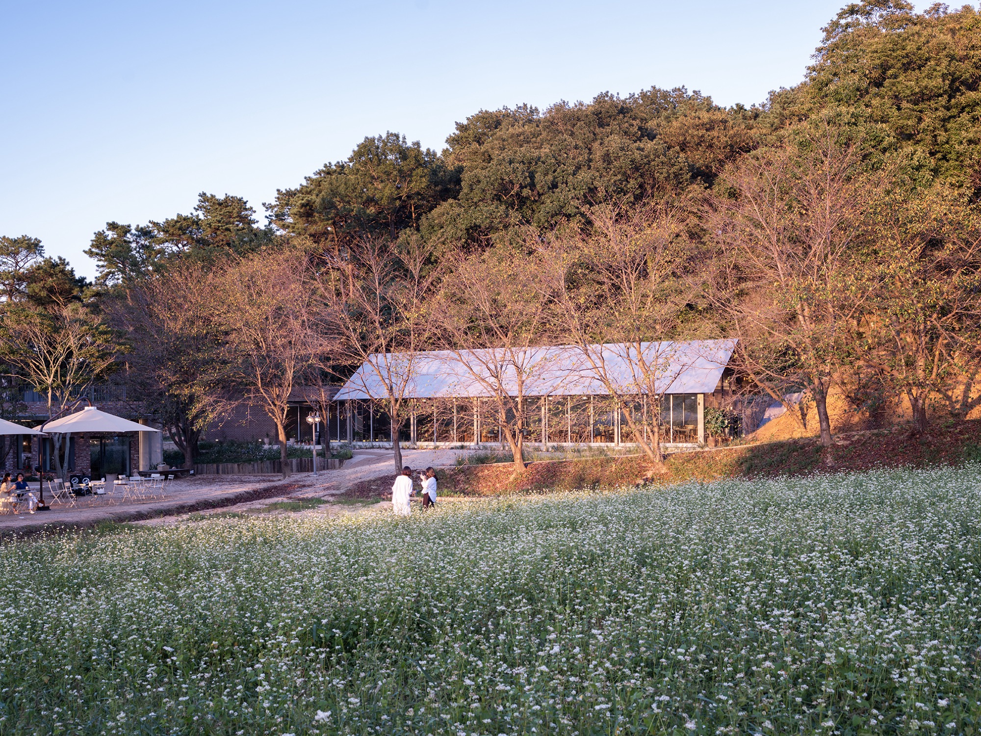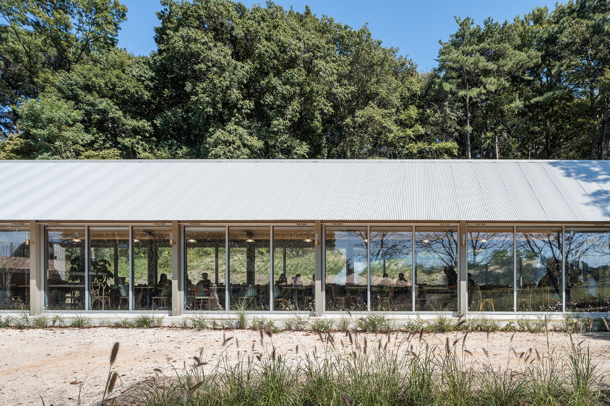 시간이 흘러 주변의 나무와 풀들이 제모습을 갖추면 가장 나중에 지은 피어라 카페는 가장 먼저 존재감이 사라질 것이다. 지붕에 사용된 골강판은 햇볕과 더불어 무성해진 나뭇가지들 사이에서 보일 듯 말듯 순간의 일렁임으로, 청보리밭에서 언덕으로 이어진 사이의 홀은 차를 마시는 사람만이 돋보이는 사람의 손을 여전히 타지 않은 장소로 남을 것이다.