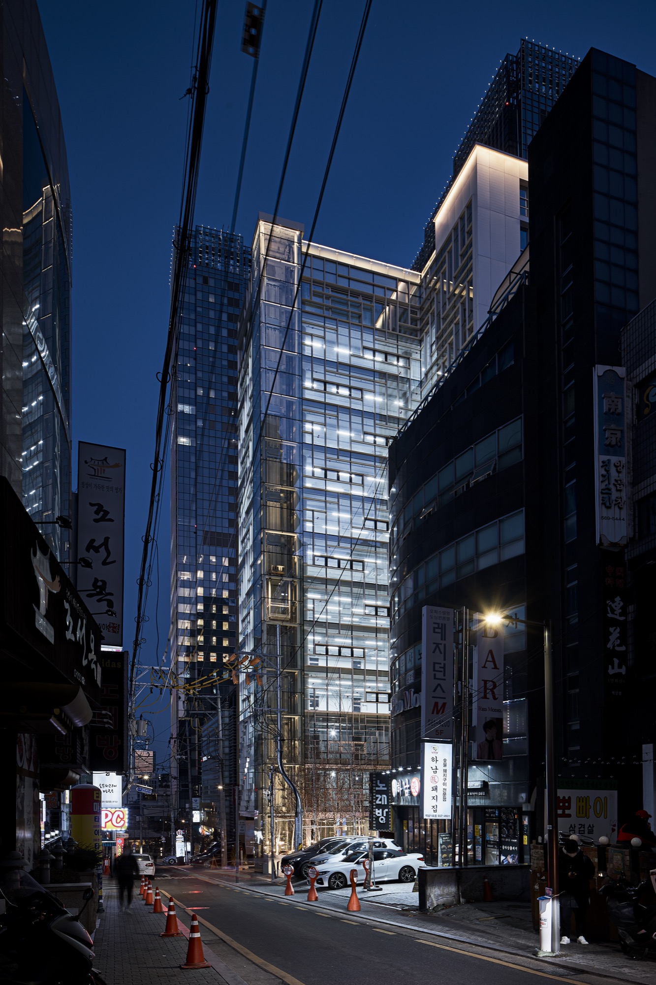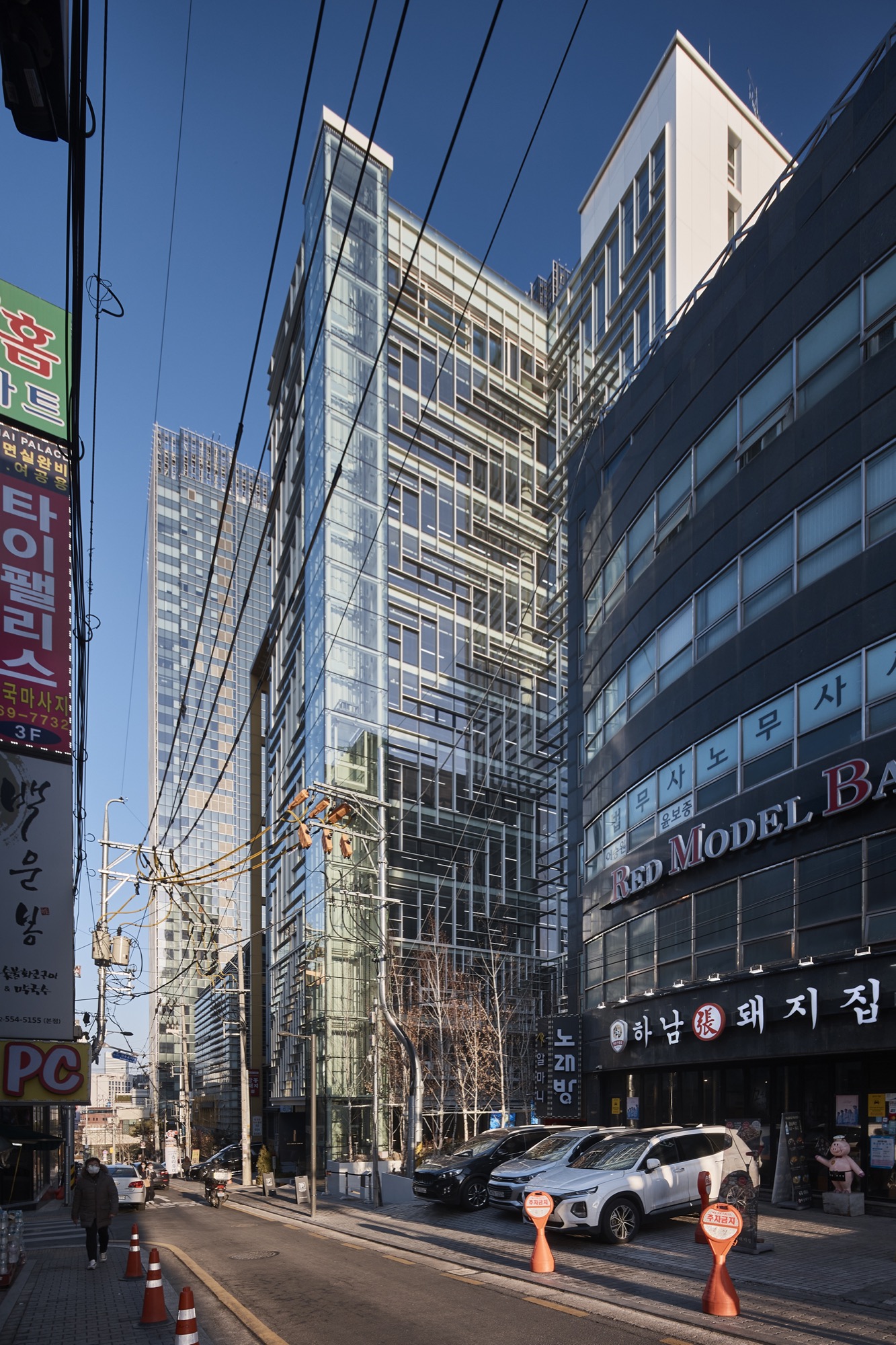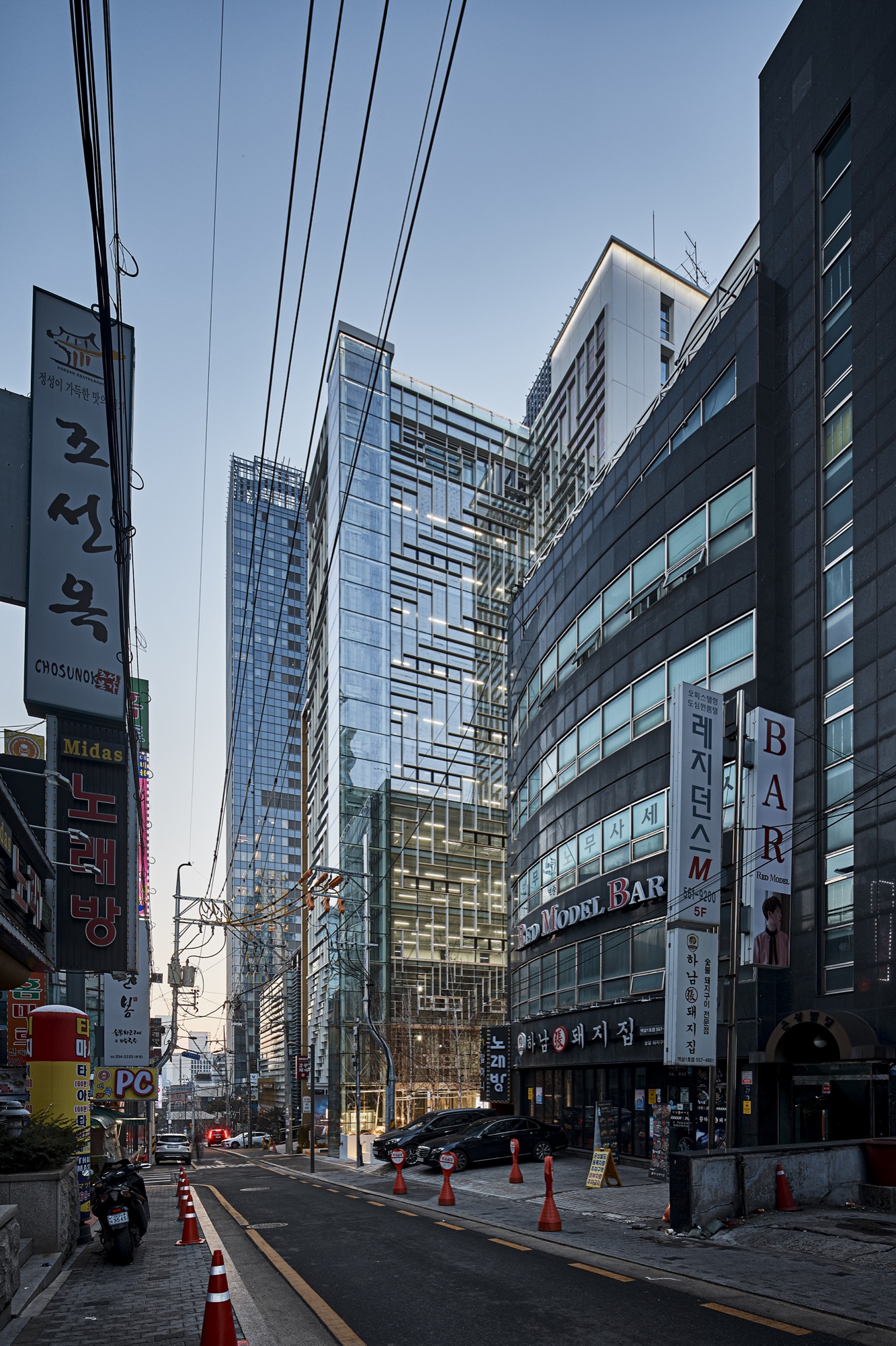 역삼역 일대의 먹자골목에 자리한 대지주변은 근린생활 시설들과 건물 앞 주차를 위한 공간으로 보행자와 차가 뒤섞여, 여유 없이 돌아가는 도심의 모습을 여과 없이 보여주고 있다. 주차공간으로만 가득 찰 대지 전면에 녹지와 여유공간을 만들어 지나가거나 주변에서 근무하는 사람들에게 숨 쉴 곳을 찾아 주기로 했다. 공개 공지 제공을 통한 높이 완화로 건축주를 설득하고, 최대 용적률을 위한 볼륨을 만들었다.