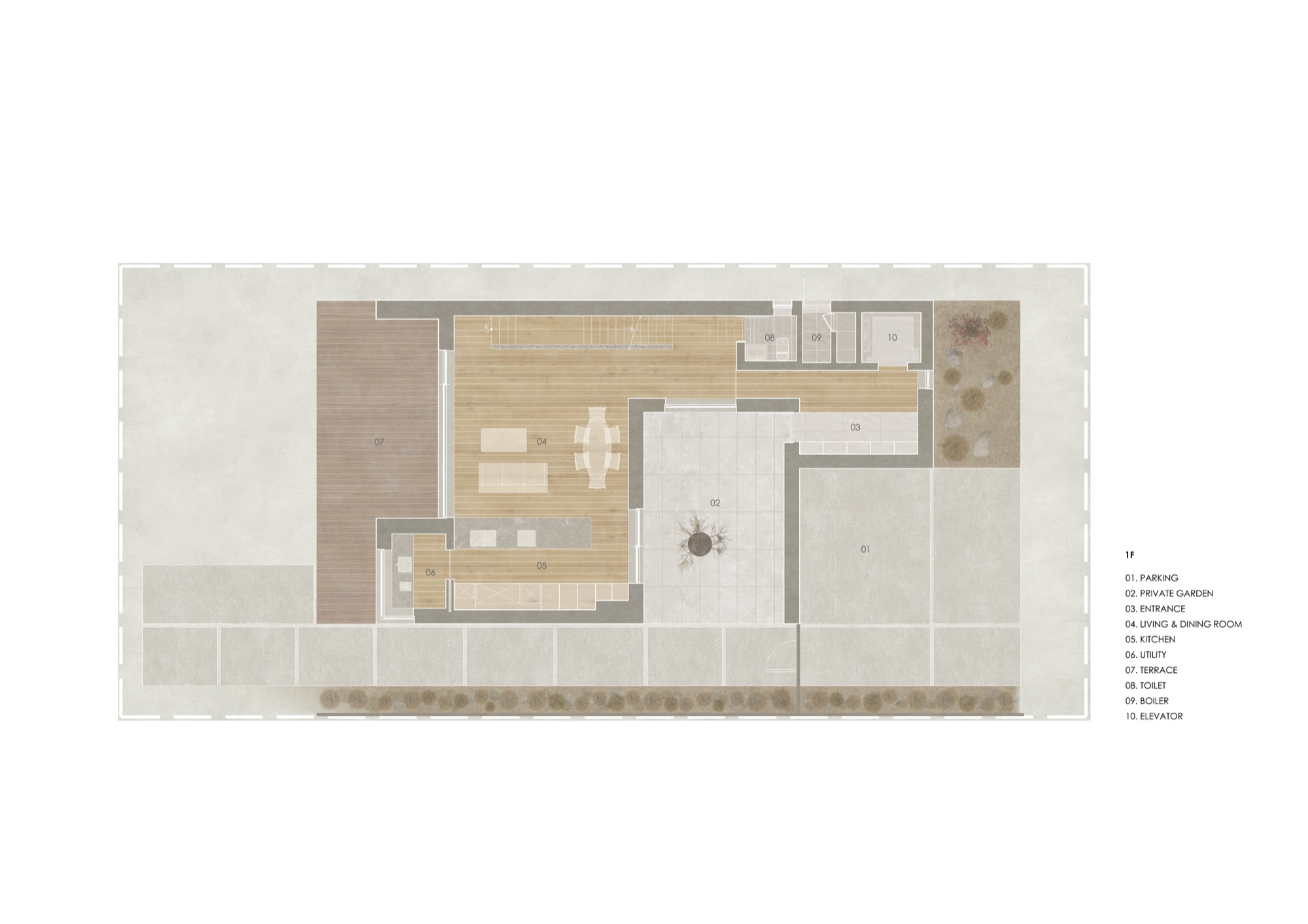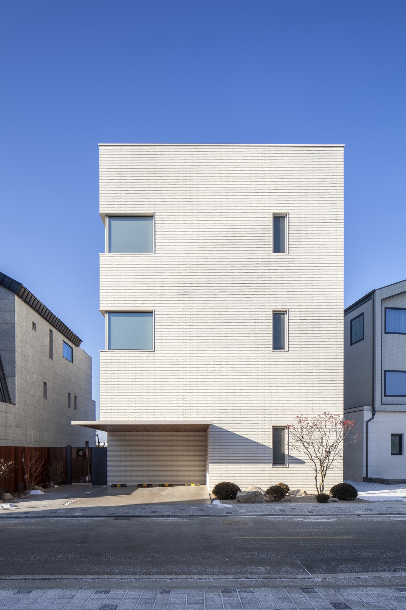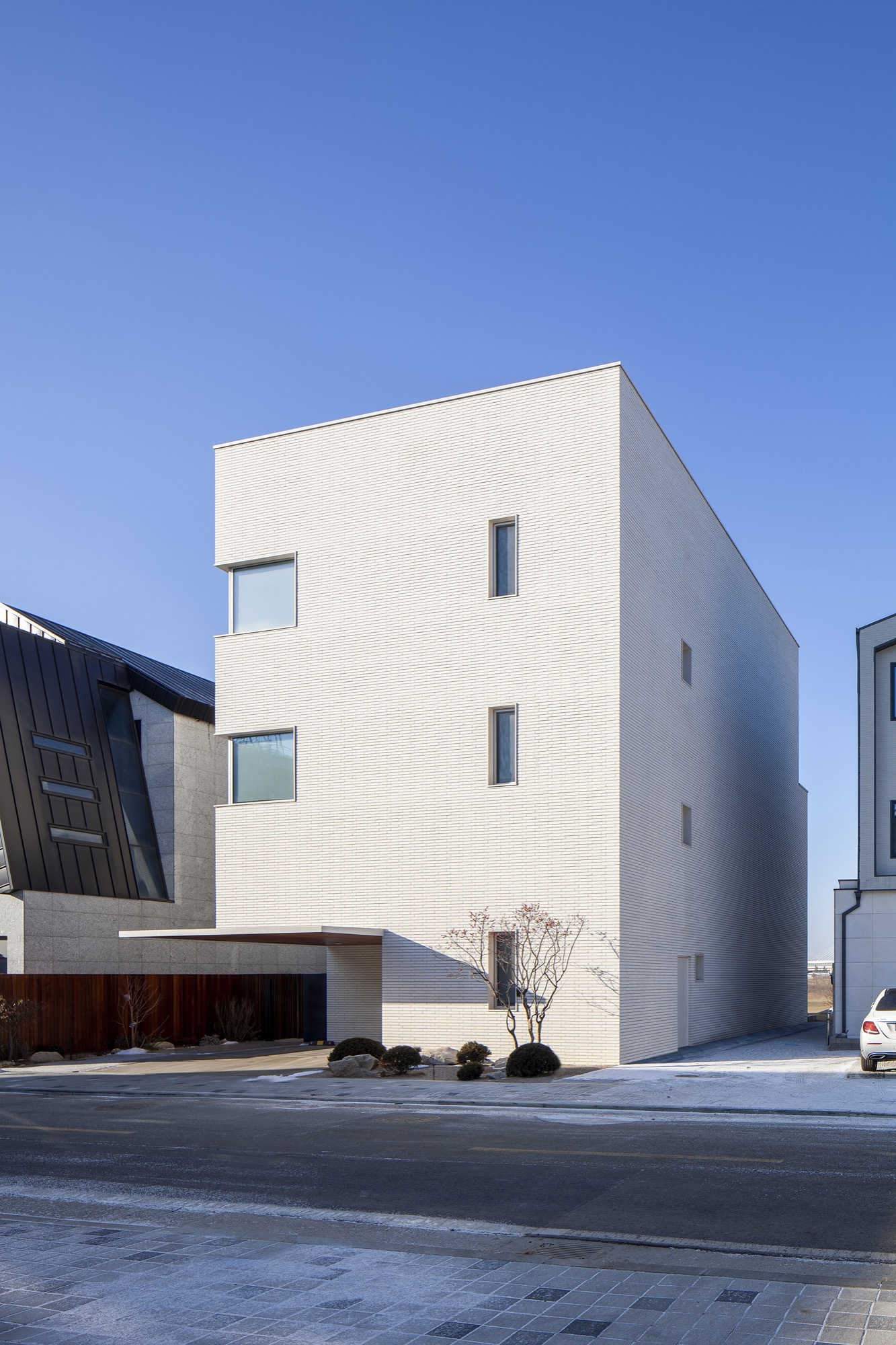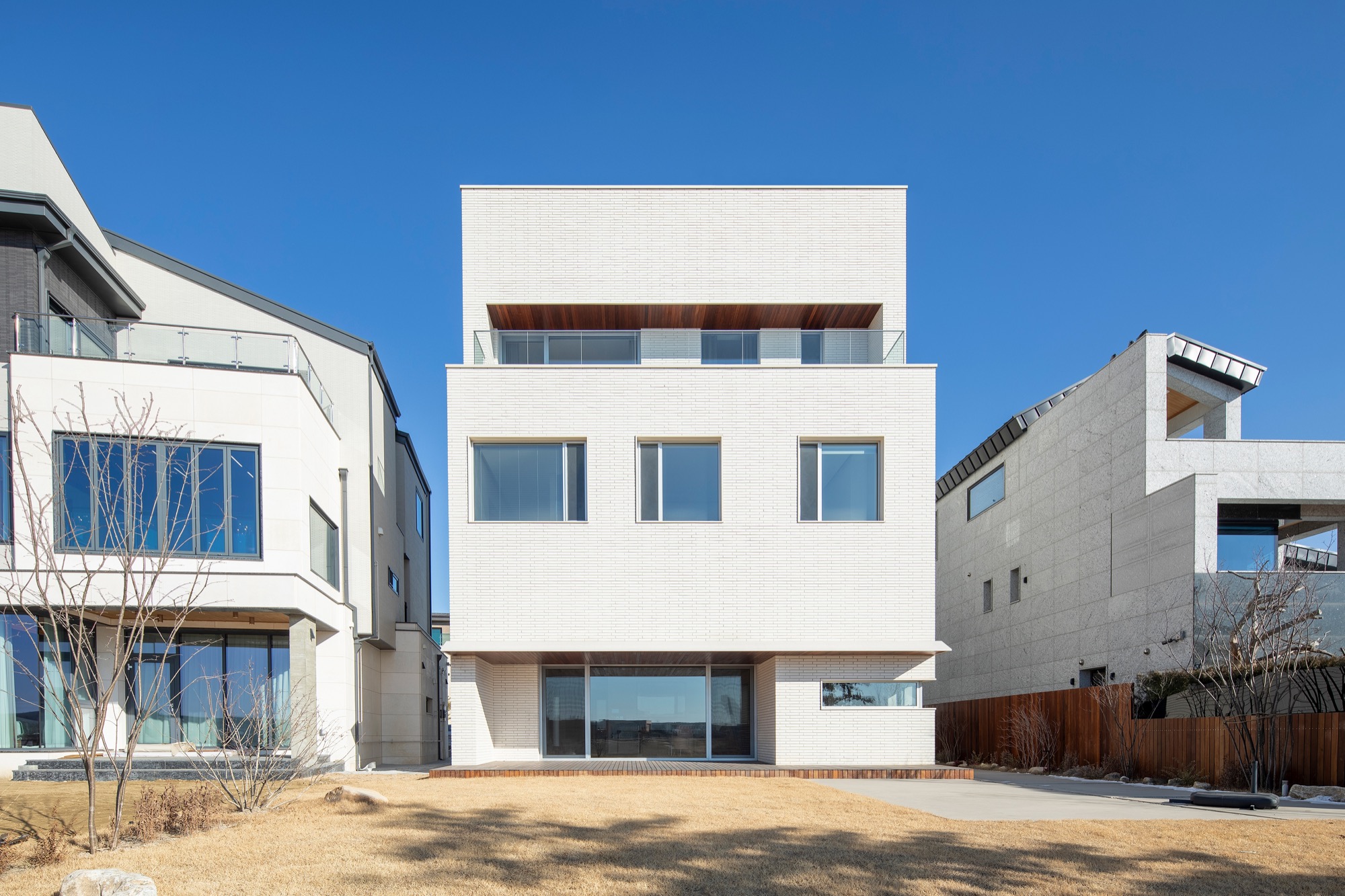 도시의 번잡함을 지나, 골프장 내 자리한 한적한 단독 주택가. 건축주는 도시 생활에서 누리기 어려웠던 자연이 주는 치유와 여유를 위해 집을 짓기로 했다. 이들은 3대가 함께 모여 서로의 안위를 보살피면서 독립된 생활을 할 수 있는 주거공간이 필요했다. 공간의 프로그램을 통해 가족의 가치관을 반영하되, 건축적으로 대지와 직접적인 연결을 갖추고, 이웃집으로부터 시각적으로 단절된 ‘자연의 수평선 위에 새겨진 정제된 조각’과 같은 차분하고 무게감 있는 건축 형태를 구현하고자 했다. 이 공간은 대지와 건축 그리고 가족 간의 관계를 통해 질서를 만들어가는 터전이자, 삼 대가 정주해야 할 ‘자리’임을 염두에 두고 진실함을 부여했다.
