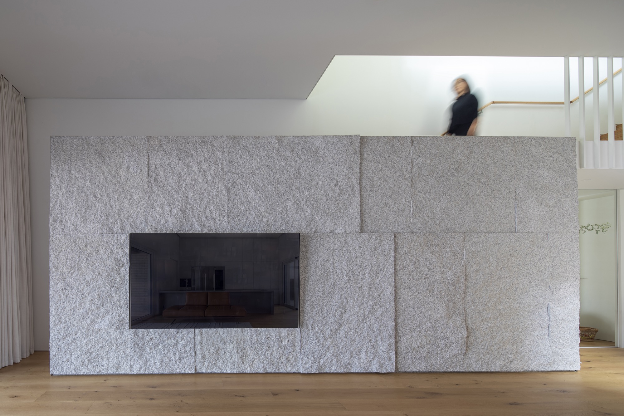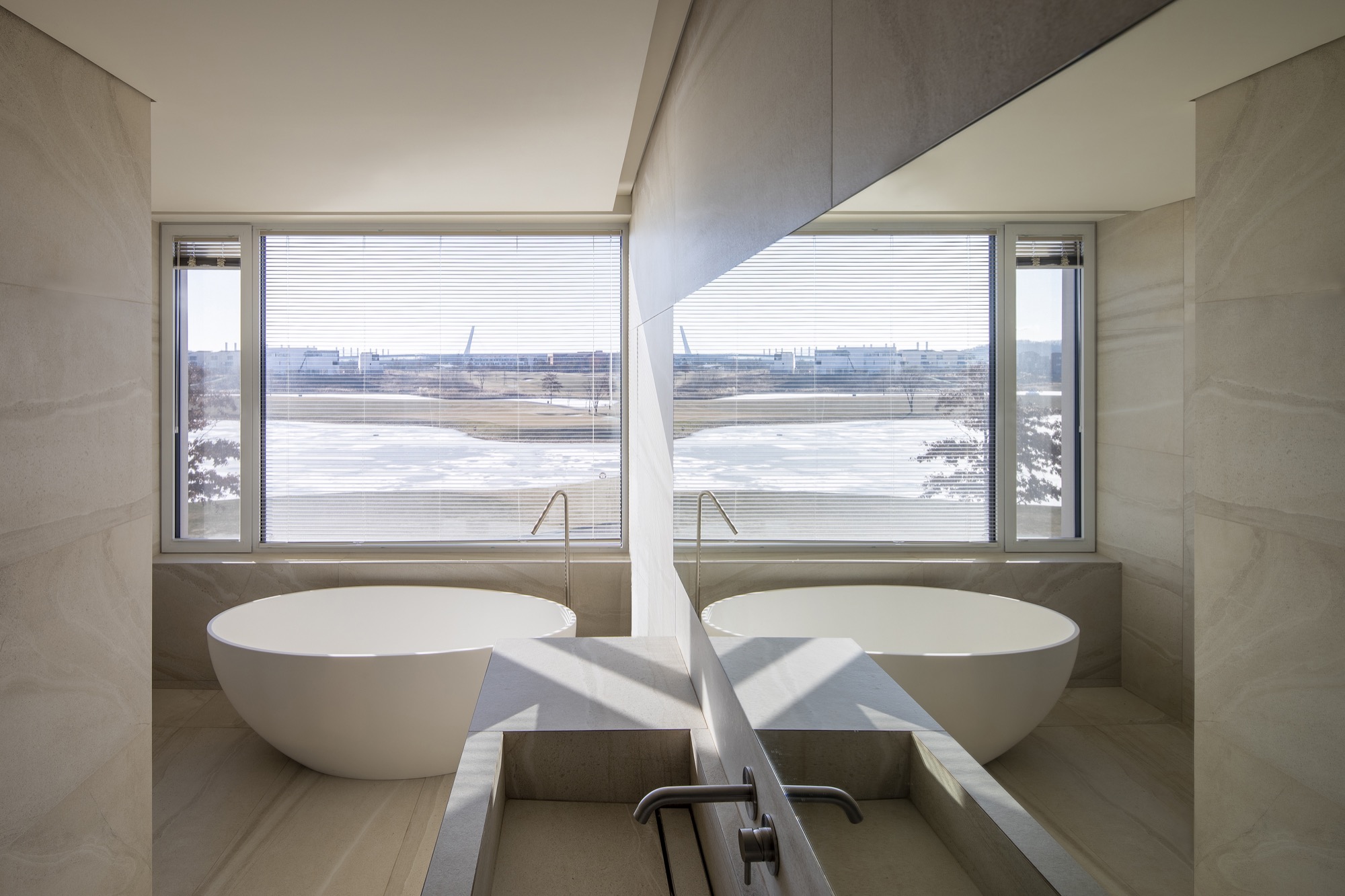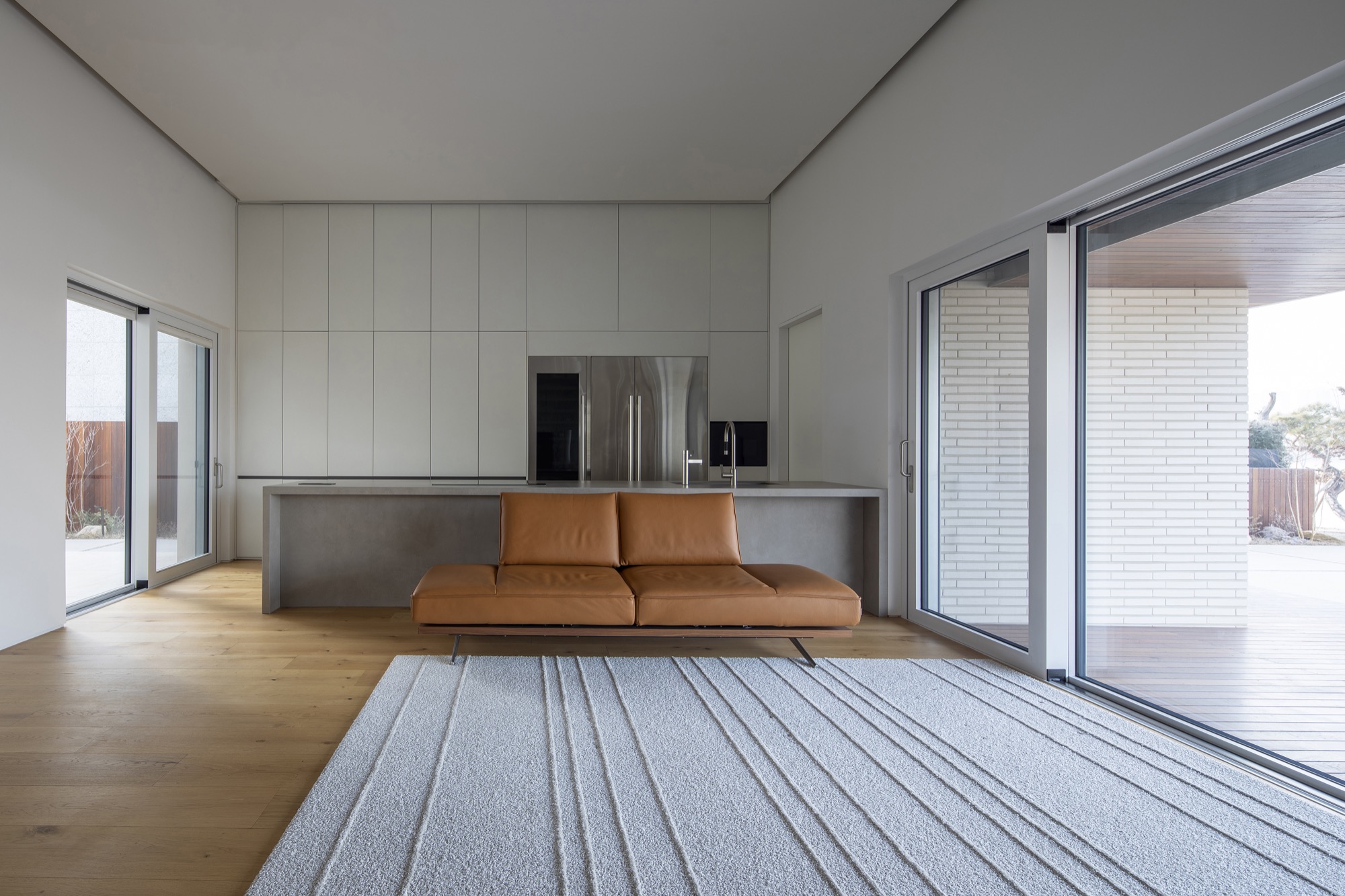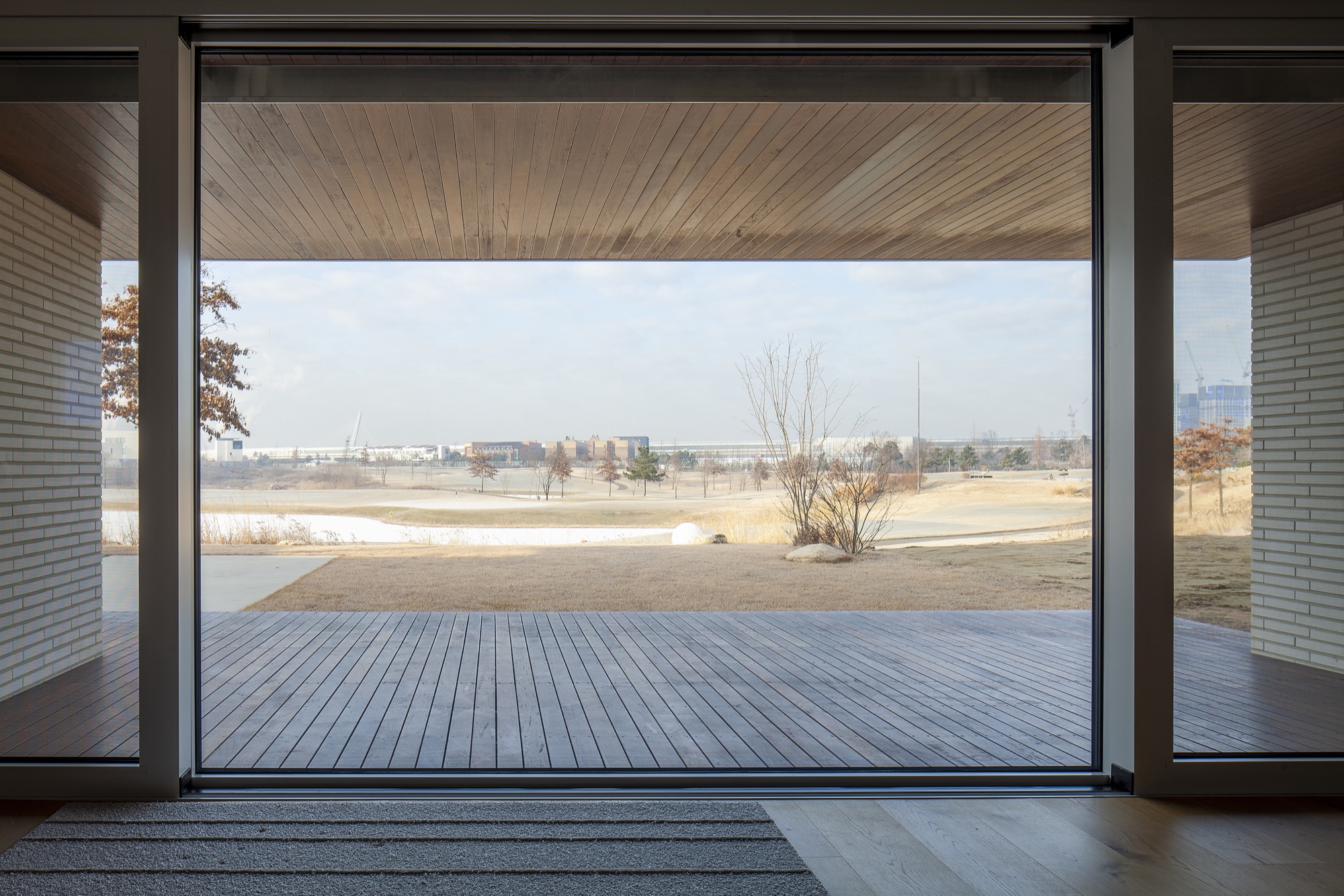 대문을 열면 중정을 통해 내부로 진입하게 유도했고, 중정을 둘러싼 ㄷ자 형태는 빛과 고요한 정취를 안으로 끌어들이는 역할을 한다. 빛과 함께 깊숙한 동선의 현관을 지나면, 널찍하게 트인 자연 전경과 높은 천장고를 가진 거실을 마주하게 된다. 가족 공용 공간인 1층은 골프장의 풍경과 연결되면서 다방면으로 입체적인 확장감을 느끼게 해준다. 단정한 공간의 벽면은 자연 질감을 사용해 생경한 자연을 동경하는 마음의 흔적을 남겼다.