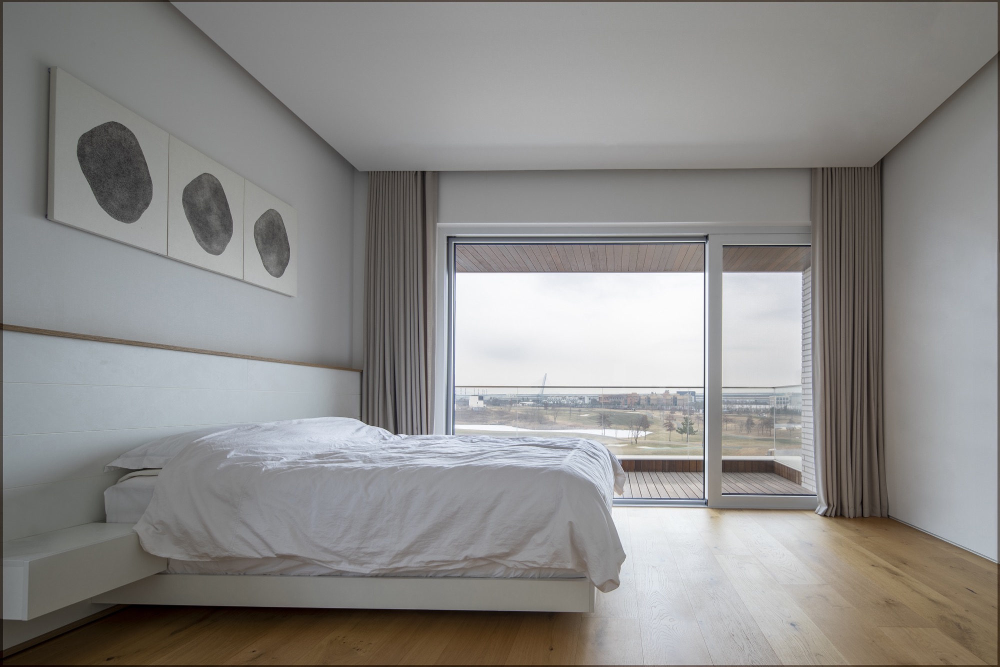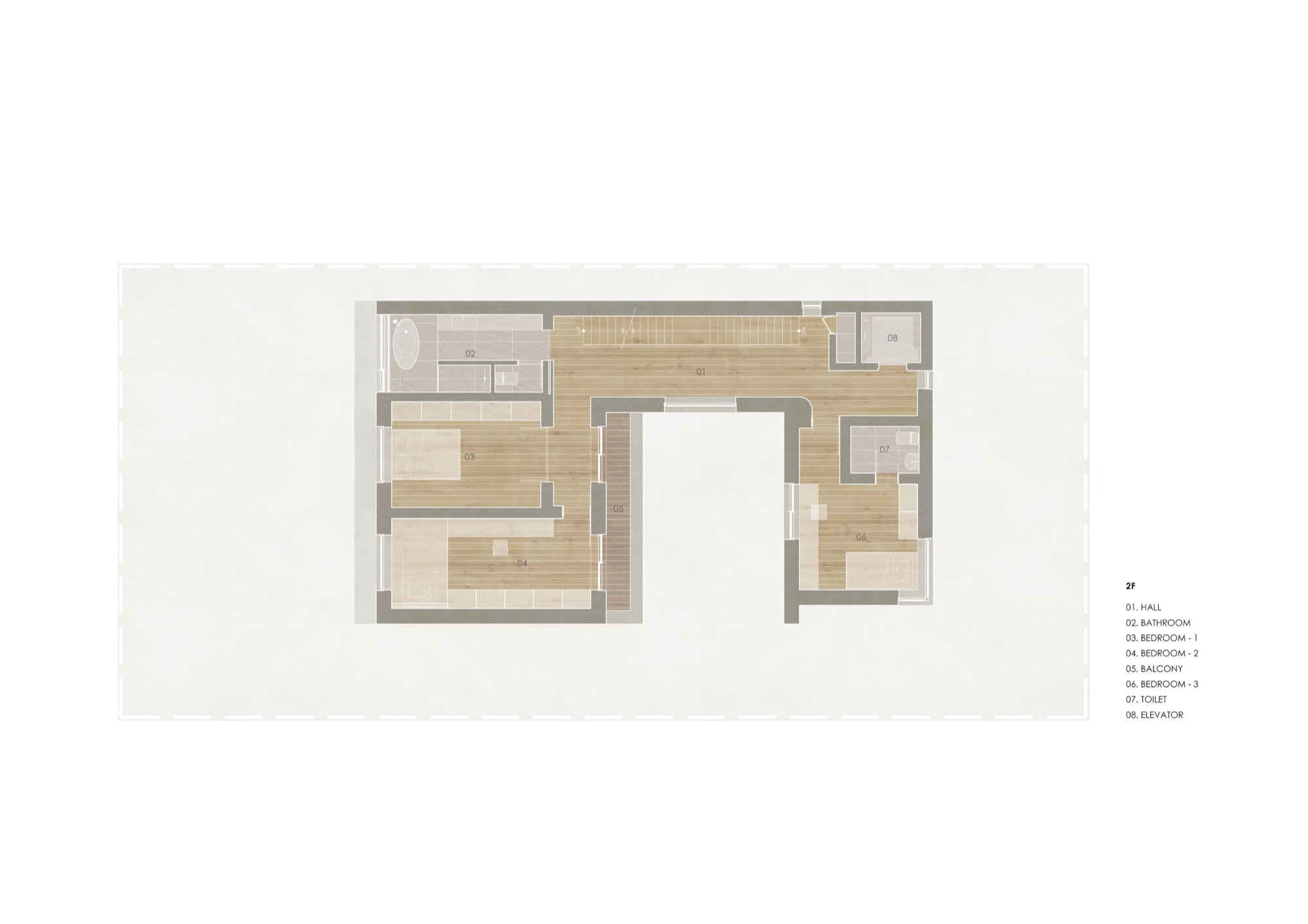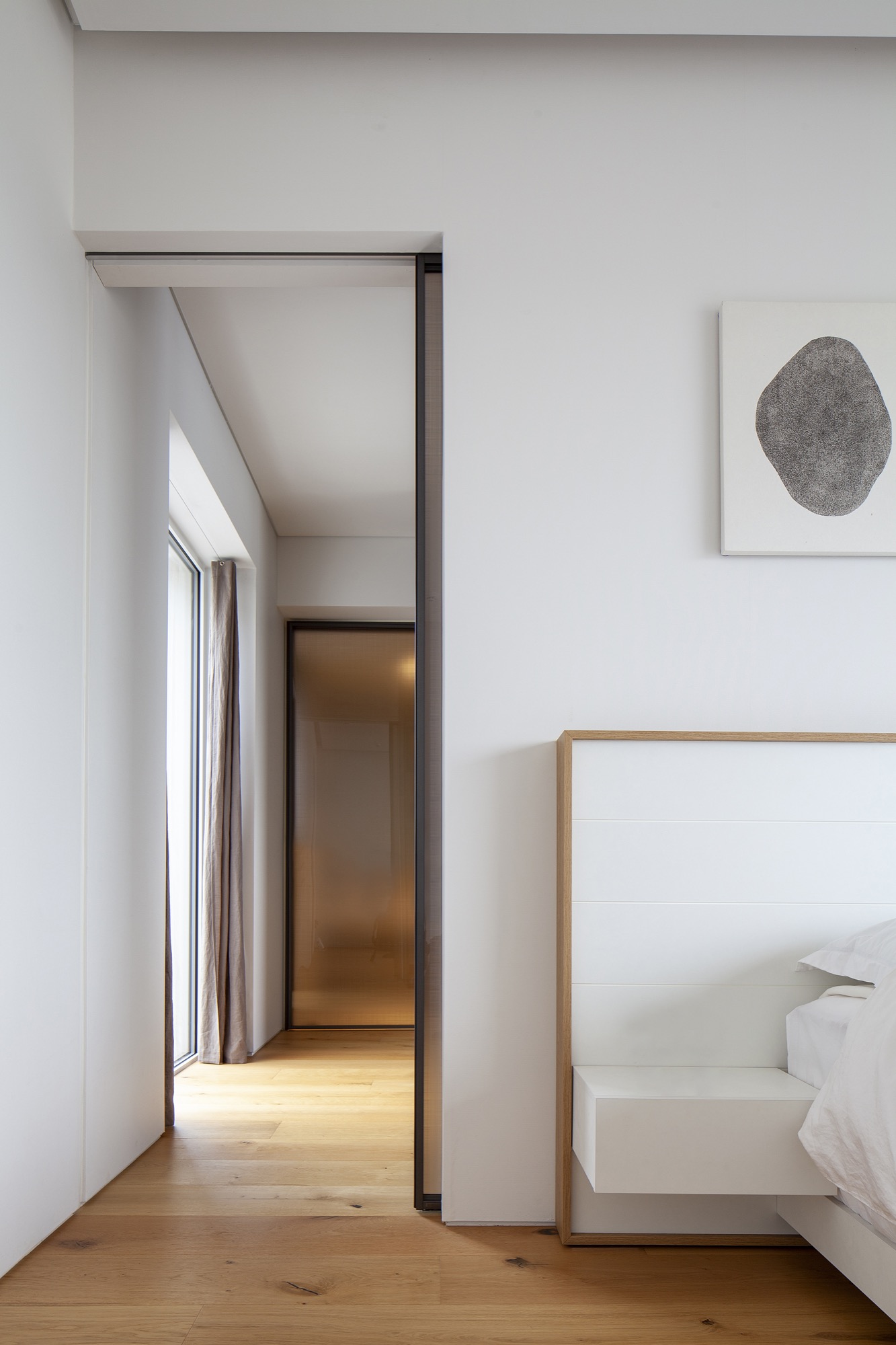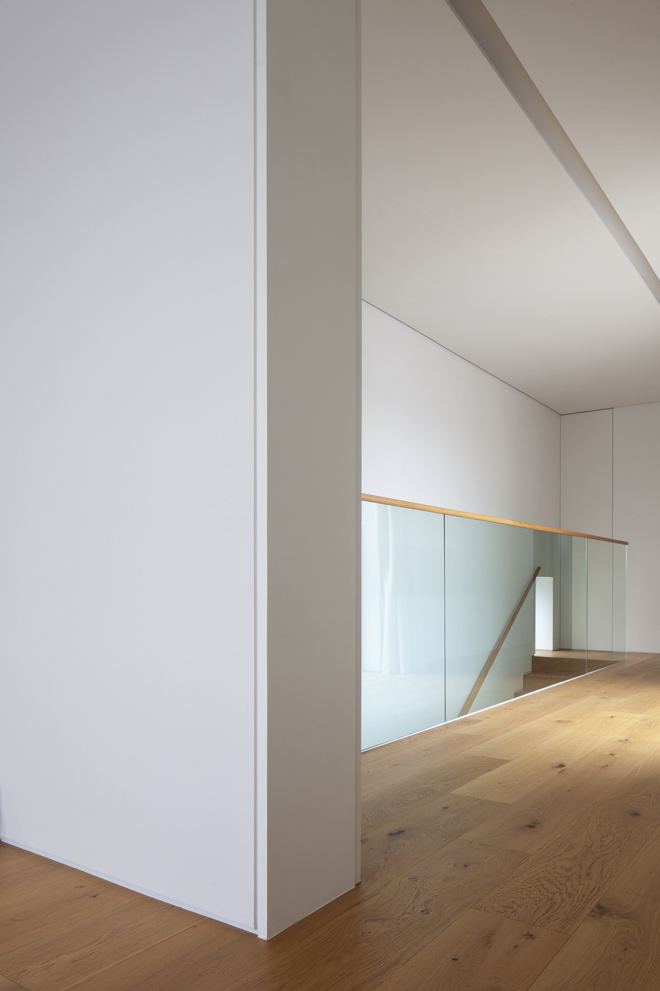 계단을 올라가면 각각 조부모와 부모, 자녀의 공간이 분리된다. 각 층의 길게 뻗은 복도는 중정을 통해 빛의 아취를 담고, 개인의 영역을 구분하는 동시에 서로의 공간과 자연을 연결하는 완충의 매개가 된다. 자연을 향해 열려 있는 각 공간은 크고 작은 프레임으로 담백한 배경을 바탕으로 아름다운 자연의 연속성을 담아낸다.