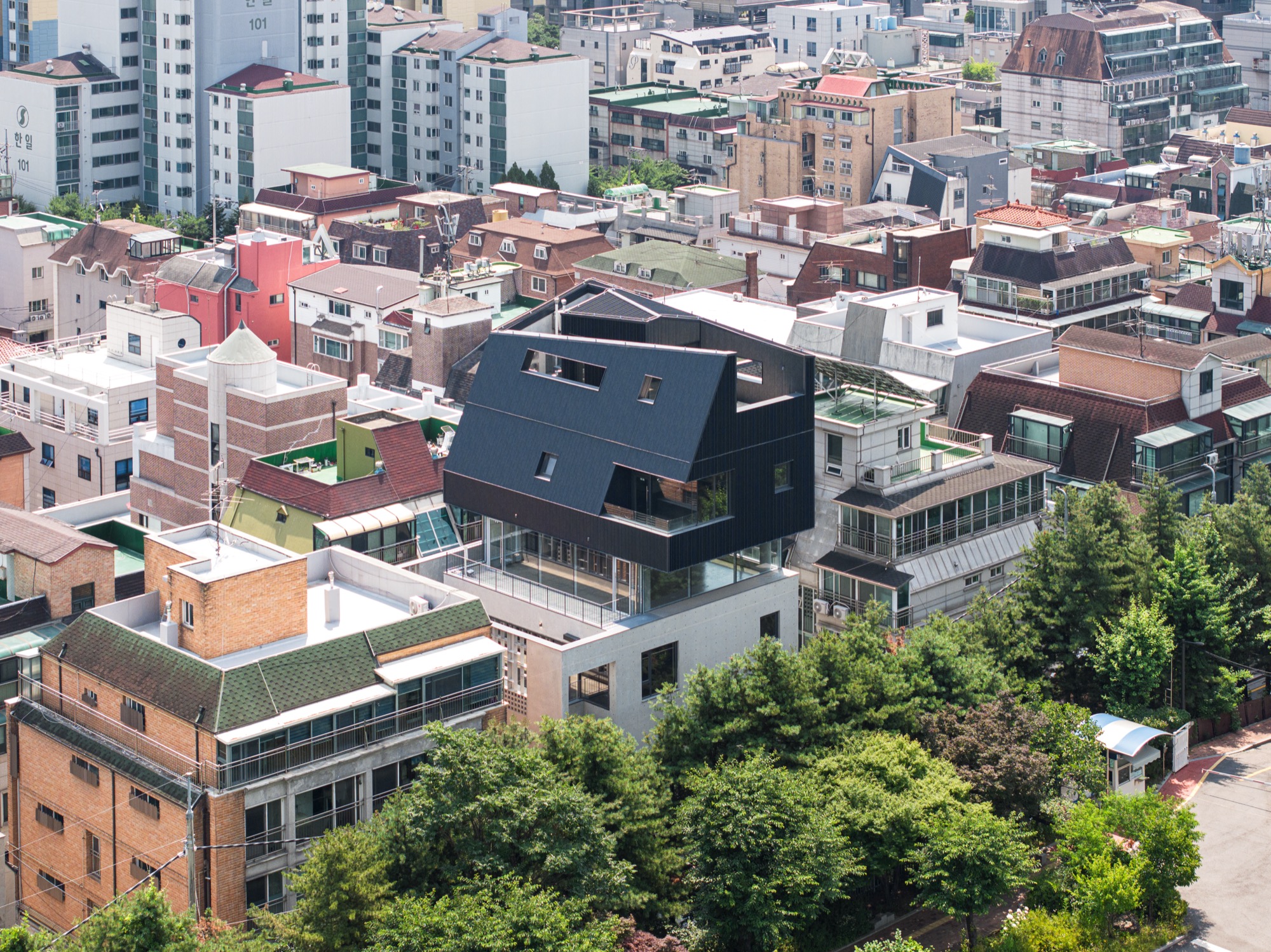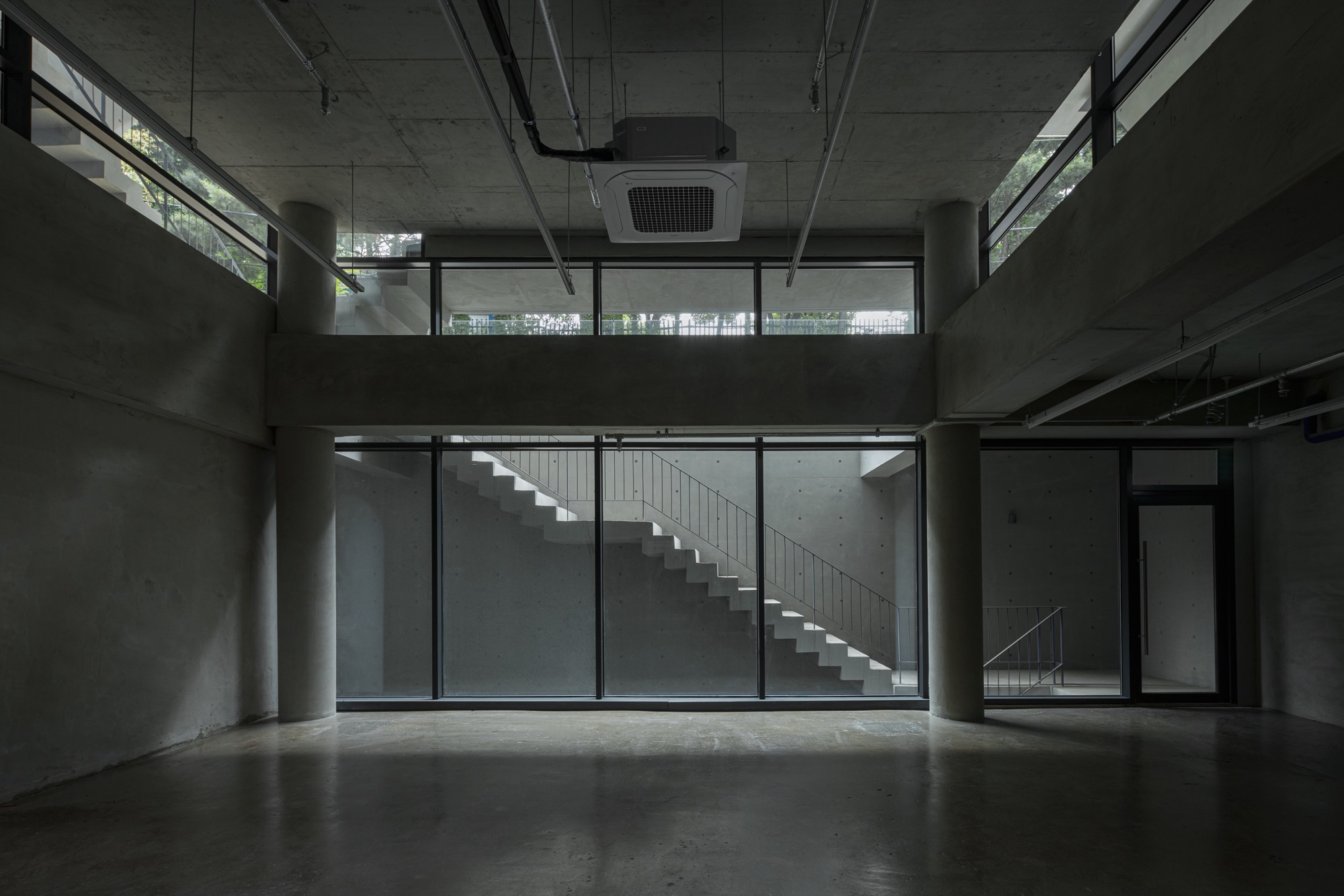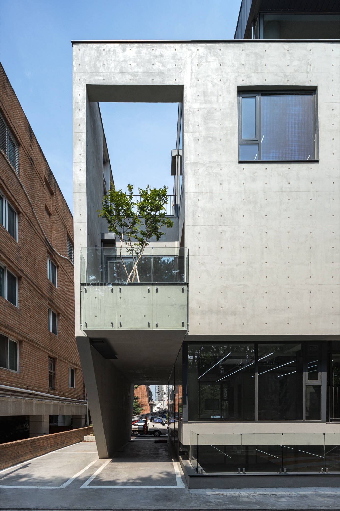 하층부는 필지 경계로 둘러진 벽을 조율해 풍경을 내부 공간에 들인다. 1층은 도로 레벨보다 바닥을 올려 지하 1층에 채광을 확보했고, 도로와 거리감을 만든다. 2층은 서쪽 전면도로 방향으로 테라스를 두고, 도로와 이어지는 계단 옆 보이드 공간을 만들면서 주변 풍경이 프레임화 한다. 도로 쪽 테라스 한쪽에 있는 나무 한 그루는 주변 풍경과 연결되는 효과를 만든다. 3층은 일조사선으로 생기는 넓은 테라스로 내부공간이 확장되며, 다시 주변 풍경으로 확장되는 방식으로 풍경과 관계를 맺는다. 사방이 투명한 유리로 둘러진 4층은 주변 도시 풍경을 막힘 없이 볼 수 있다. 5층과 옥상층 상부는 서쪽 학교로 열려 풍경을 담는다. 이처럼 각 층 높이에 따라 주변 풍경을 공간으로 끌어들이며 상업 공간의 특성을 만든다.