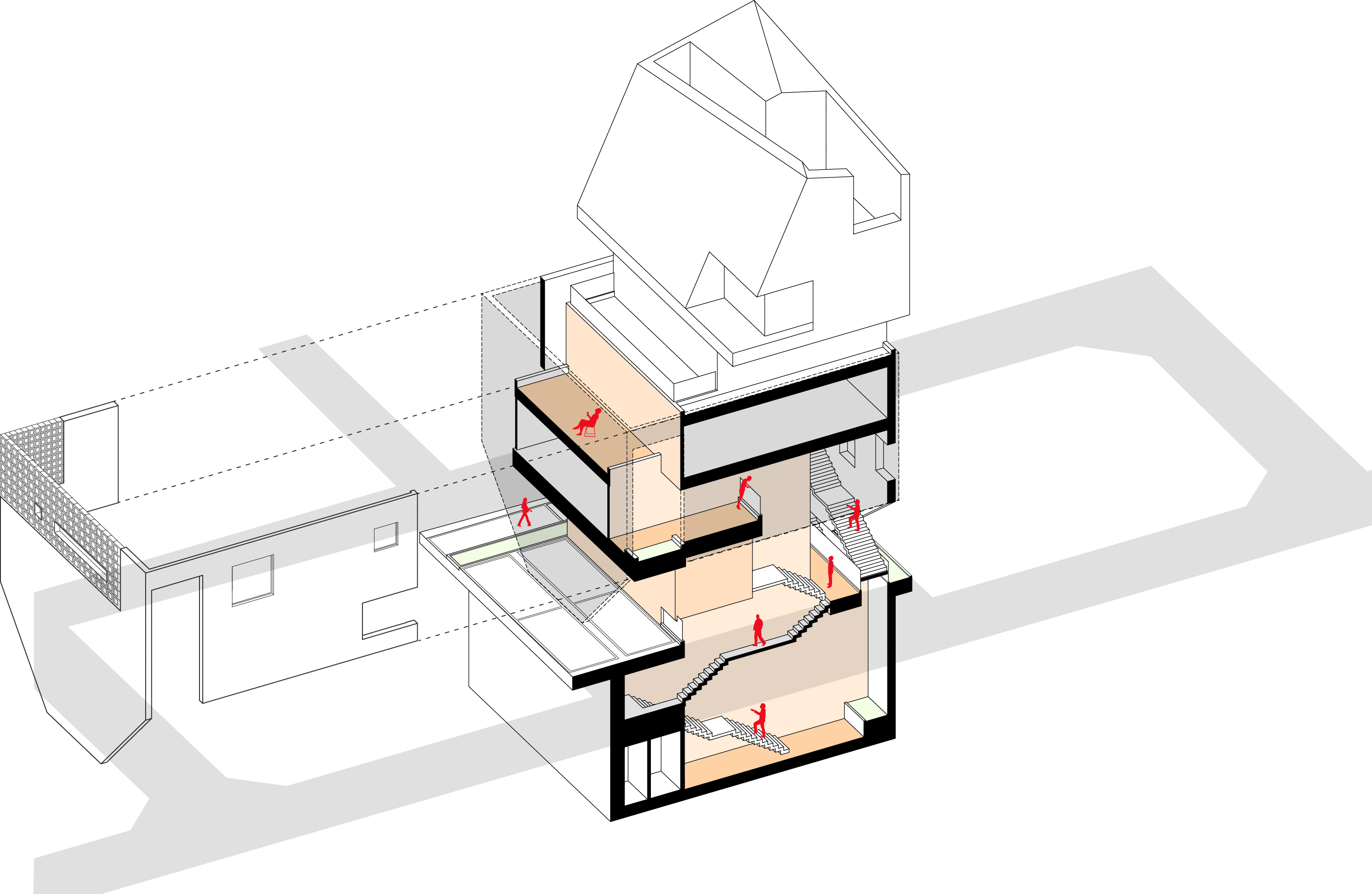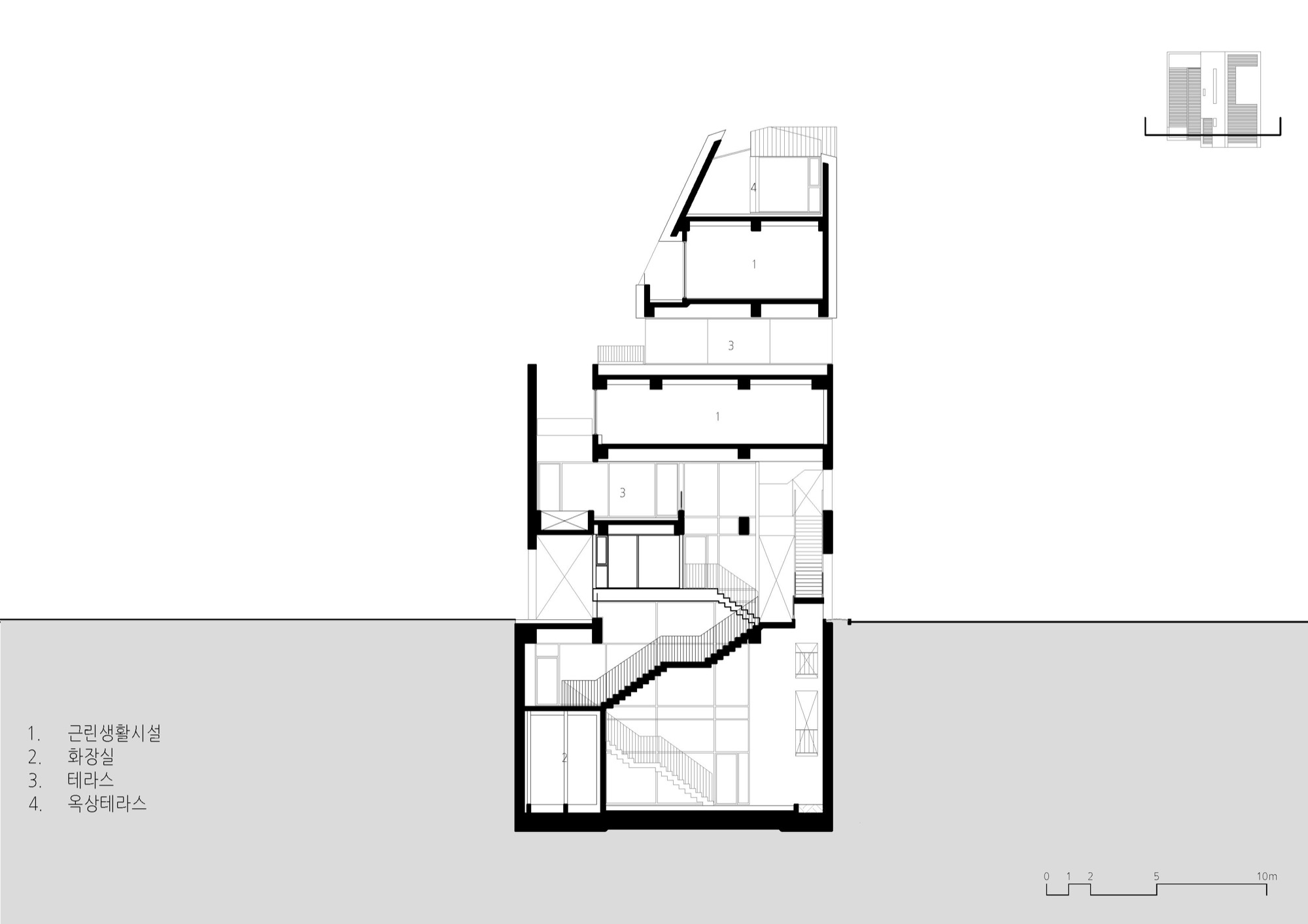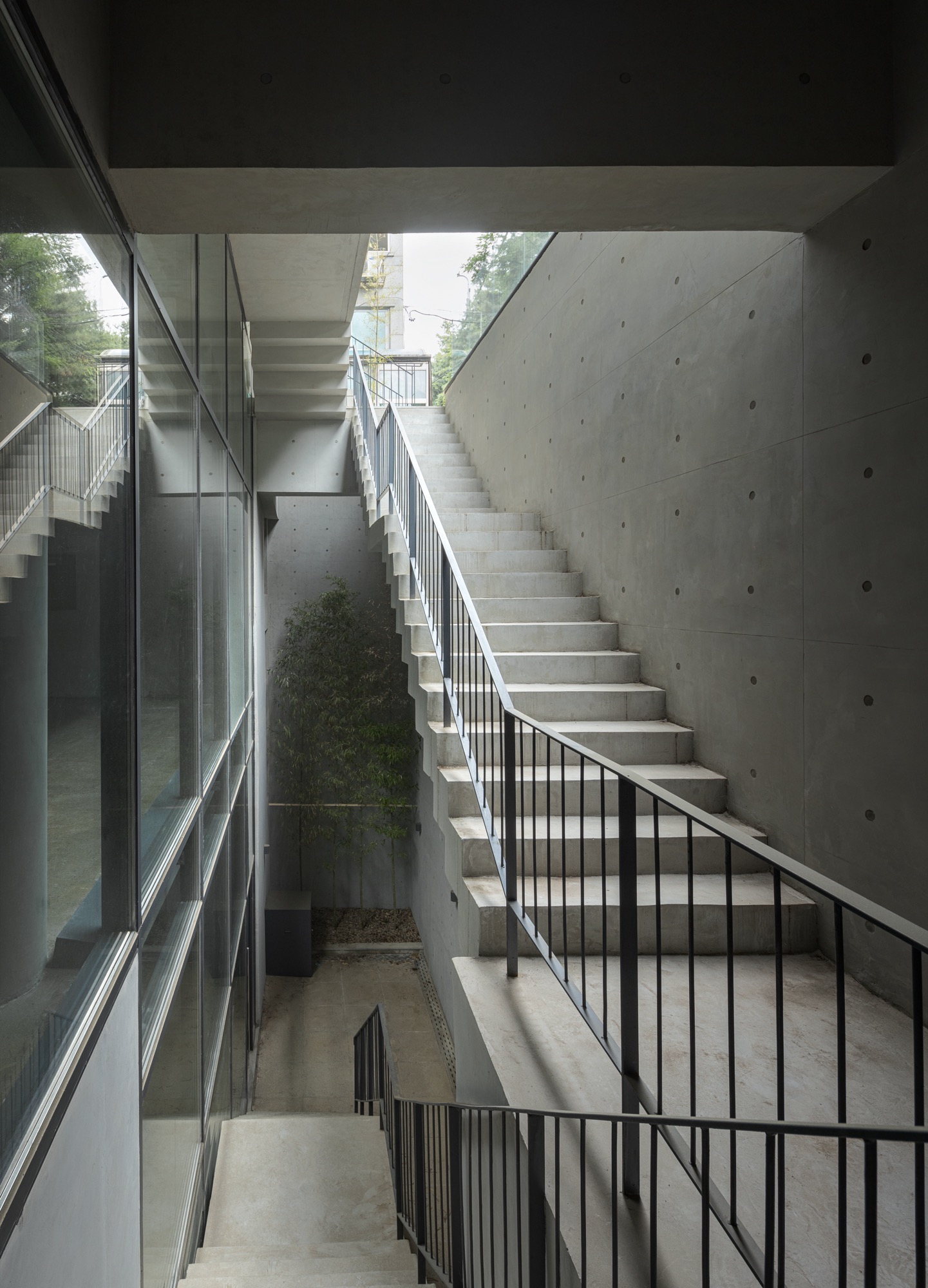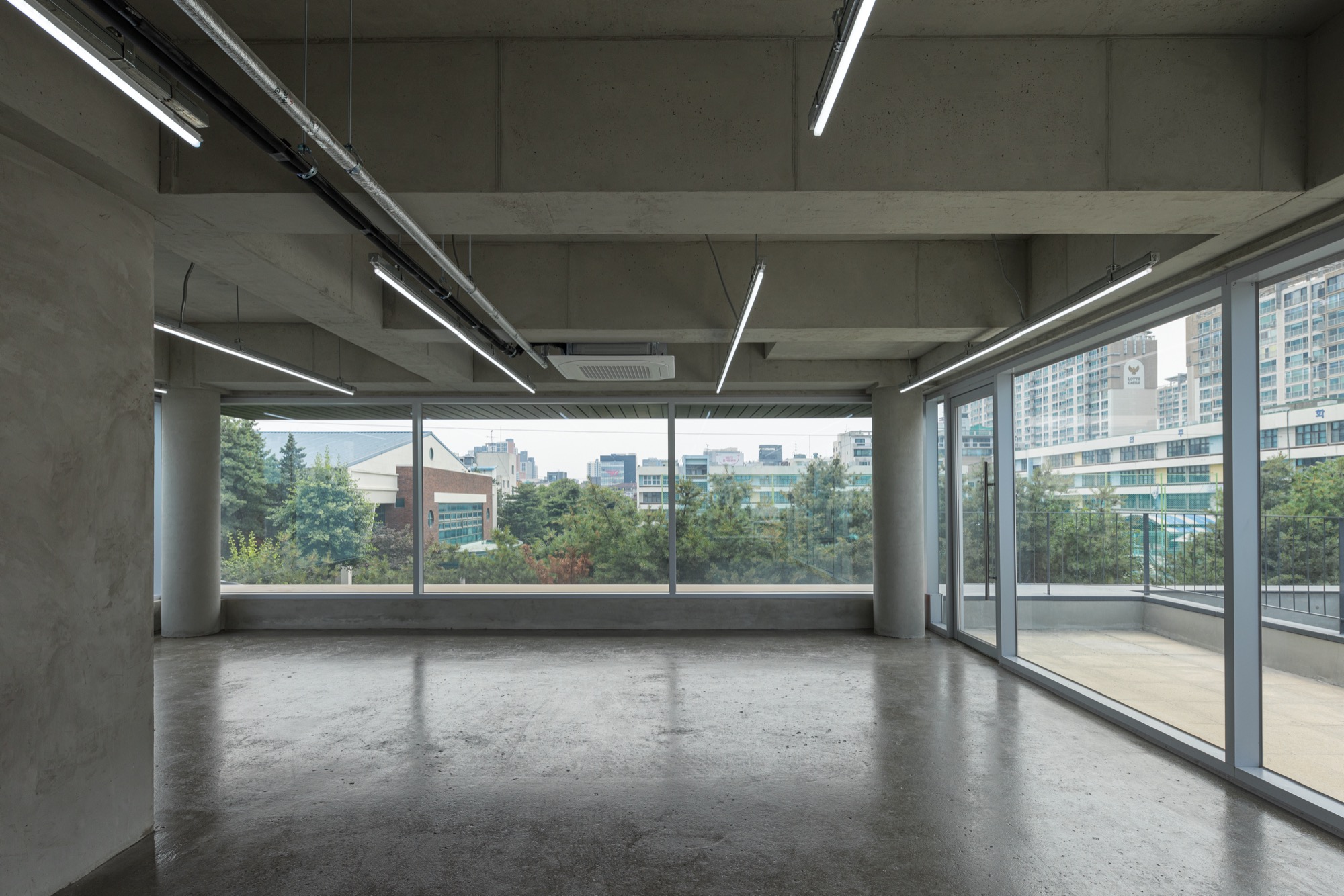 하층부는 필지 경계로 둘러진 벽을 조율해 풍경을 내부 공간에 들인다. 1층은 도로 레벨보다 바닥을 올려 지하 1층에 채광을 확보했고, 도로와 거리감을 만든다. 2층은 서쪽 전면도로 방향으로 테라스를 두고, 도로와 이어지는 계단 옆 보이드 공간을 만들면서 주변 풍경이 프레임화 한다. 도로 쪽 테라스 한쪽에 있는 나무 한 그루는 주변 풍경과 연결되는 효과를 만든다. 3층은 일조사선으로 생기는 넓은 테라스로 내부공간이 확장되며, 다시 주변 풍경으로 확장되는 방식으로 풍경과 관계를 맺는다. 사방이 투명한 유리로 둘러진 4층은 주변 도시 풍경을 막힘 없이 볼 수 있다. 5층과 옥상층 상부는 서쪽 학교로 열려 풍경을 담는다. 이처럼 각 층 높이에 따라 주변 풍경을 공간으로 끌어들이며 상업 공간의 특성을 만든다.