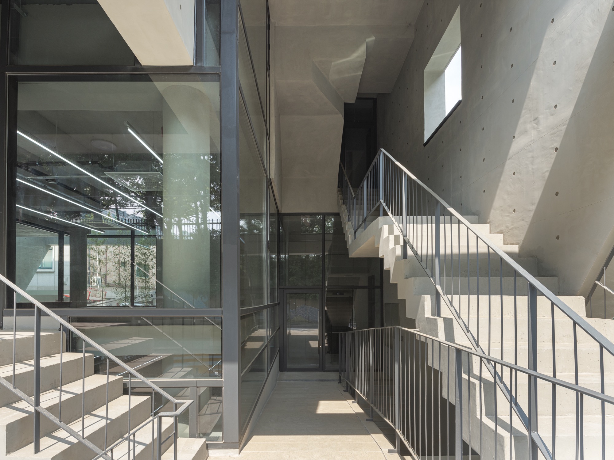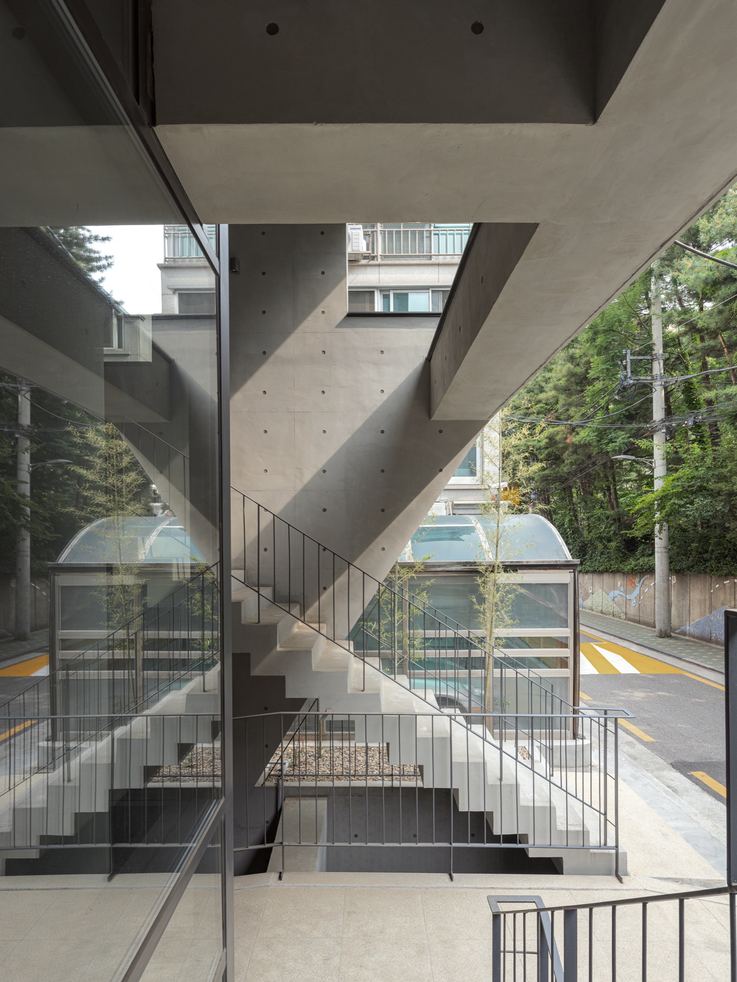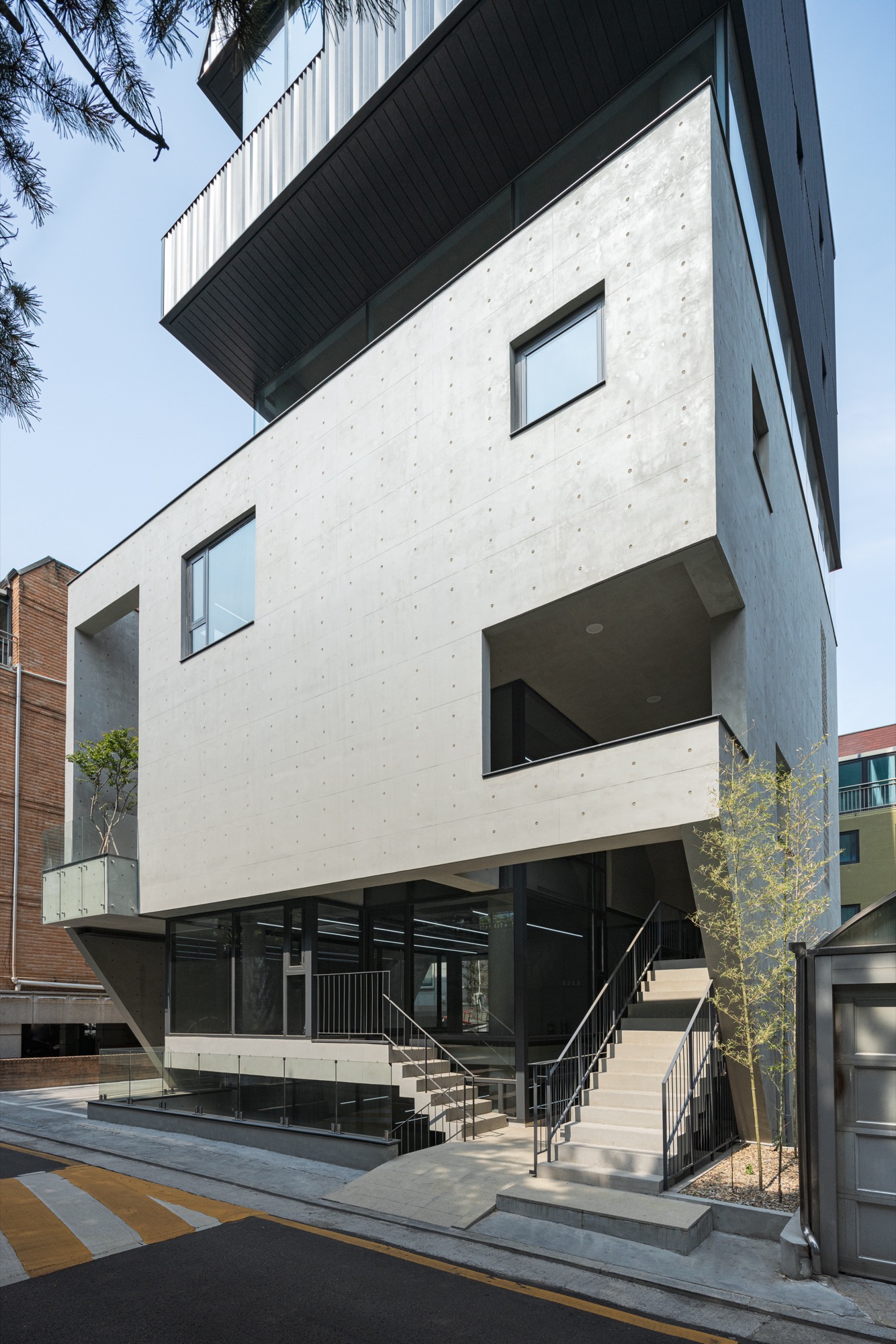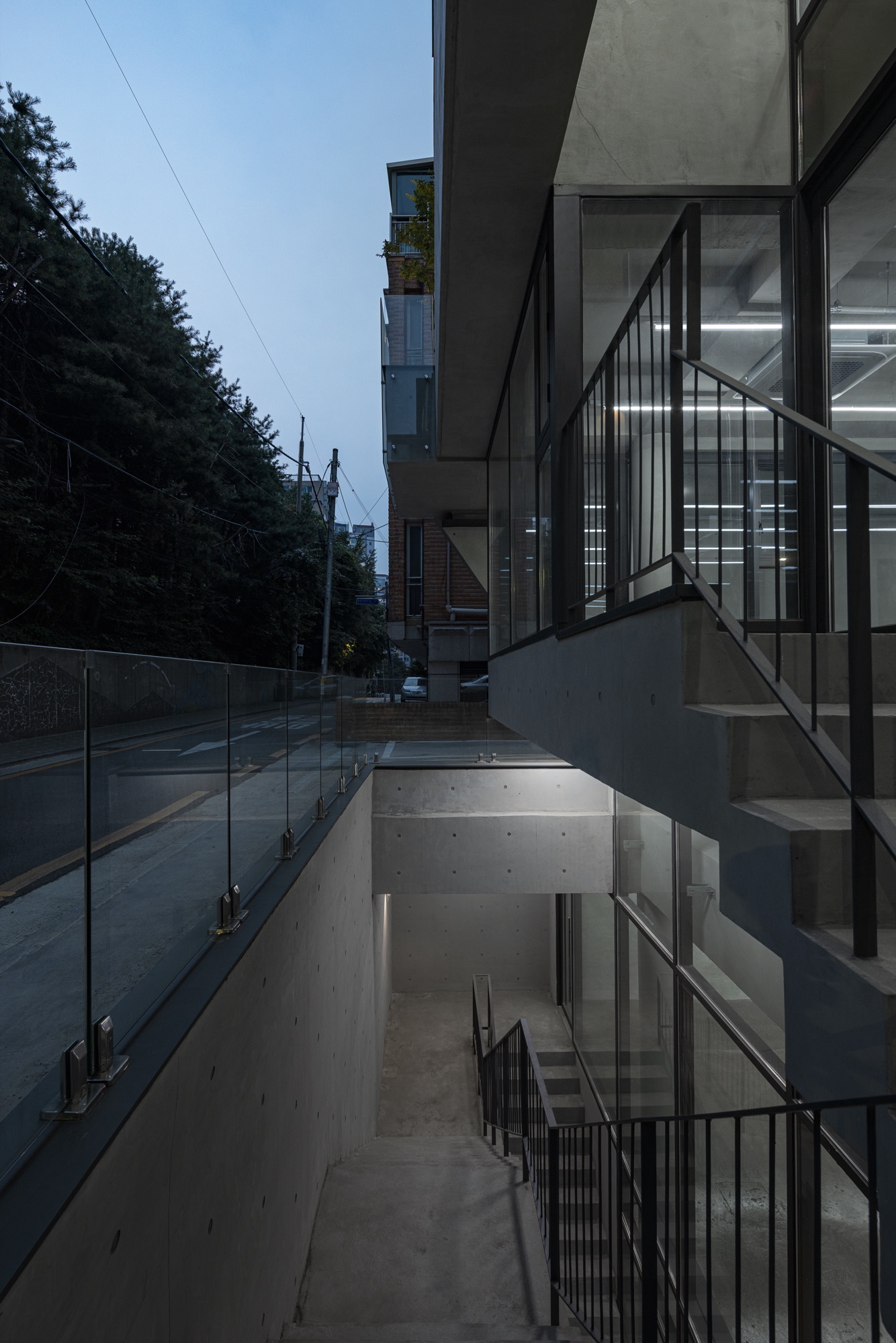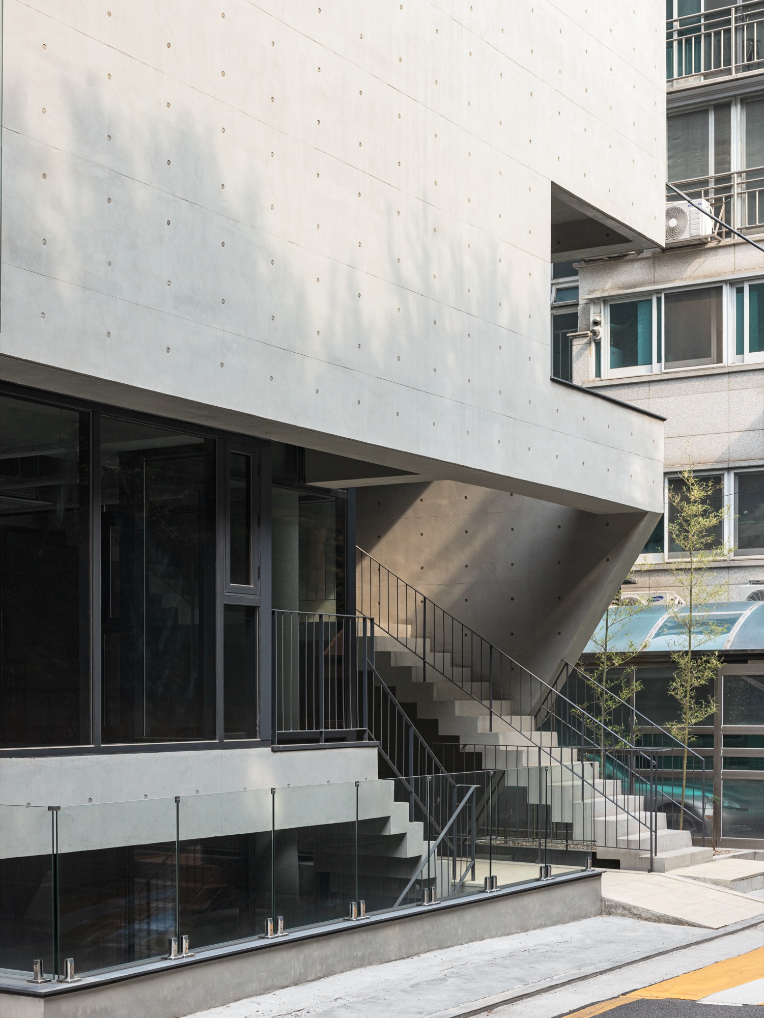 동쪽과 서쪽으로 접한 도로 풍경은 두터운 경계를 만들고 깊이감과 동선이 도시와 엮이게 했다. 도시의 경계에서 수평, 수직적 관계성을 만들었다. 경계에서 확보된 두께는 동선으로 잇고, 보이드로 비우고, 시각적으로 주변 풍경과 압착시키고, 안과 밖이 중첩되기도 한다. 서쪽 전면 도로에서는 2층으로 바로 이어지는 계단과 지하층으로 이어지는 계단, 1층으로 이어지는 계단, 1층 진입 동선이 여러 갈래로 이어지면서 수직적으로 관계를 조직하게 된다. 여기서 지나는 행인과 사용자는 서로 시선과 공간이 겹쳐지며 모호한 관계를 체험하게 된다. 두터운 경계의 작업이 얇아지고 민감하게 투명한 격리된 상업건축의 대안으로, 도시 사회적 관계로 엮이길 기대한다.