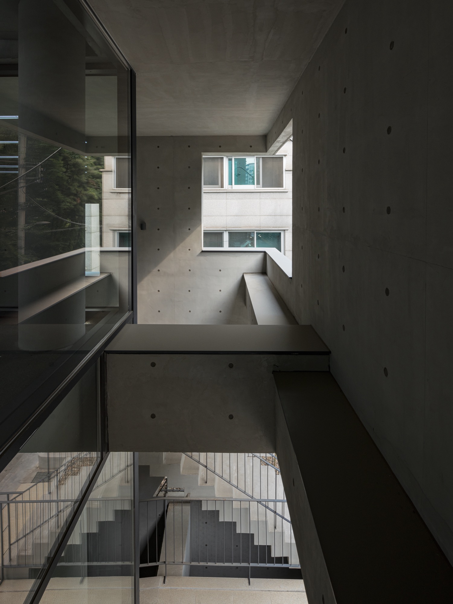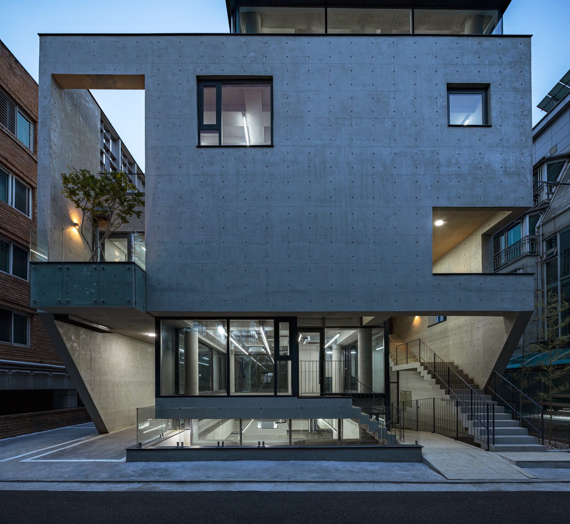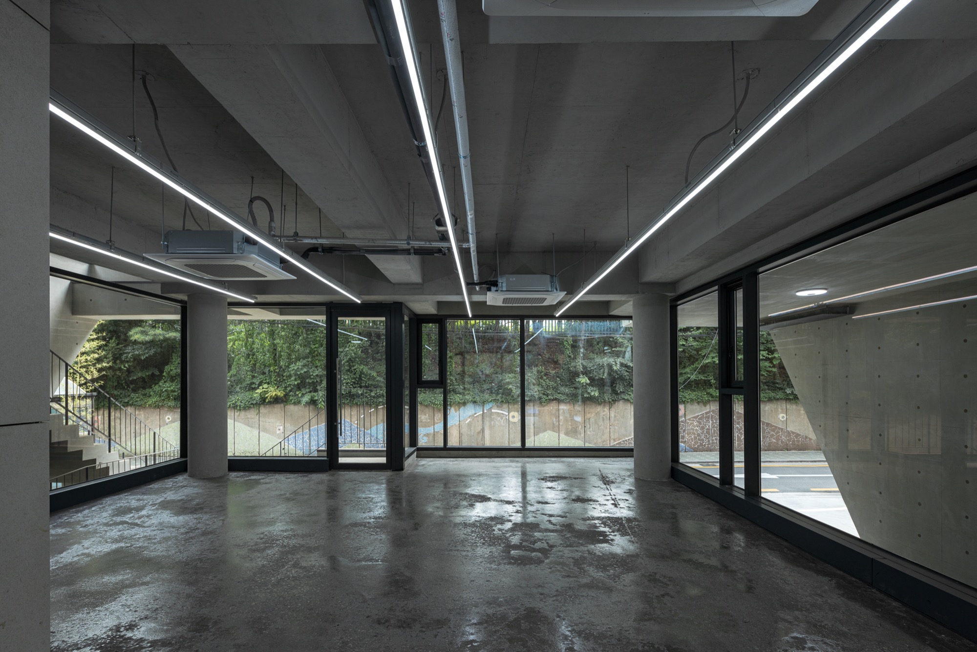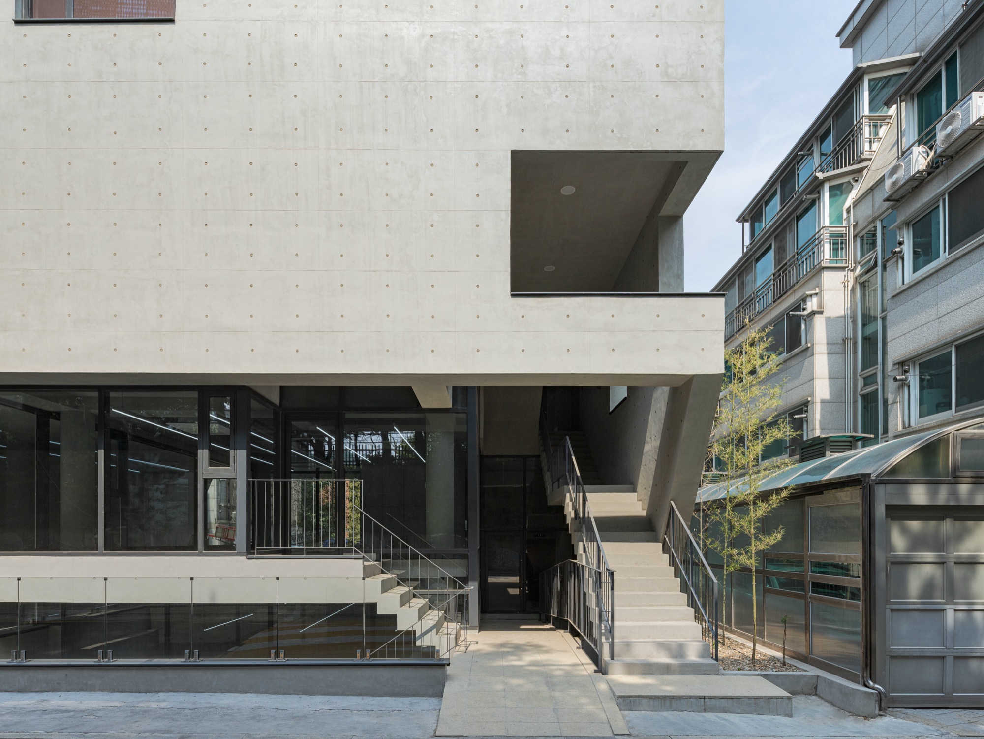 동쪽과 서쪽으로 접한 도로 풍경은 두터운 경계를 만들고 깊이감과 동선이 도시와 엮이게 했다. 도시의 경계에서 수평, 수직적 관계성을 만들었다. 경계에서 확보된 두께는 동선으로 잇고, 보이드로 비우고, 시각적으로 주변 풍경과 압착시키고, 안과 밖이 중첩되기도 한다. 서쪽 전면 도로에서는 2층으로 바로 이어지는 계단과 지하층으로 이어지는 계단, 1층으로 이어지는 계단, 1층 진입 동선이 여러 갈래로 이어지면서 수직적으로 관계를 조직하게 된다. 여기서 지나는 행인과 사용자는 서로 시선과 공간이 겹쳐지며 모호한 관계를 체험하게 된다. 두터운 경계의 작업이 얇아지고 민감하게 투명한 격리된 상업건축의 대안으로, 도시 사회적 관계로 엮이길 기대한다.