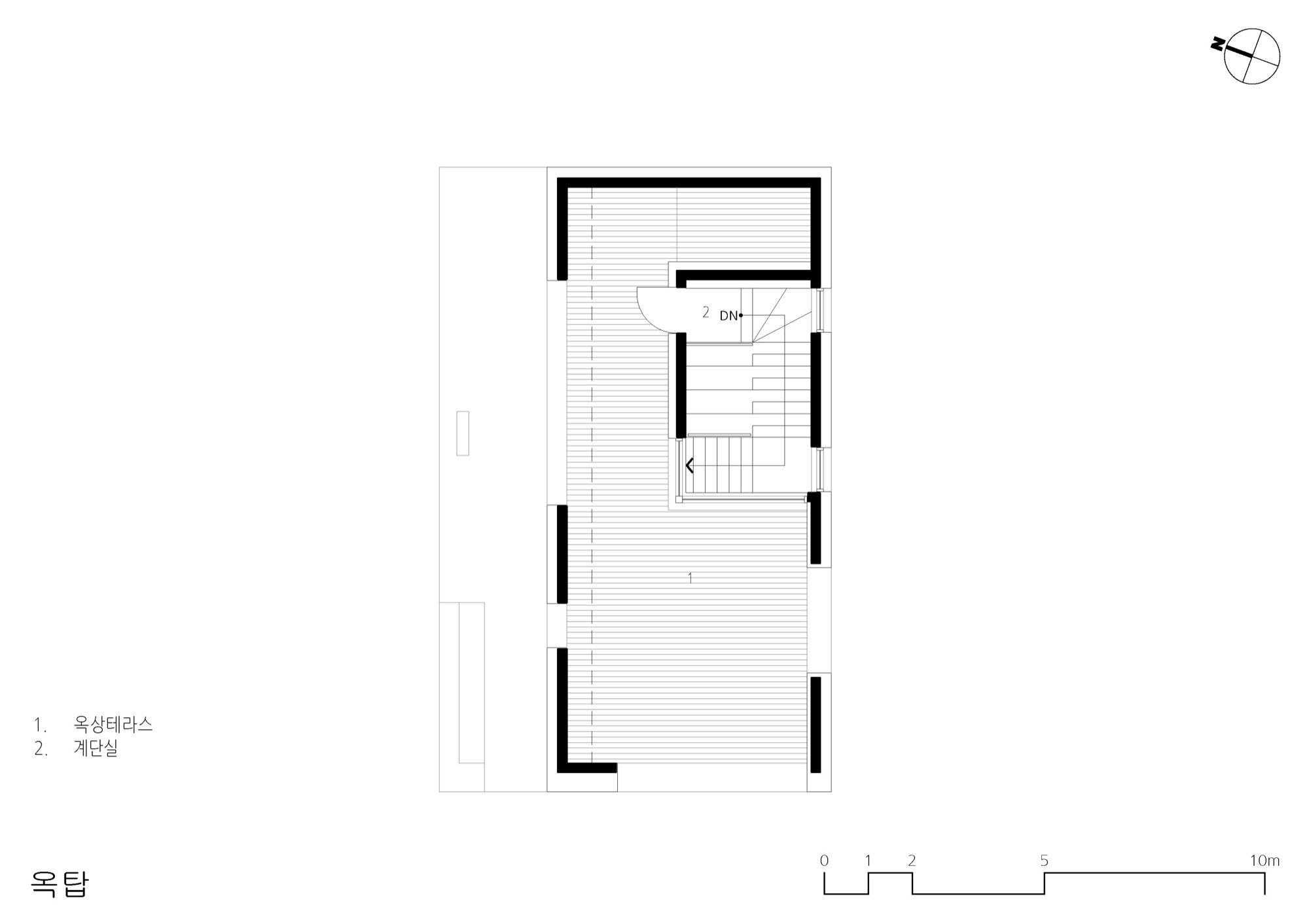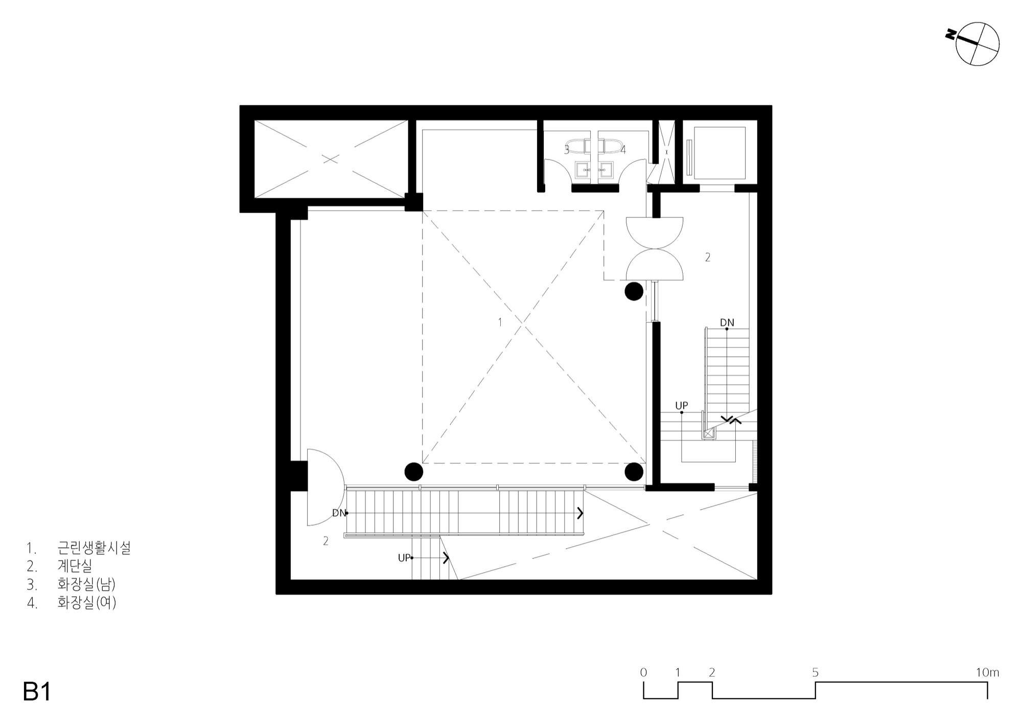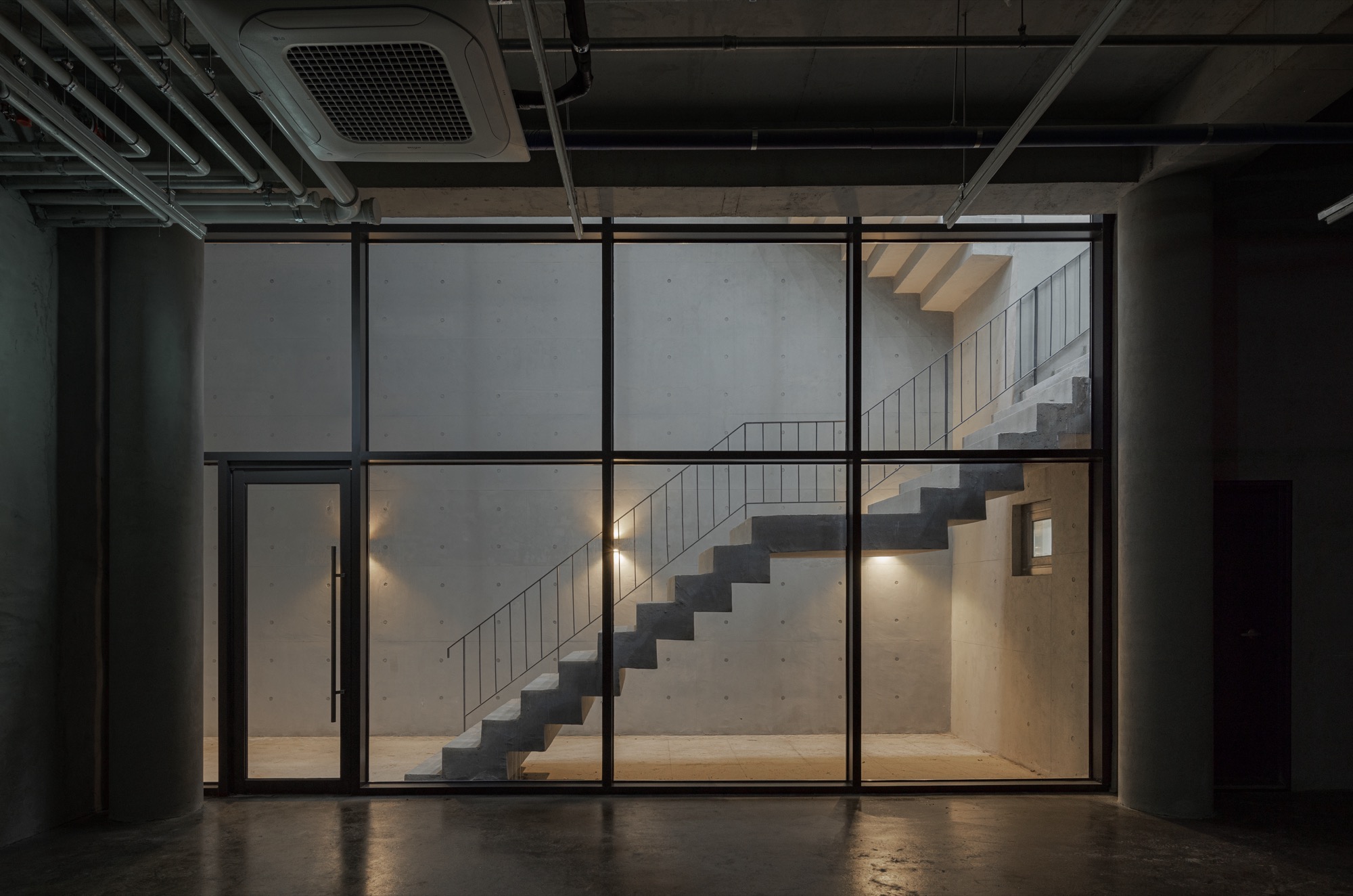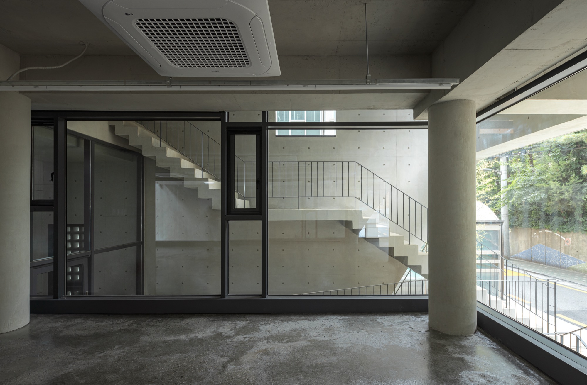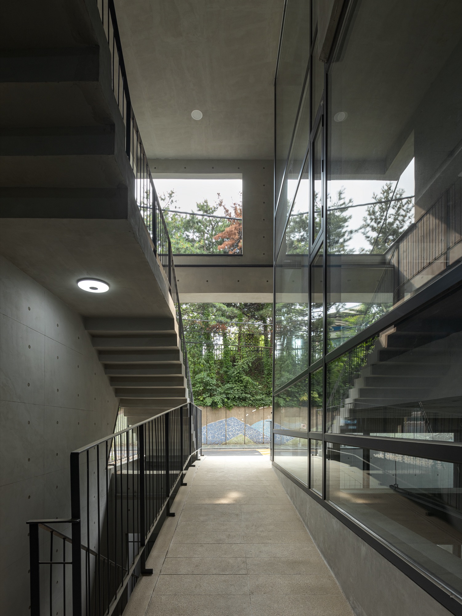 동쪽과 서쪽으로 접한 도로 풍경은 두터운 경계를 만들고 깊이감과 동선이 도시와 엮이게 했다. 도시의 경계에서 수평, 수직적 관계성을 만들었다. 경계에서 확보된 두께는 동선으로 잇고, 보이드로 비우고, 시각적으로 주변 풍경과 압착시키고, 안과 밖이 중첩되기도 한다. 서쪽 전면 도로에서는 2층으로 바로 이어지는 계단과 지하층으로 이어지는 계단, 1층으로 이어지는 계단, 1층 진입 동선이 여러 갈래로 이어지면서 수직적으로 관계를 조직하게 된다. 여기서 지나는 행인과 사용자는 서로 시선과 공간이 겹쳐지며 모호한 관계를 체험하게 된다. 두터운 경계의 작업이 얇아지고 민감하게 투명한 격리된 상업건축의 대안으로, 도시 사회적 관계로 엮이길 기대한다.