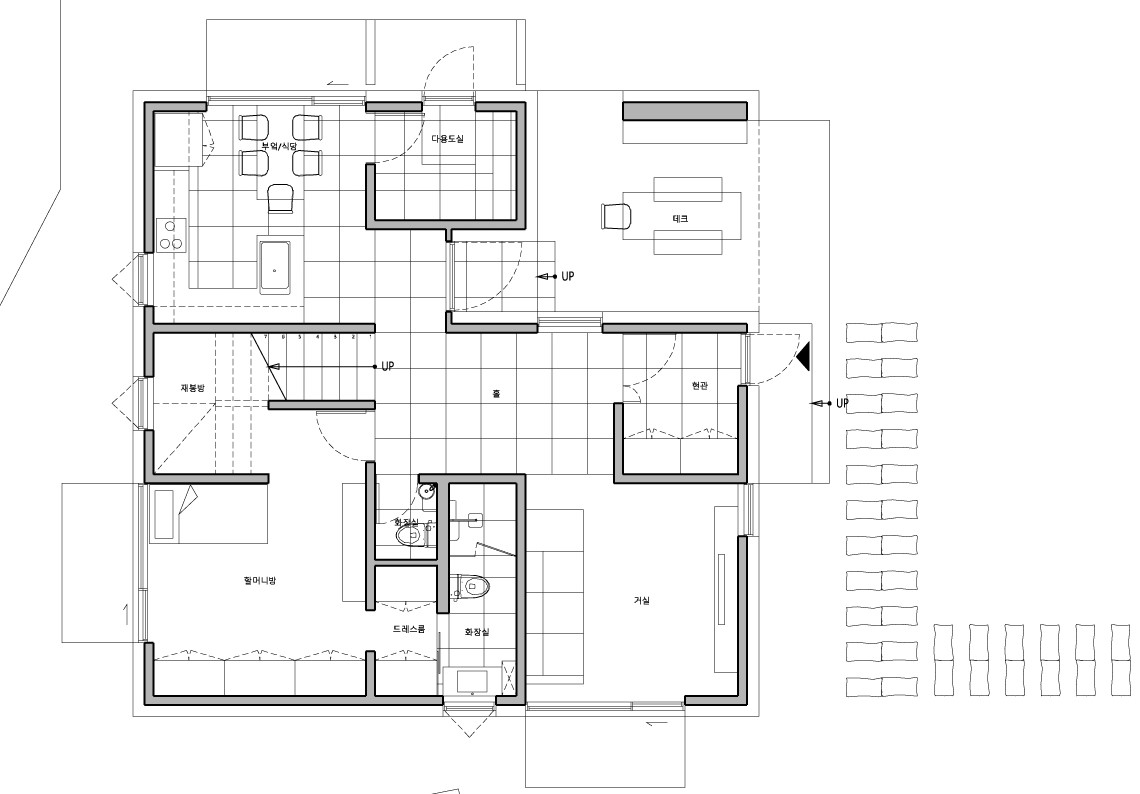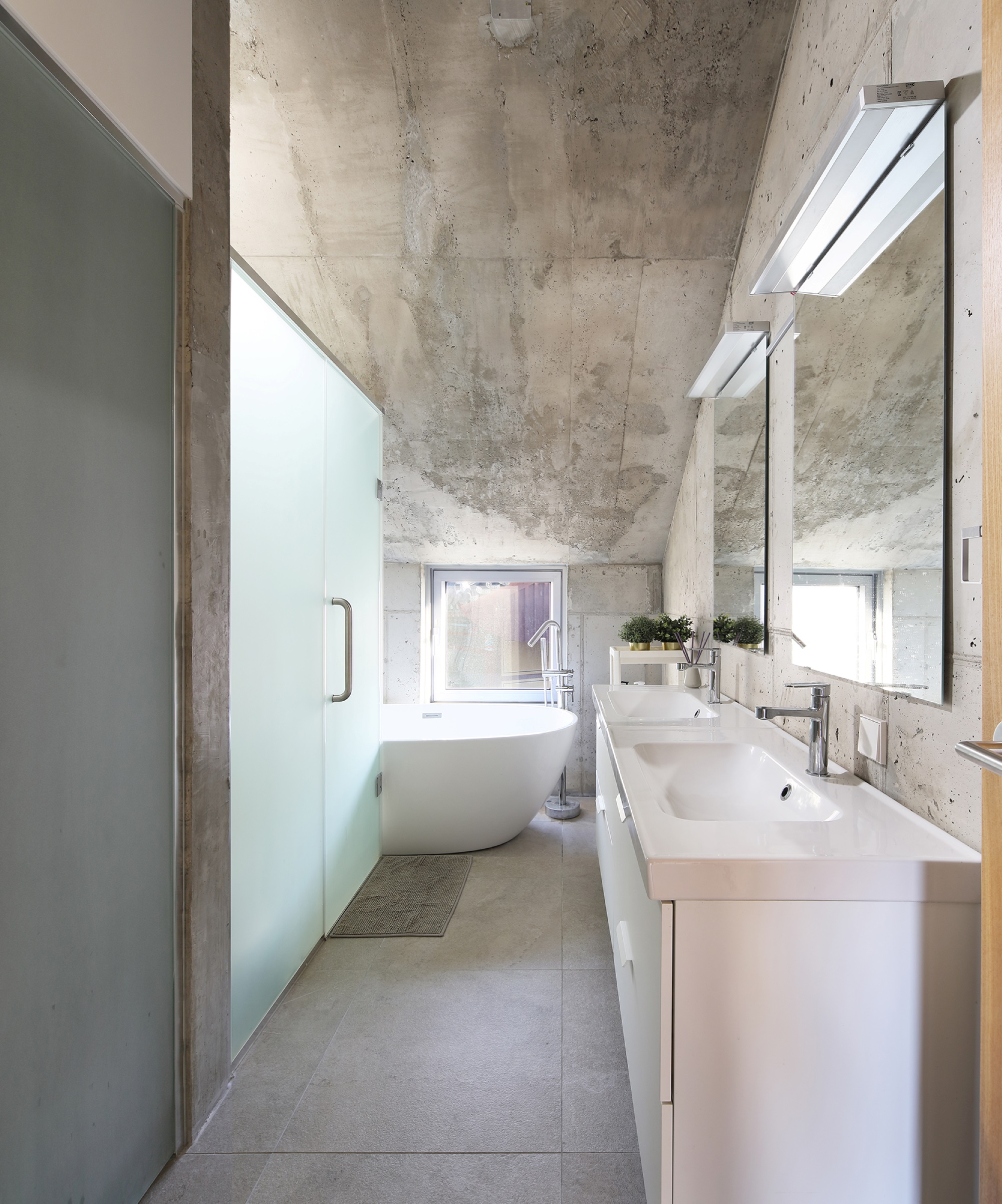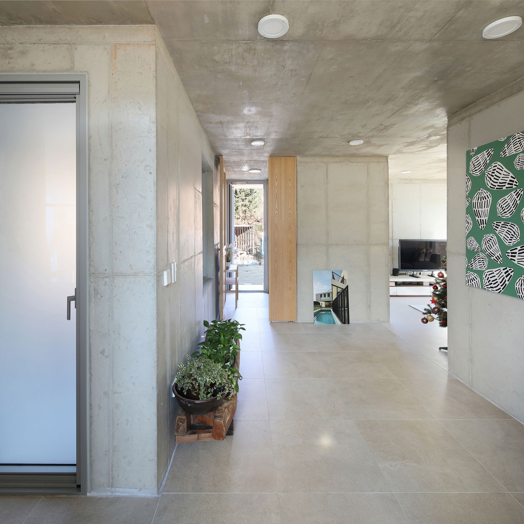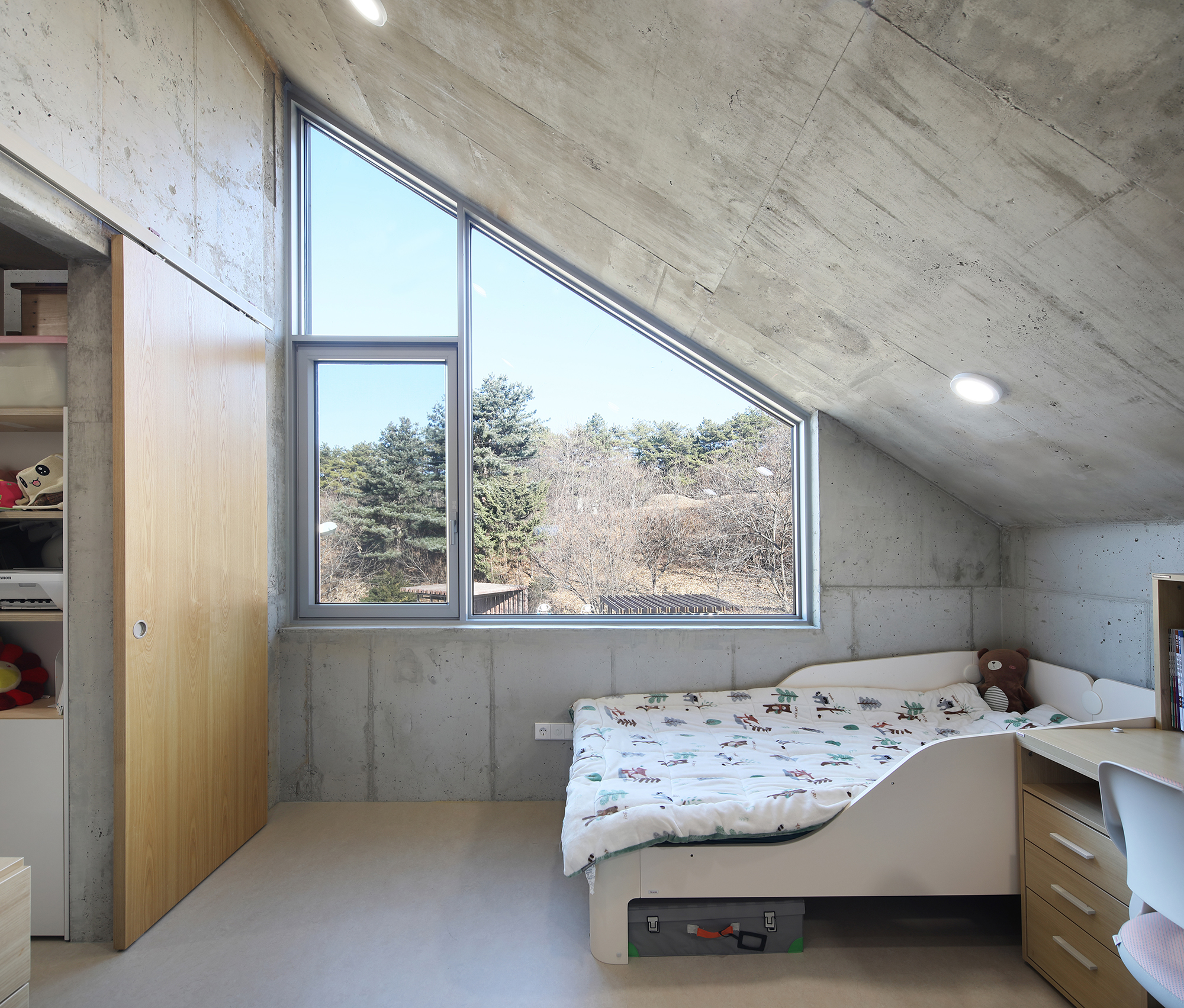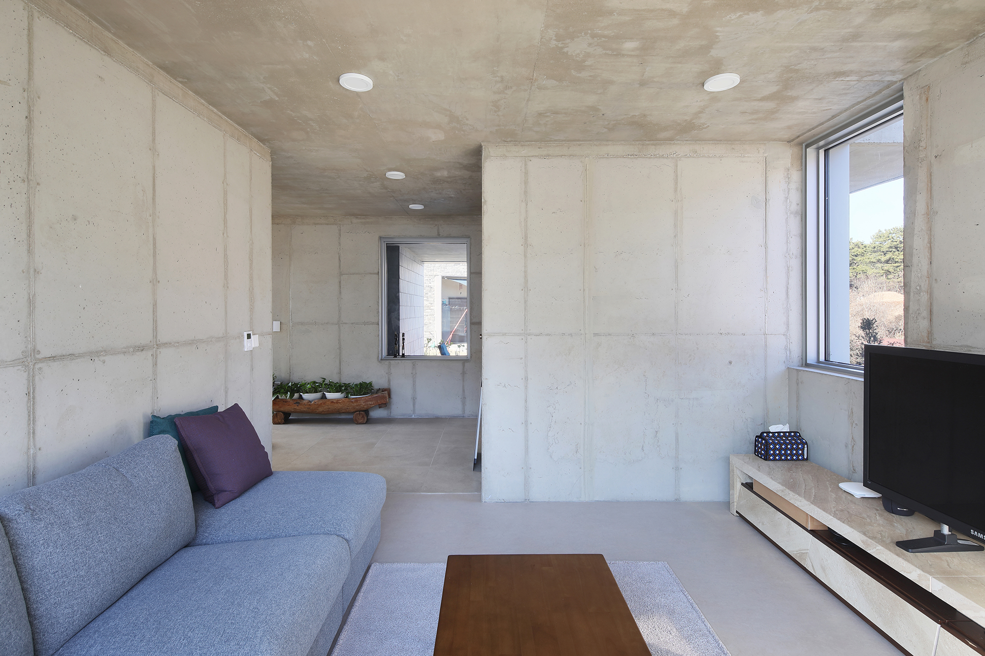 외부에서는 캐노피와 바닥, 데크 전체에 콘크리트가 드러난다. 내부는 바닥을 제외한 모든 면이 콘크리트다. 우리가 알고 있는 매끈한 ‘노출콘크리트’가 아닌 일반 거푸집을 사용해 잔손보기만 한 가장 자연스러운 형태의 콘크리트를 만날 수 있는 가공법이다. 작업하면서 생긴 목수들의 연필 자국, 타설하며 생긴 공기 구멍과 물 자국들…….. 집이 지어지면서 생긴 역사를 매일 만날 수 있다.