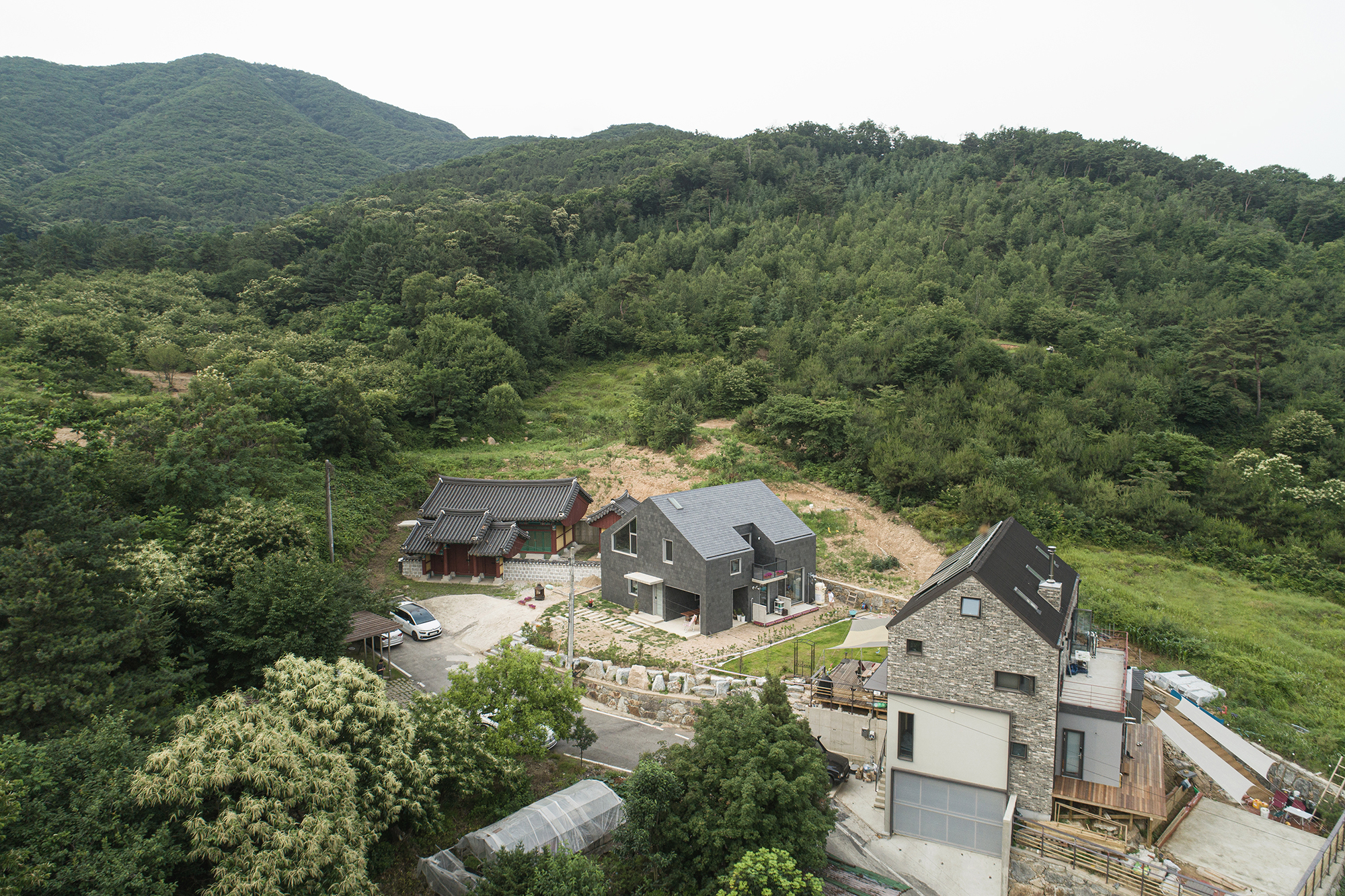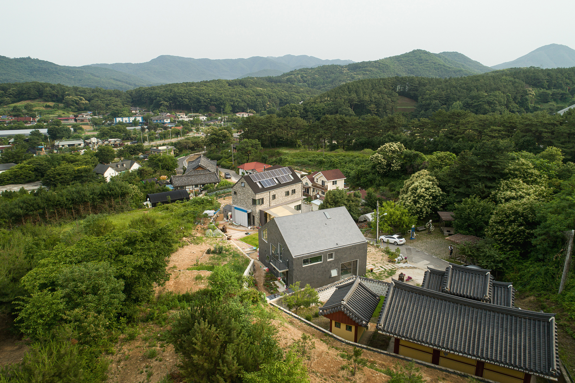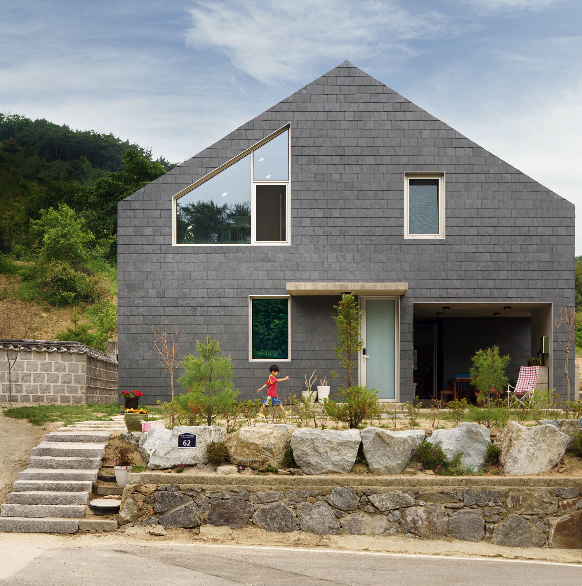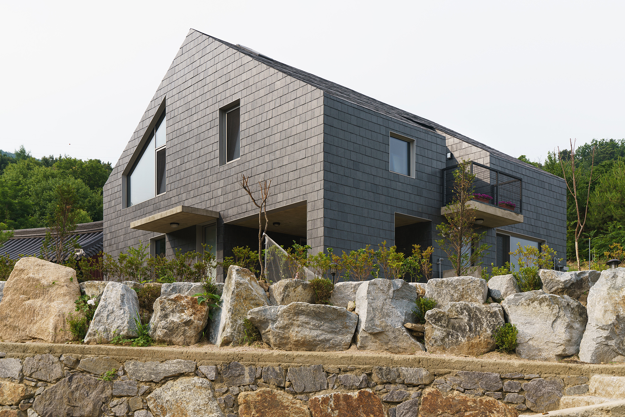 마을의 마지막에 자리한 대지는 집이면서 산자락이 시작되고, 오랫동안 마을을 지켜온 청주 한씨 종친회의 제실을 이웃으로 하며, 500년 된 약수터를 마주하고 있었다. 전통 건축과 자연을 해치지 않는 단순한 형태와 재료를 취해야 했다. 사방으로 외부를 고루 마주할 수 있는 정방형 박공지붕에 자연 재료와 돌, 콘크리트가 사용됐다. 5mm 두께의 얇은 돌은 ‘천연 슬레이트’라고 불리는 유럽의 전통 지붕 재료다. 우리의 너와집처럼 겹쳐 잇는 방법이다. 돌 자체에 숨어있는 금속성으로 보는 각도에 따라 반사를 이루며, 지붕과 외벽 전체를 덮고 있다.