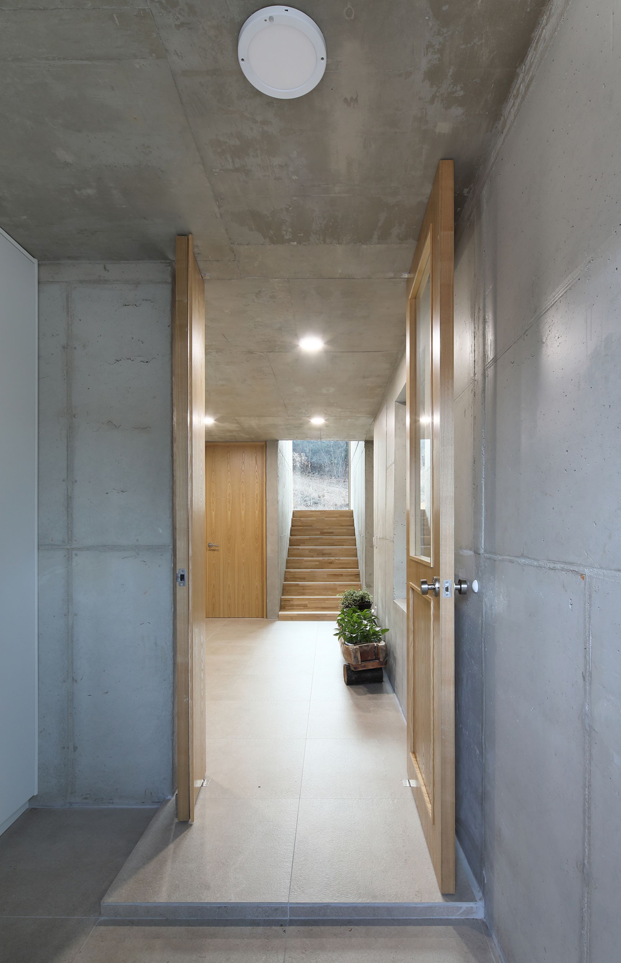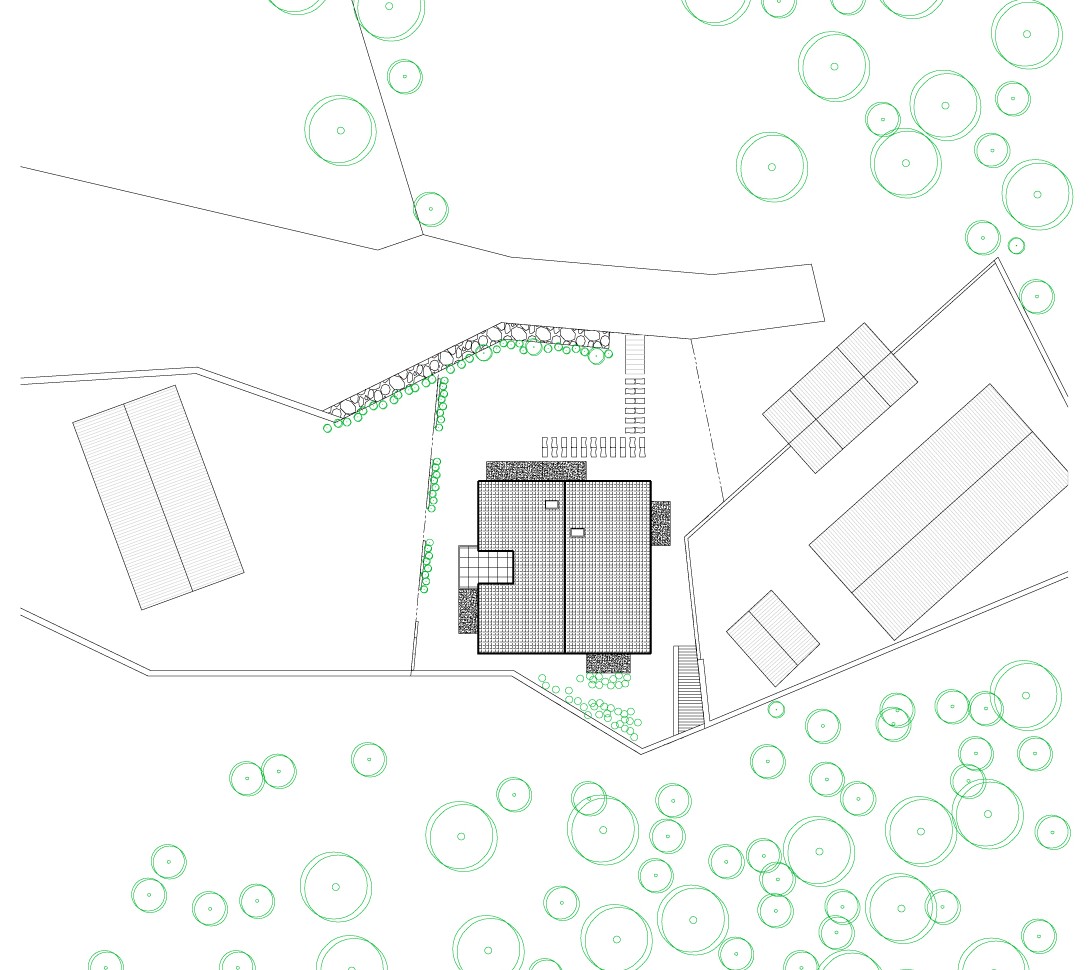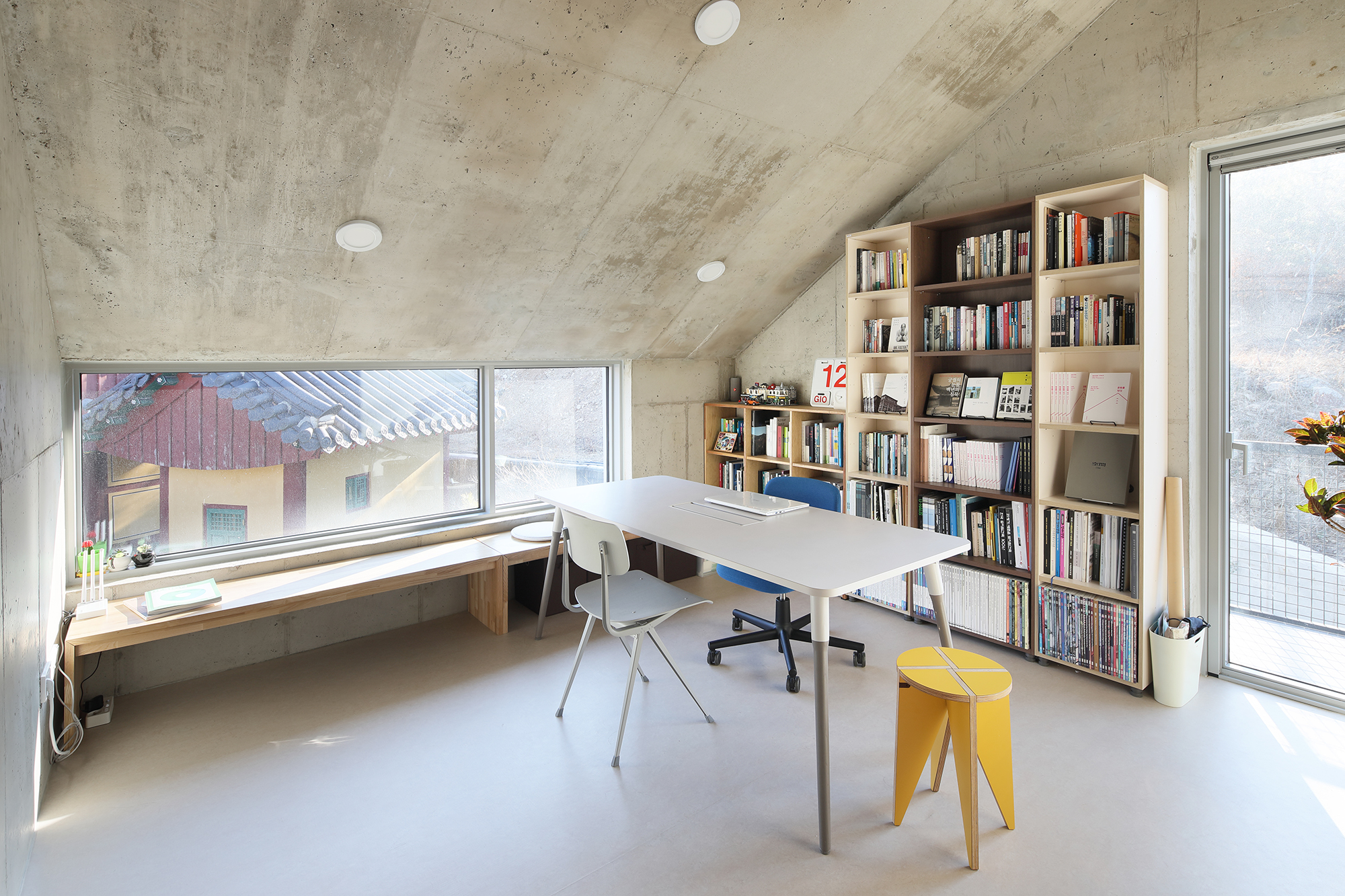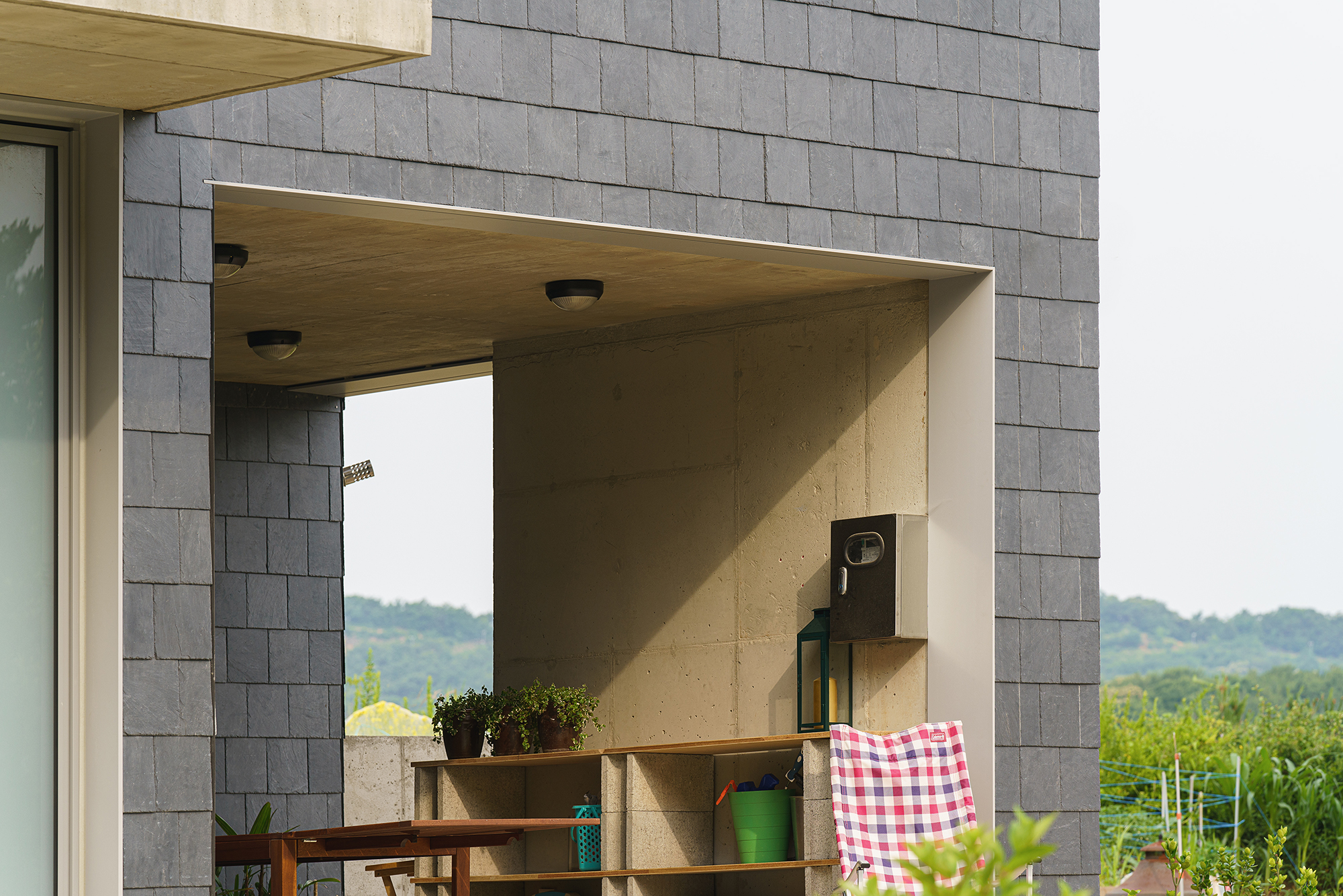 마을의 마지막에 자리한 대지는 집이면서 산자락이 시작되고, 오랫동안 마을을 지켜온 청주 한씨 종친회의 제실을 이웃으로 하며, 500년 된 약수터를 마주하고 있었다. 전통 건축과 자연을 해치지 않는 단순한 형태와 재료를 취해야 했다. 사방으로 외부를 고루 마주할 수 있는 정방형 박공지붕에 자연 재료와 돌, 콘크리트가 사용됐다. 5mm 두께의 얇은 돌은 ‘천연 슬레이트’라고 불리는 유럽의 전통 지붕 재료다. 우리의 너와집처럼 겹쳐 잇는 방법이다. 돌 자체에 숨어있는 금속성으로 보는 각도에 따라 반사를 이루며, 지붕과 외벽 전체를 덮고 있다.