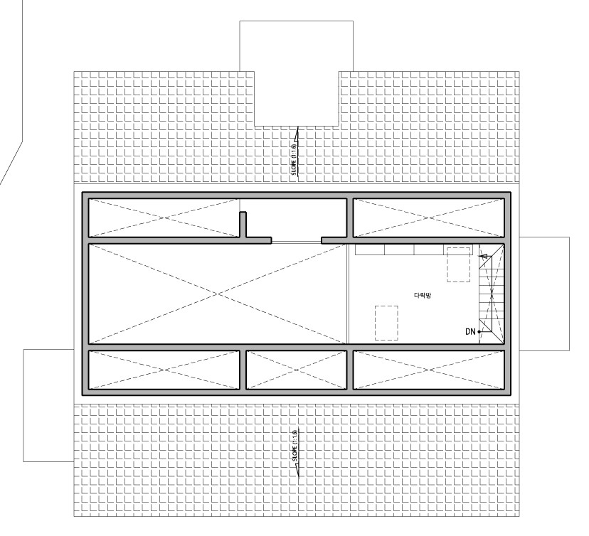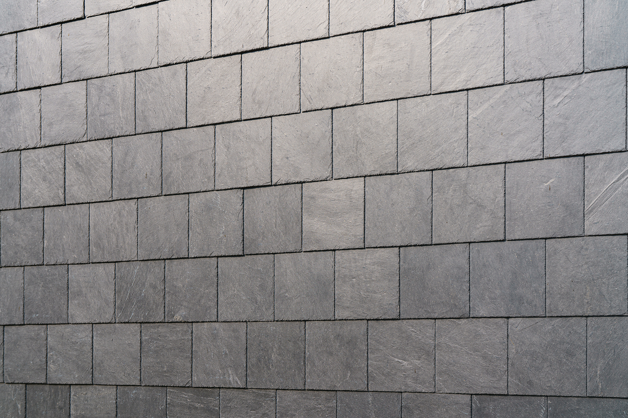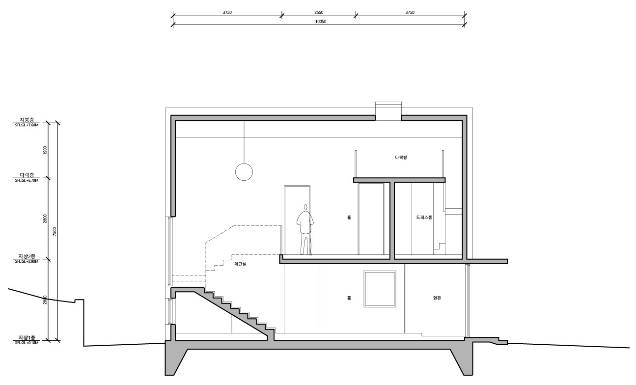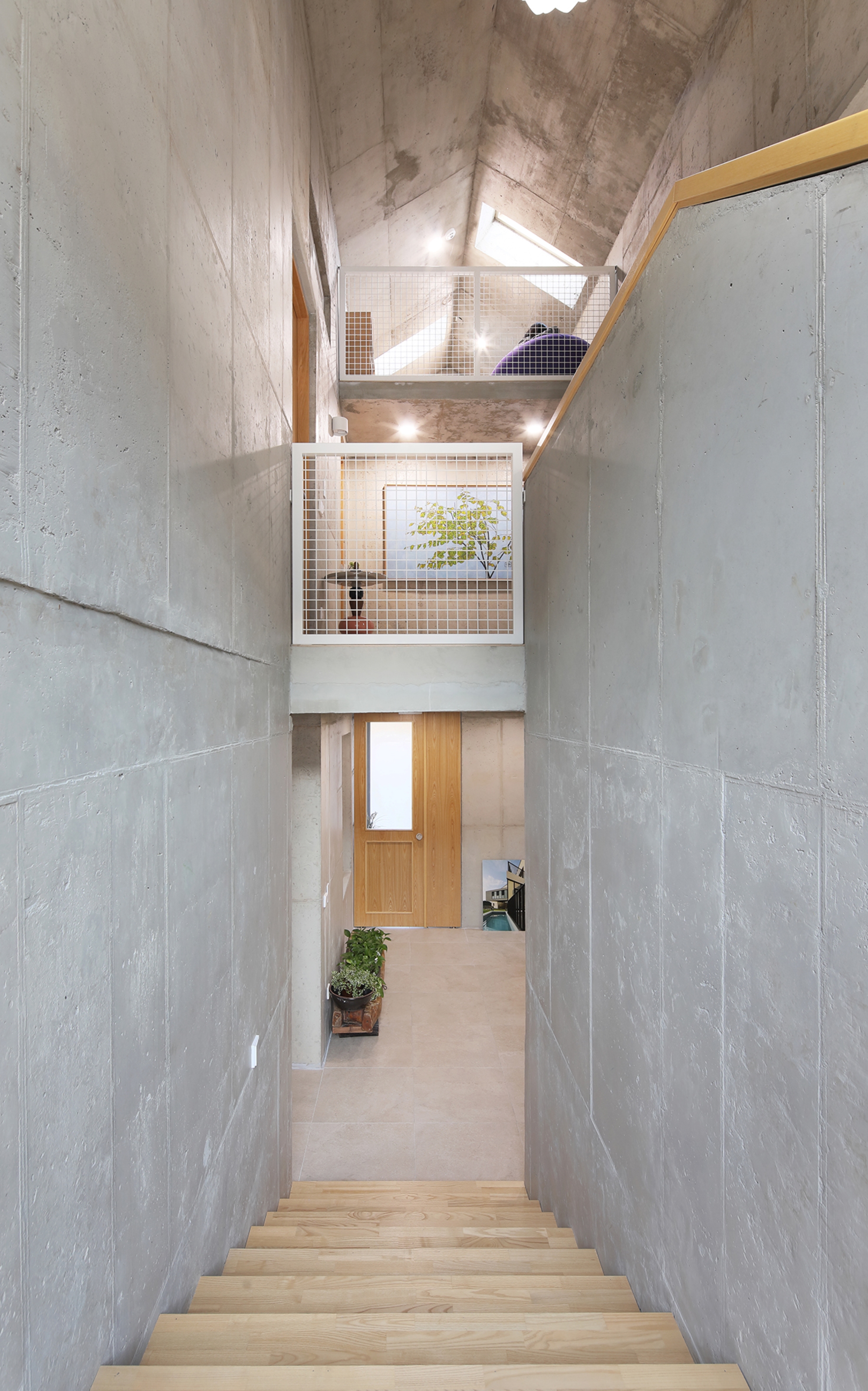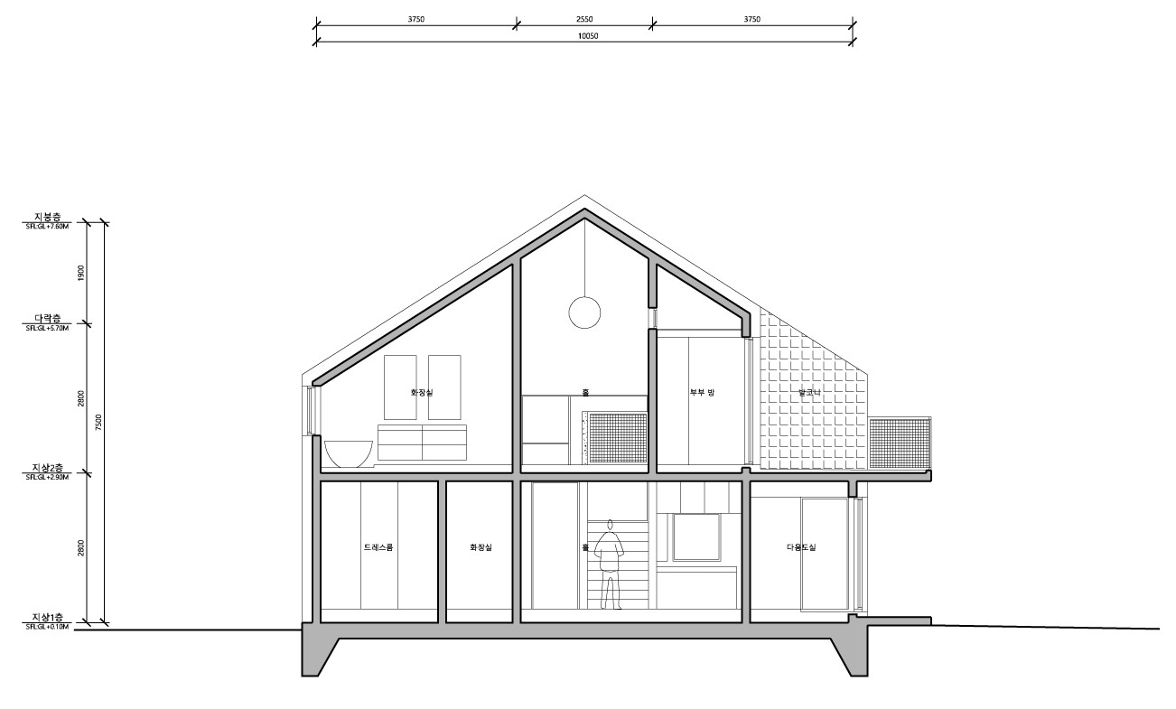 마을의 마지막에 자리한 대지는 집이면서 산자락이 시작되고, 오랫동안 마을을 지켜온 청주 한씨 종친회의 제실을 이웃으로 하며, 500년 된 약수터를 마주하고 있었다. 전통 건축과 자연을 해치지 않는 단순한 형태와 재료를 취해야 했다. 사방으로 외부를 고루 마주할 수 있는 정방형 박공지붕에 자연 재료와 돌, 콘크리트가 사용됐다. 5mm 두께의 얇은 돌은 ‘천연 슬레이트’라고 불리는 유럽의 전통 지붕 재료다. 우리의 너와집처럼 겹쳐 잇는 방법이다. 돌 자체에 숨어있는 금속성으로 보는 각도에 따라 반사를 이루며, 지붕과 외벽 전체를 덮고 있다.