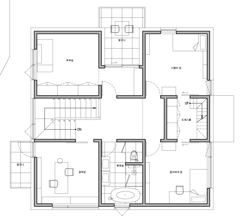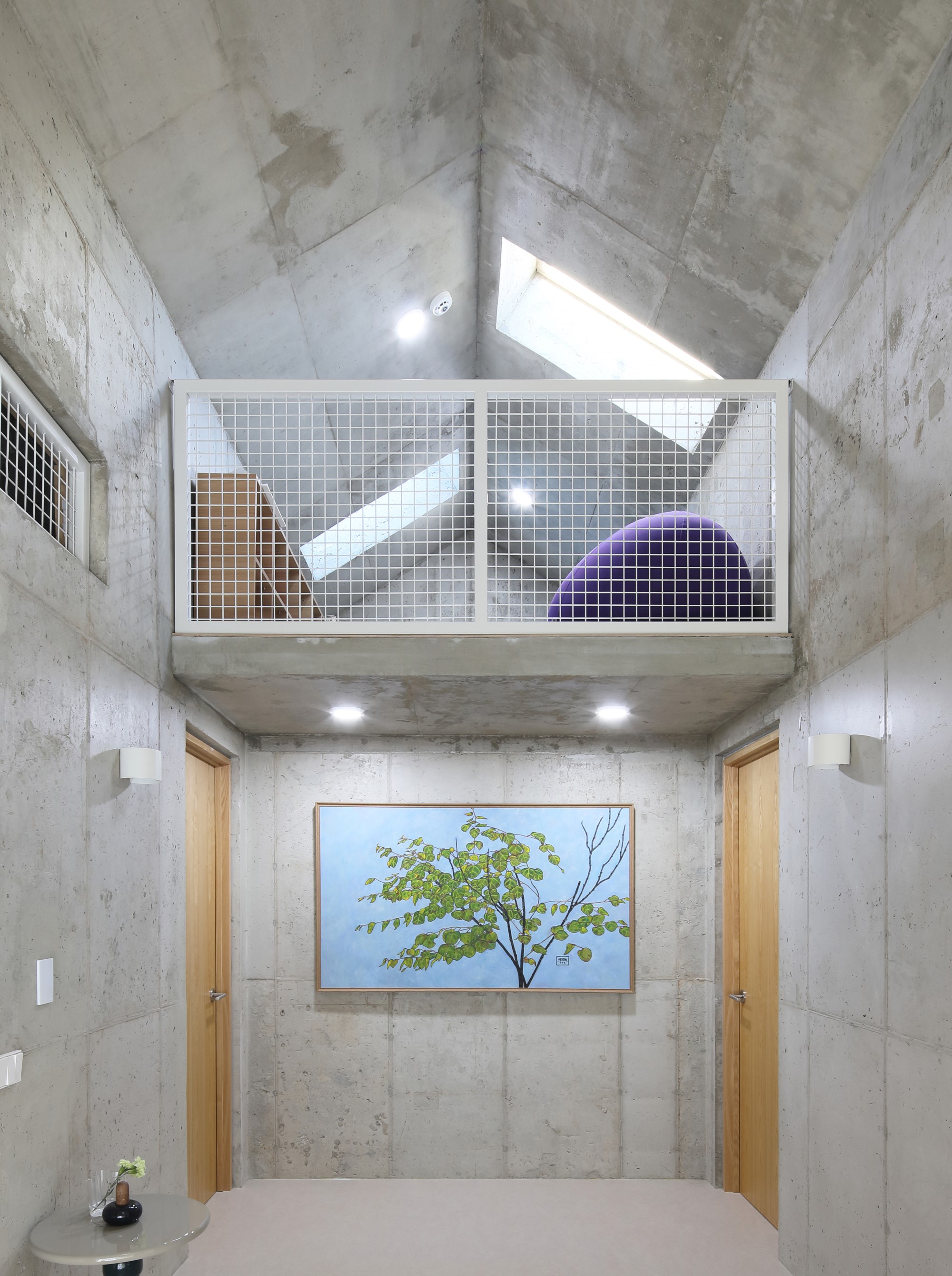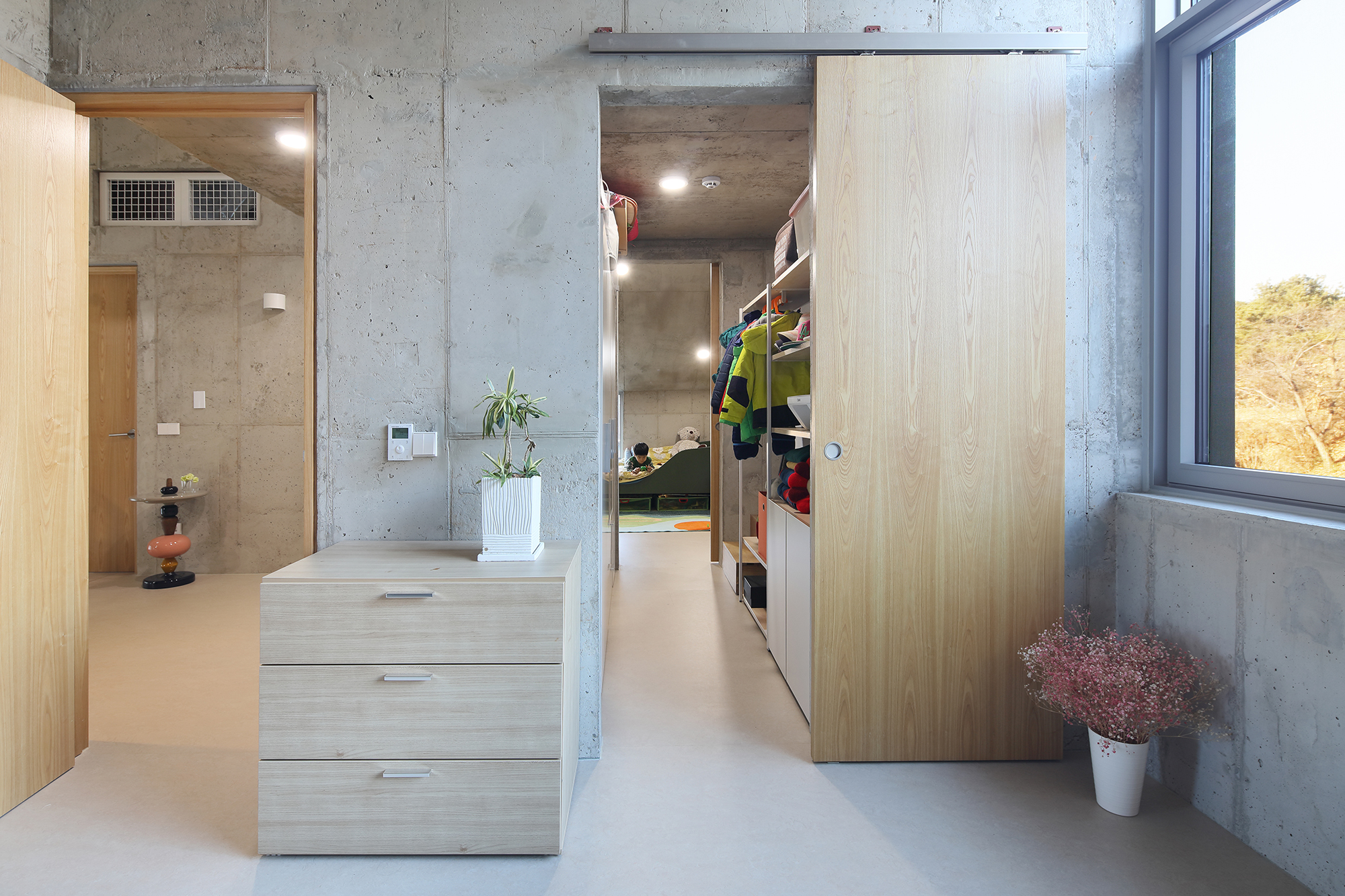 다섯 명이 한집에서 살려면 모임 공간도 중요하지만, 각자의 시간과 공간도 중요하다. 이를 위해서 각 구성원을 평등하게 대우하고, 존중하는 것이 필요하다. 물리적 평등이란, 공간을 동등하게 나누는 것, 적정한 방의 크기(3.6x3.6x2.4m)를 각자 제공했다. 거실, 부엌 겸 식당, 외부 데크, 할머니방, 부부방, 공부방, 올리비아 방, 시환이 방 등 모두 8개의 방은 같은 크기로 계획됐다. 동일한 크기는 공간의 위계를 없앴고, 사방으로 배치된 방은 독립성과 각자의 전망을 갖게 되었다. 집의 중앙에는 새로운 홀 공간이 탄생하면서 동선에 방향성이 사라졌다. 2.4m 폭의 복도치고는 넓고, 거실치고는 좁은 홀은 특정한 기능이 없기에 아트웍이 걸린 갤러리가 되기도, 놀이 공간이 되기도 하며 오히려 많은 기능을 수용한다.