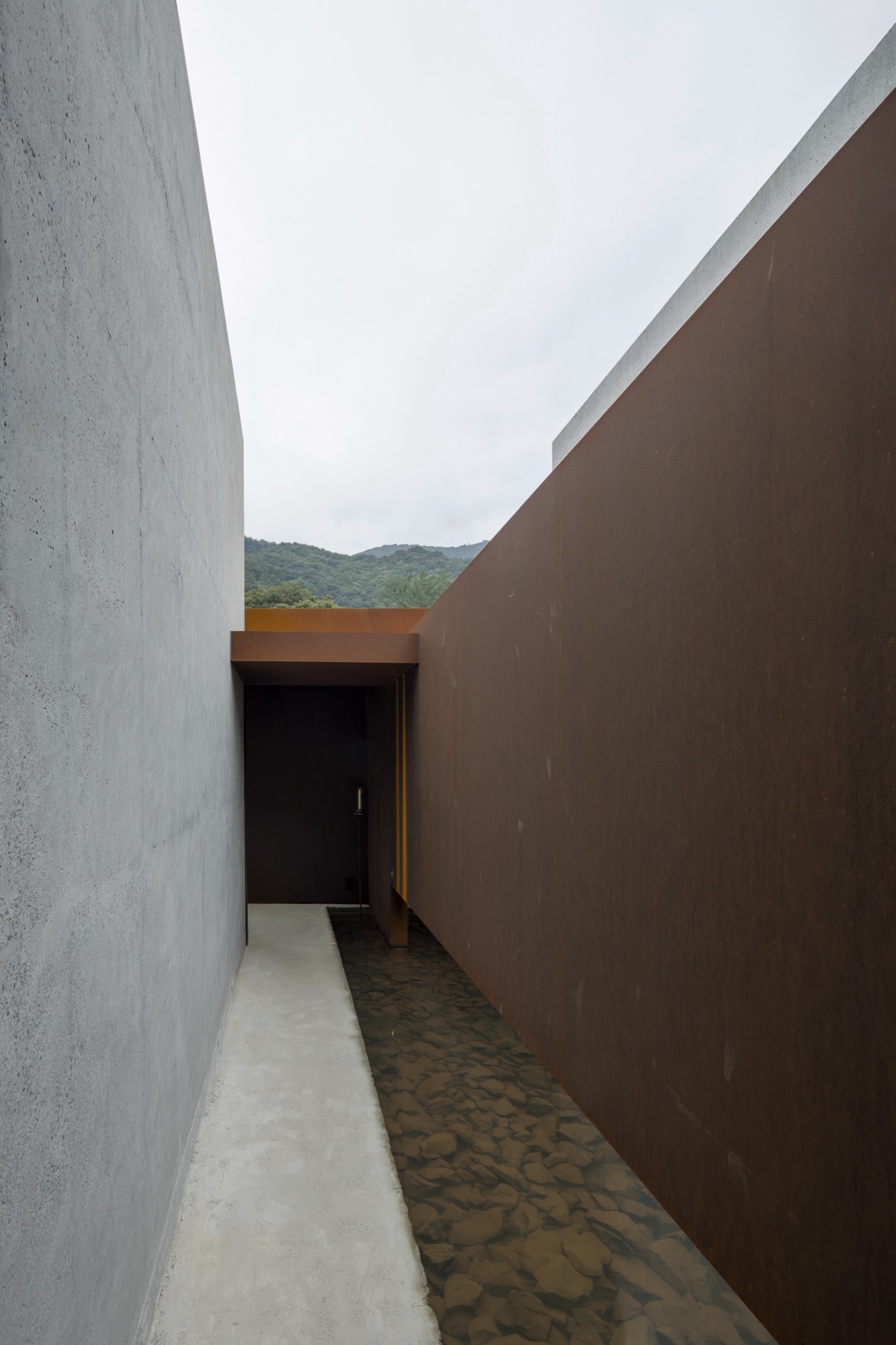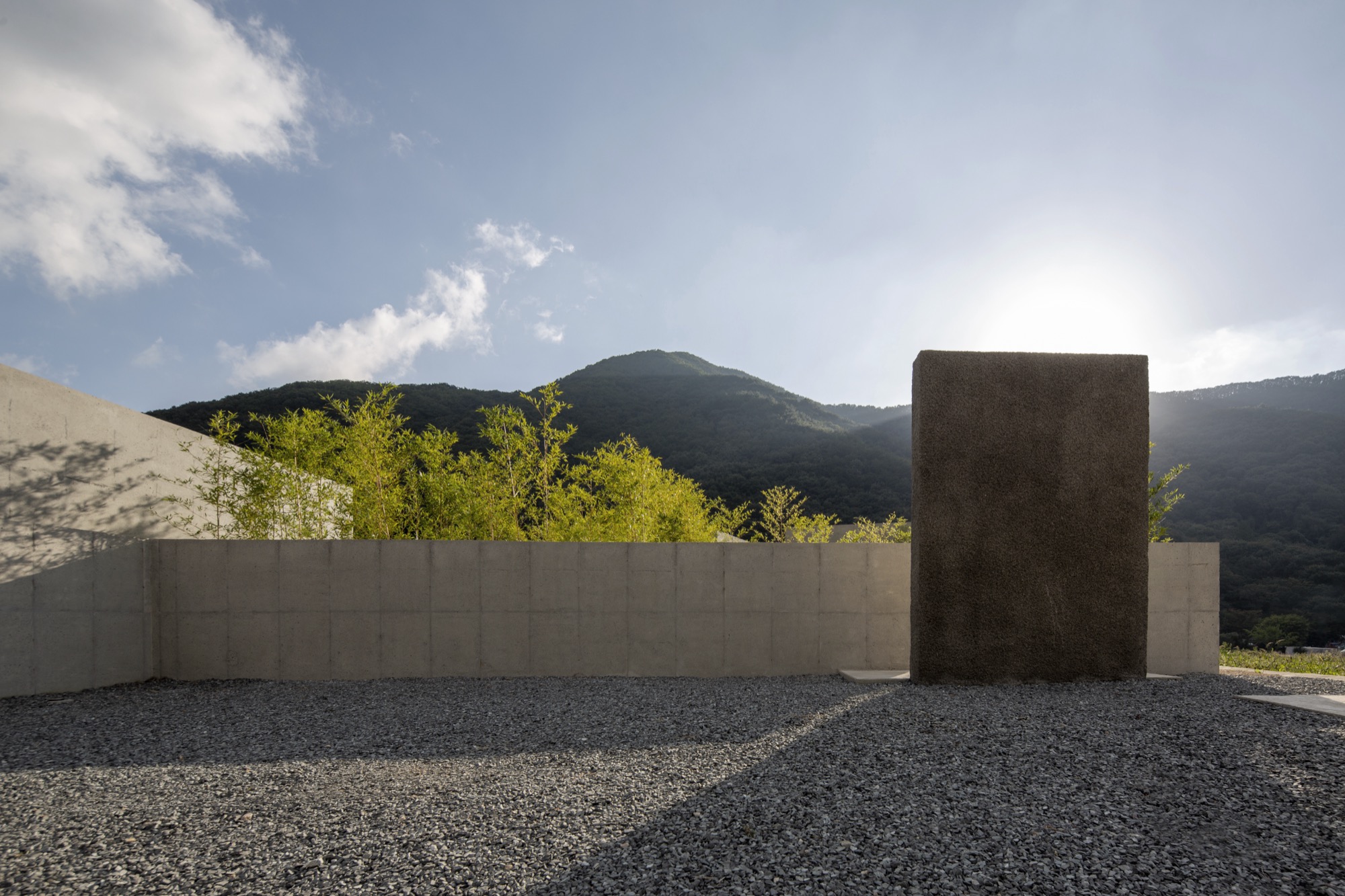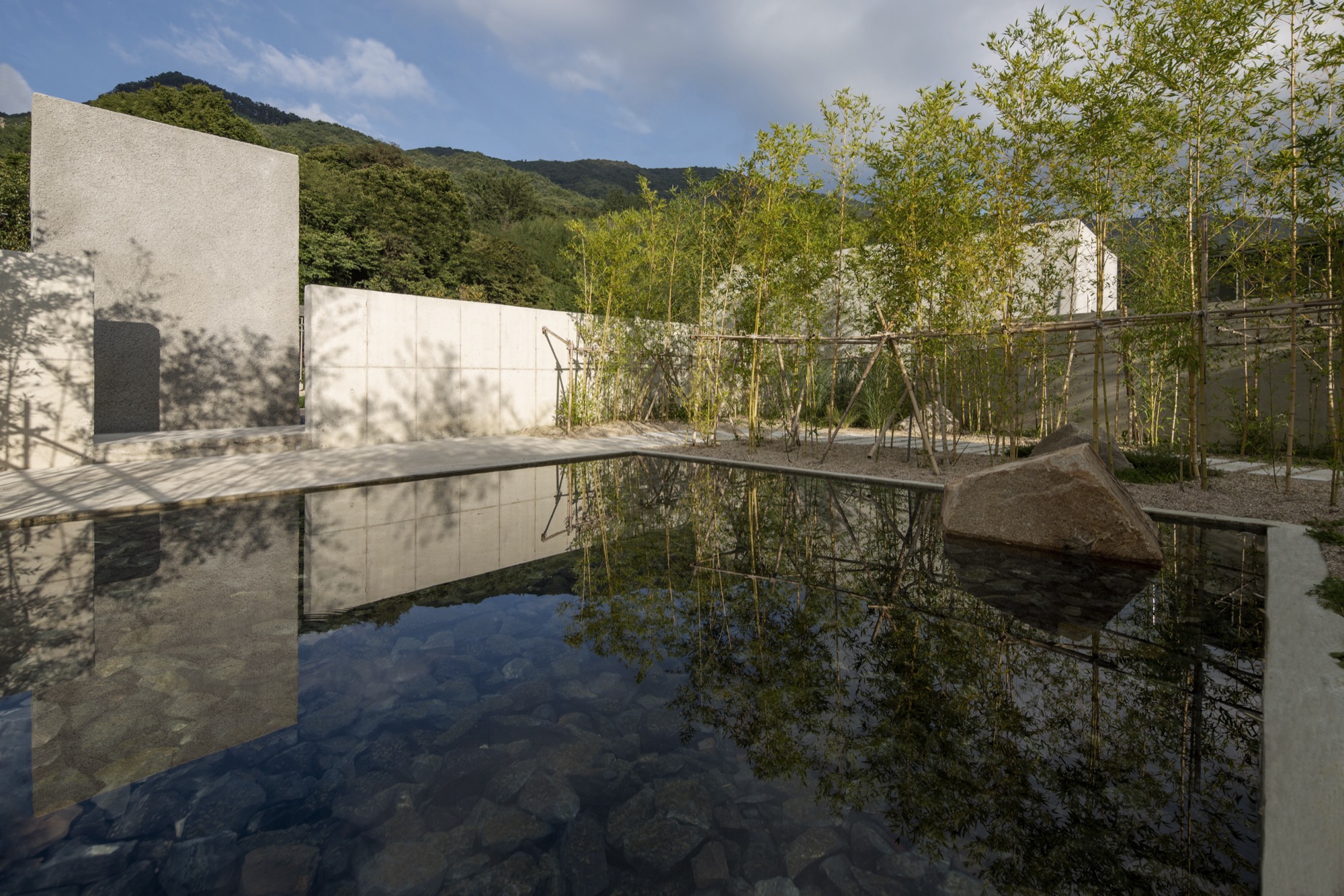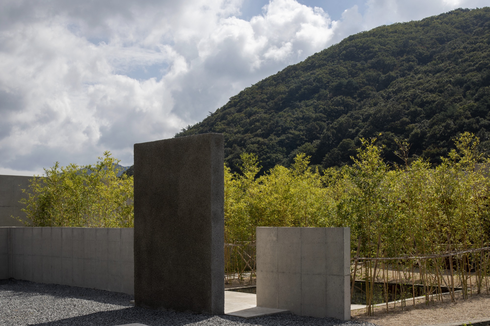 이 장소의 여정은 투박하지만 단단한 물성의 덩어리로 동선을 이끄는 것으로 시작한다. 이는 세상 한복판 고독이라는 자유로움 속에서 그윽한 세계로 들어가기 위한 경계의 문이다. 대나무 숲을 지나는 그늘진 길과 바람 소리, 잔잔한 못에 담긴 해 질 녘 석양과 마주함은 몸과 마음을 이완시키고 자연과 동화됨으로써 밖의 세상과의 간극을 증폭시킨다.
