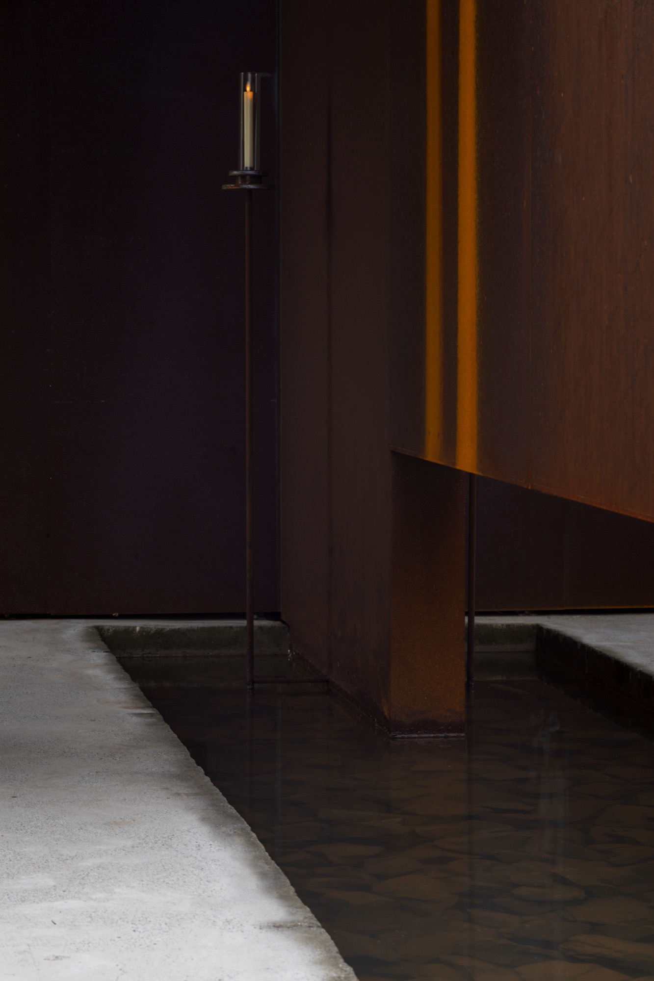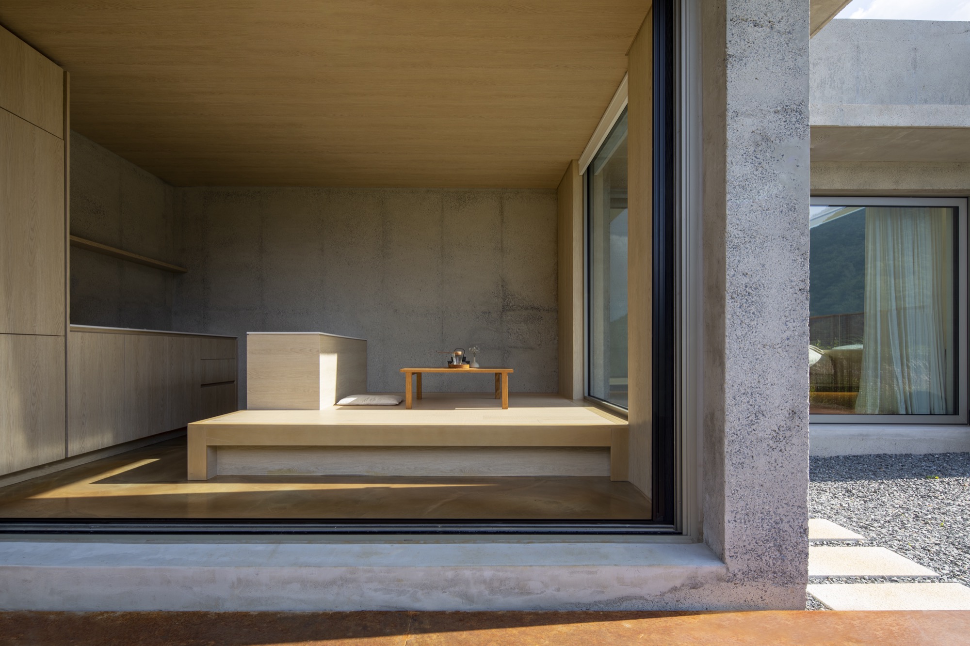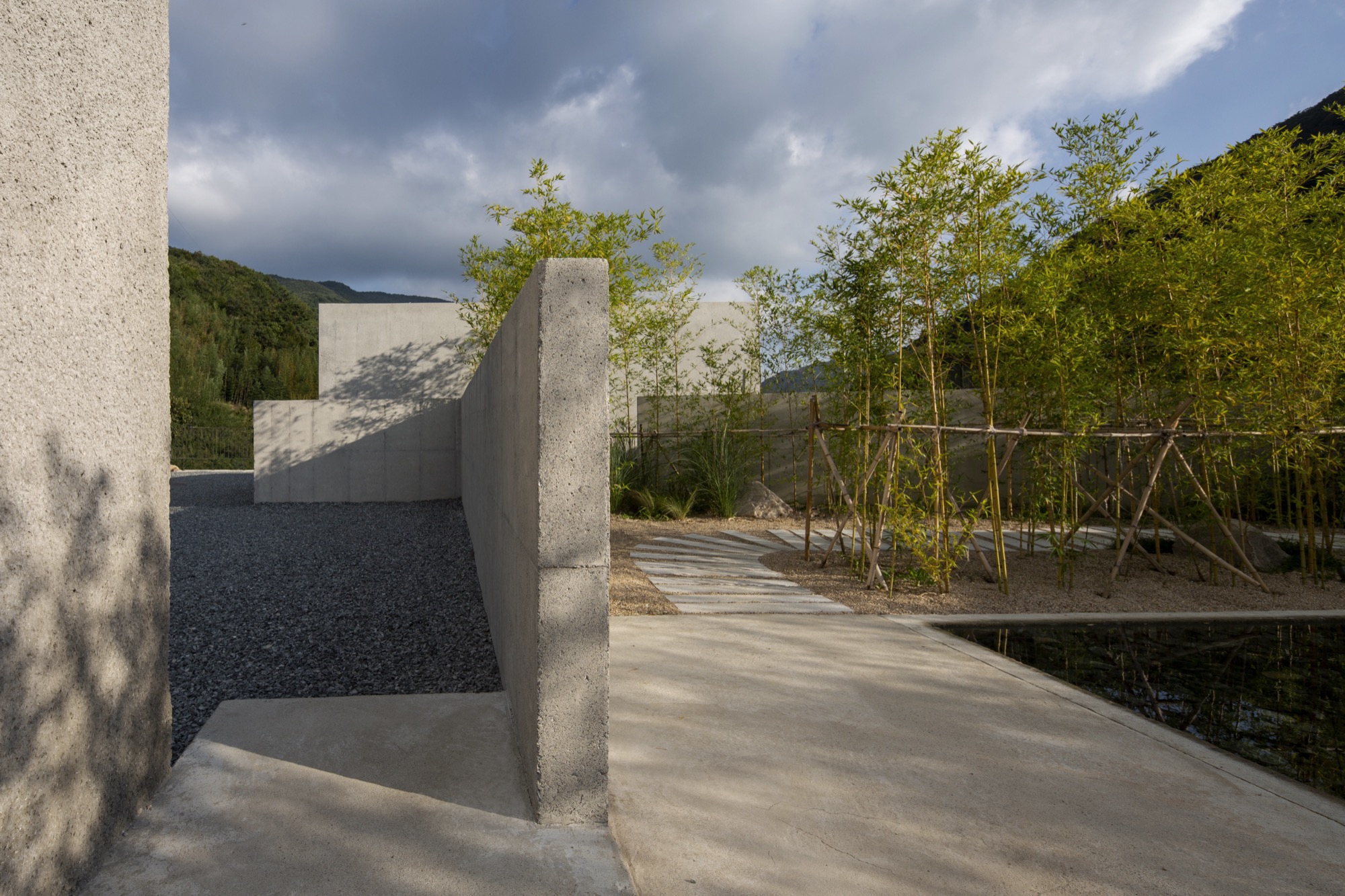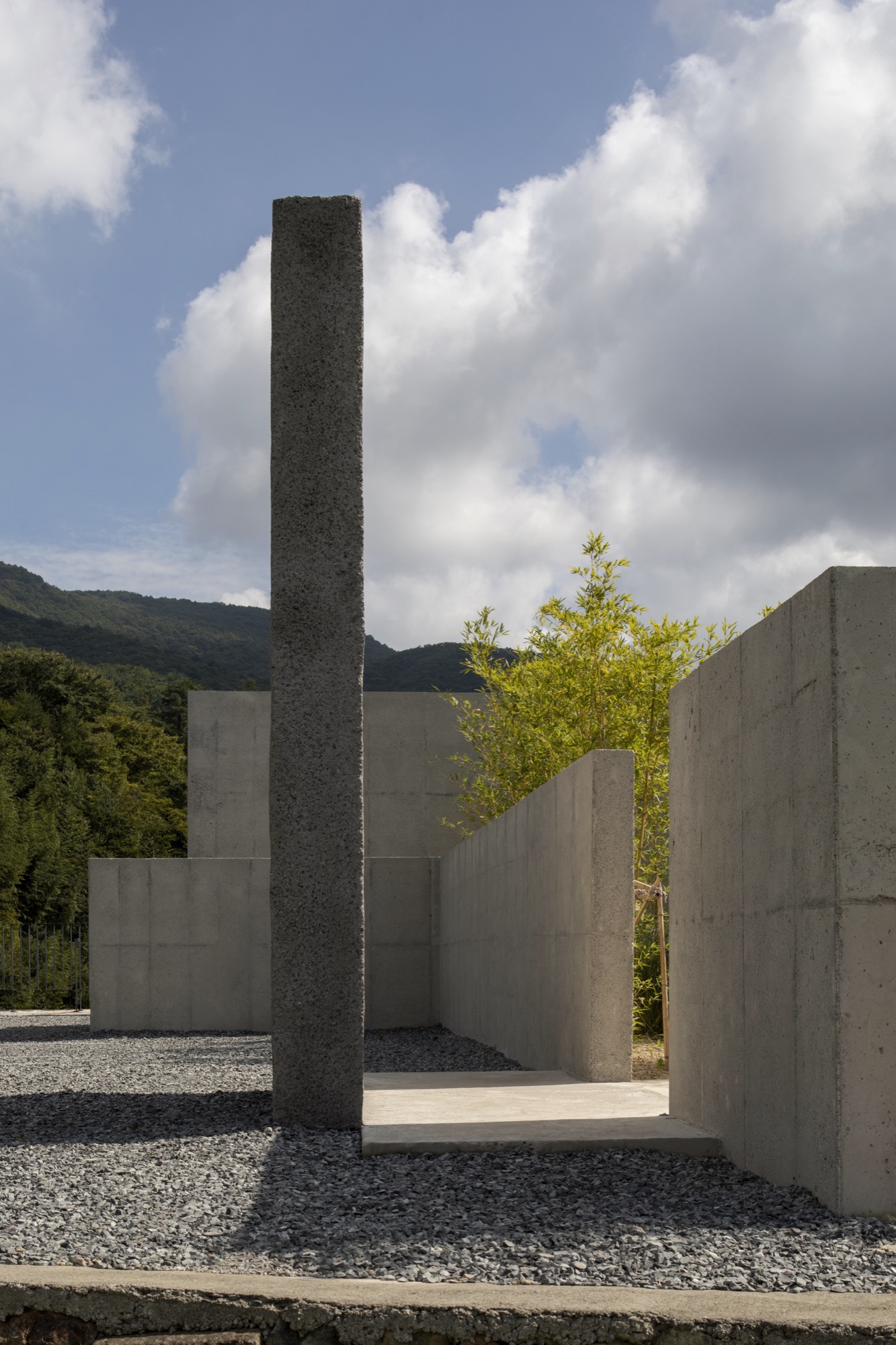 이 장소의 여정은 투박하지만 단단한 물성의 덩어리로 동선을 이끄는 것으로 시작한다. 이는 세상 한복판 고독이라는 자유로움 속에서 그윽한 세계로 들어가기 위한 경계의 문이다. 대나무 숲을 지나는 그늘진 길과 바람 소리, 잔잔한 못에 담긴 해 질 녘 석양과 마주함은 몸과 마음을 이완시키고 자연과 동화됨으로써 밖의 세상과의 간극을 증폭시킨다.