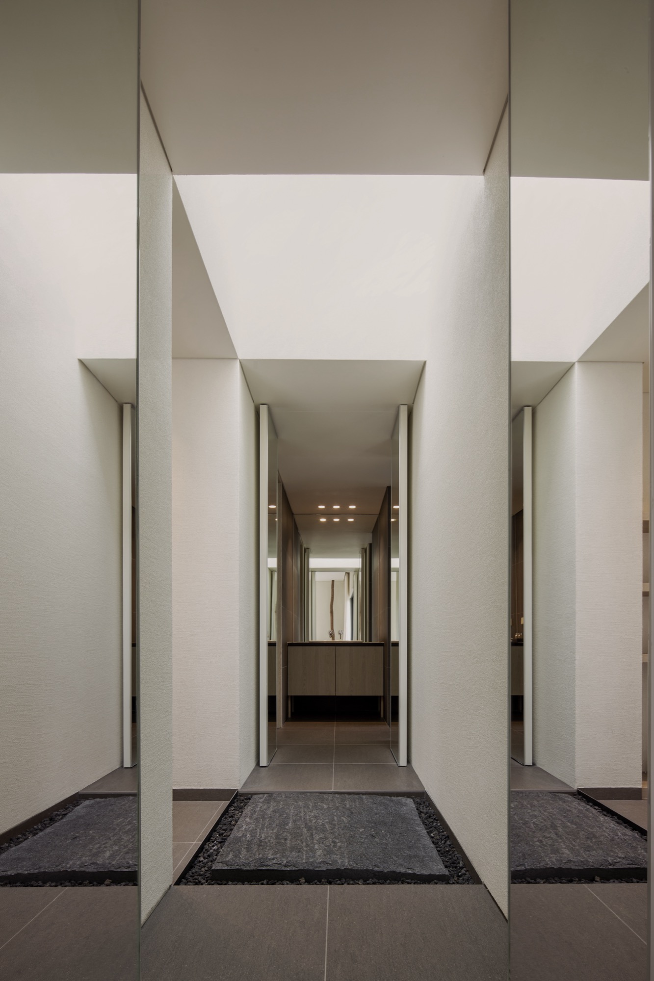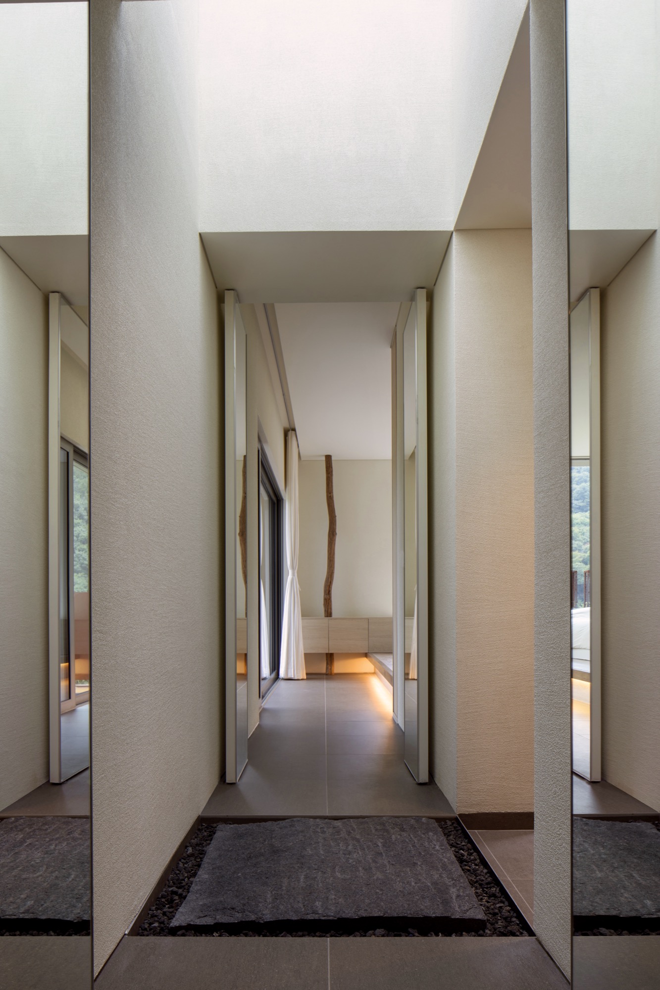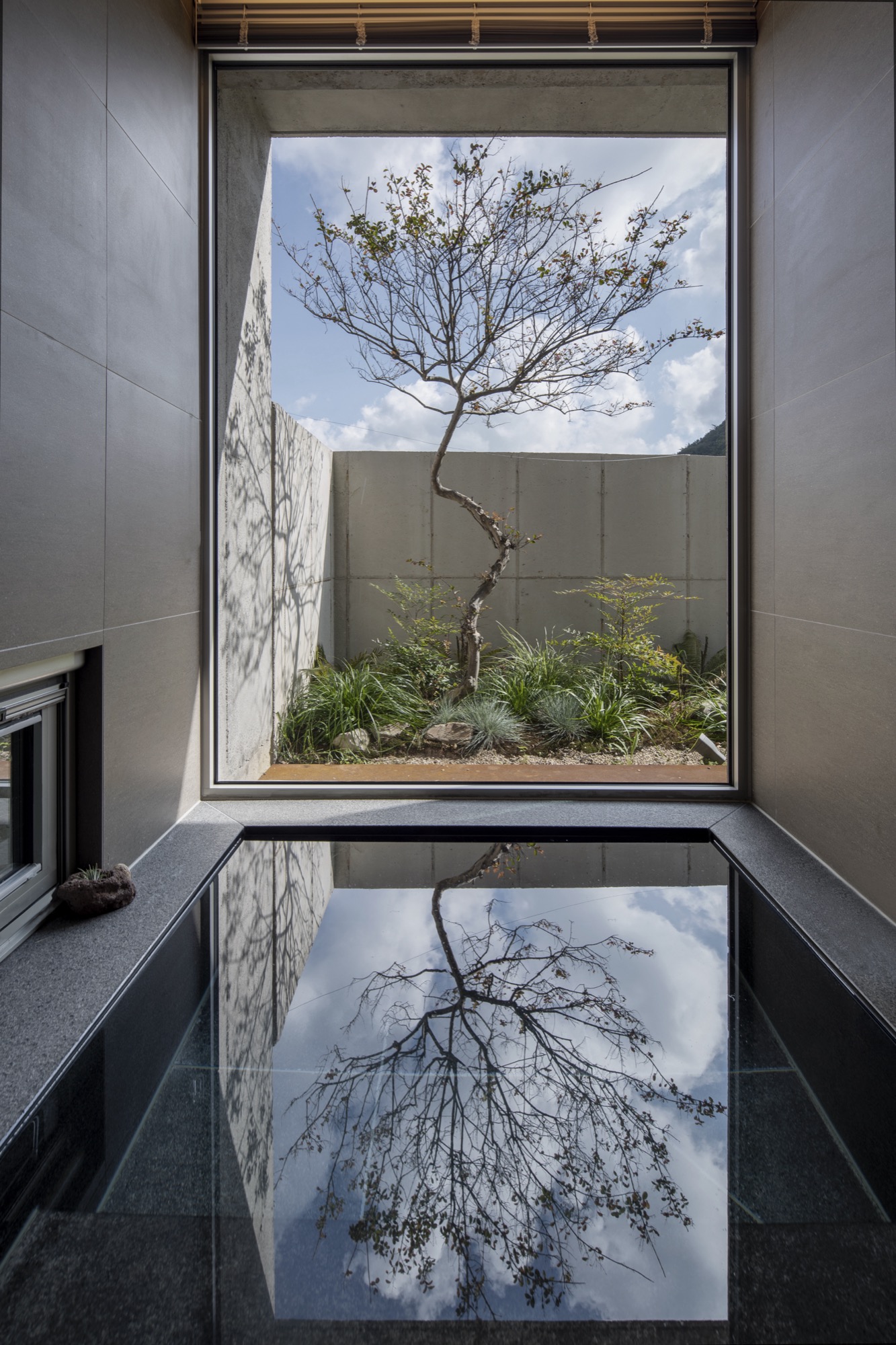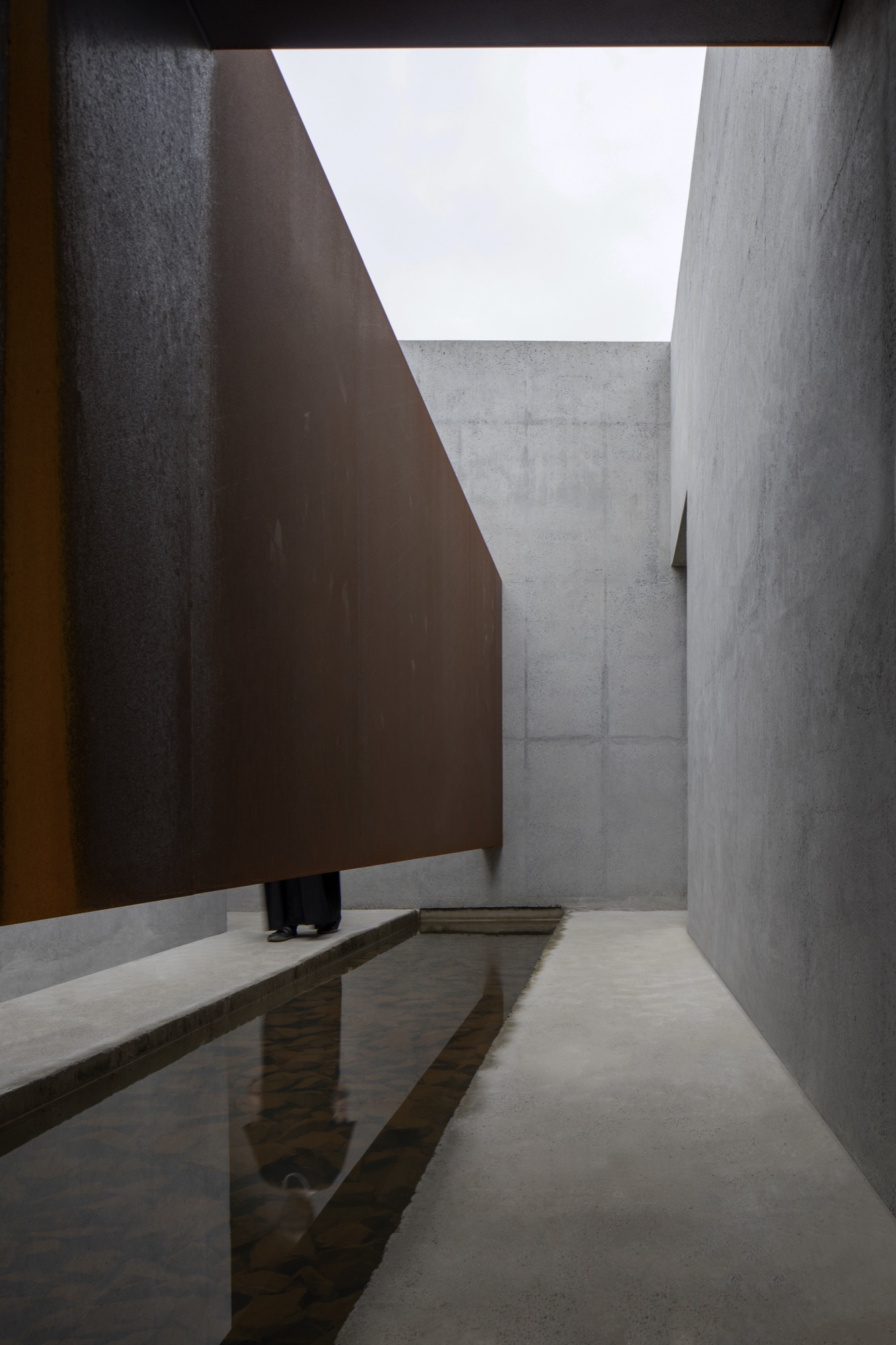 이 장소의 여정은 투박하지만 단단한 물성의 덩어리로 동선을 이끄는 것으로 시작한다. 이는 세상 한복판 고독이라는 자유로움 속에서 그윽한 세계로 들어가기 위한 경계의 문이다. 대나무 숲을 지나는 그늘진 길과 바람 소리, 잔잔한 못에 담긴 해 질 녘 석양과 마주함은 몸과 마음을 이완시키고 자연과 동화됨으로써 밖의 세상과의 간극을 증폭시킨다.