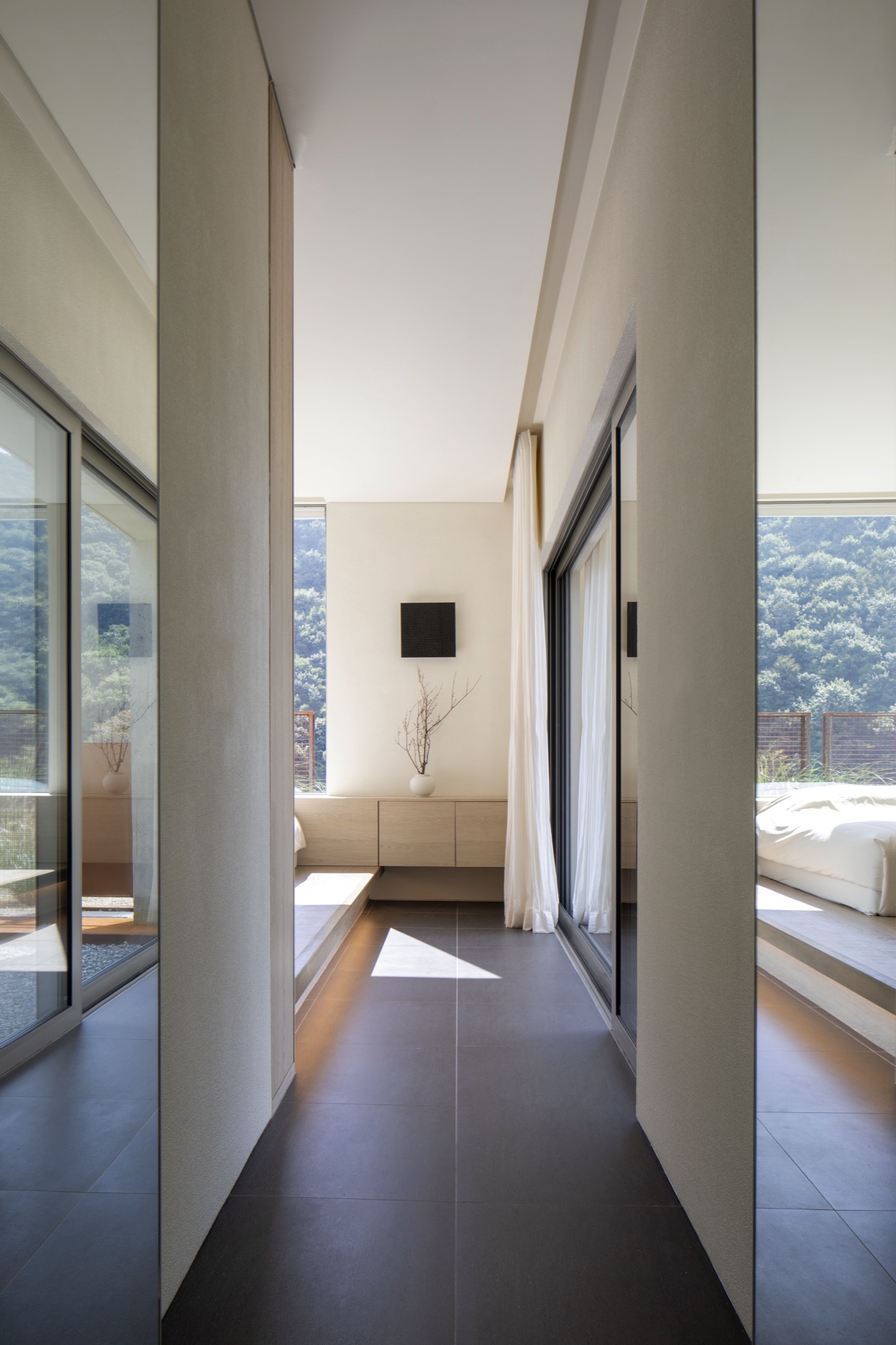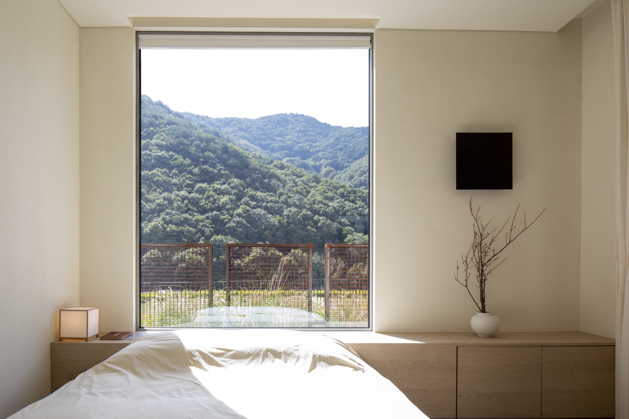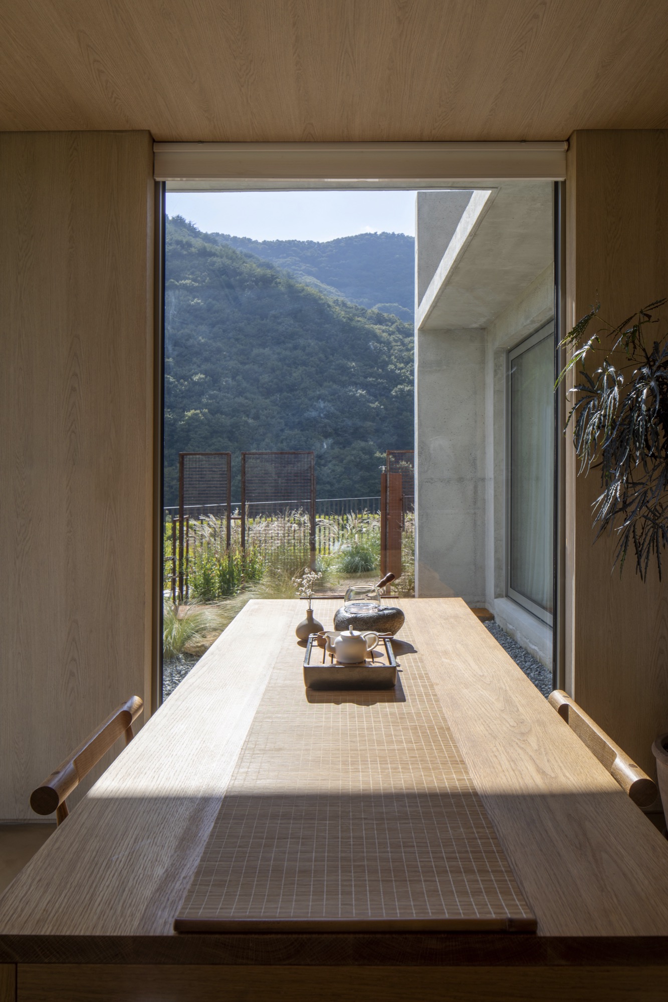 전이의 매개는 존재하나 갑작스러운 변주보다 수묵이 종이에 서서히 번지듯이 대기에 젖어들고, 묵힌 흔적을 서서히 지워냄으로 안식에 집중하기 위함이다. 또한, 공간으로 들어가고 나오는 과정에서 산과 하늘을 향한 열림은 모호한 경계를 만들며 땅이 가진 정취를 겸허히 받아들이되, 적절한 닫힘으로 정적을 깨뜨리지 않는 고요함 속에 오롯이 몰입되는 선미鮮媚를 추구하였다.