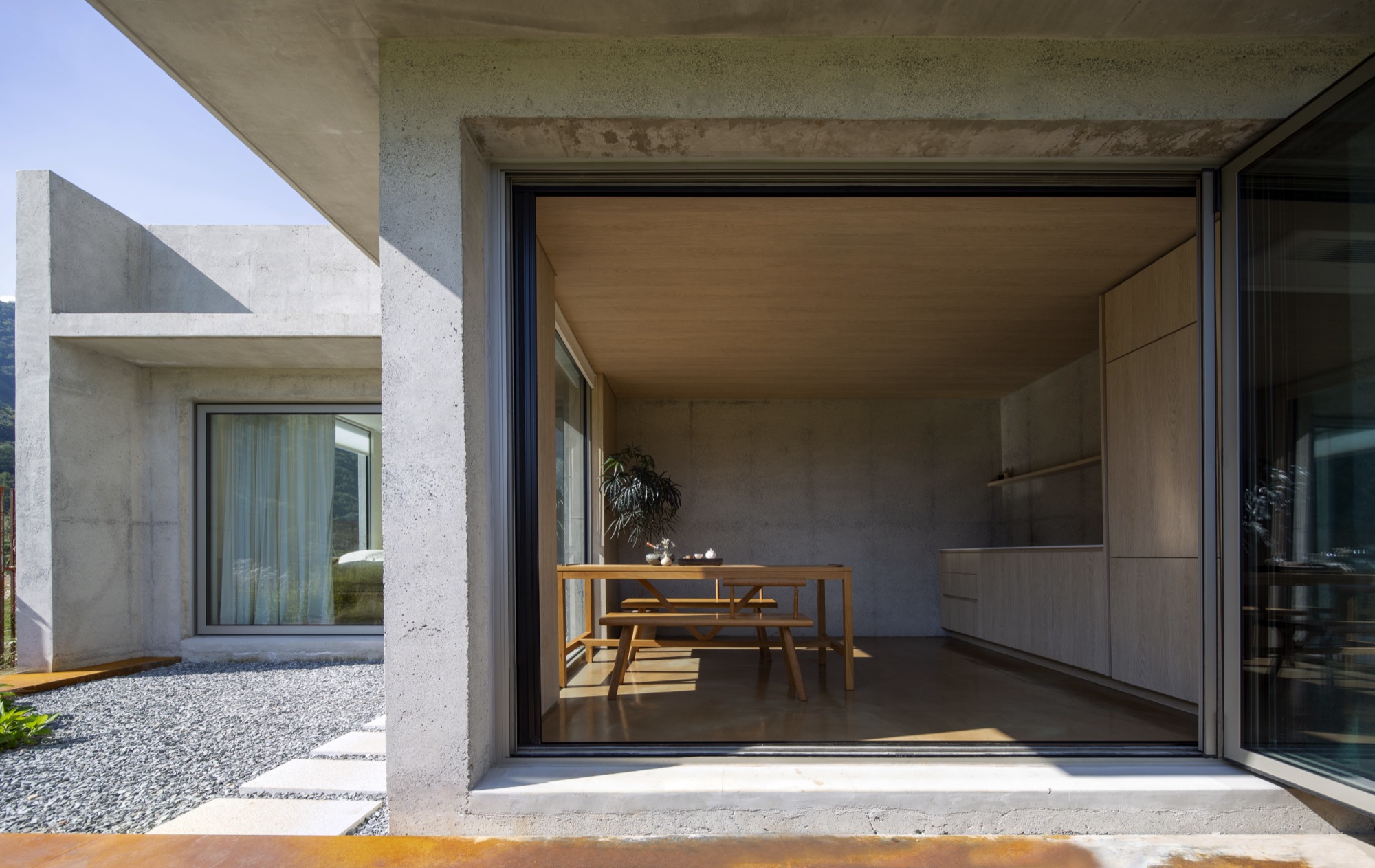 산과 하늘로 둘러싸인 땅, 경주 산내면에 자리한 대지의 첫인상은 자연 그늘에 햇살을 희미하게 머금은 유현幽玄의 아취를 담고 있었다. 우리는 장소를 방문하는 객의 시간, 아침부터 밤중이 아닌 ‘해 질 무렵’부터 아침까지의 시간을 병풍처럼 에워싸인 앞산의 산등성이 너머 황혼으로 맞이하기로 했다.