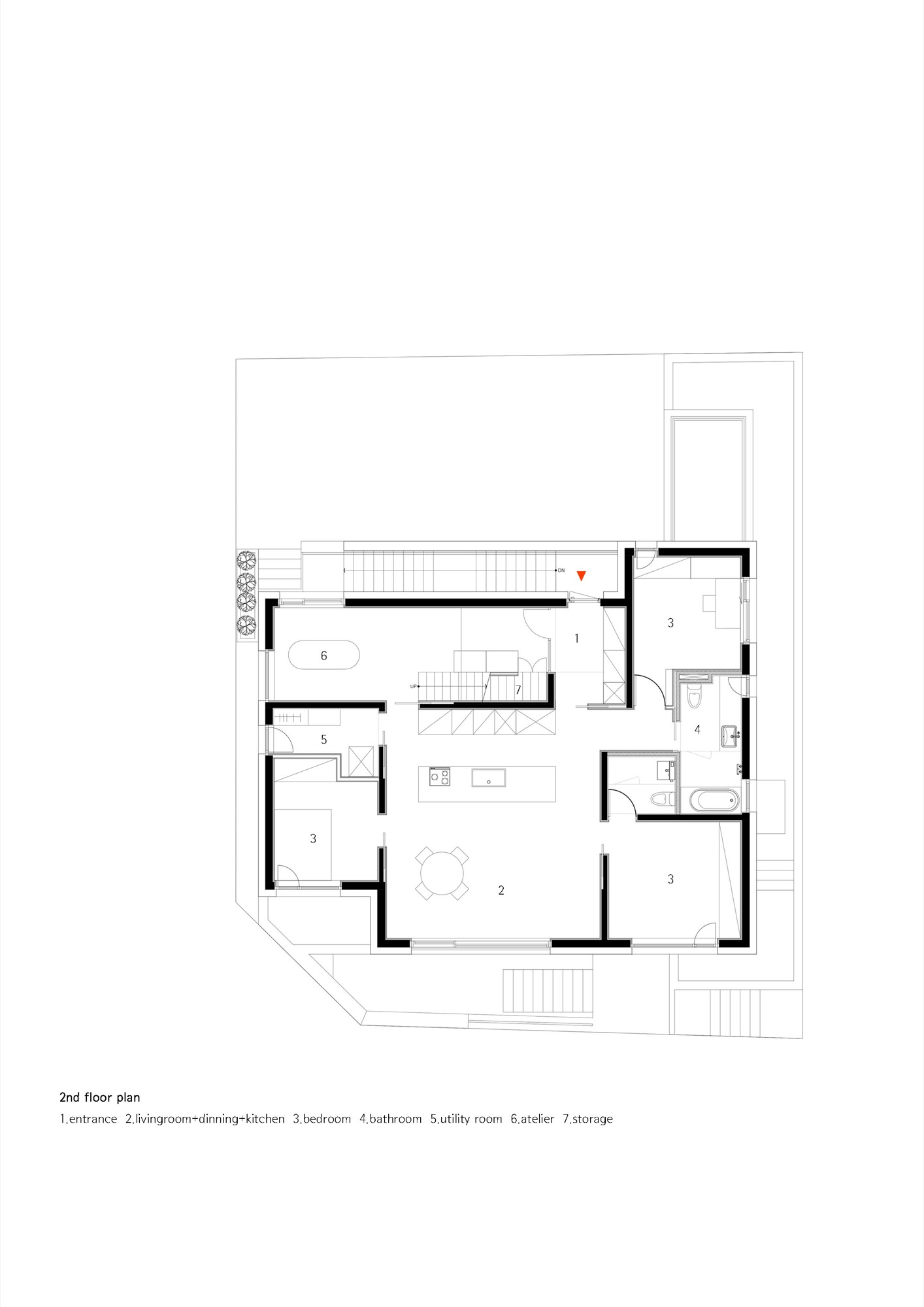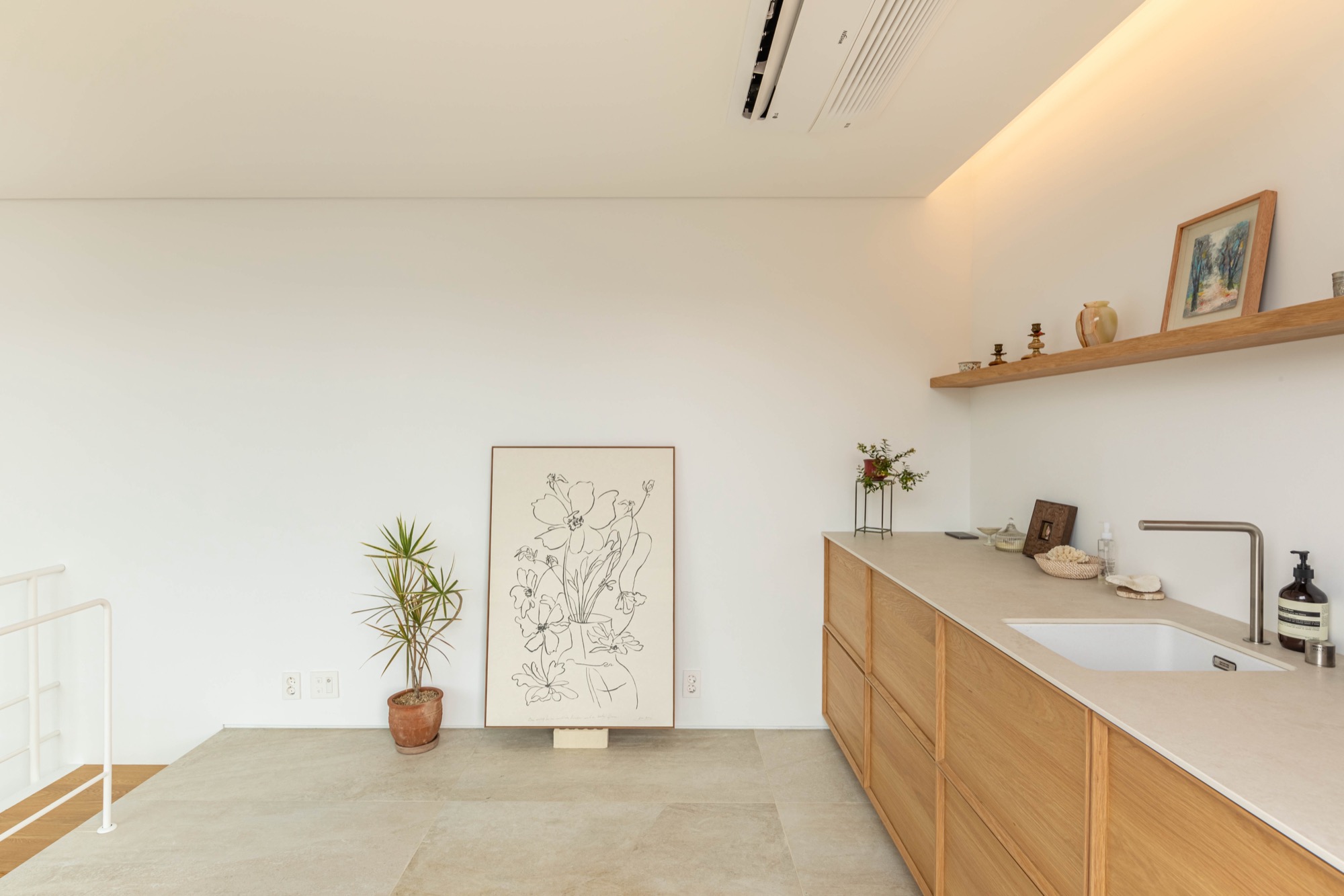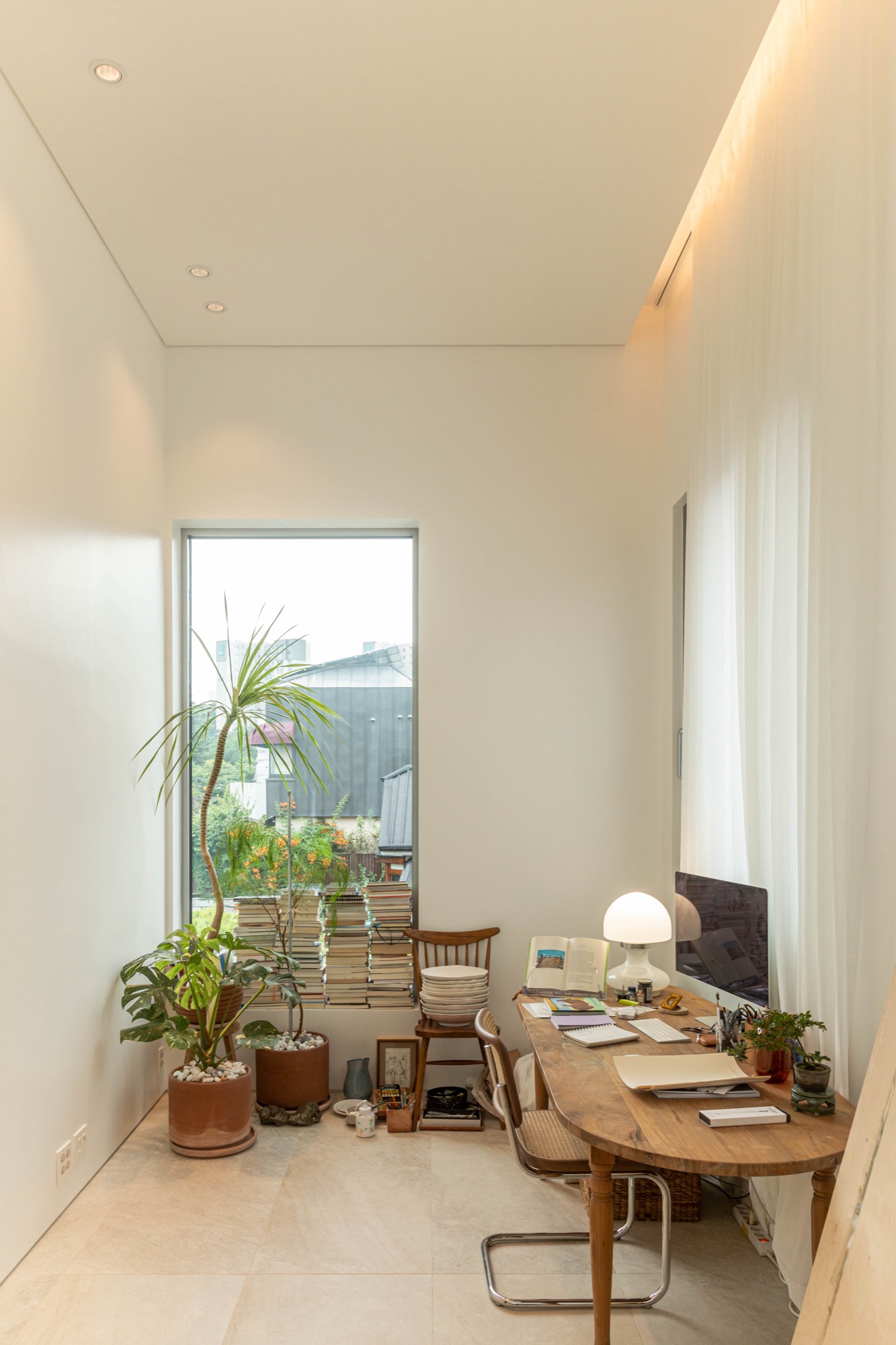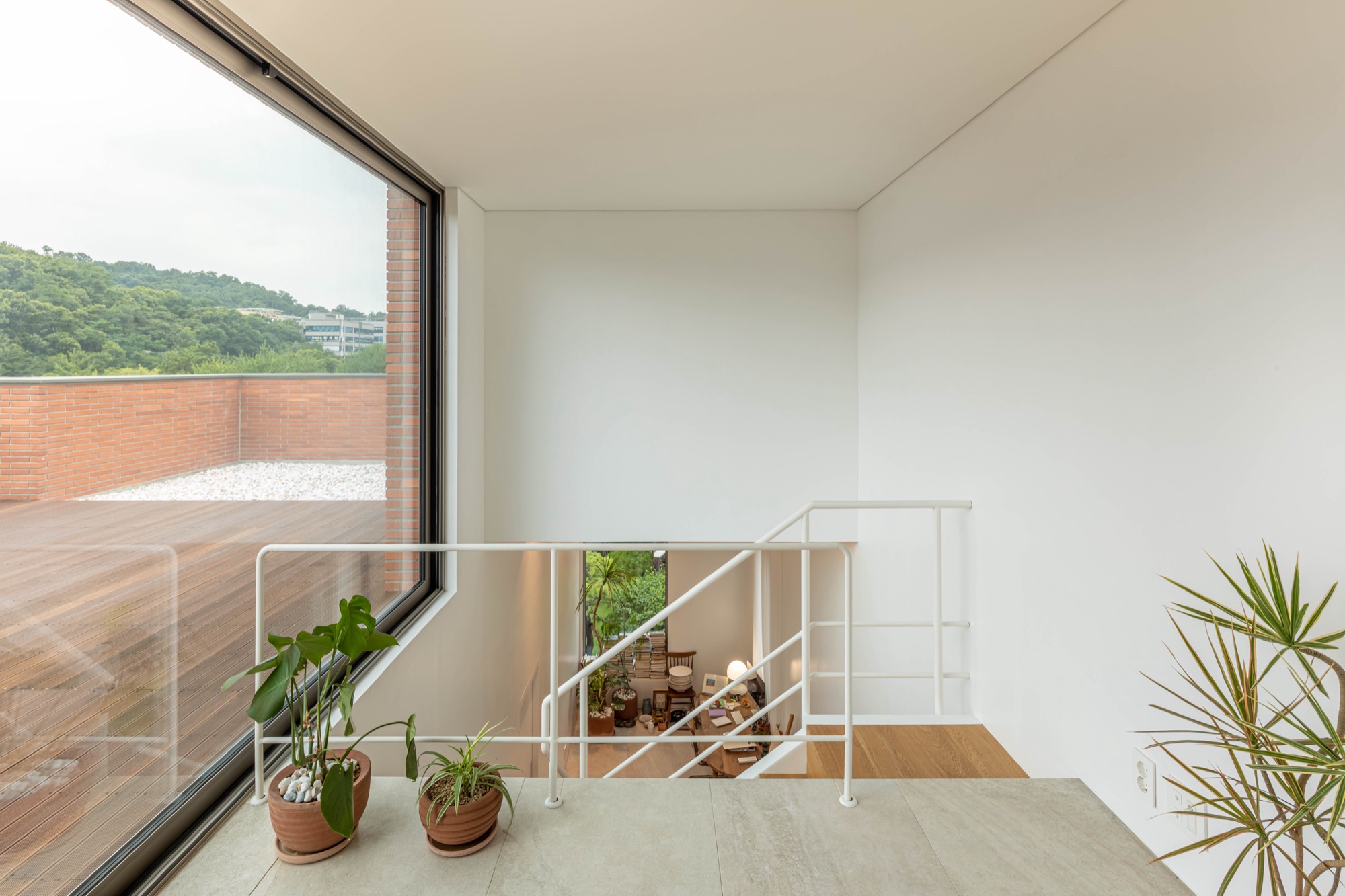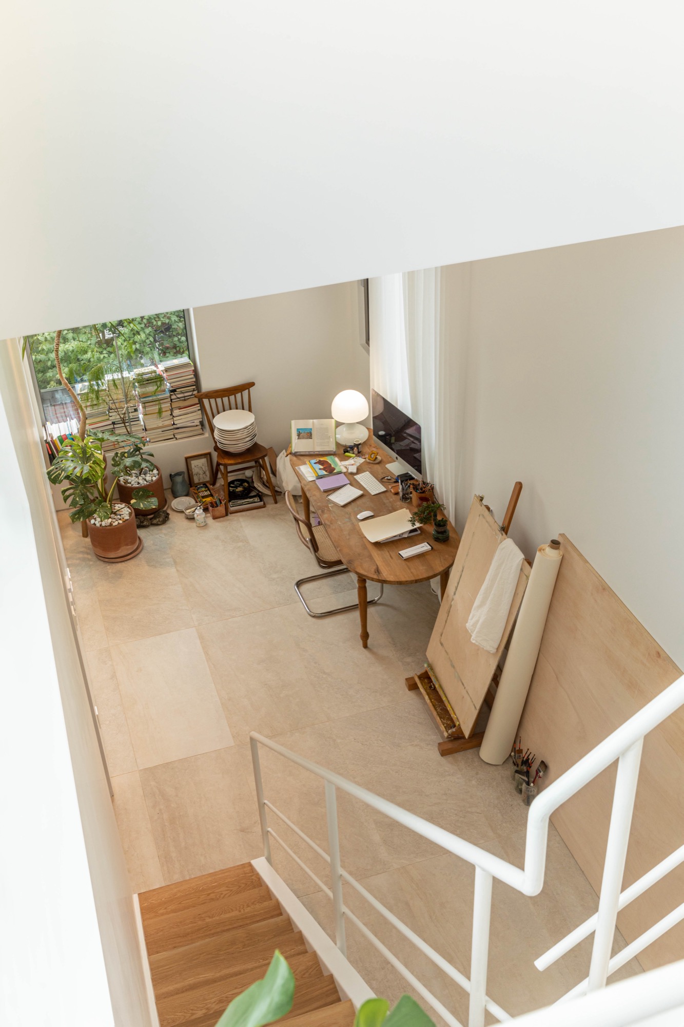건축주는 회화작품 활동을 하며 어린 자녀를 돌보는 젊은 부부다. 기존에 사용하던 임대 작업실을 새집의 내부로 들여오는 것이 중요한 목표였다. 옥탑과 연결된 높은 층고의 작업실은 현관과 연결된 별도의 출입 동선을 두고, 필요에 따라 주택 내부 공간과 연속되면서도 독립된 공간으로 만들었다. 화실을 찾는 외부인은 집을 통하지 않고, 들어갈 수 있기에 가족의 사생활을 보호할 수 있다. 또한, 작업실과 거실을 연결하는 문이 있어, 작품활동과 가사활동을 동시에 해야 하는 건축주에게 합리적인 동선을 만들었다.