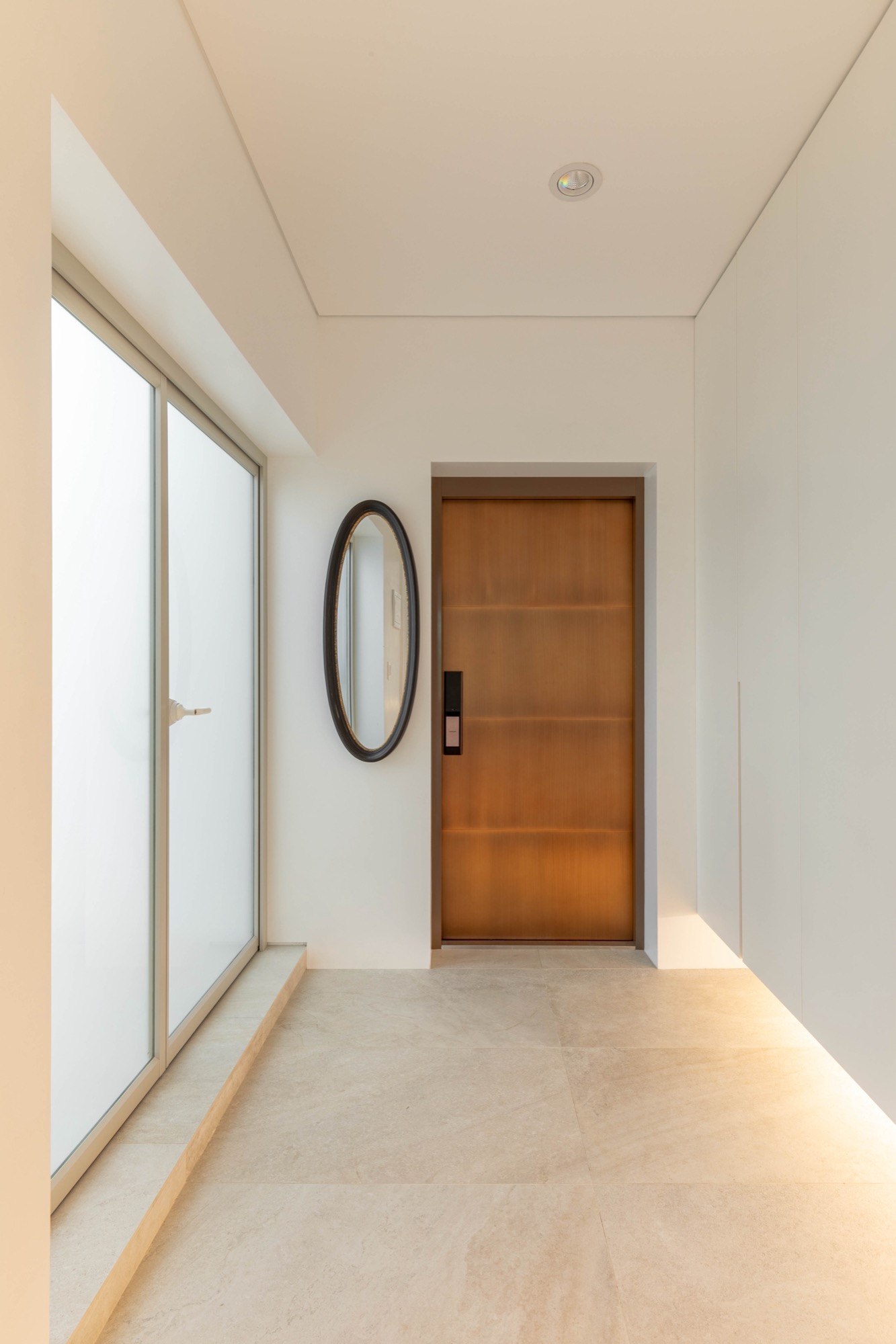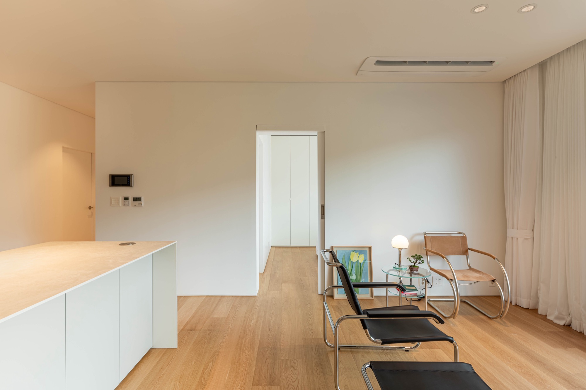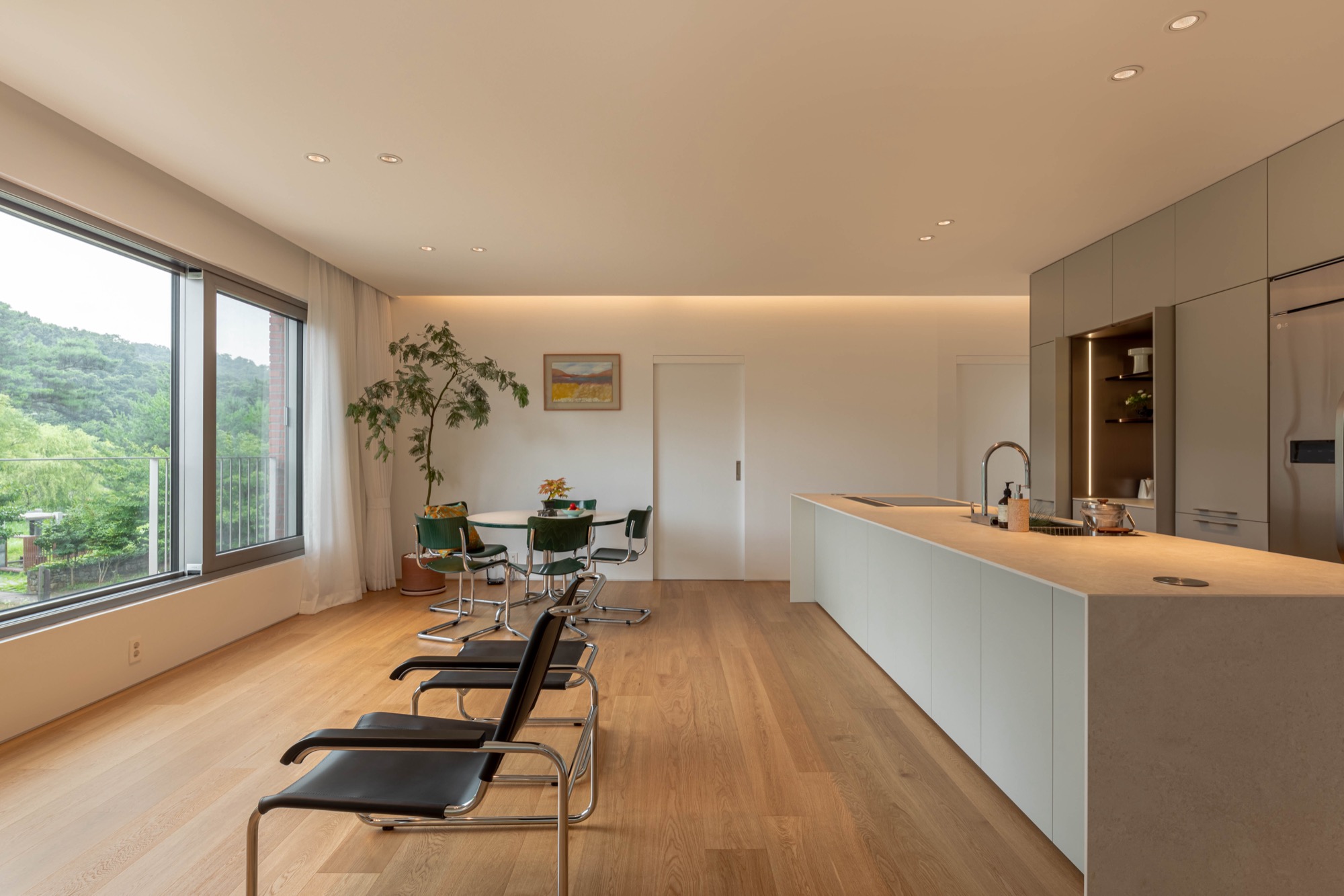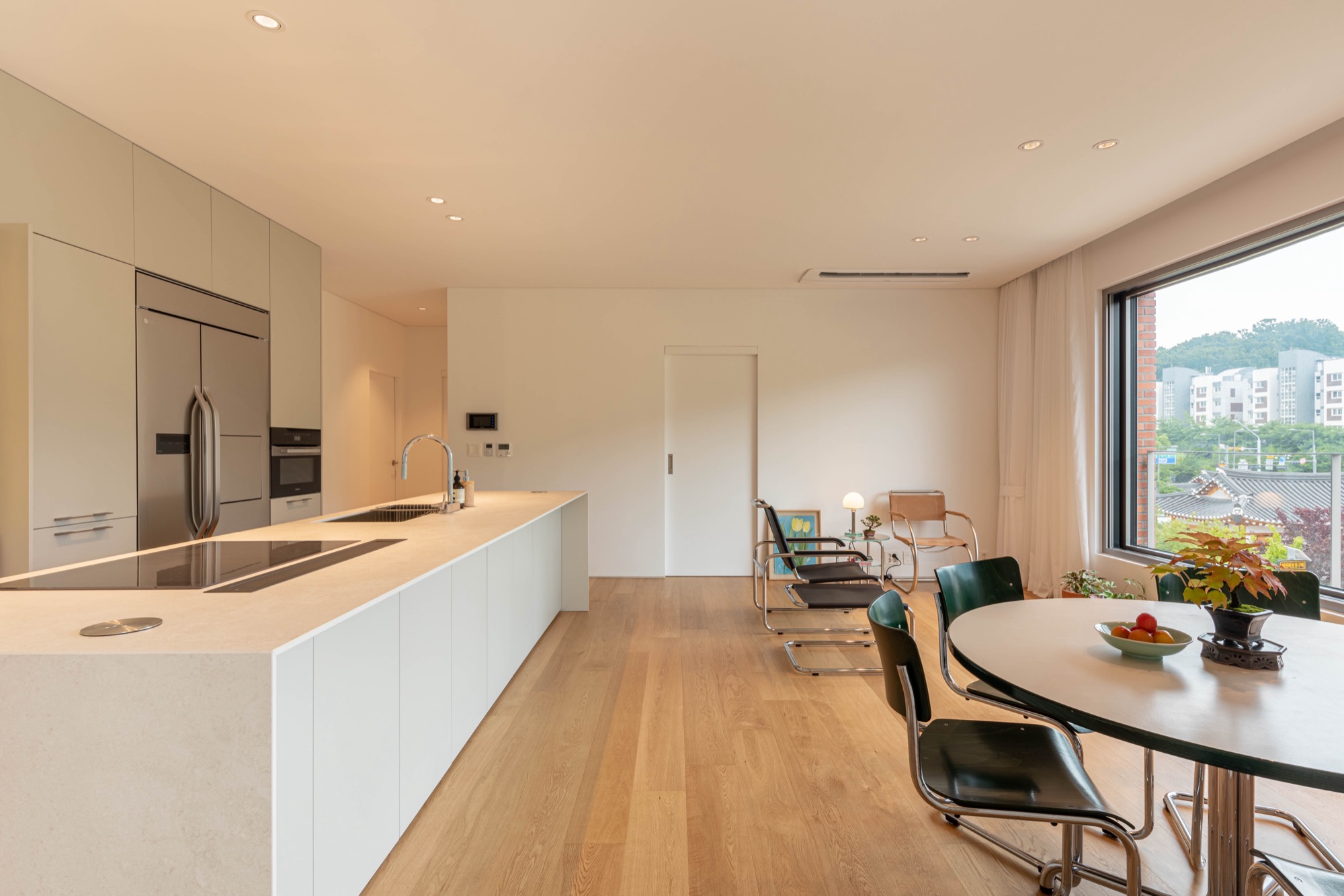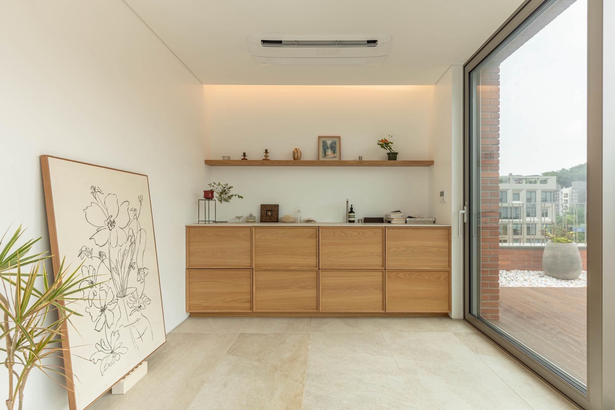 건축주는 회화작품 활동을 하며 어린 자녀를 돌보는 젊은 부부다. 기존에 사용하던 임대 작업실을 새집의 내부로 들여오는 것이 중요한 목표였다. 옥탑과 연결된 높은 층고의 작업실은 현관과 연결된 별도의 출입 동선을 두고, 필요에 따라 주택 내부 공간과 연속되면서도 독립된 공간으로 만들었다. 화실을 찾는 외부인은 집을 통하지 않고, 들어갈 수 있기에 가족의 사생활을 보호할 수 있다. 또한, 작업실과 거실을 연결하는 문이 있어, 작품활동과 가사활동을 동시에 해야 하는 건축주에게 합리적인 동선을 만들었다.