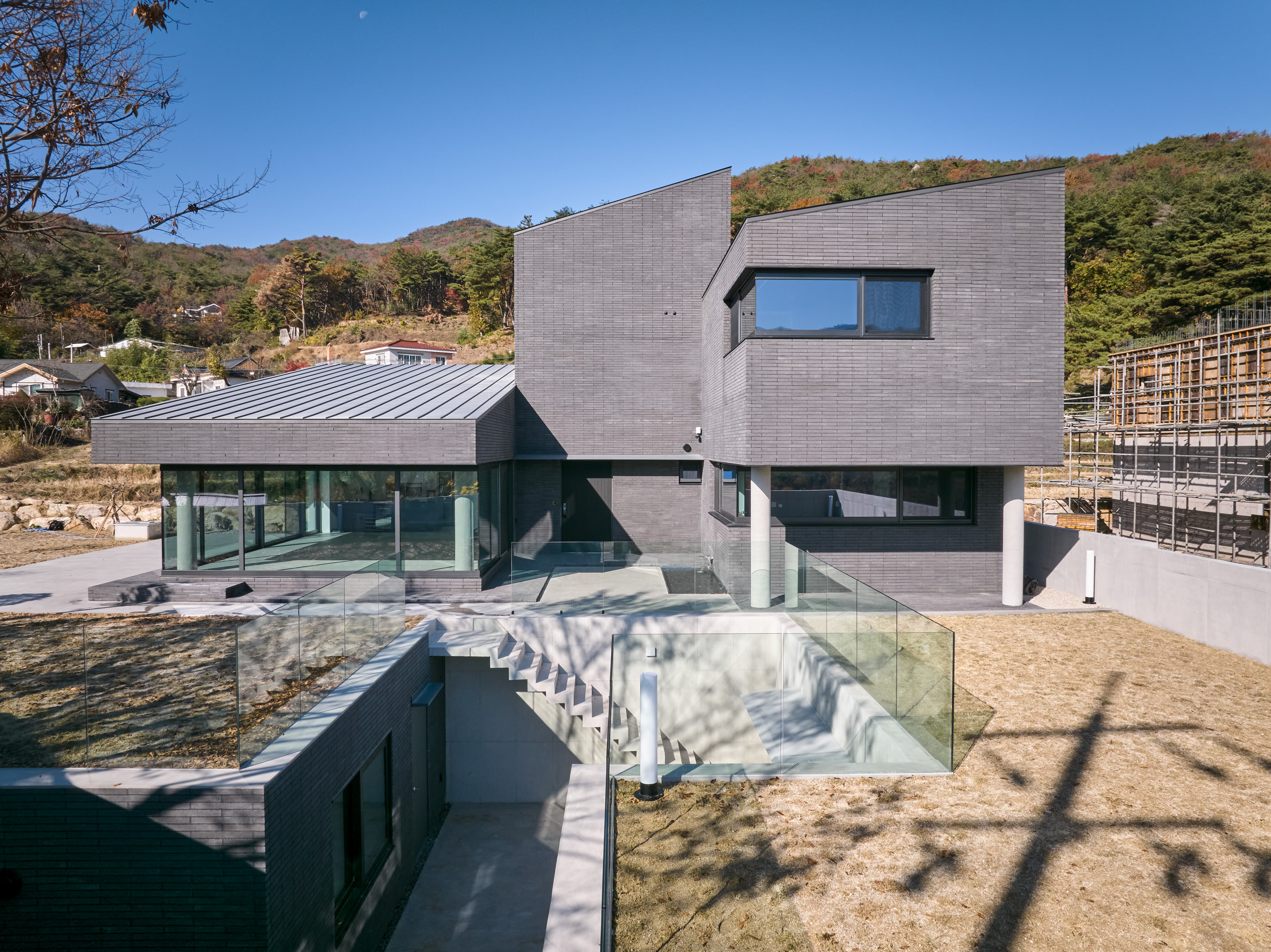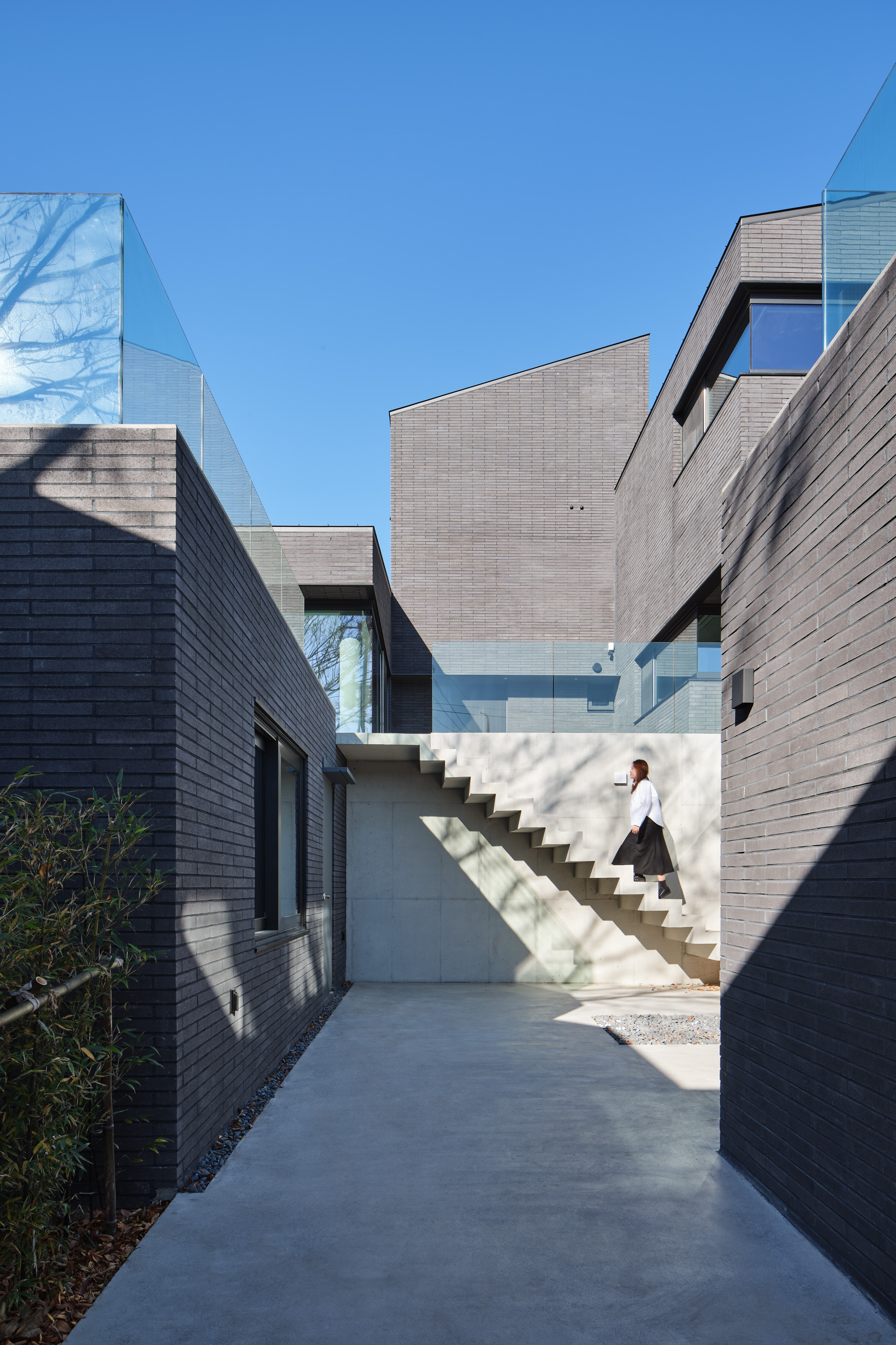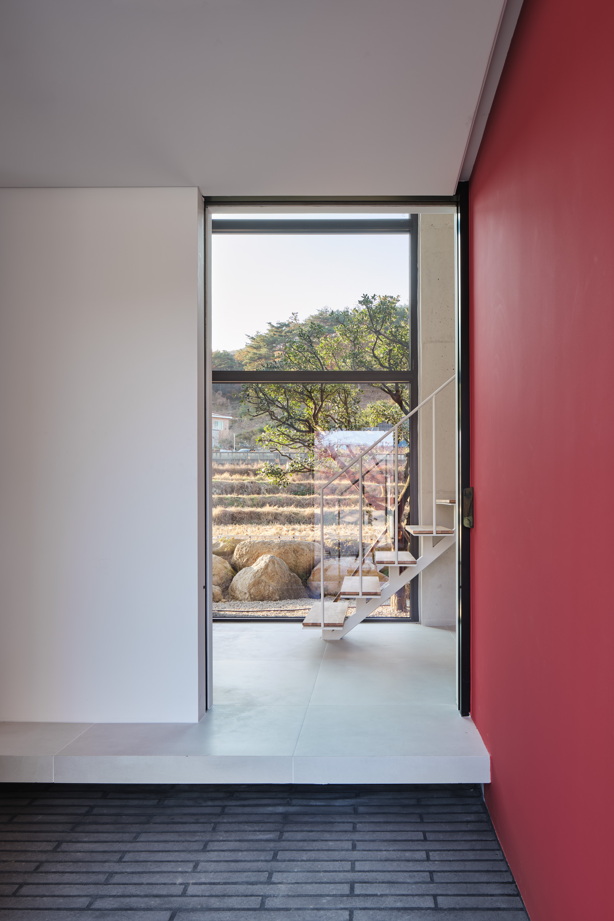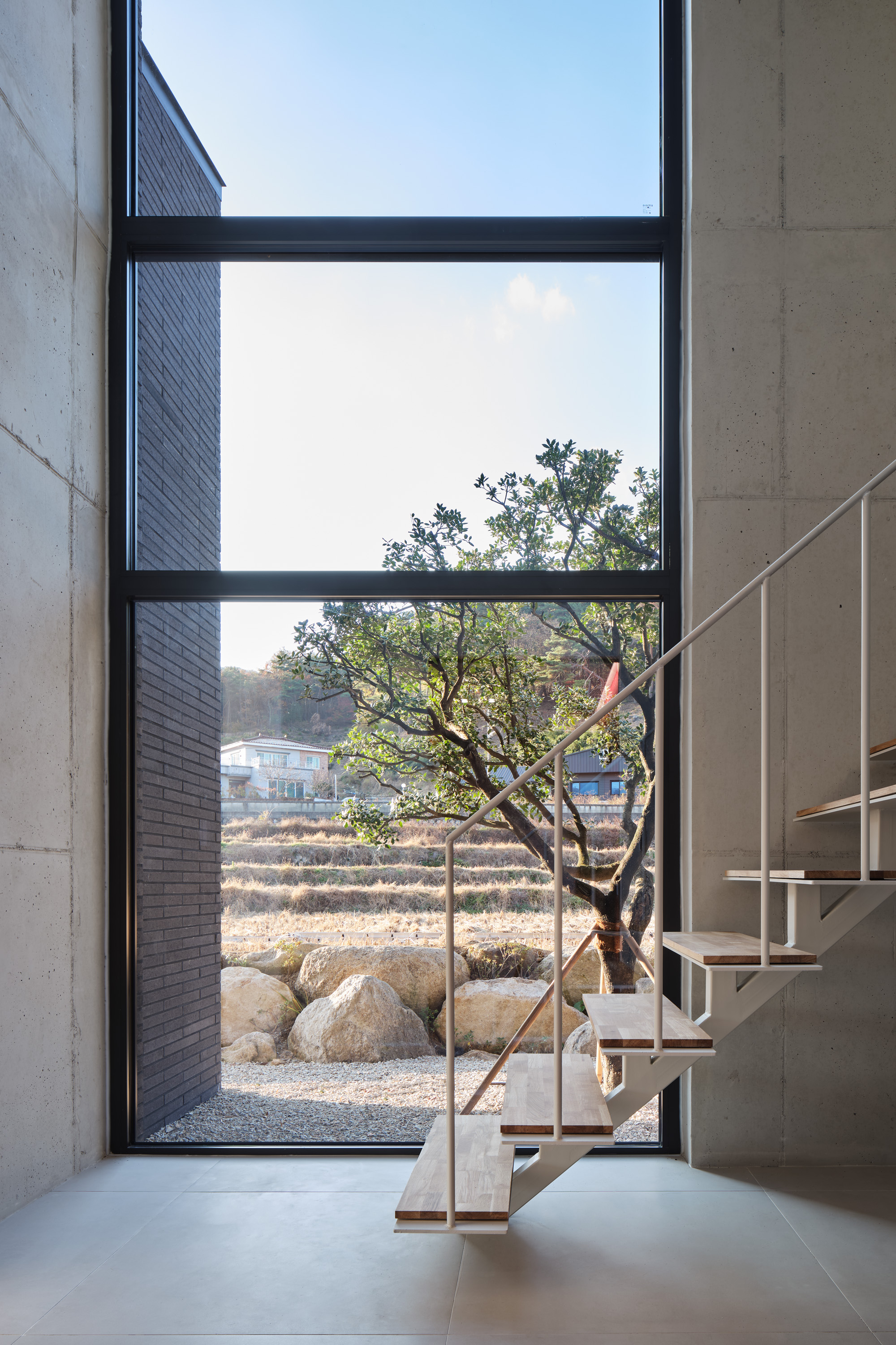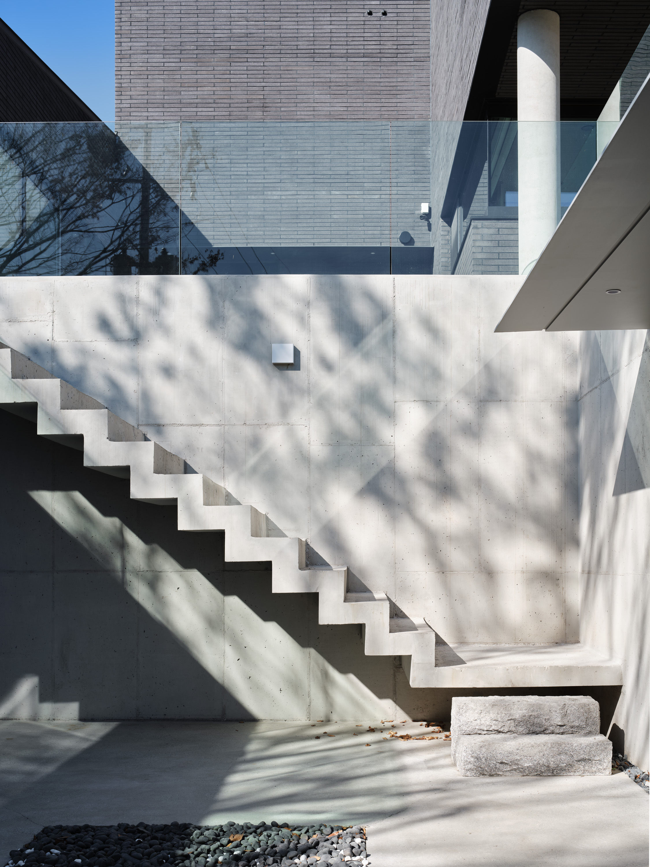 상부의 건물은 총 3개의 덩어리로 나누어 주변과 조화를 이루도록 했다. 거실, 다이닝, 주방의 한 덩어리와 프라이빗 한 방들이 있는 볼륨, 그리고 둘을 이어주는 계단실 볼륨이다.