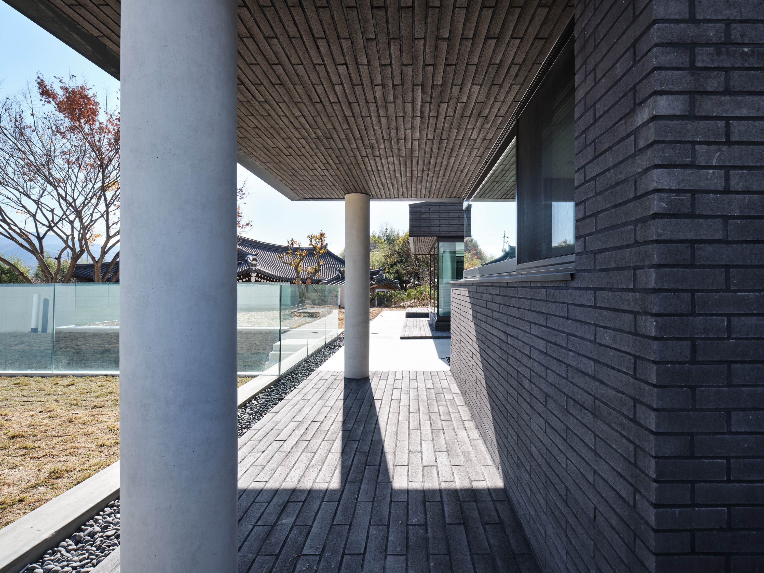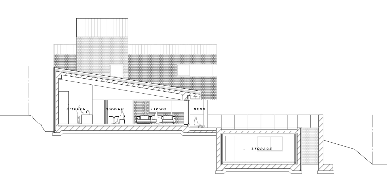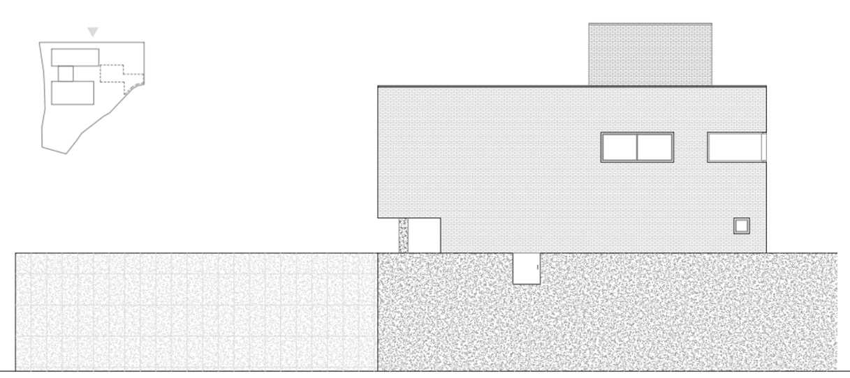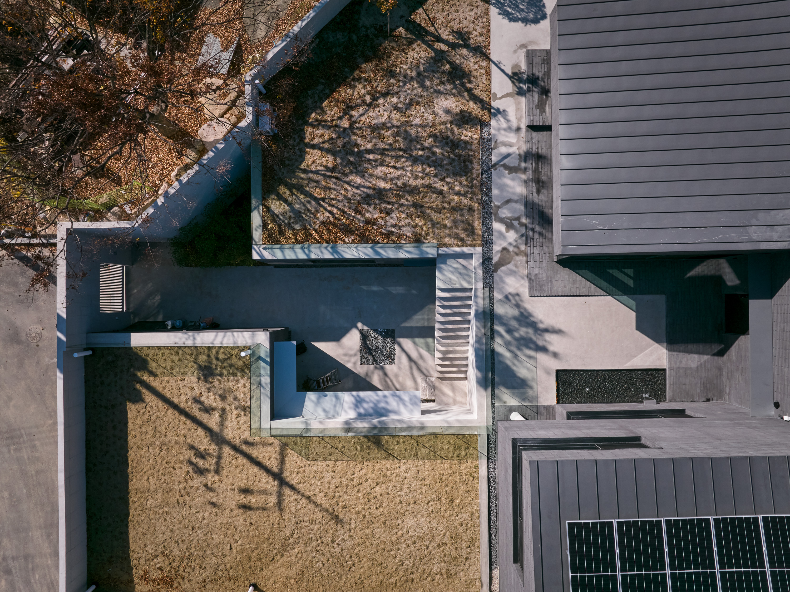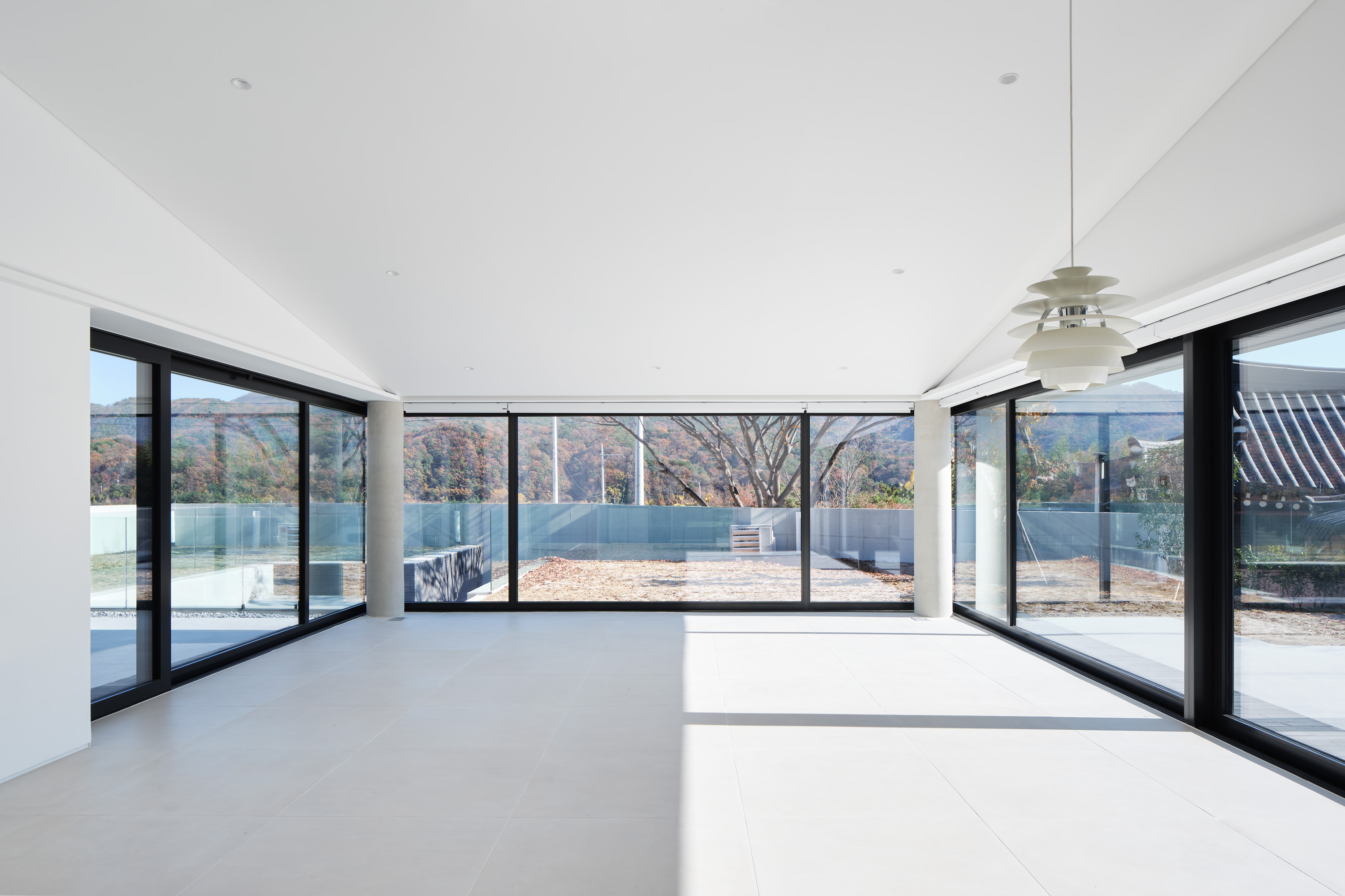 상부의 건물은 총 3개의 덩어리로 나누어 주변과 조화를 이루도록 했다. 거실, 다이닝, 주방의 한 덩어리와 프라이빗 한 방들이 있는 볼륨, 그리고 둘을 이어주는 계단실 볼륨이다.