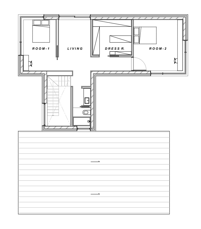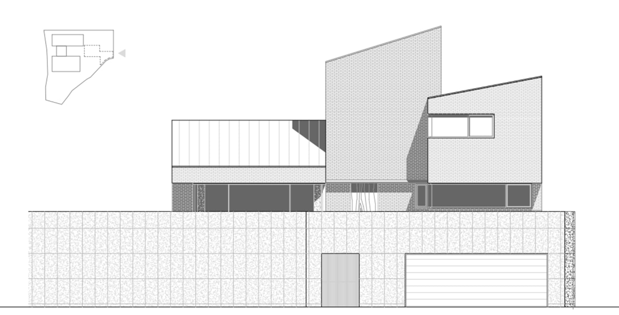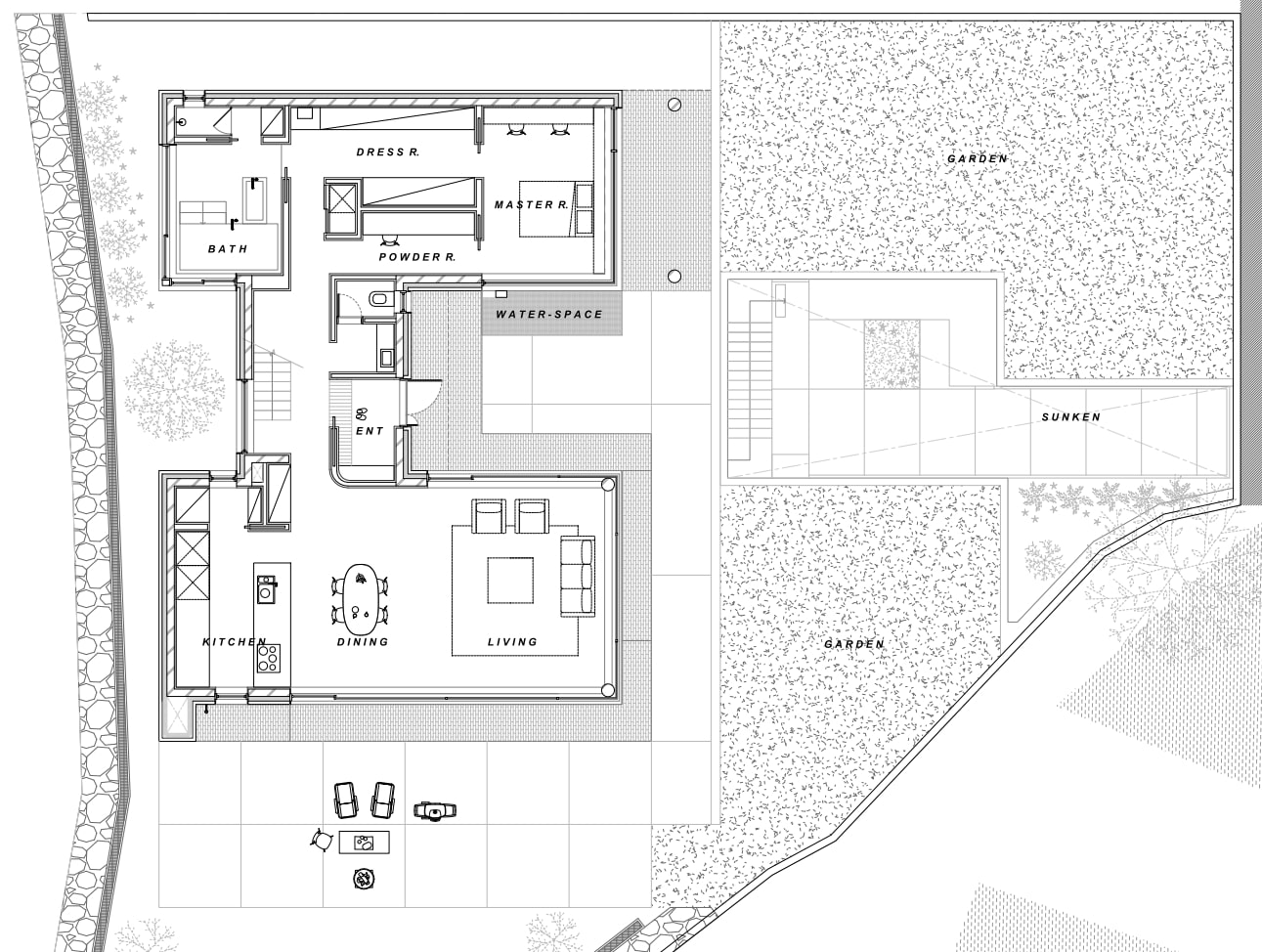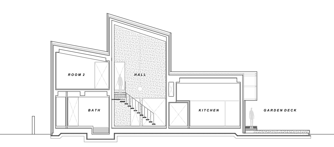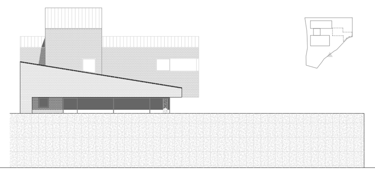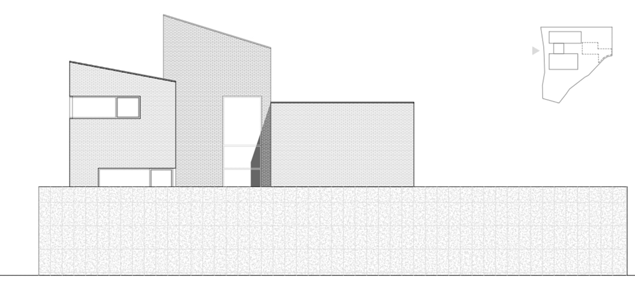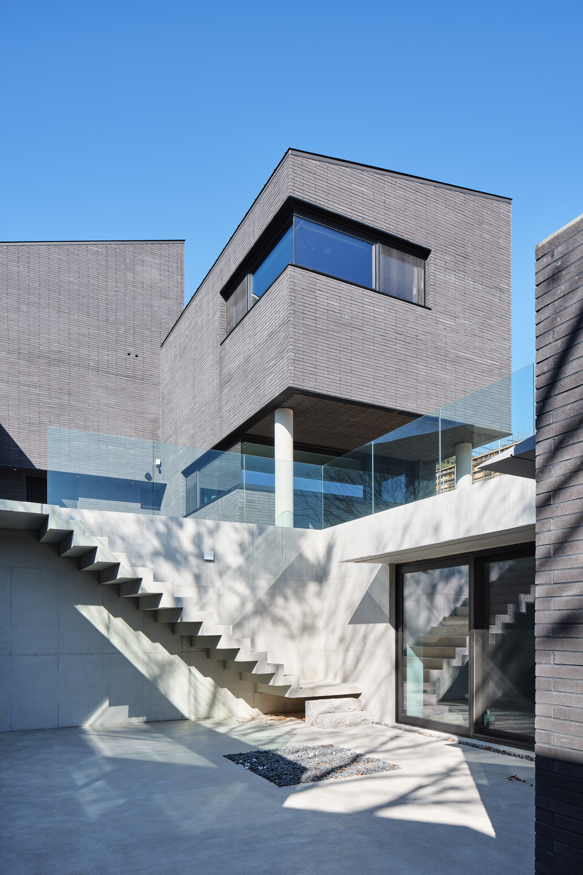 상부의 건물은 총 3개의 덩어리로 나누어 주변과 조화를 이루도록 했다. 거실, 다이닝, 주방의 한 덩어리와 프라이빗 한 방들이 있는 볼륨, 그리고 둘을 이어주는 계단실 볼륨이다.