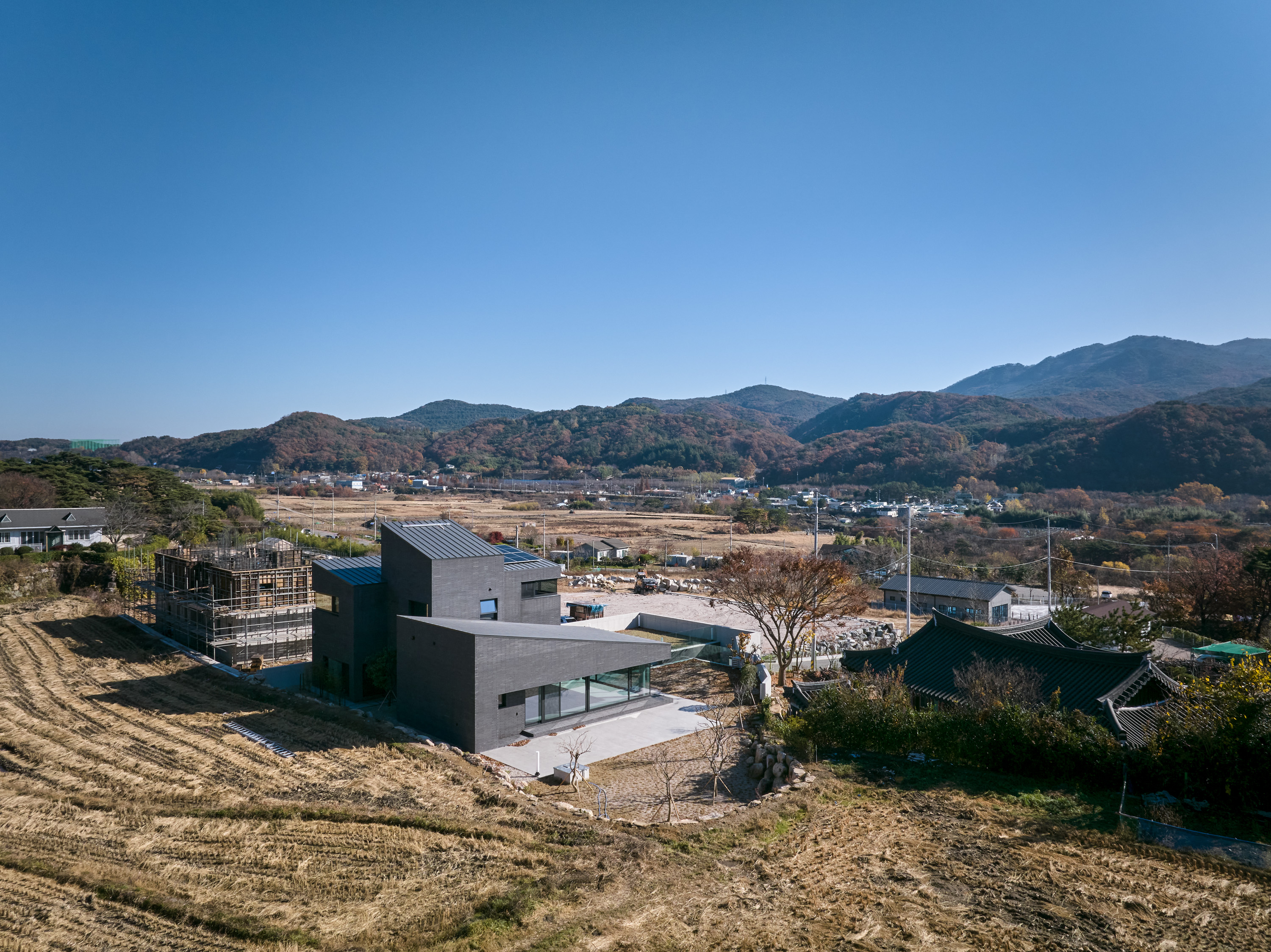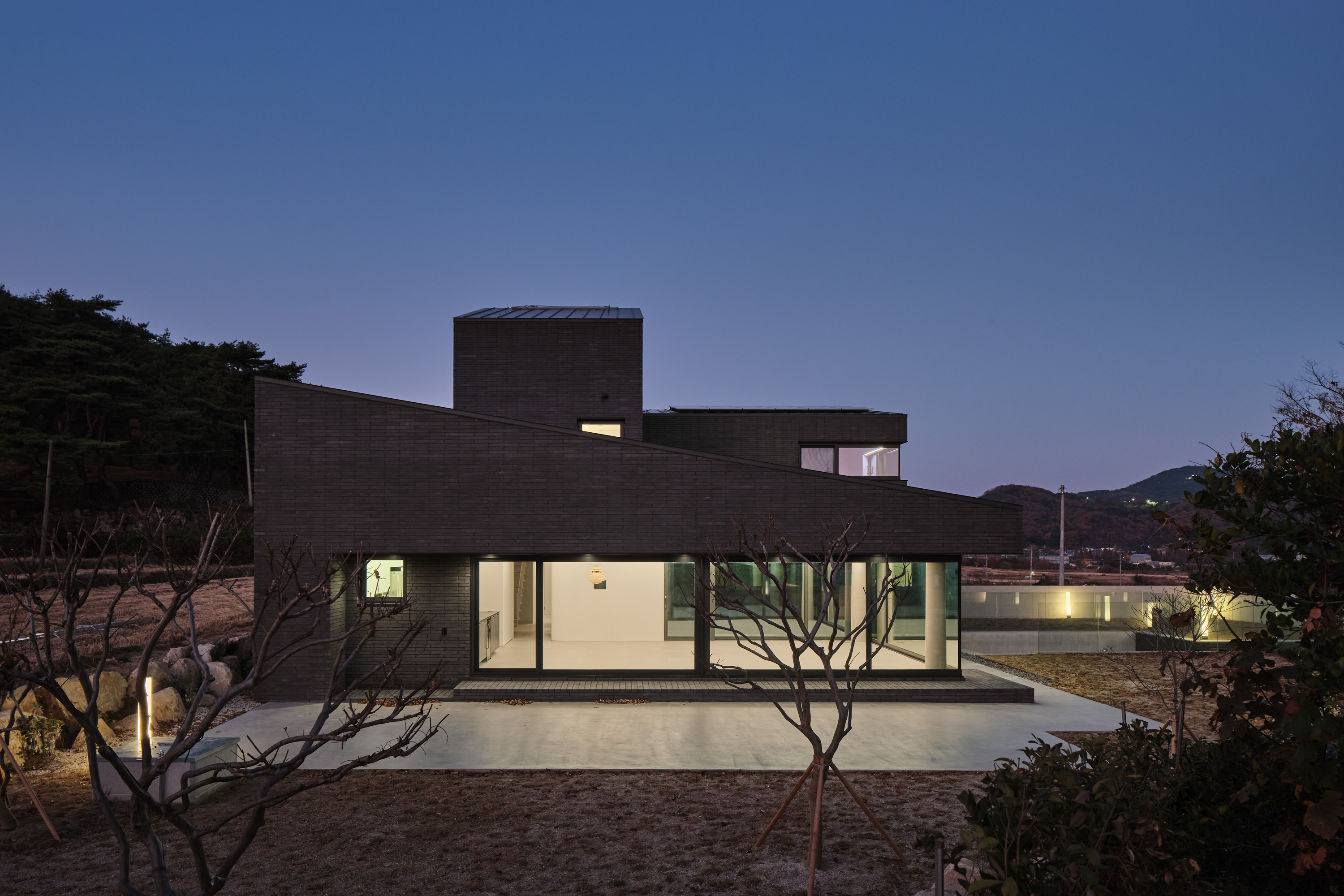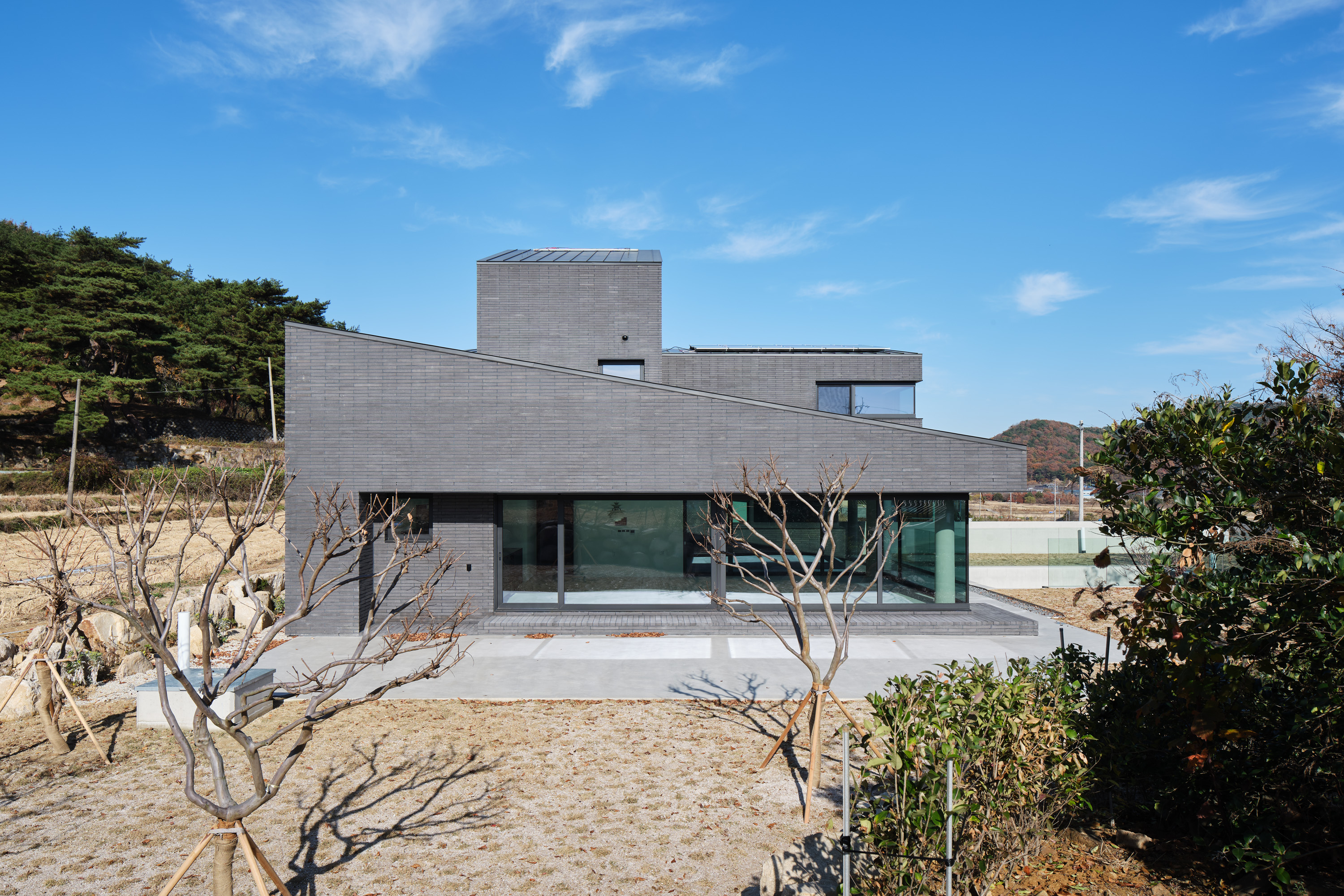 대지는 양산의 통도사 근처 산수가 수려한 곳에 위치한다. 진입로에서 보는 대지의 정면, 대지에서 보는 풍경 모두 산으로 둘러싸여 있다. 우리는 이 주택이 같은 것 하나 없는 산자락 능선처럼, 혹은 산자락에 파묻혀있는 바위와 같은 모습이면 좋겠다고 생각했다. 또한, 영축산을 배경으로 전면 정족산까지 수려한 산세에 둘러싸인 부지에서 주변 조망을 최대한 끌어들여 휴식이 있는 집이 되고자 했다.