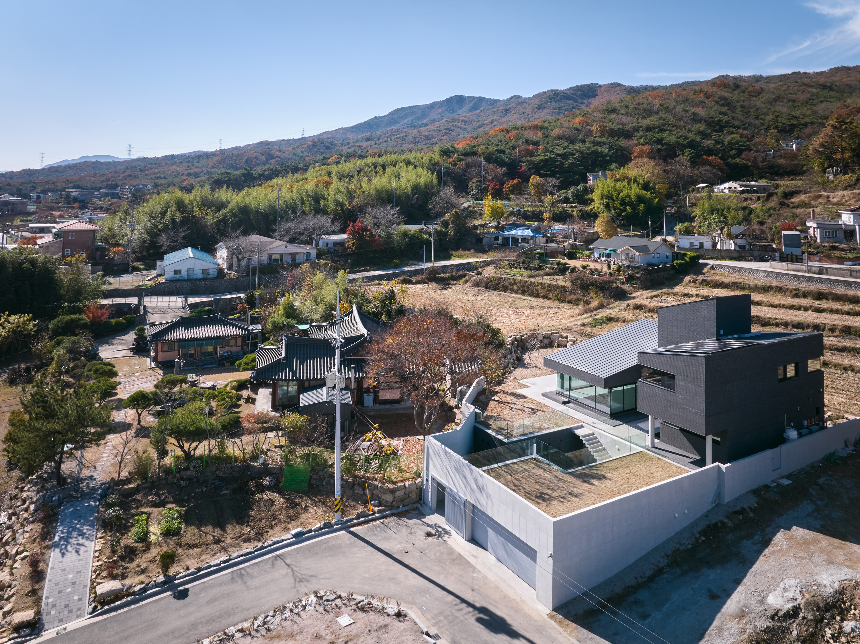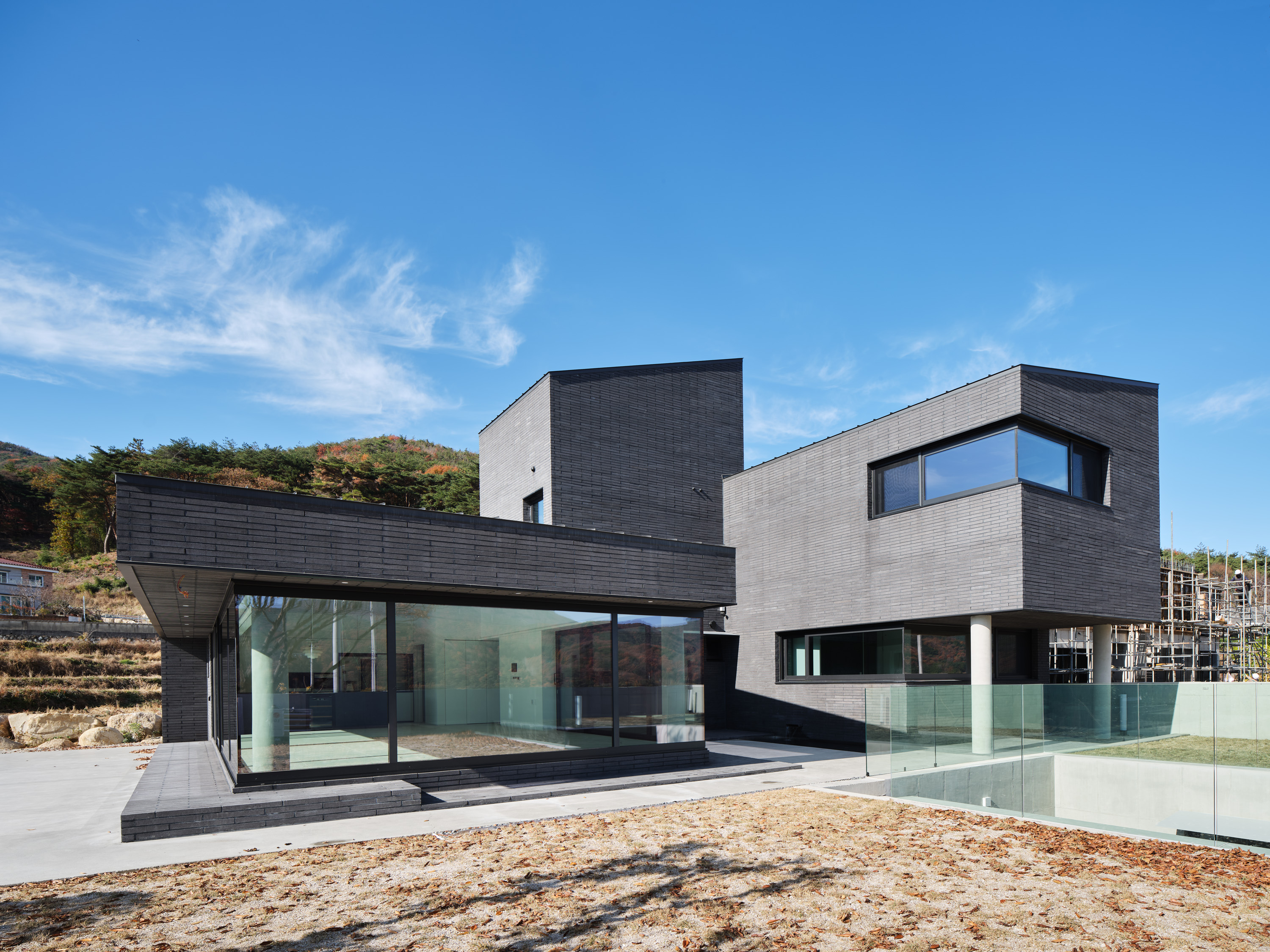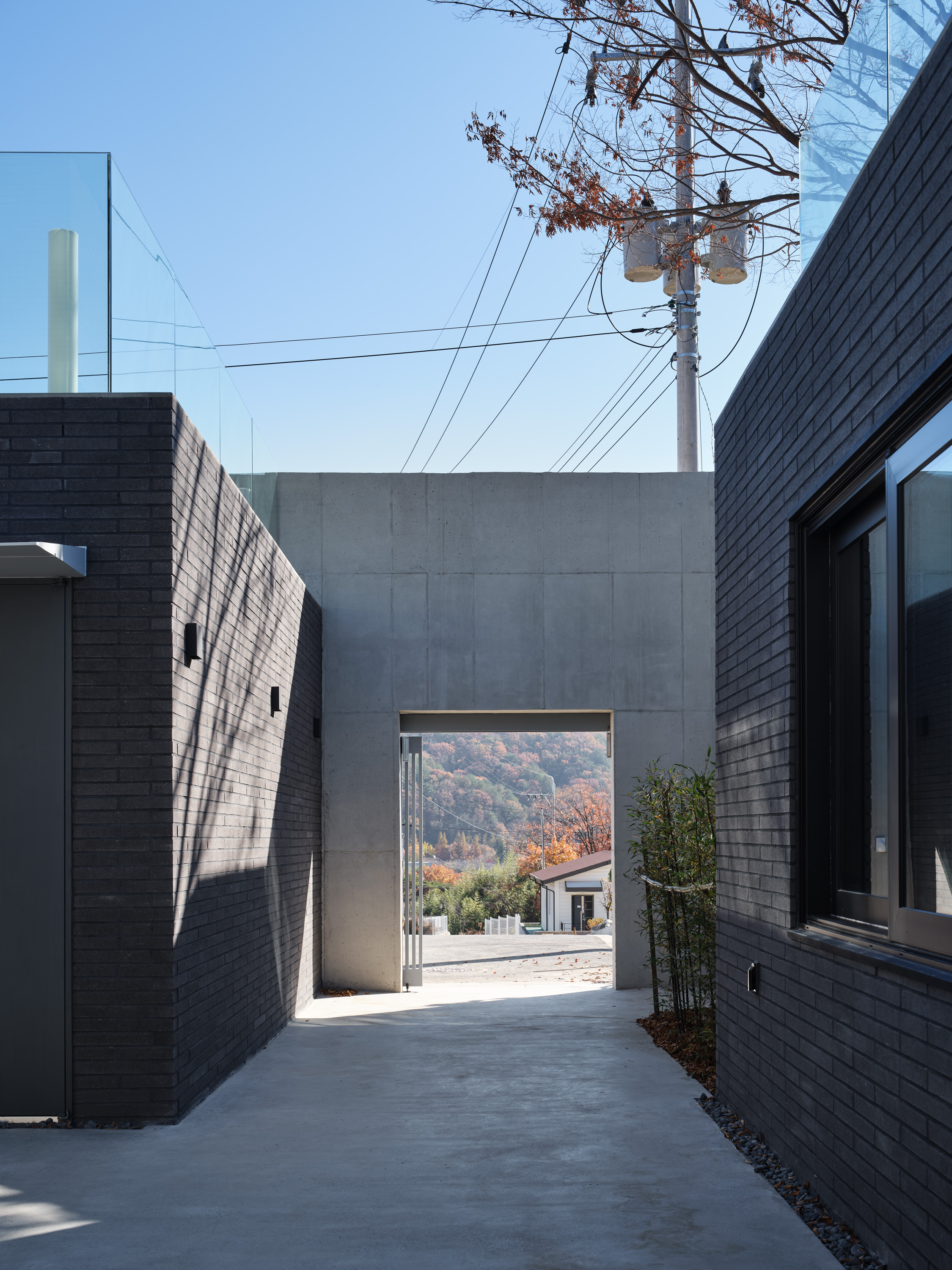 대지는 양산의 통도사 근처 산수가 수려한 곳에 위치한다. 진입로에서 보는 대지의 정면, 대지에서 보는 풍경 모두 산으로 둘러싸여 있다. 우리는 이 주택이 같은 것 하나 없는 산자락 능선처럼, 혹은 산자락에 파묻혀있는 바위와 같은 모습이면 좋겠다고 생각했다. 또한, 영축산을 배경으로 전면 정족산까지 수려한 산세에 둘러싸인 부지에서 주변 조망을 최대한 끌어들여 휴식이 있는 집이 되고자 했다.