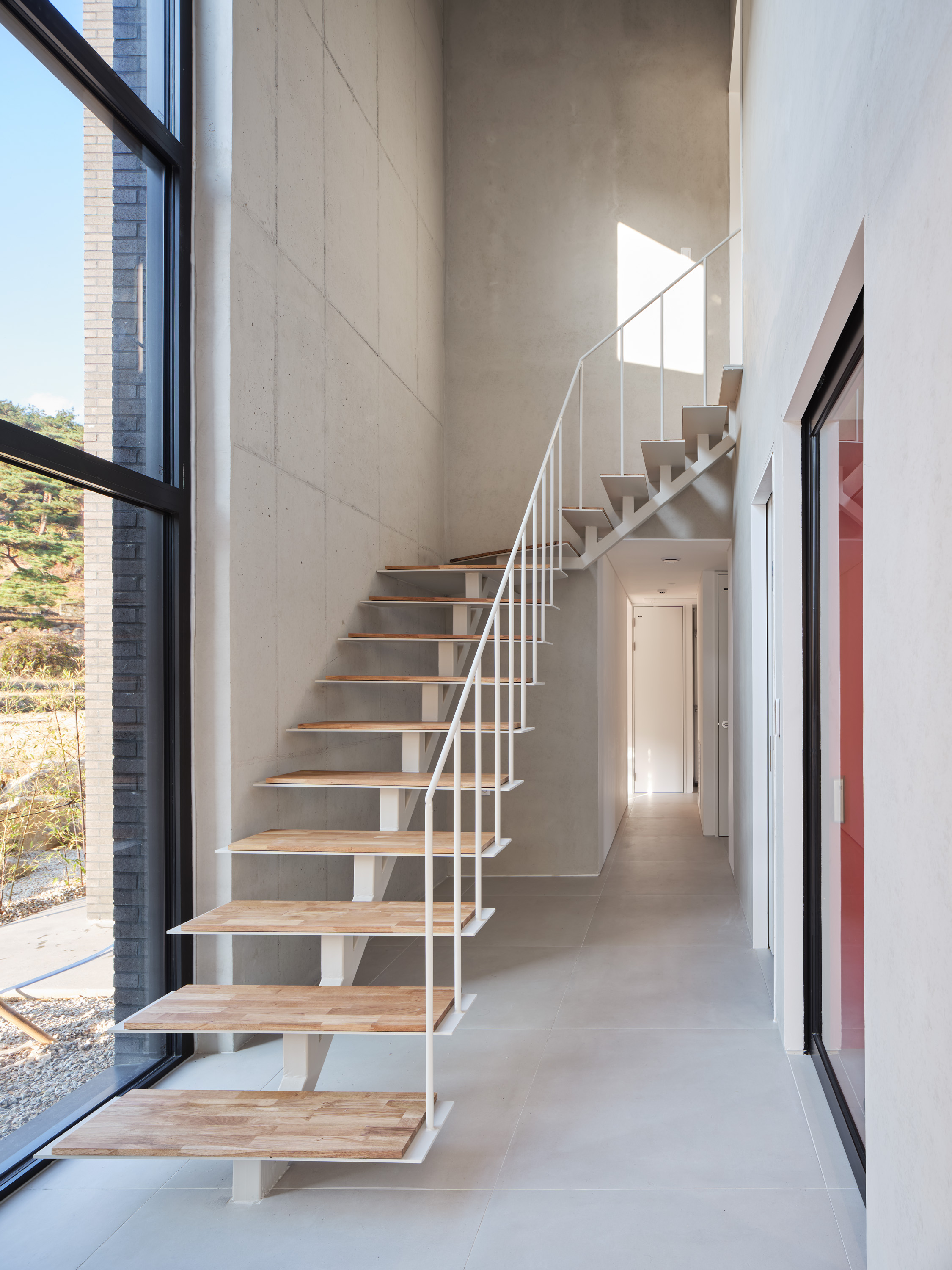 계단실 공간은 LDK의 공용공간과 방들이 위치한 사적 공간의 중간에 위치하는데 1층과 2층을 이어주는 수직 동선과 손님들도 이용할 수 있는 화장실이 위치해있다. 현관 또한 계단실 공간에 함께 묶여있는데, 바닥면적은 3개의 덩어리 중 가장 작지만 제일 높은 층고를 가지고 있어 집으로 진입할 때 시원한 공간감을 느낄 수 있다.