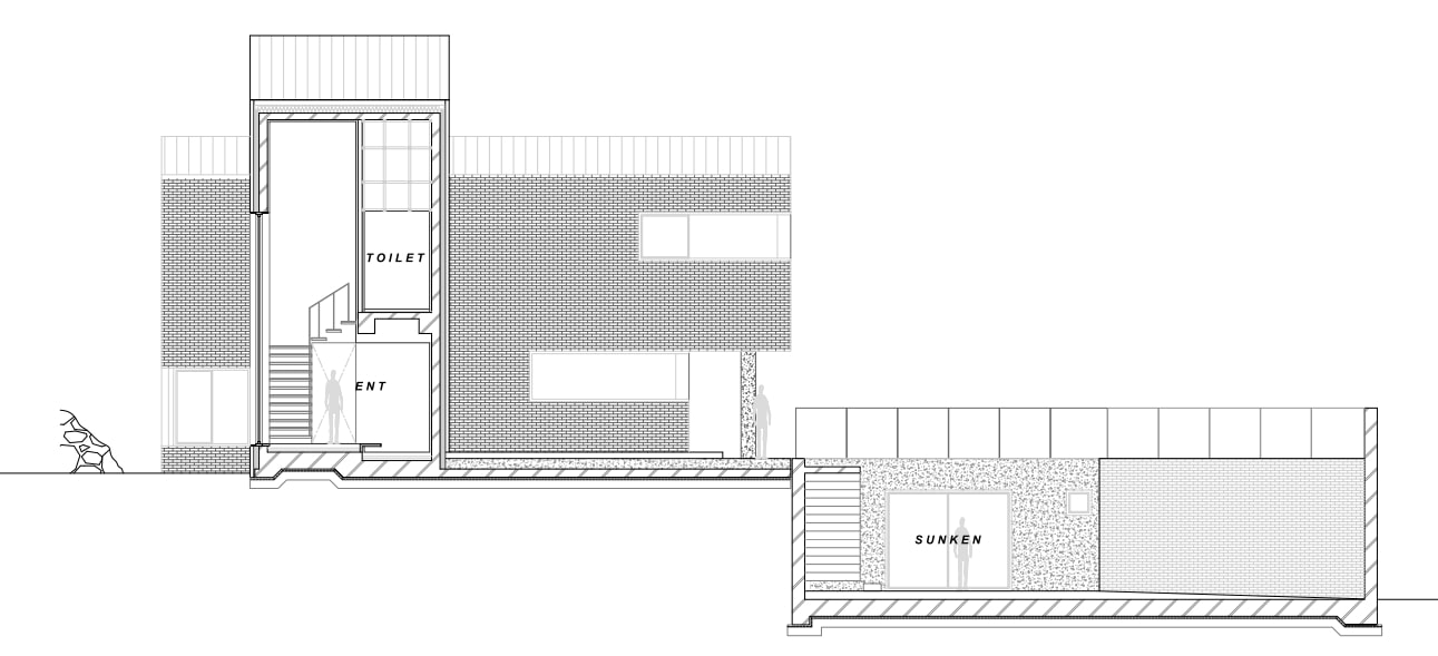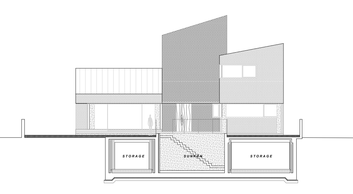 도로와 대지의 고저 차이로 자연스럽게 지하와 선큰 공간이 생긴다. 선큰으로 진입하면 외부에서 느꼈던 산자락 같은 지붕 선들이 눈앞에 나타난다. 볕이 시시각각 다른 방향으로 선큰을 향해 쏟아져 하루 종일 지루하지 않은 공간감이 느껴진다. 지하로 진입해서 마당을 지나 집으로 들어가는 여정은 환대의 공간으로도 충분하다.