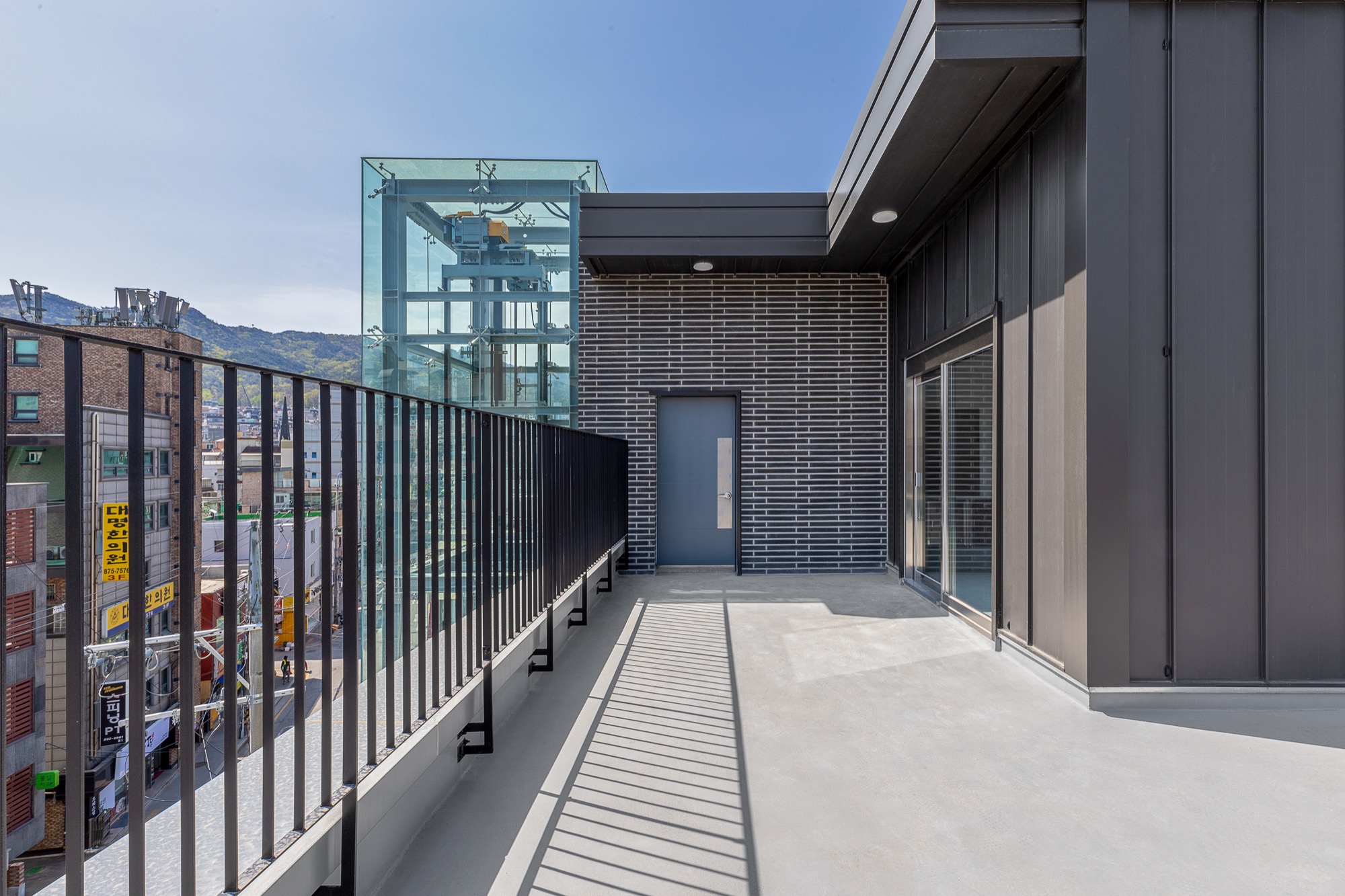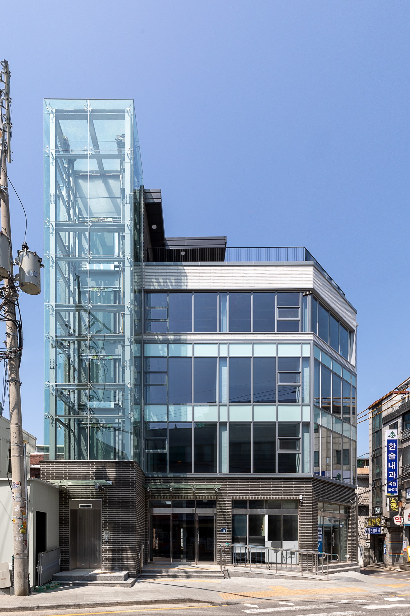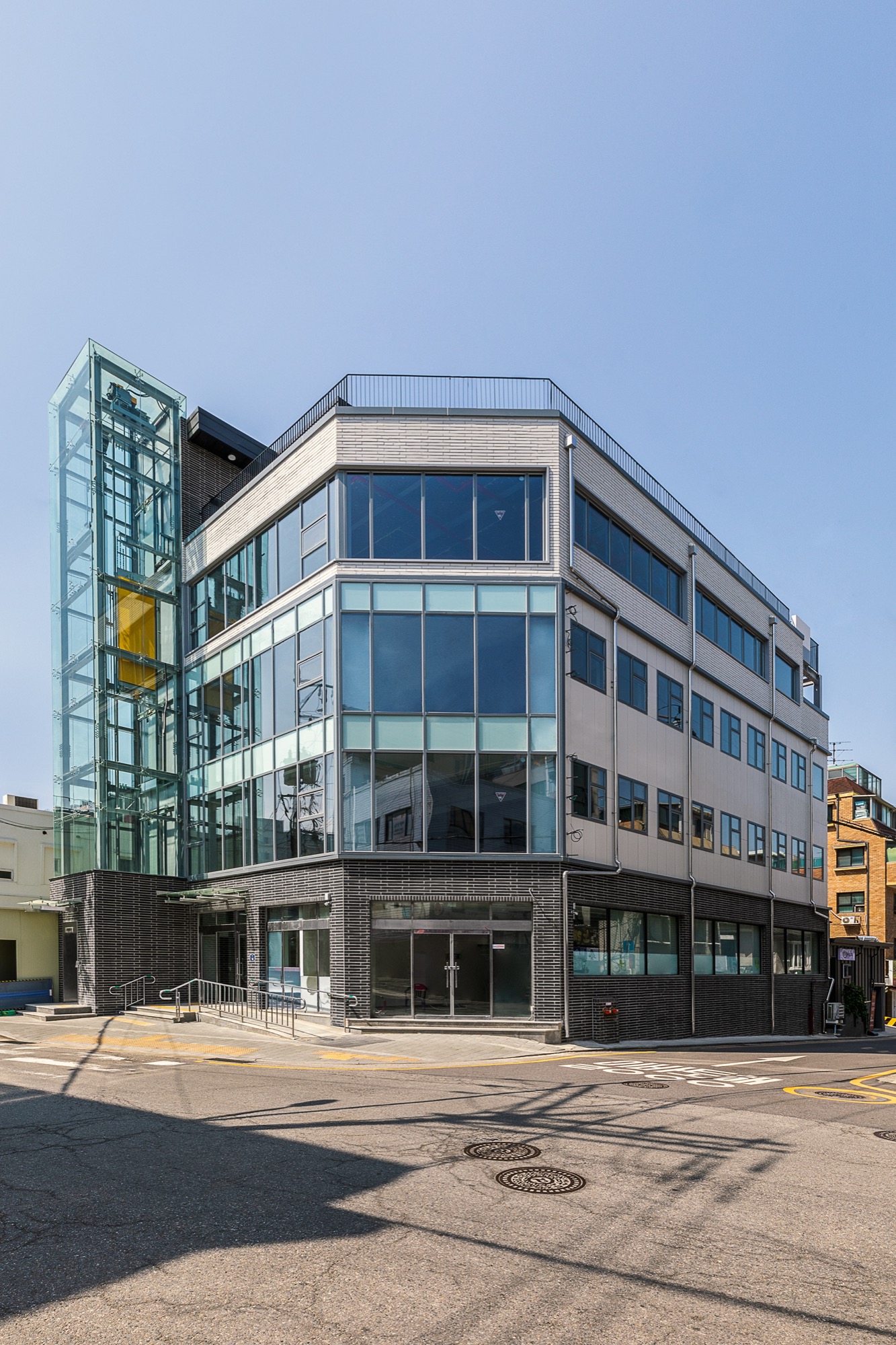 외부에서 바로 이용할 수 있는 엘리베이터는 '원하는 곳으로 바로 들어갈 순 없을까?'라는 생각에서 시작되었다. 외부 엘리베이터는 바로 원하는 층으로 이동하게 해주고, 불필요한 로비 공간을 줄였다. 진입 동선 확보를 위한 로비는 큰 건물에서는 효율적이지만, 중규모 건물, 특히 상업성을 목적으로 하는 건물에서는 계륵과도 같은 존재다. 필요하지만, 관리의 어려움이 함께 따라온다. 관리 업체가 있다면 다행이지만, 중규모 건물에서 관리 업체를 두는 것은 쉽지 않다. 그렇기에 이번 프로젝트에서는 과감하게 로비 공간을 최소화하고, 도로에서 바로 출입이 가능한 전망용 엘리베이터를 설치했다. 엘리베이터는 길을 지나는 사람들의 시선을 끄는 랜드마크 역할을 하는 동시에, 불필요한 공용 공간을 줄이는 두 가지 역할을 한다.