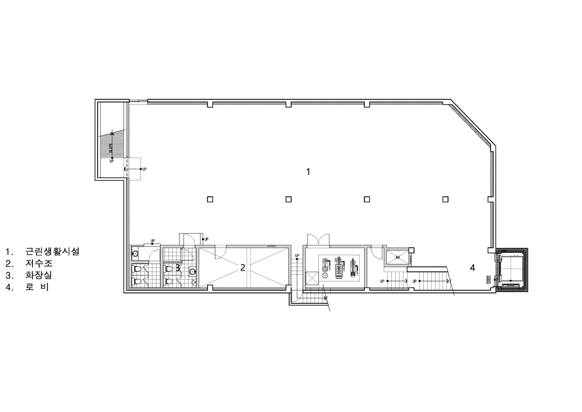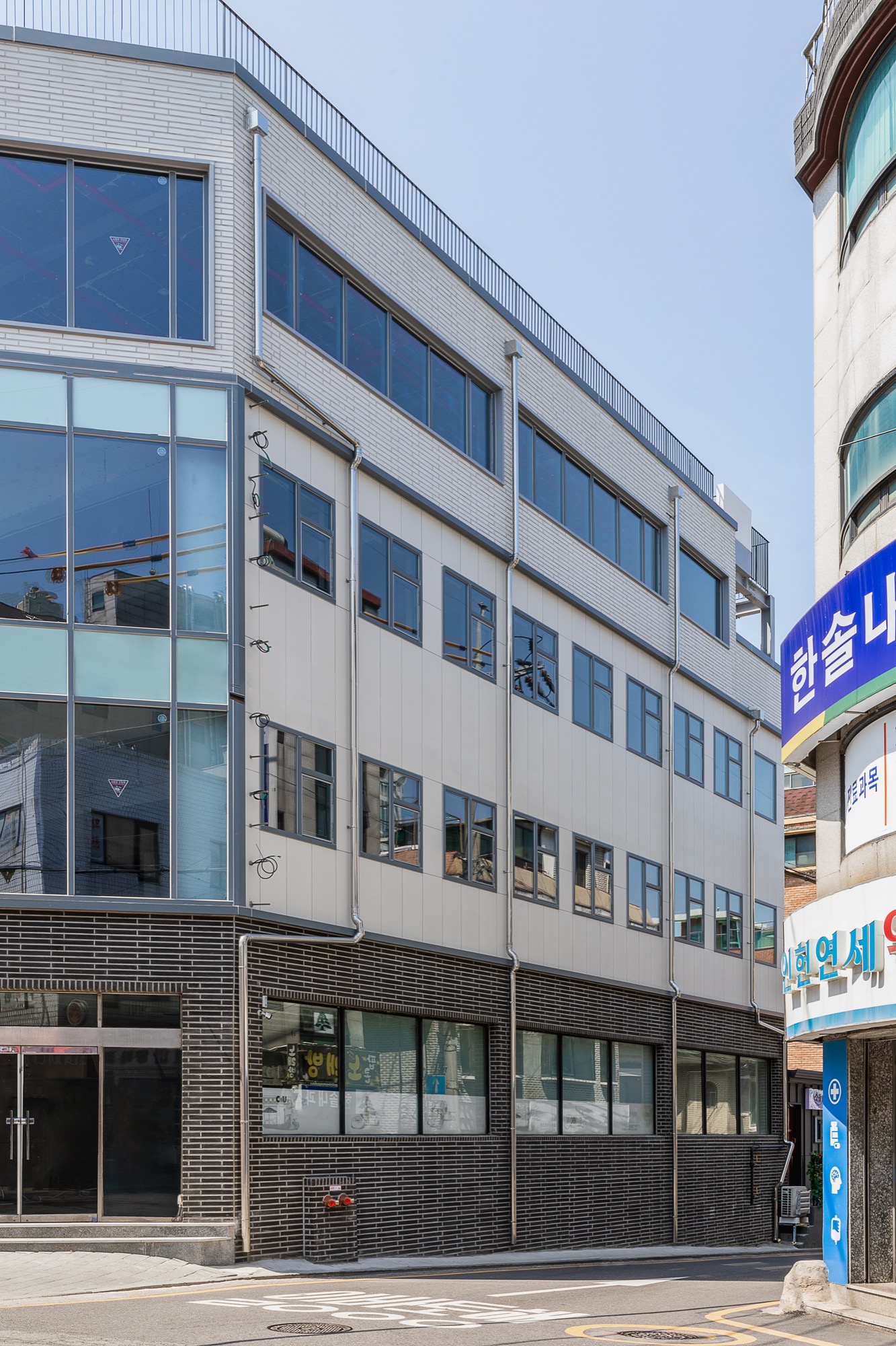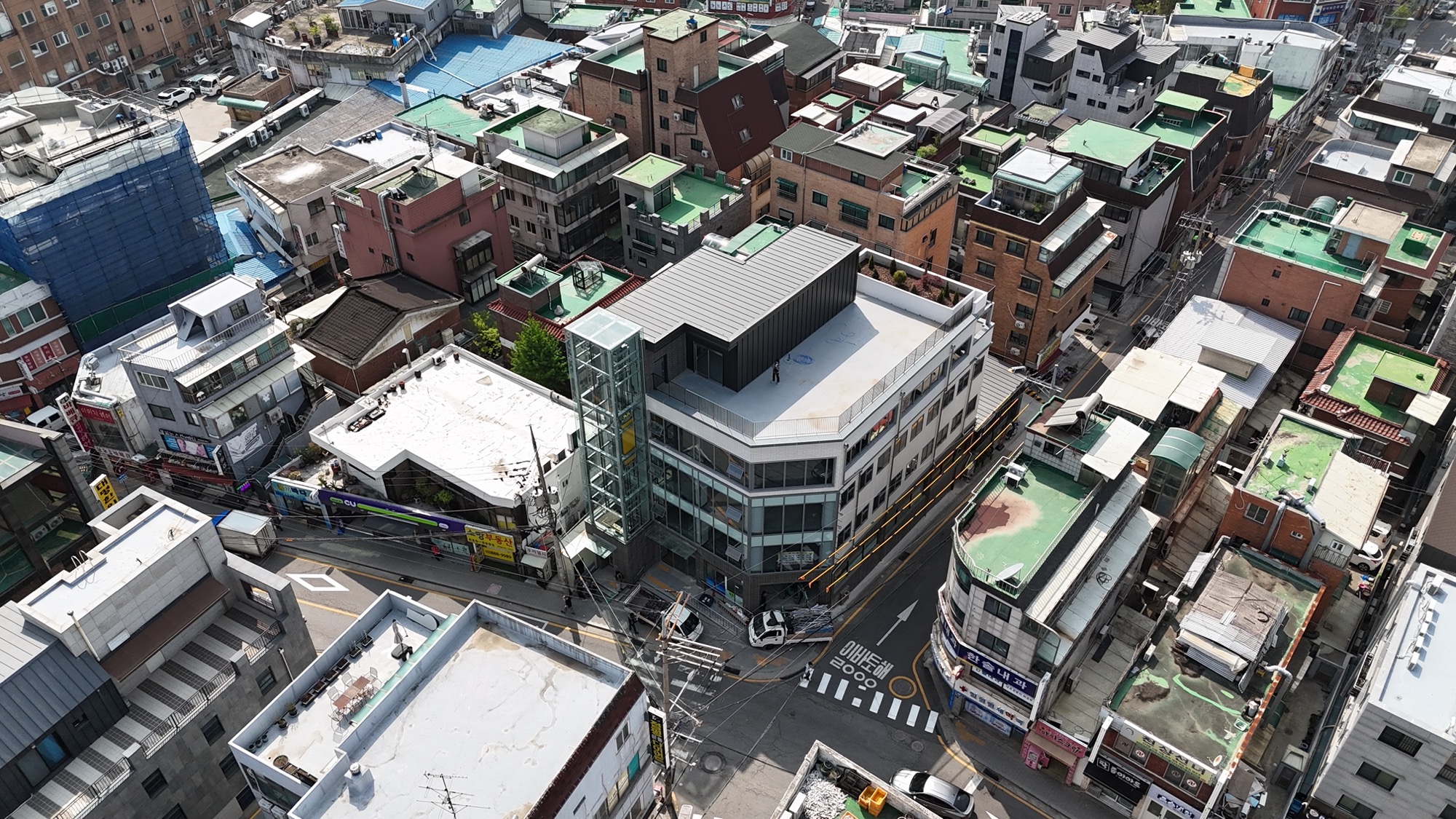 기존 건축물의 뼈대를 가진 상태에서 새로운 외피와, 수직동선(EV), 용적률을 고려한 증축이 이뤄져 있는 위의 건물을 유지할 때 가질 수 있는 상당한 이점이 있다. 기존 법규로 적용되어, 건축면적, 주차장 등 과거 건축물이 적용받는 사항에 대한 특례다. 특히 이번 프로젝트에서 가장 유리하게 적용된 점은 주차공간이었다. 신축으로 지었다면 10대 정도의 주차공간을 확보하기 위해 1층 상업공간의 많은 부분을 주차장으로 사용했어야 했지만, 증축 부분만 적용되어 최소한의 주차면적만 충족하면 됐다. 근린생활시설의 특성상, 주변 이웃 주민이 많이 방문하고, 이용객 대부분이 도보로 접근하기에 주차 공간을 최소화한다는 것은 밀도가 높은 도심에서 상업적으로 유리하게 적용되는 부분이었다.