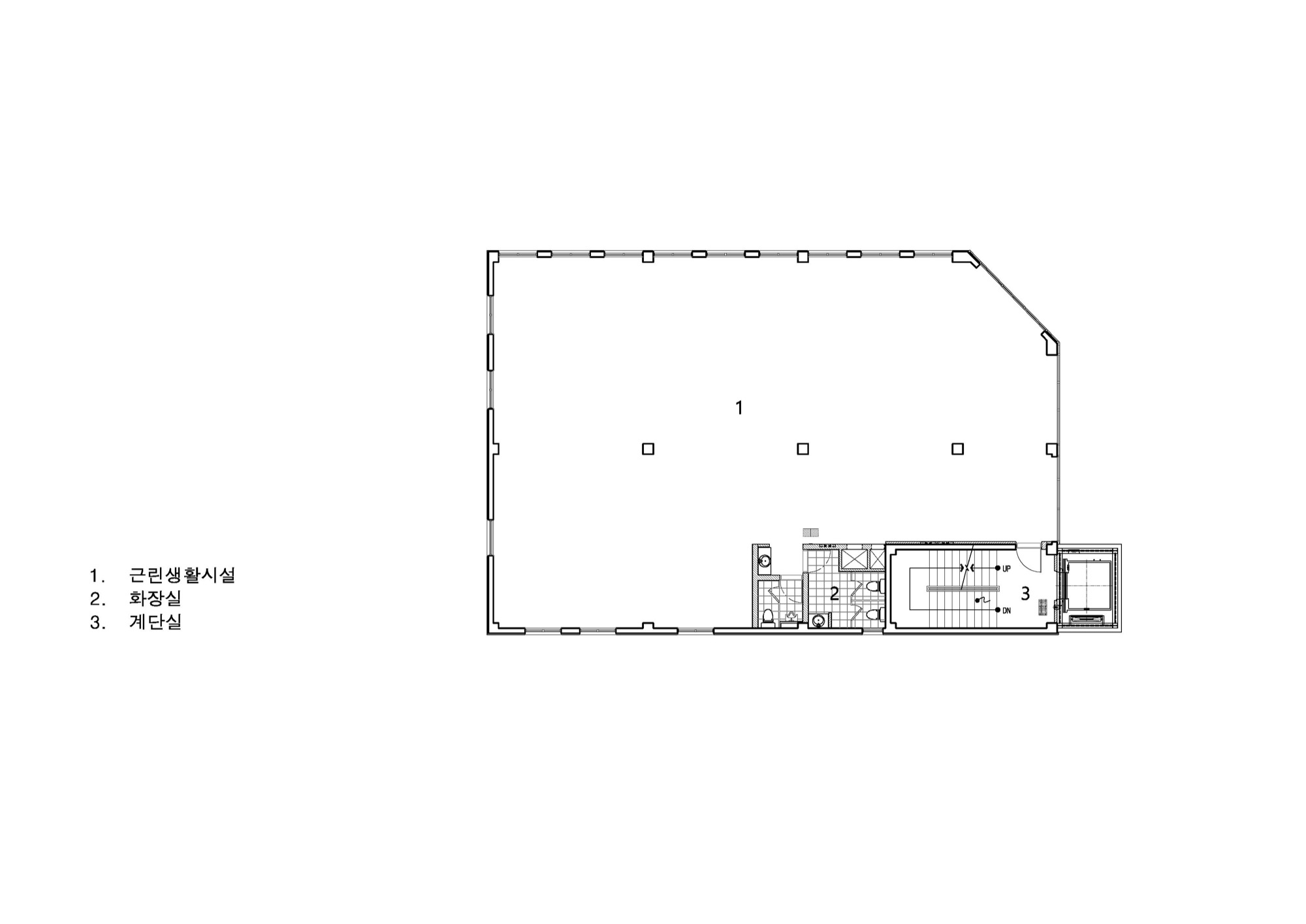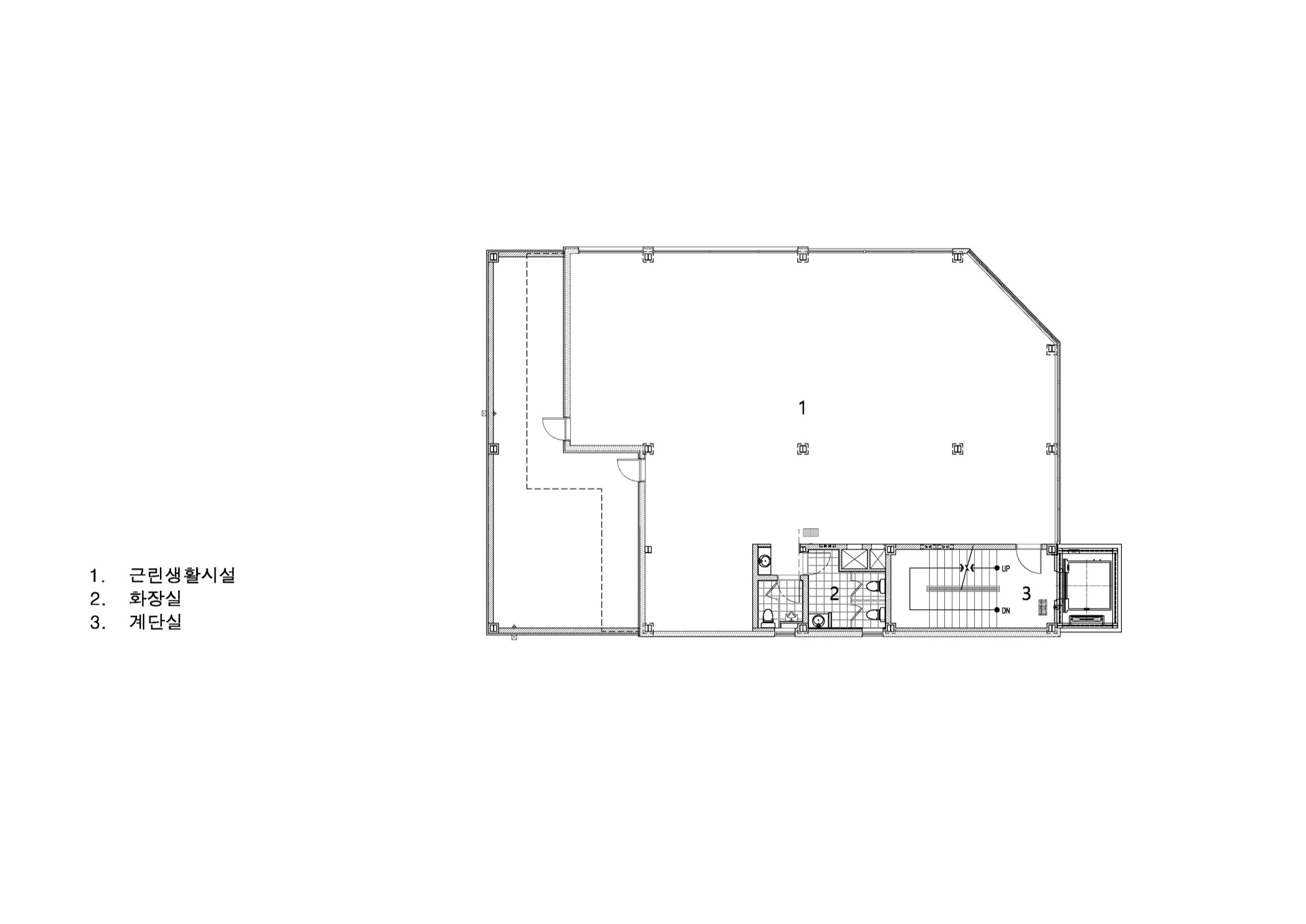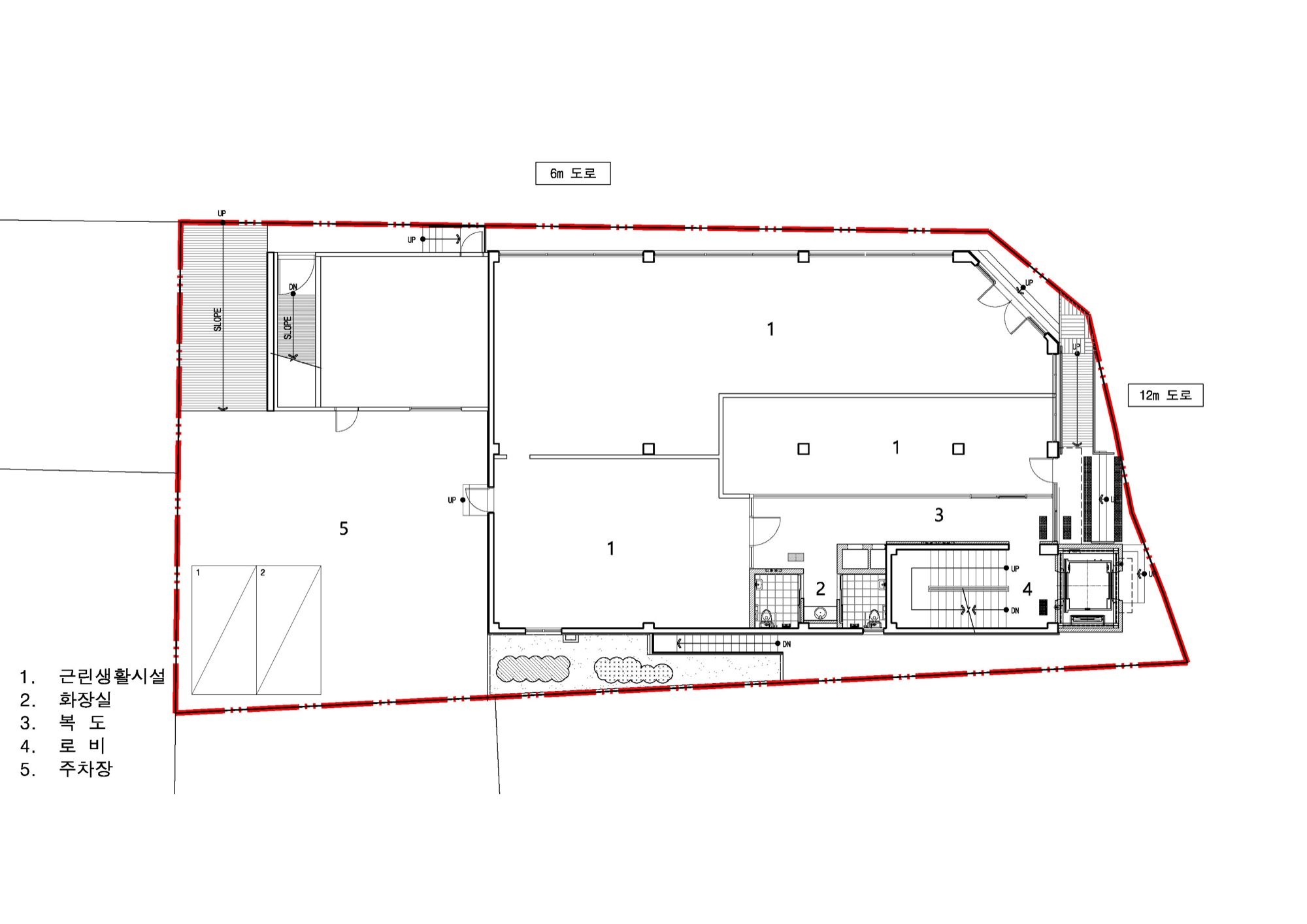 기존 건축물의 뼈대를 가진 상태에서 새로운 외피와, 수직동선(EV), 용적률을 고려한 증축이 이뤄져 있는 위의 건물을 유지할 때 가질 수 있는 상당한 이점이 있다. 기존 법규로 적용되어, 건축면적, 주차장 등 과거 건축물이 적용받는 사항에 대한 특례다. 특히 이번 프로젝트에서 가장 유리하게 적용된 점은 주차공간이었다. 신축으로 지었다면 10대 정도의 주차공간을 확보하기 위해 1층 상업공간의 많은 부분을 주차장으로 사용했어야 했지만, 증축 부분만 적용되어 최소한의 주차면적만 충족하면 됐다. 근린생활시설의 특성상, 주변 이웃 주민이 많이 방문하고, 이용객 대부분이 도보로 접근하기에 주차 공간을 최소화한다는 것은 밀도가 높은 도심에서 상업적으로 유리하게 적용되는 부분이었다.