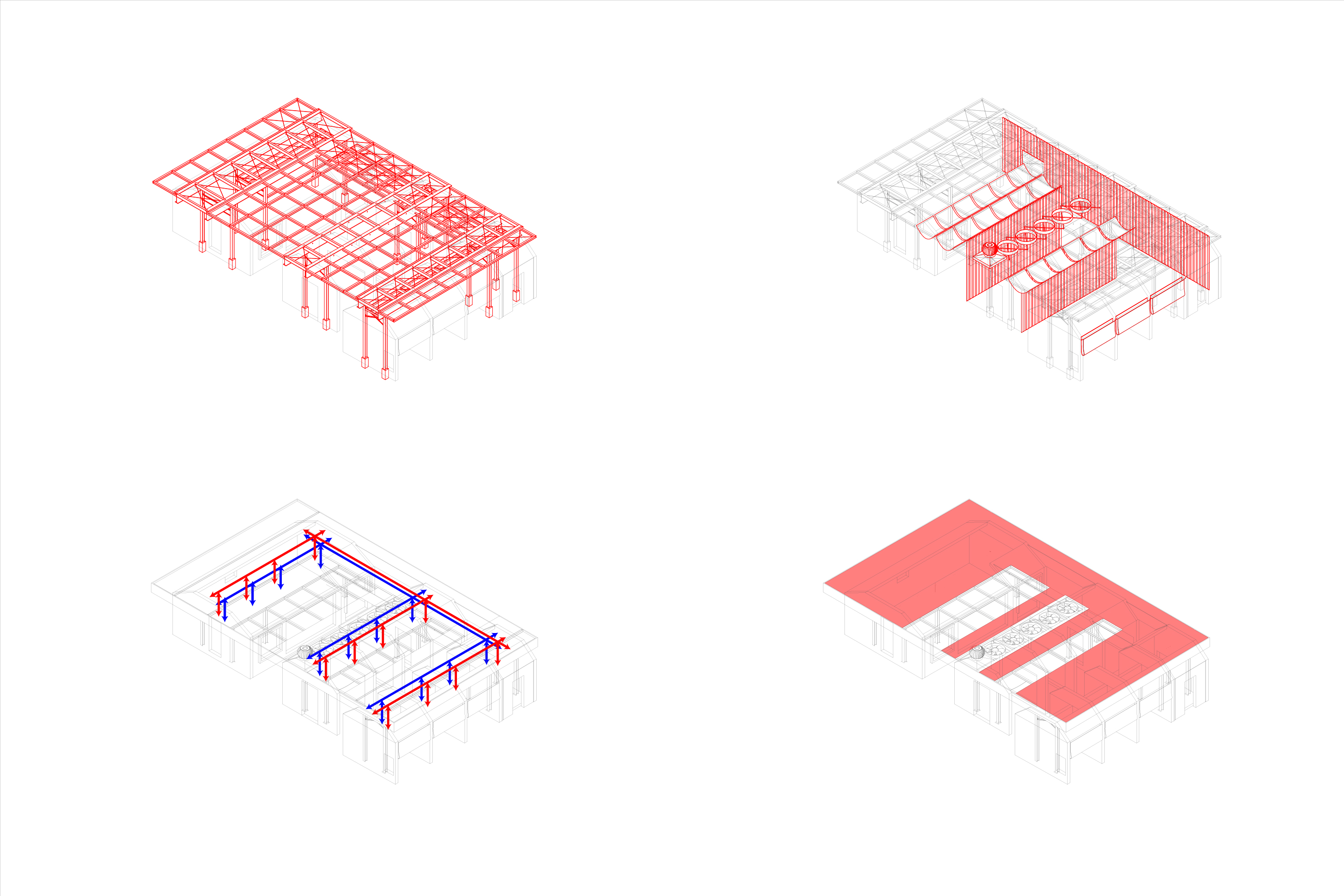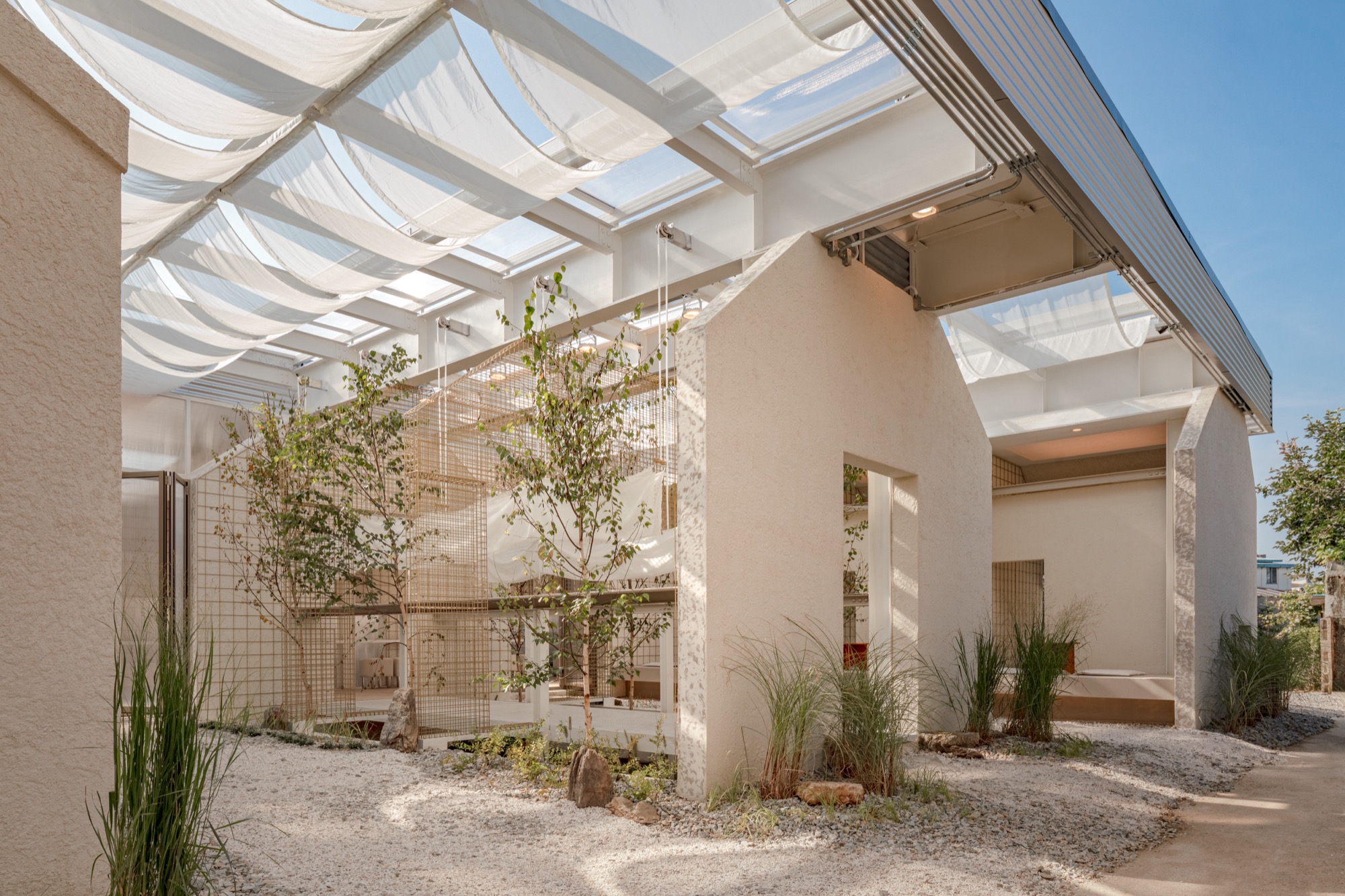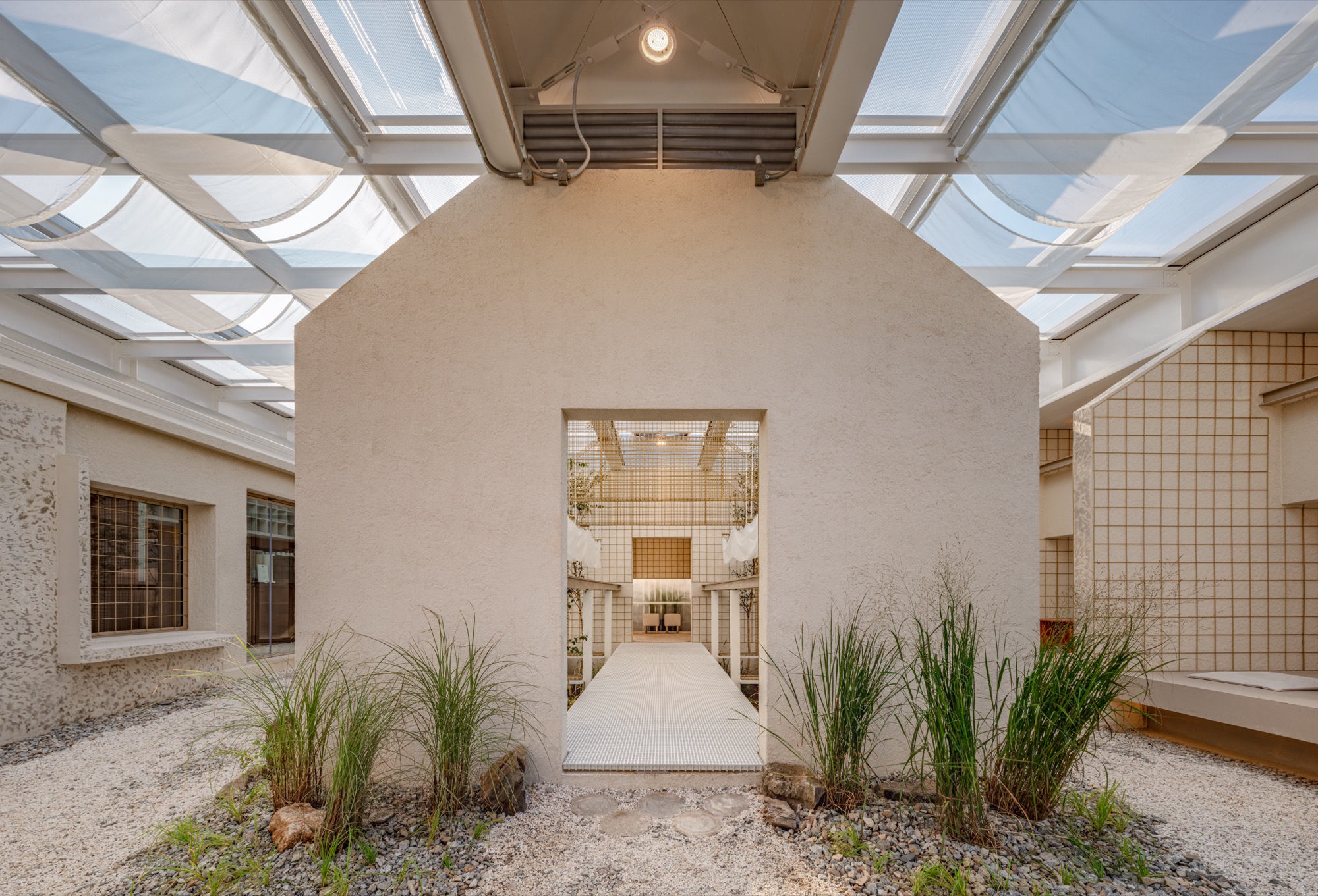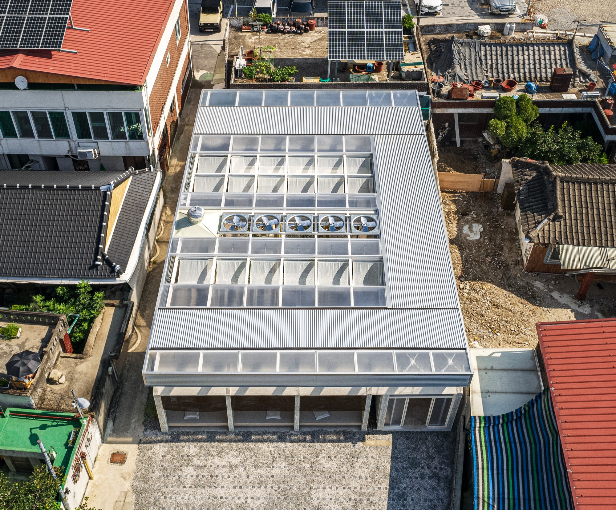 이러한 맥락에서 부지에 사람과 자연이 공존할 수 있는 공간을 만들기 위해 기존 건물의 벽과 지붕, 땅을 개방하고, 기능적 문제와 구조적인 제약을 극복하기 위해 분리된 건물들을 하나의 지붕 구조로 통합했다.