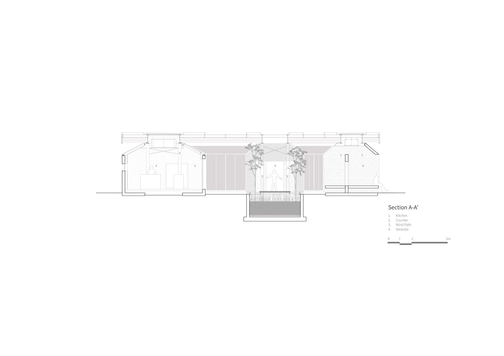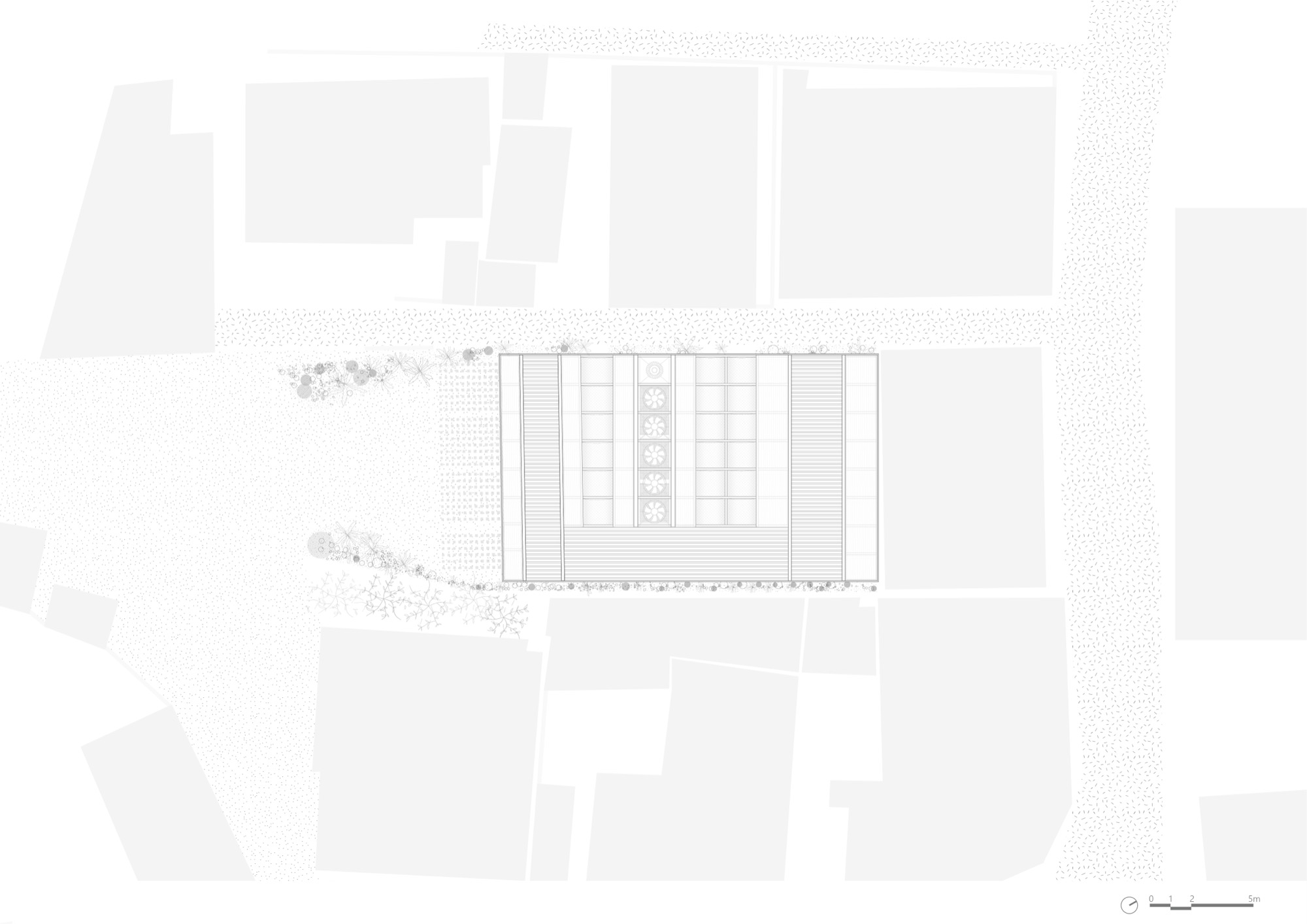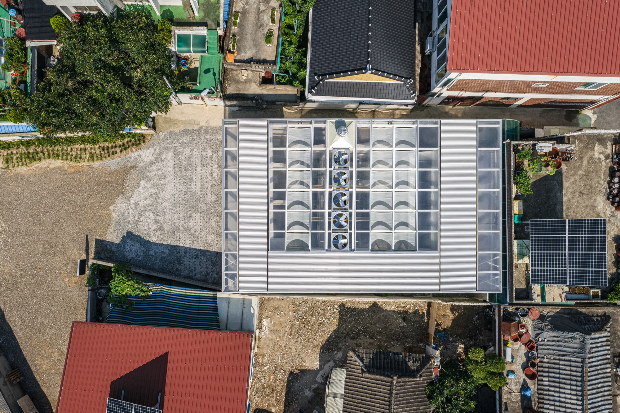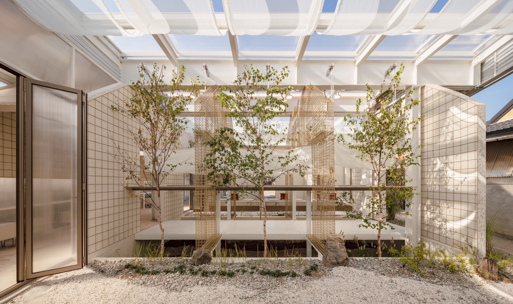 이러한 맥락에서 부지에 사람과 자연이 공존할 수 있는 공간을 만들기 위해 기존 건물의 벽과 지붕, 땅을 개방하고, 기능적 문제와 구조적인 제약을 극복하기 위해 분리된 건물들을 하나의 지붕 구조로 통합했다.