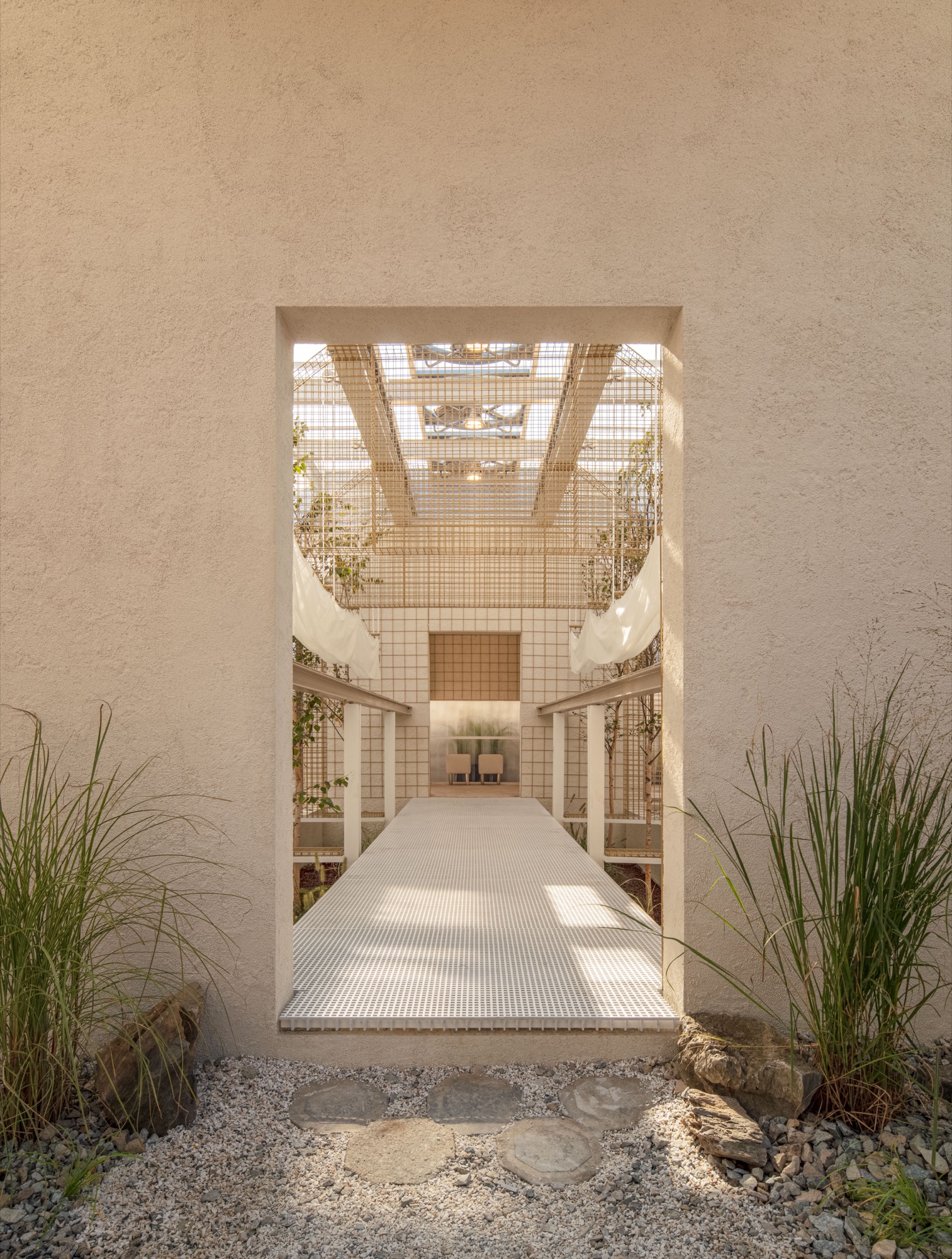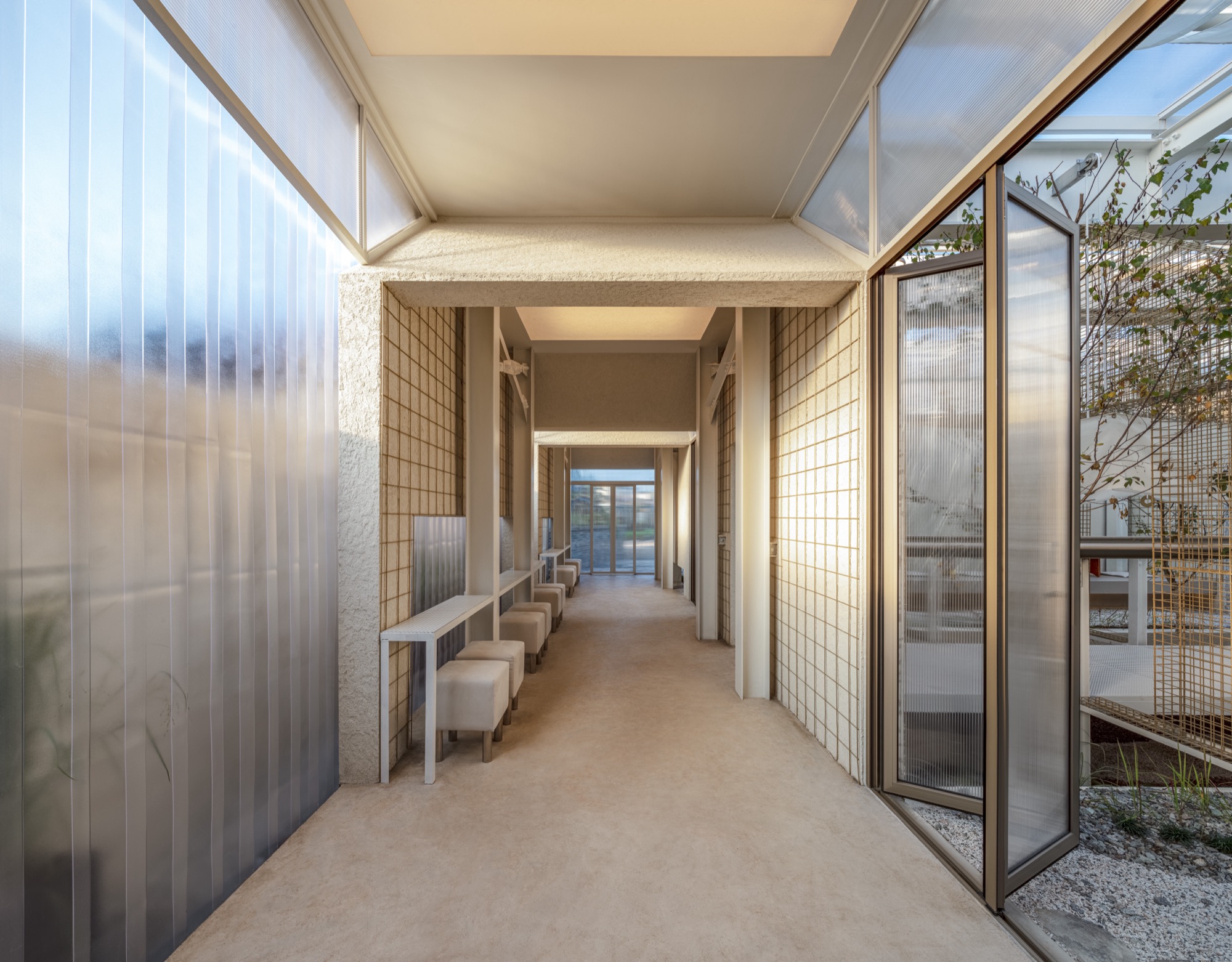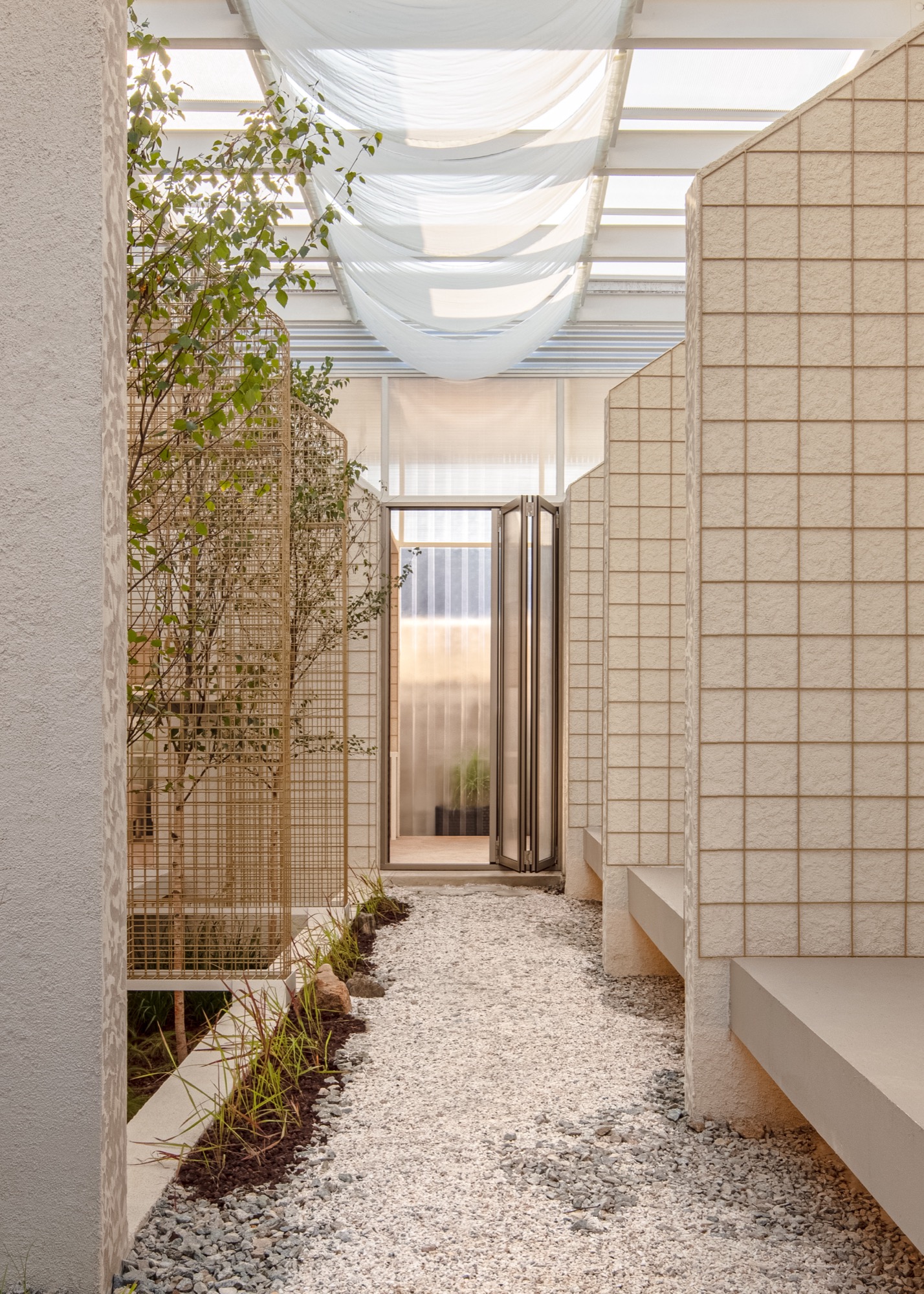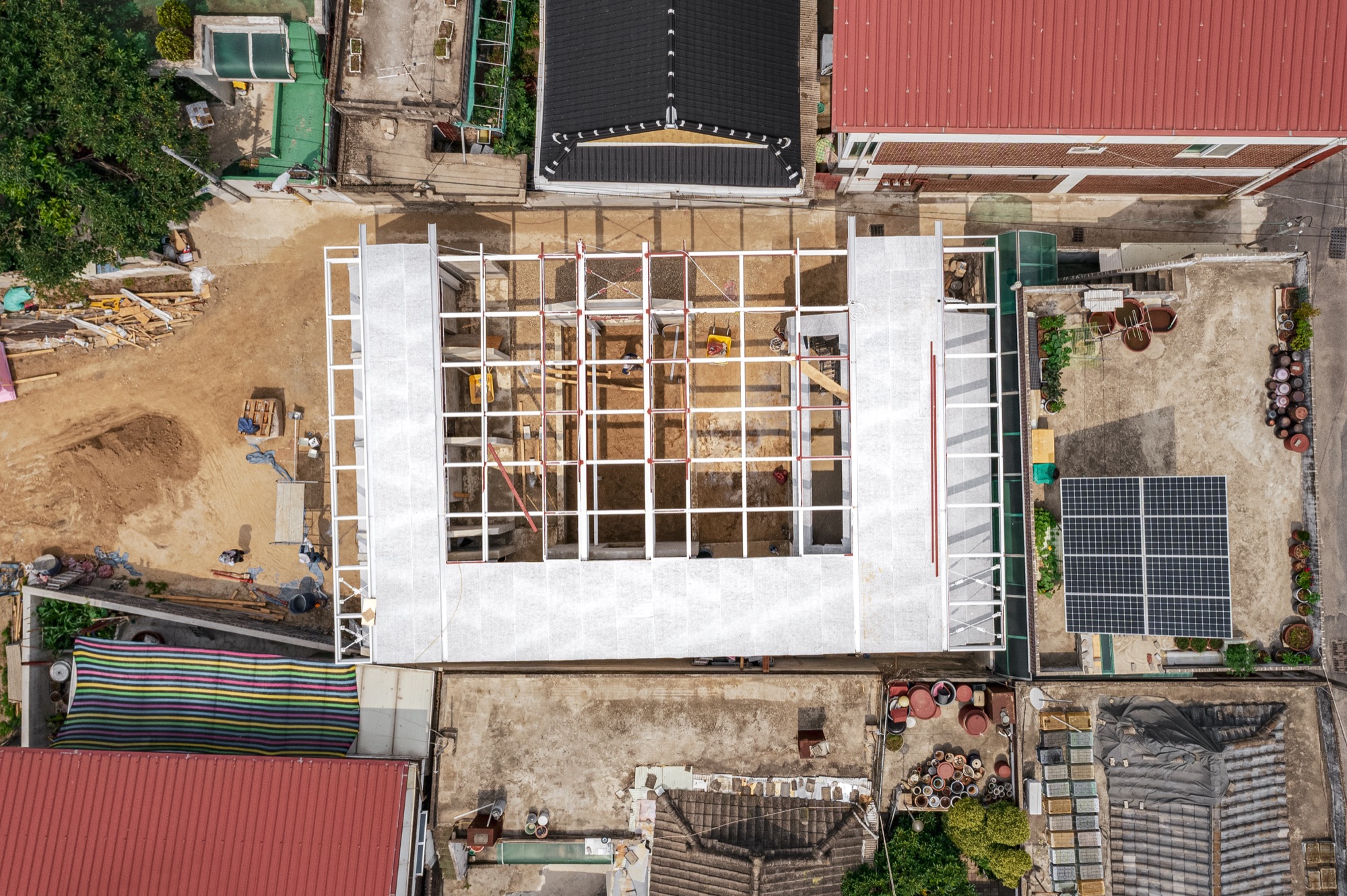 이러한 맥락에서 부지에 사람과 자연이 공존할 수 있는 공간을 만들기 위해 기존 건물의 벽과 지붕, 땅을 개방하고, 기능적 문제와 구조적인 제약을 극복하기 위해 분리된 건물들을 하나의 지붕 구조로 통합했다.