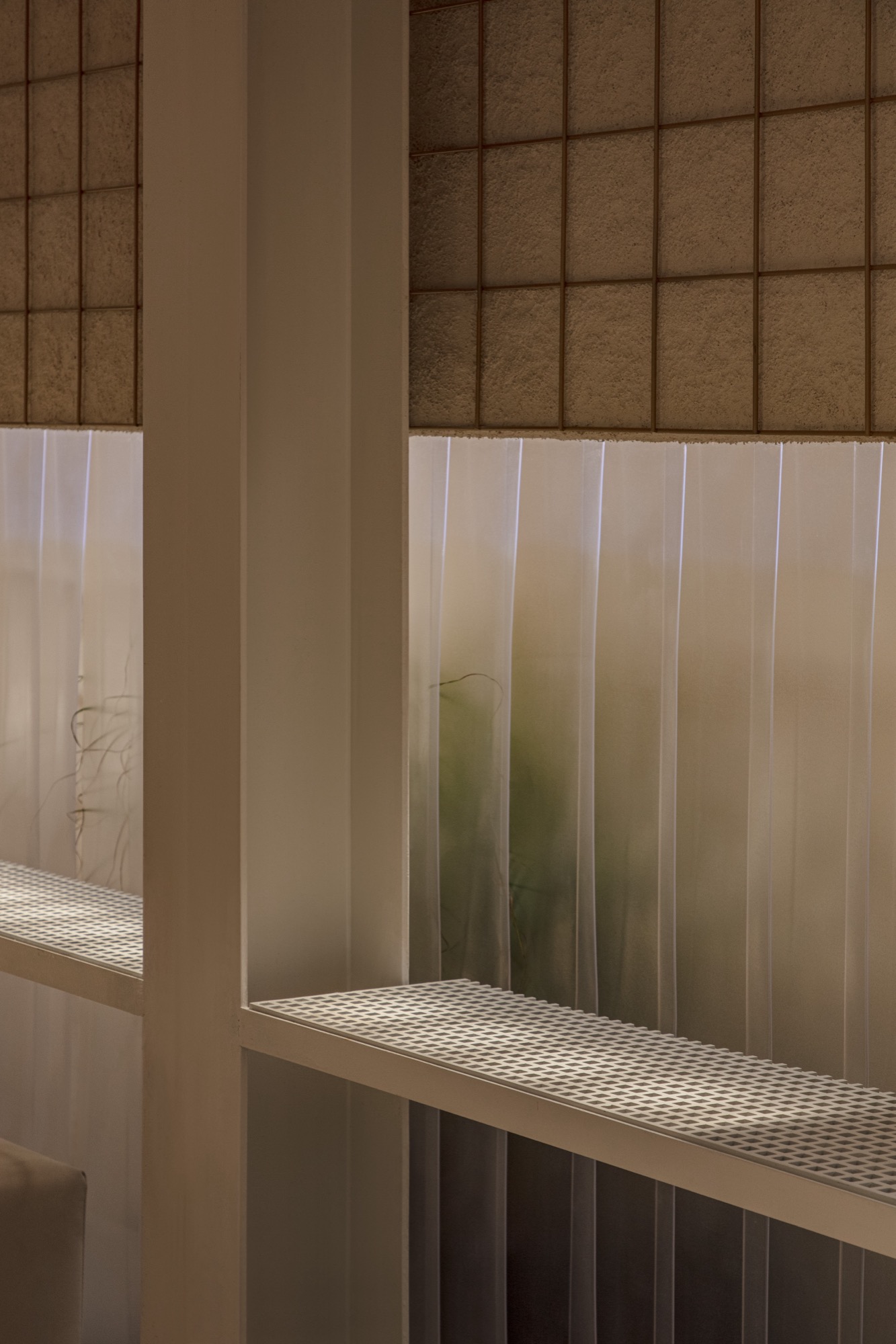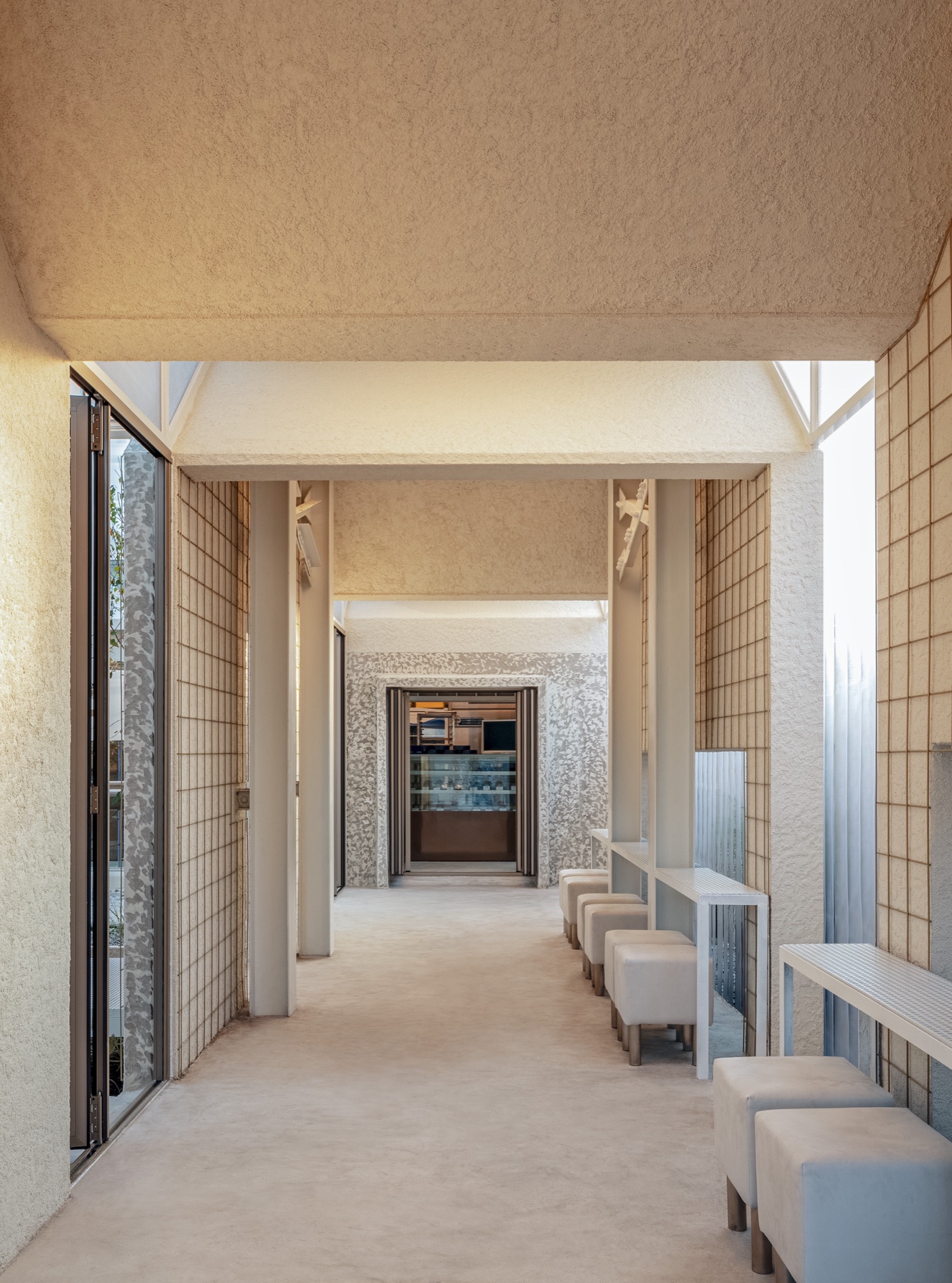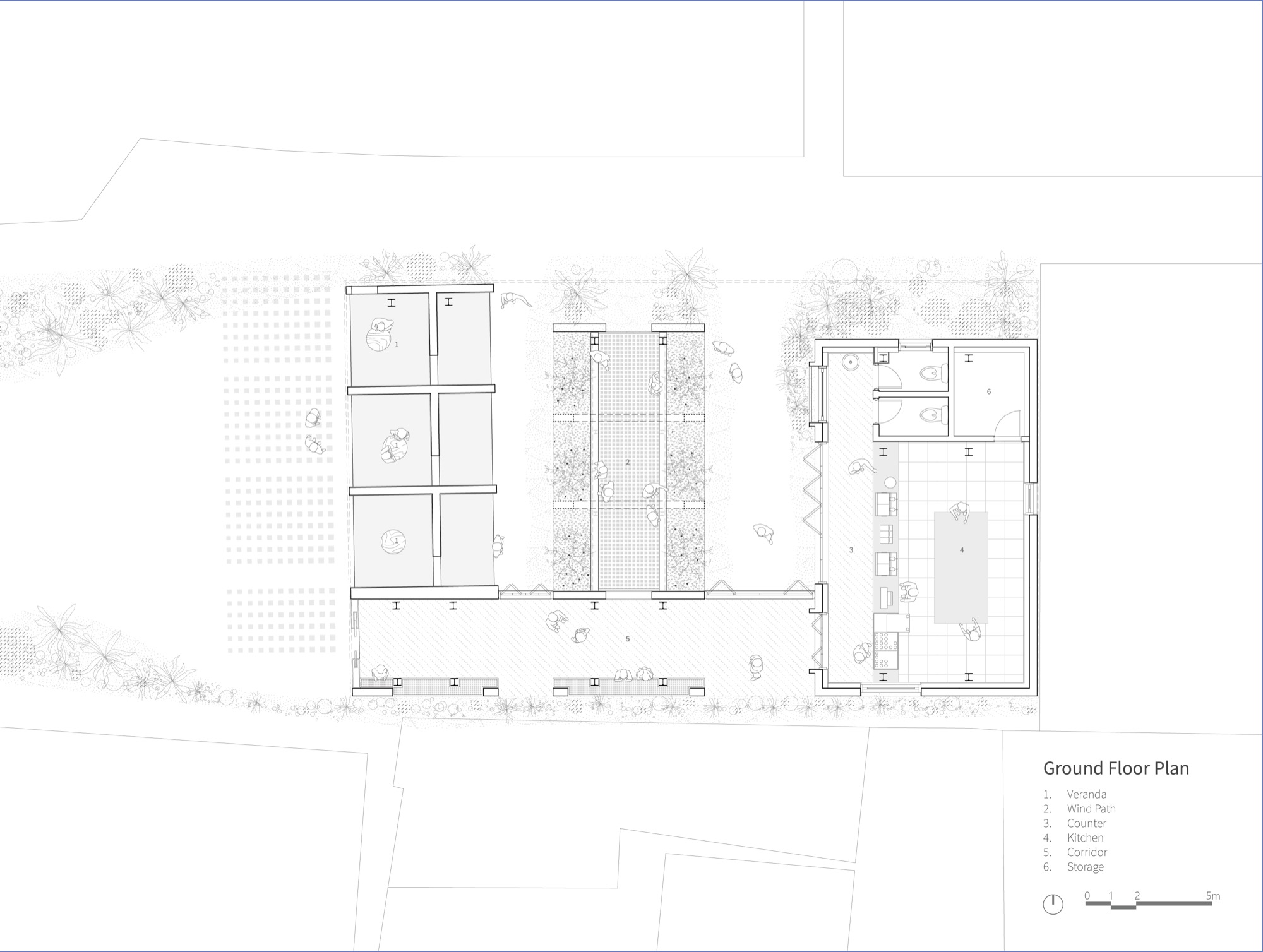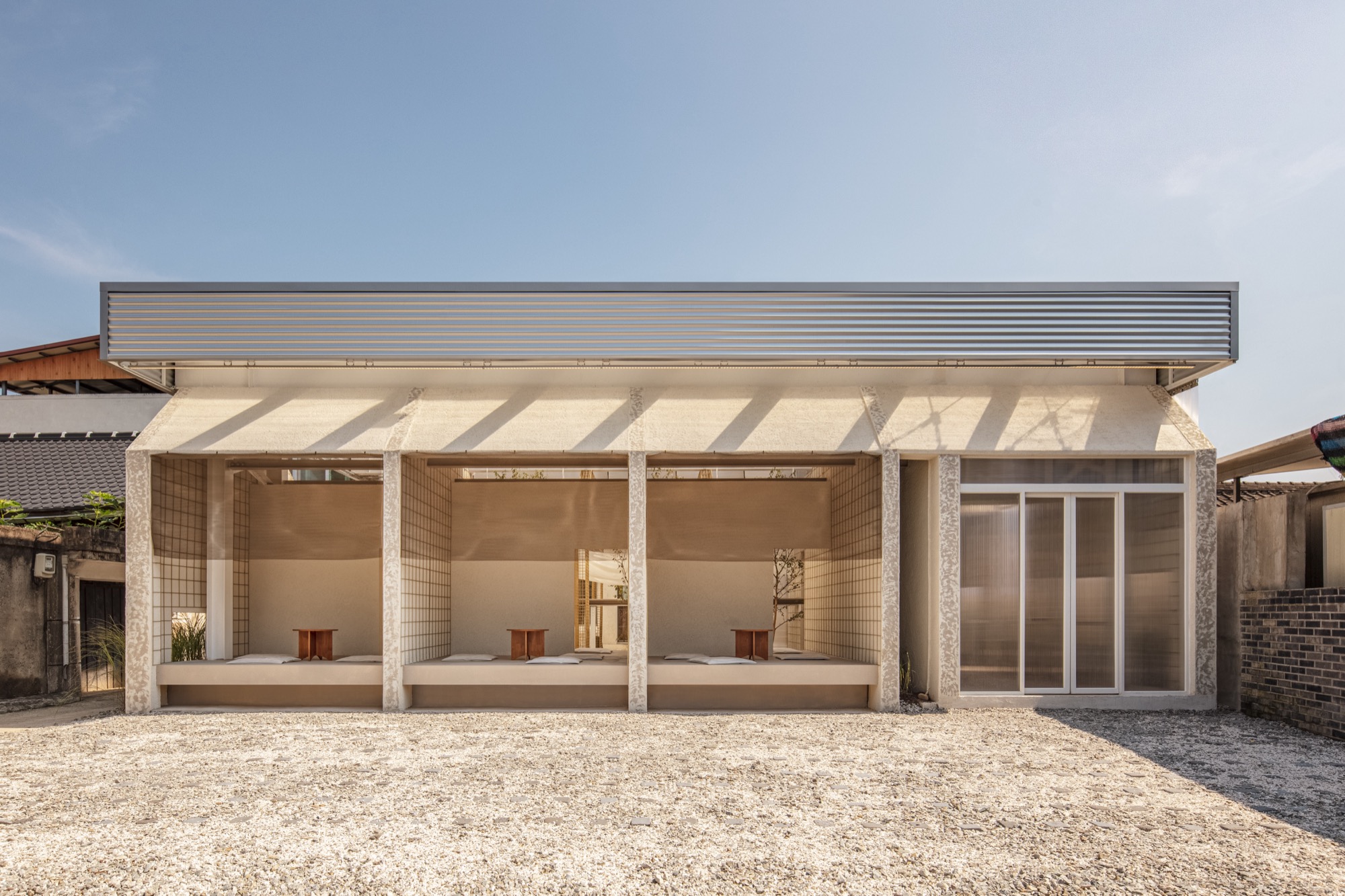 부지에는 세 건물이 있었다. 가장 북쪽에 자리한 두꺼운 건물은 기숙사를 관리하는 가족의 주거지로 사용되었고, 가운데 3개 방으로 구성된 건물과 남쪽 4개 방이 있는 가느다란 건물은 공장 근로자와 그 가족들을 위한 숙소로 사용되었다. 그러나 작은 실들의 크기와 근접한 건물 간 이격 거리는 현대적인 프로그램을 수용하기에 적합하지 않았다. 카페 프로그램에 맞춰 벽과 지붕 일부를 체계적으로 철거하고, 새로운 기둥과 지붕 구조물을 설치하여 공기 순환과 자연 빛이 유입되는 환경을 조성했다. 이를 통해 자연을 건물에 담아내면서 사람들이 자유롭게 거닐 수 있는 공간을 만들었다.