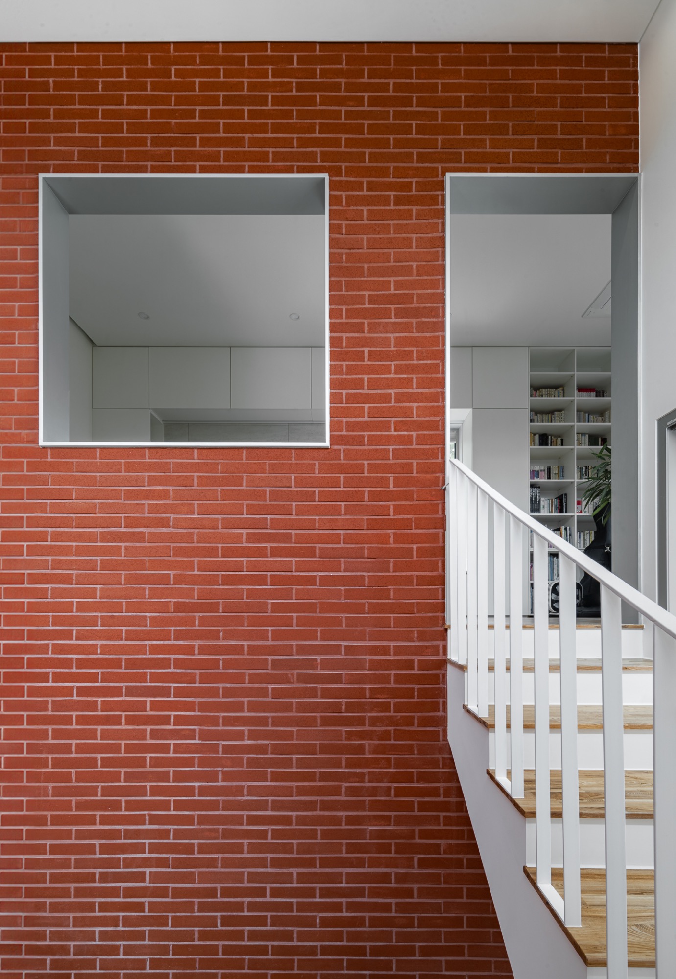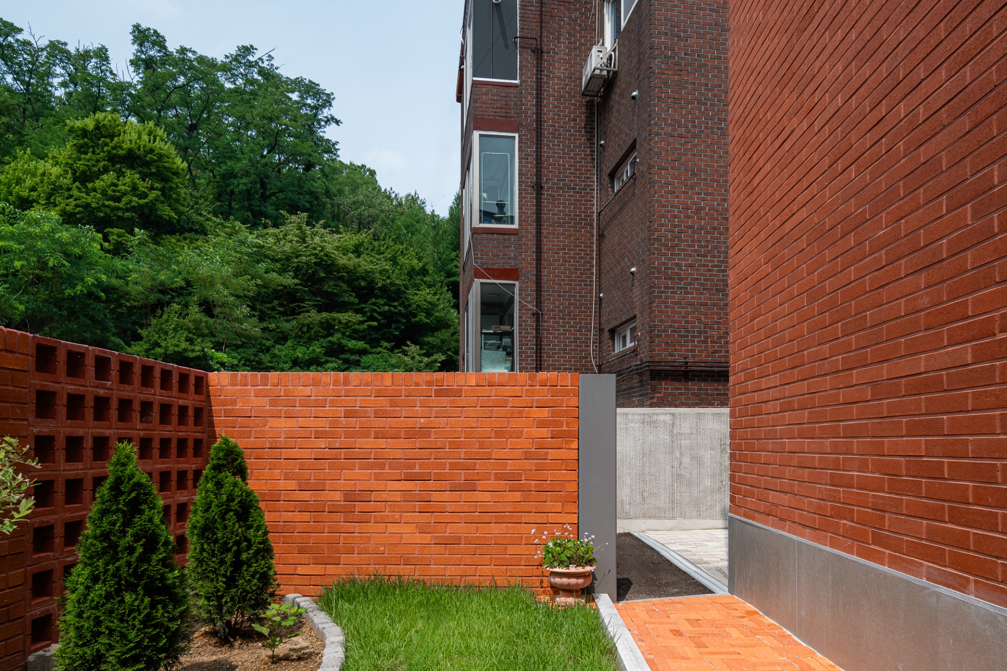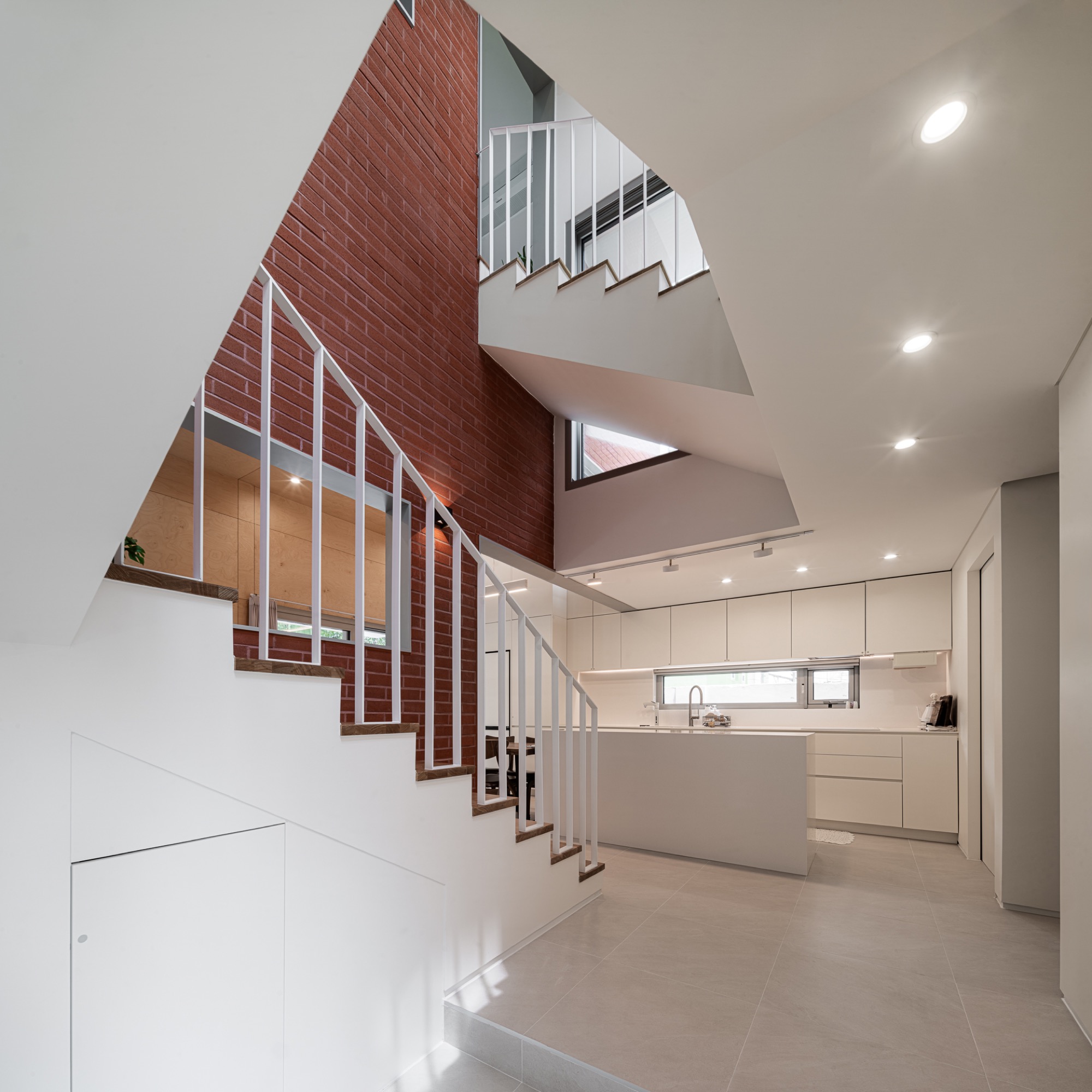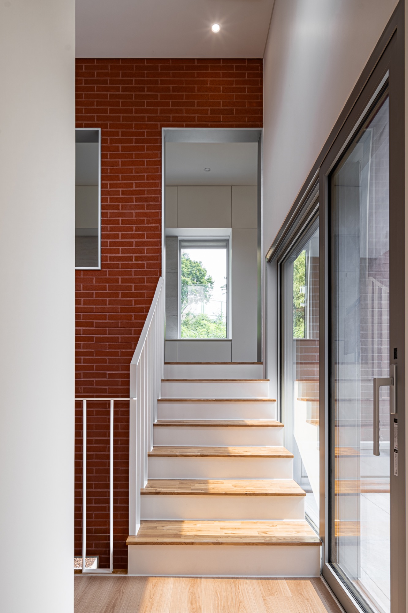 두 동처럼 분리된 매스의 중심에 외부 중정 같은 내부 계단을 계획했다. 커튼월을 통해 남향과 동향으로 열려있는 내부 계단은 단지 층과 층을 연결해 주는 곳이 아니다. 계단의 보이드는 채광통로가 되어 북측의 공용공간에서도 외부 환경을 온전히 느낄 수 있게 한다. 내부까지 시각적, 물리적으로 연결된 외부 재료(벽돌)는 물성 그 자체로 사용자에게 계단을 오르내릴 때나, 거실과 취미실에 앉아 내부 창을 통해 보았을 때 외부공간에 있는 듯한 경험의 차이를 만들고 벽돌 벽면에 투영되어 시시각각 변하는 해와 달의 그림자 또한 실내에서도 외부 중정을 거니는 듯한 독특한 감각을 사용자에게 제공하게 된다.