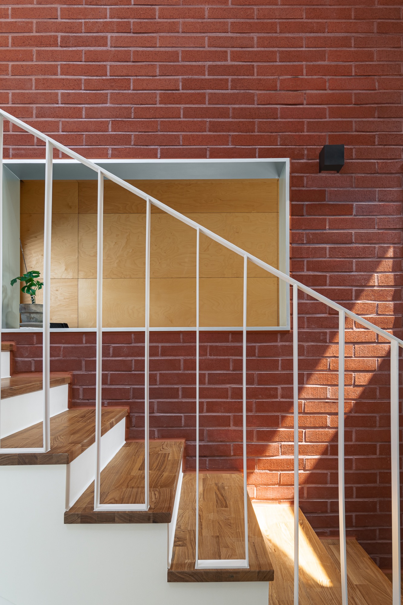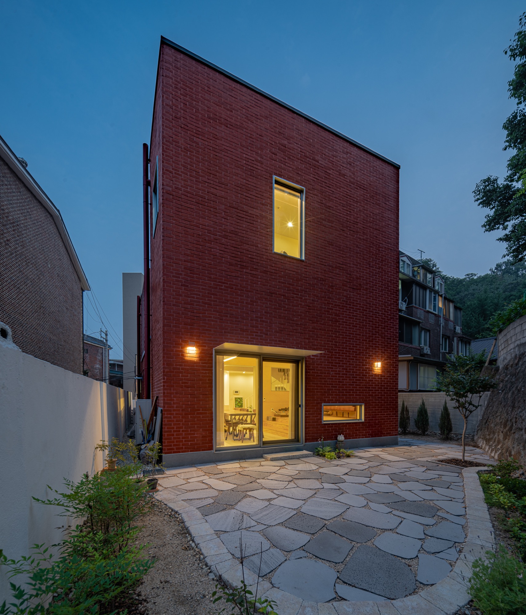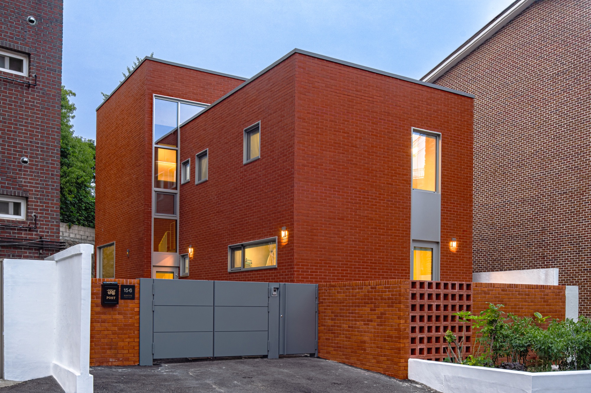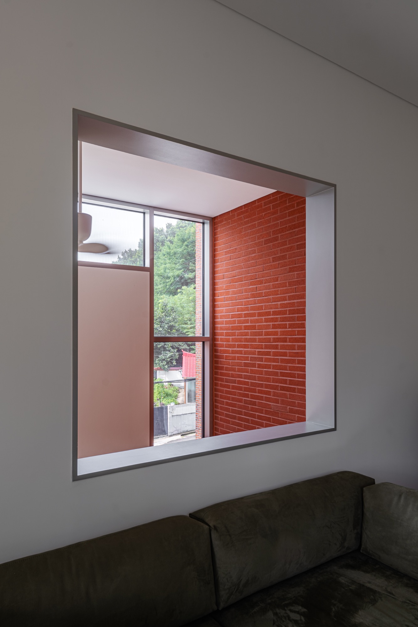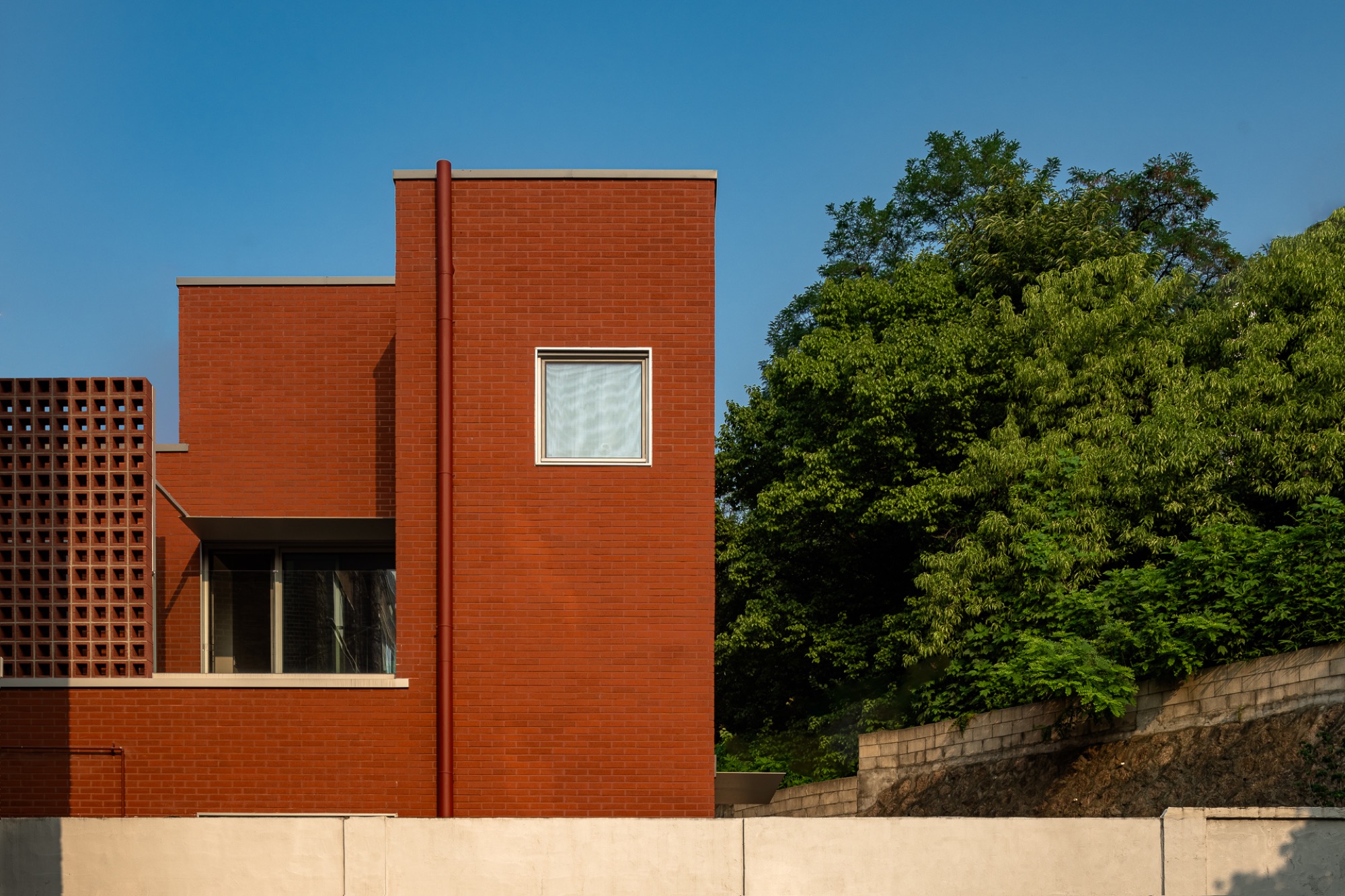 두 동처럼 분리된 매스의 중심에 외부 중정 같은 내부 계단을 계획했다. 커튼월을 통해 남향과 동향으로 열려있는 내부 계단은 단지 층과 층을 연결해 주는 곳이 아니다. 계단의 보이드는 채광통로가 되어 북측의 공용공간에서도 외부 환경을 온전히 느낄 수 있게 한다. 내부까지 시각적, 물리적으로 연결된 외부 재료(벽돌)는 물성 그 자체로 사용자에게 계단을 오르내릴 때나, 거실과 취미실에 앉아 내부 창을 통해 보았을 때 외부공간에 있는 듯한 경험의 차이를 만들고 벽돌 벽면에 투영되어 시시각각 변하는 해와 달의 그림자 또한 실내에서도 외부 중정을 거니는 듯한 독특한 감각을 사용자에게 제공하게 된다.